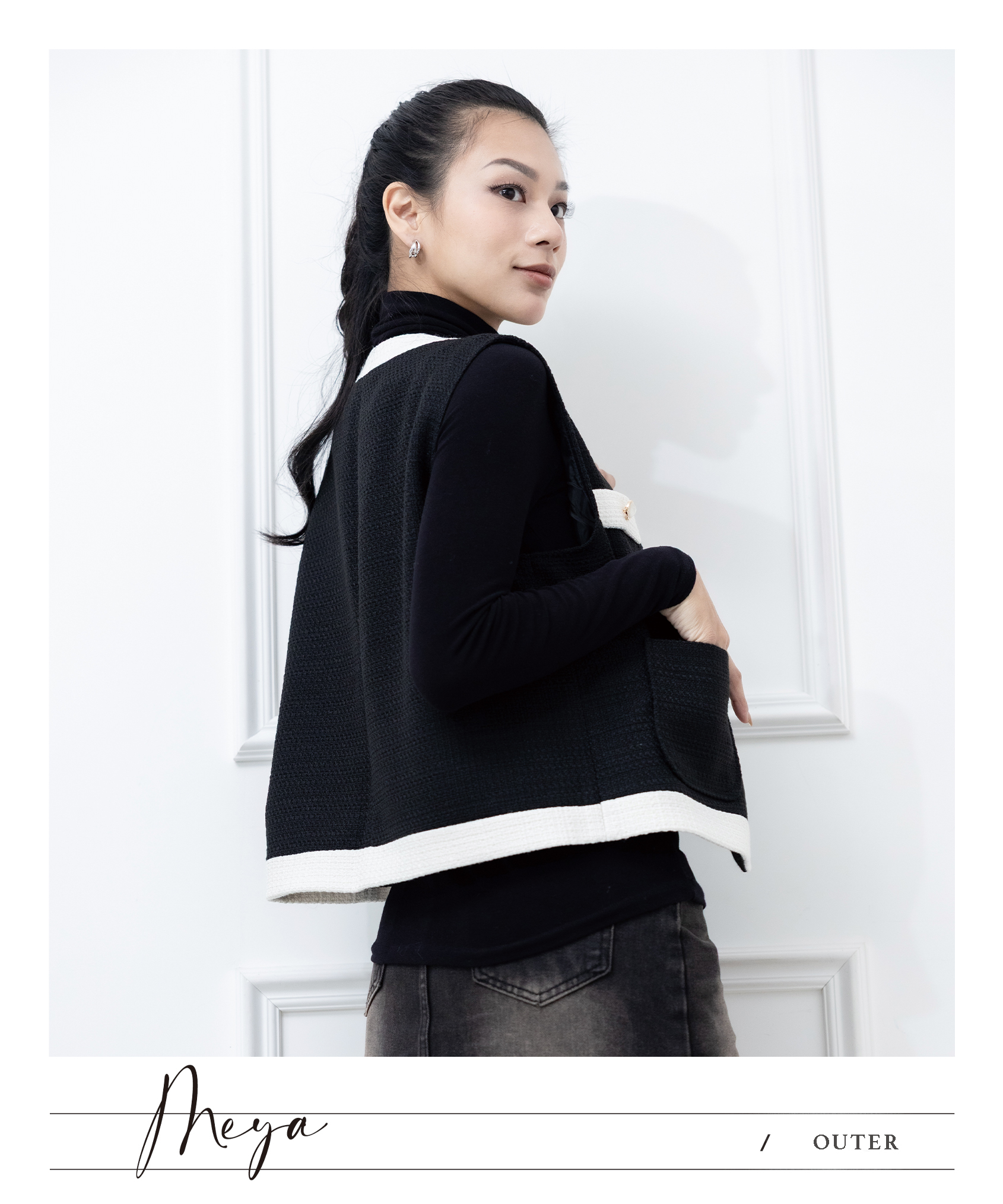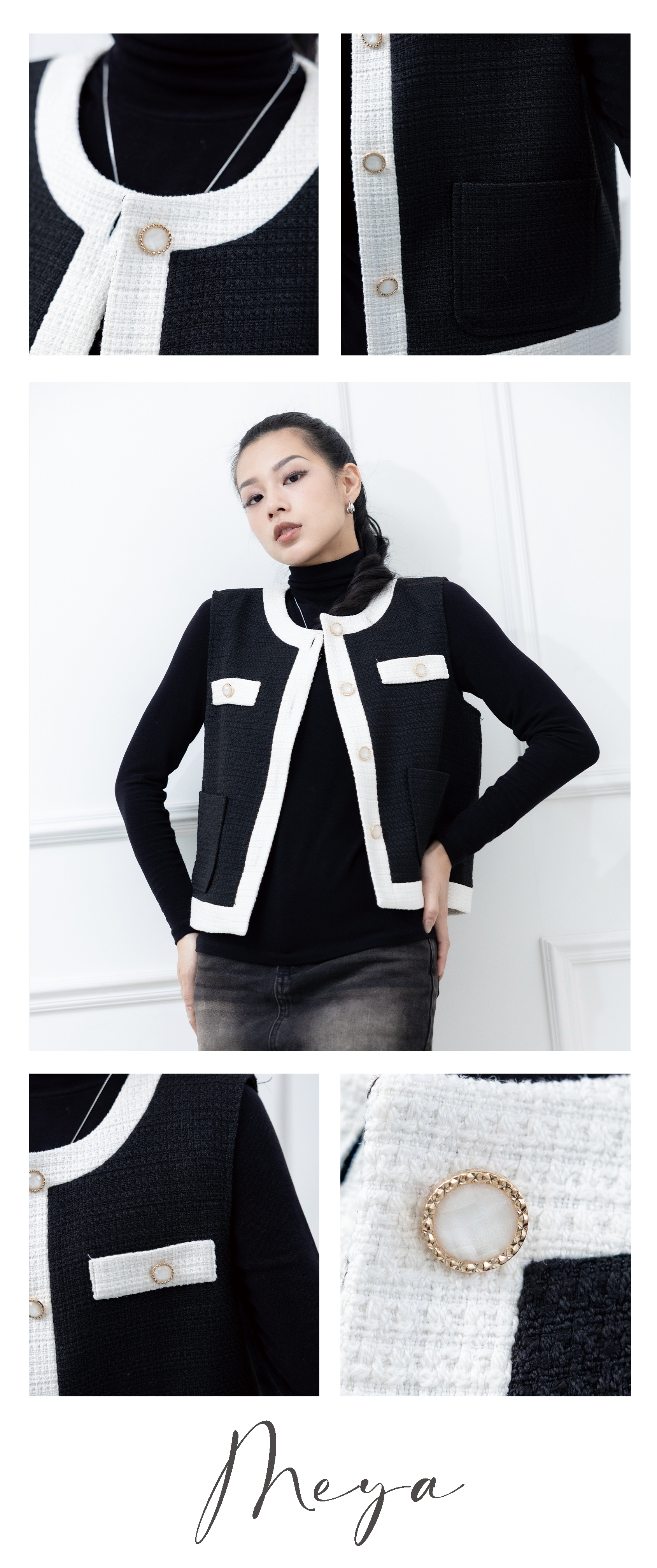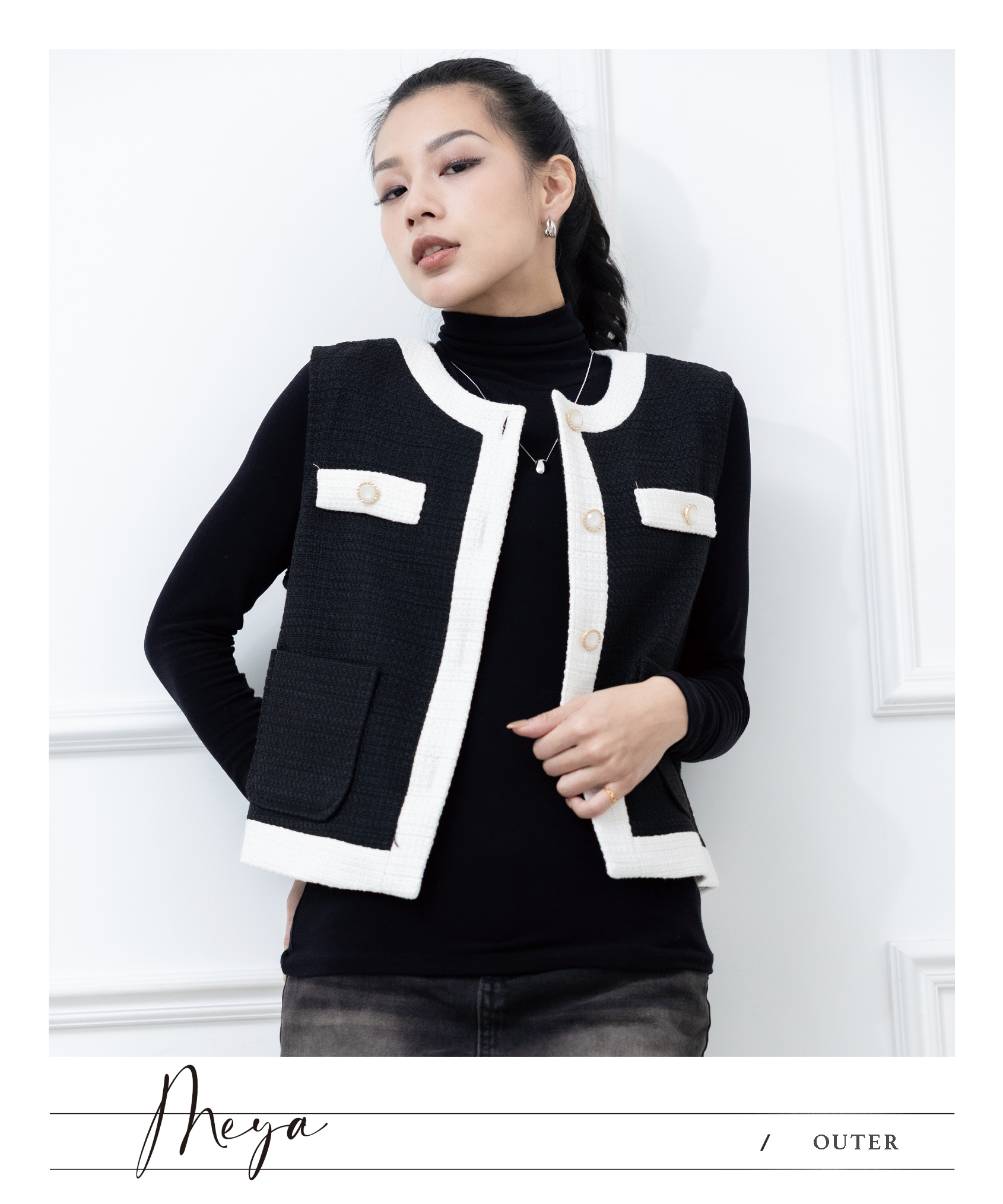 小香風拚色針織背心 / 黑底白色邊