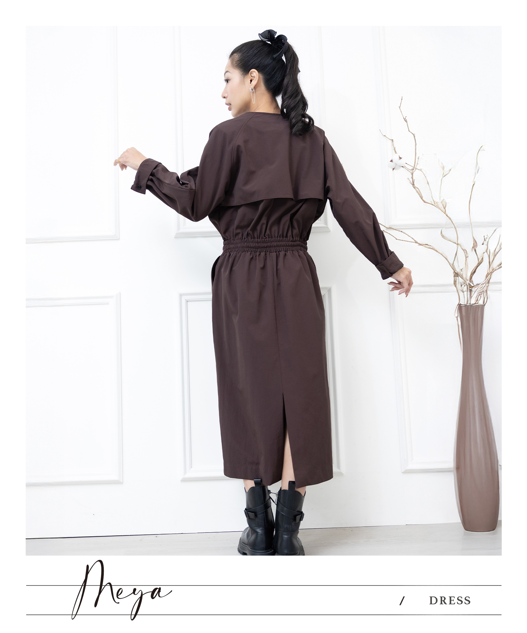 排釦收腰長袖洋裝 口袋 / 深棕色