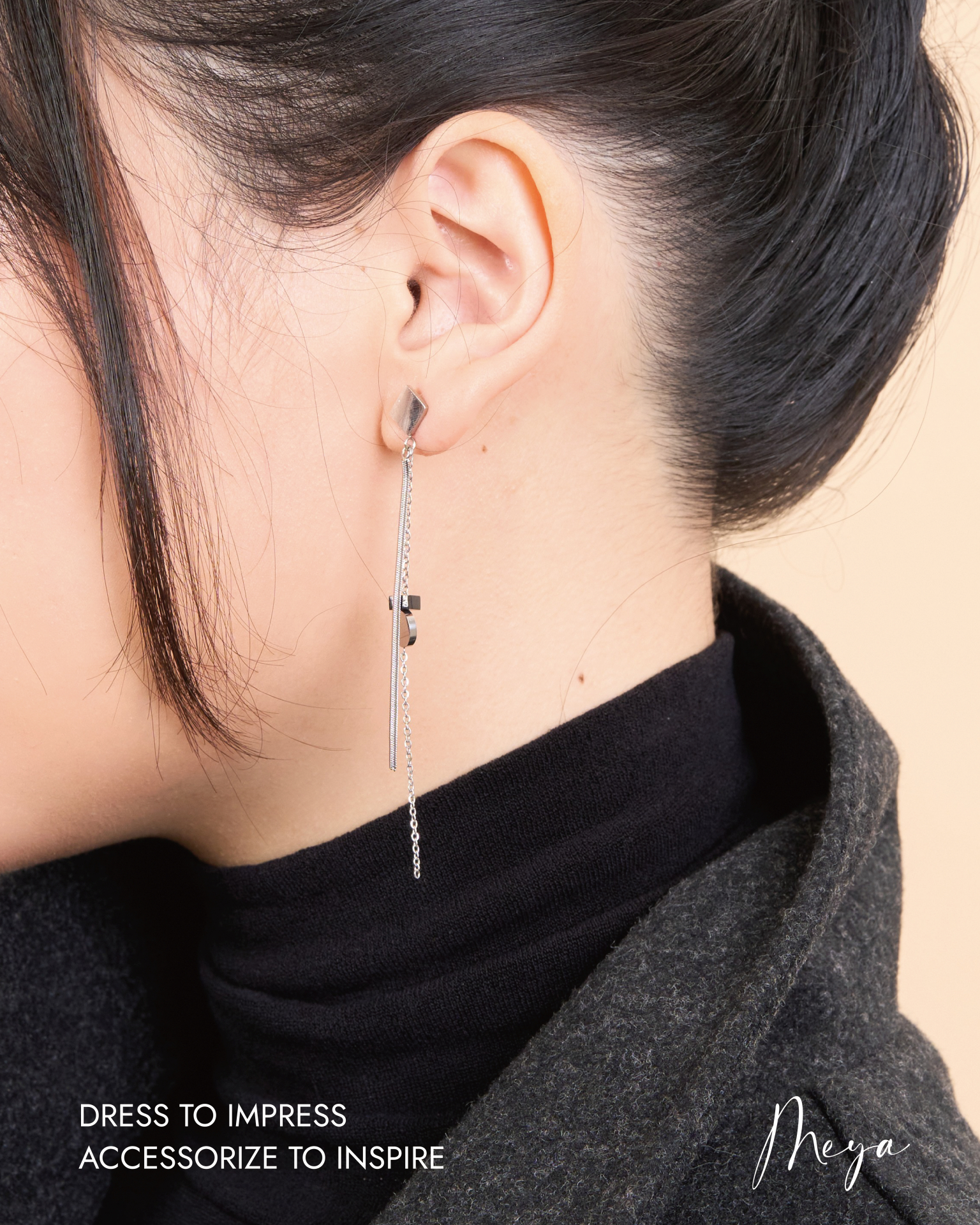 菱形細蛇鏈小豆鏈幾何 垂墜式耳環/銀色