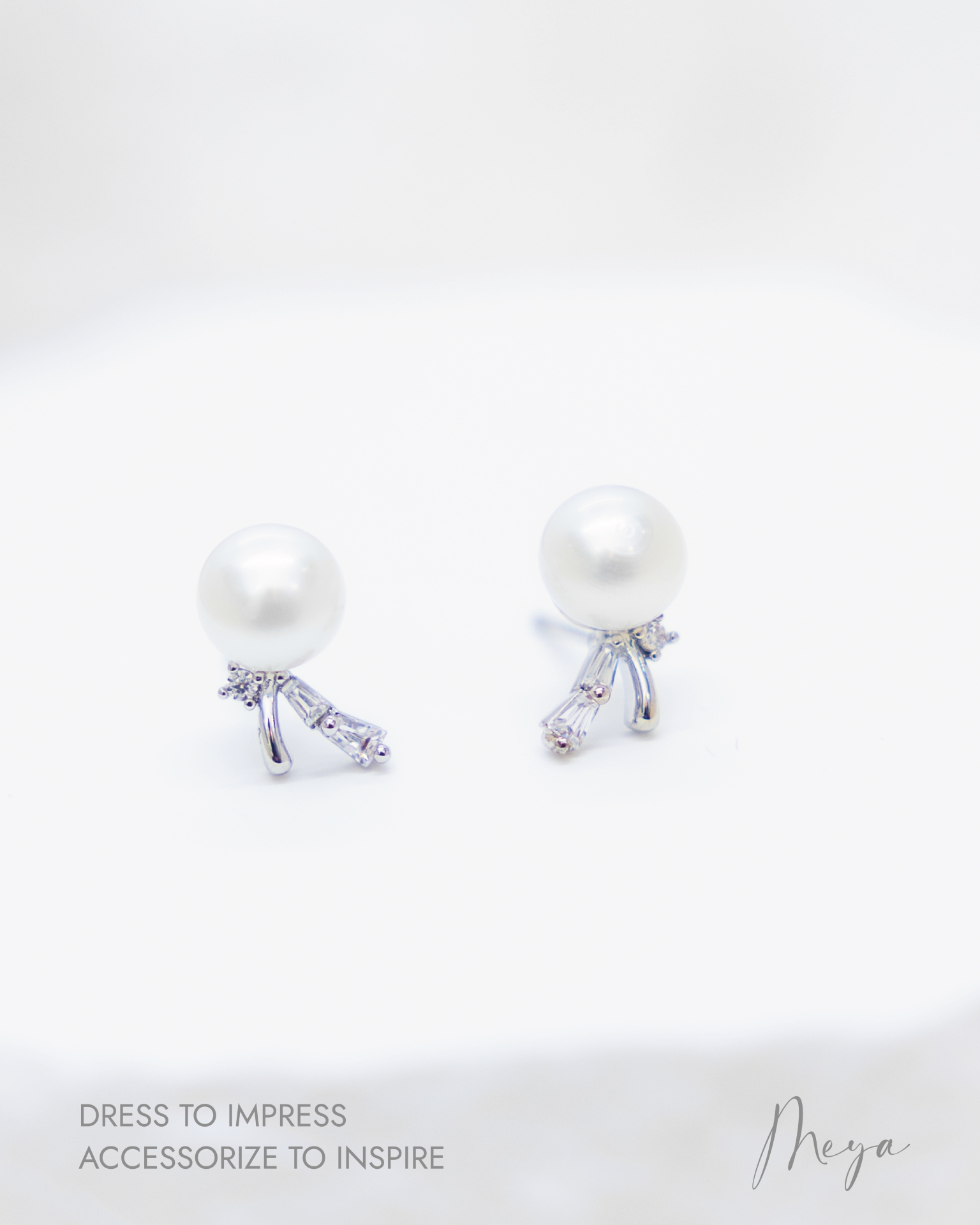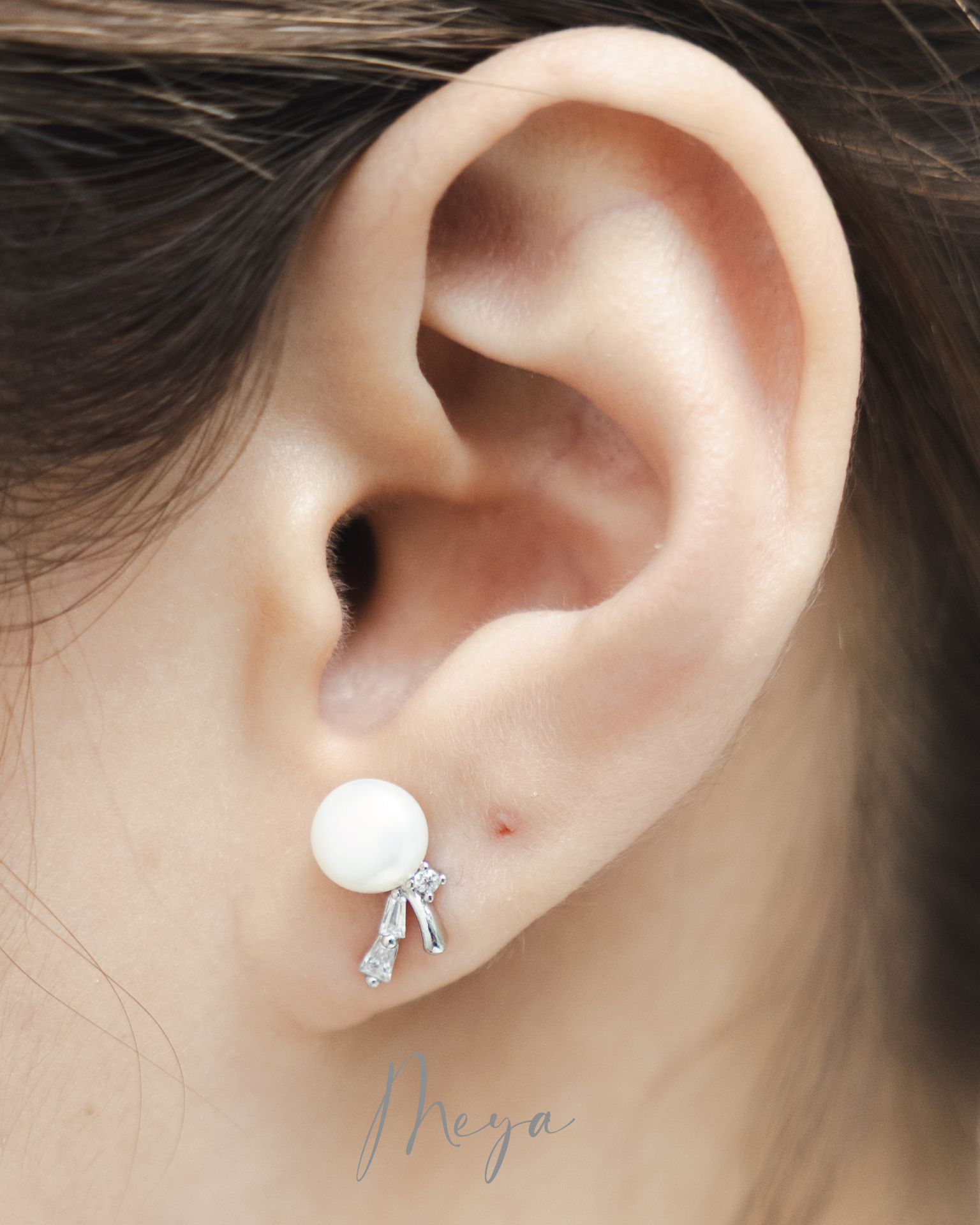 귀걸이 珍珠接長形鋯石耳環 / 銀色