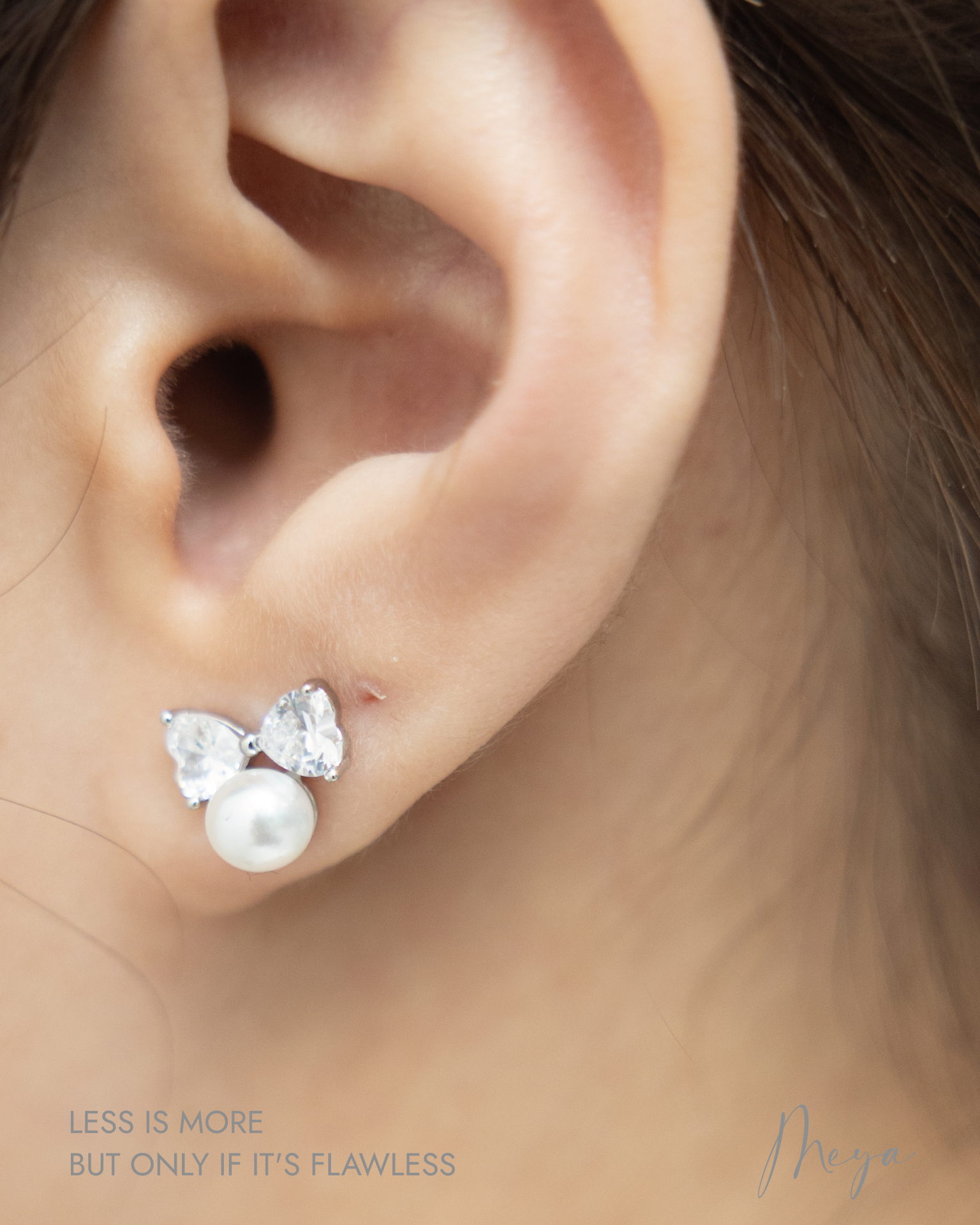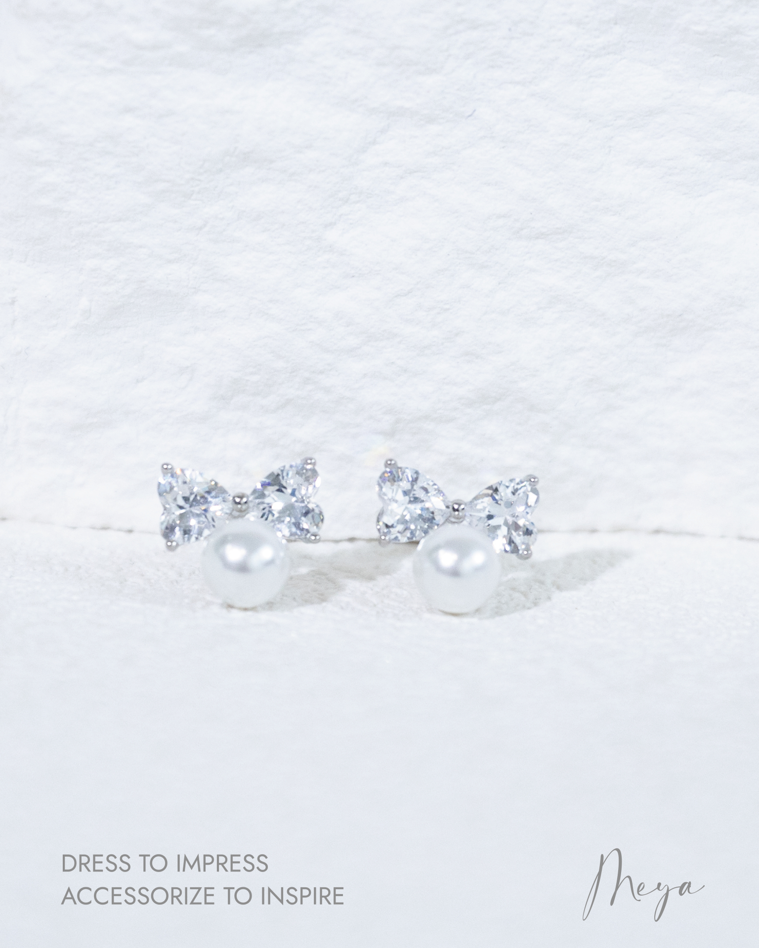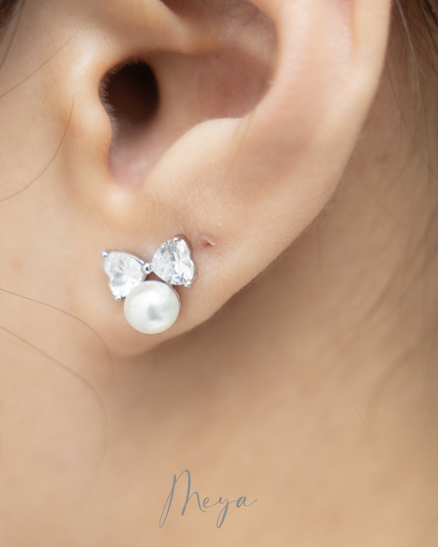 귀걸이 珍珠鋯石蝴蝶結耳環 / 銀色