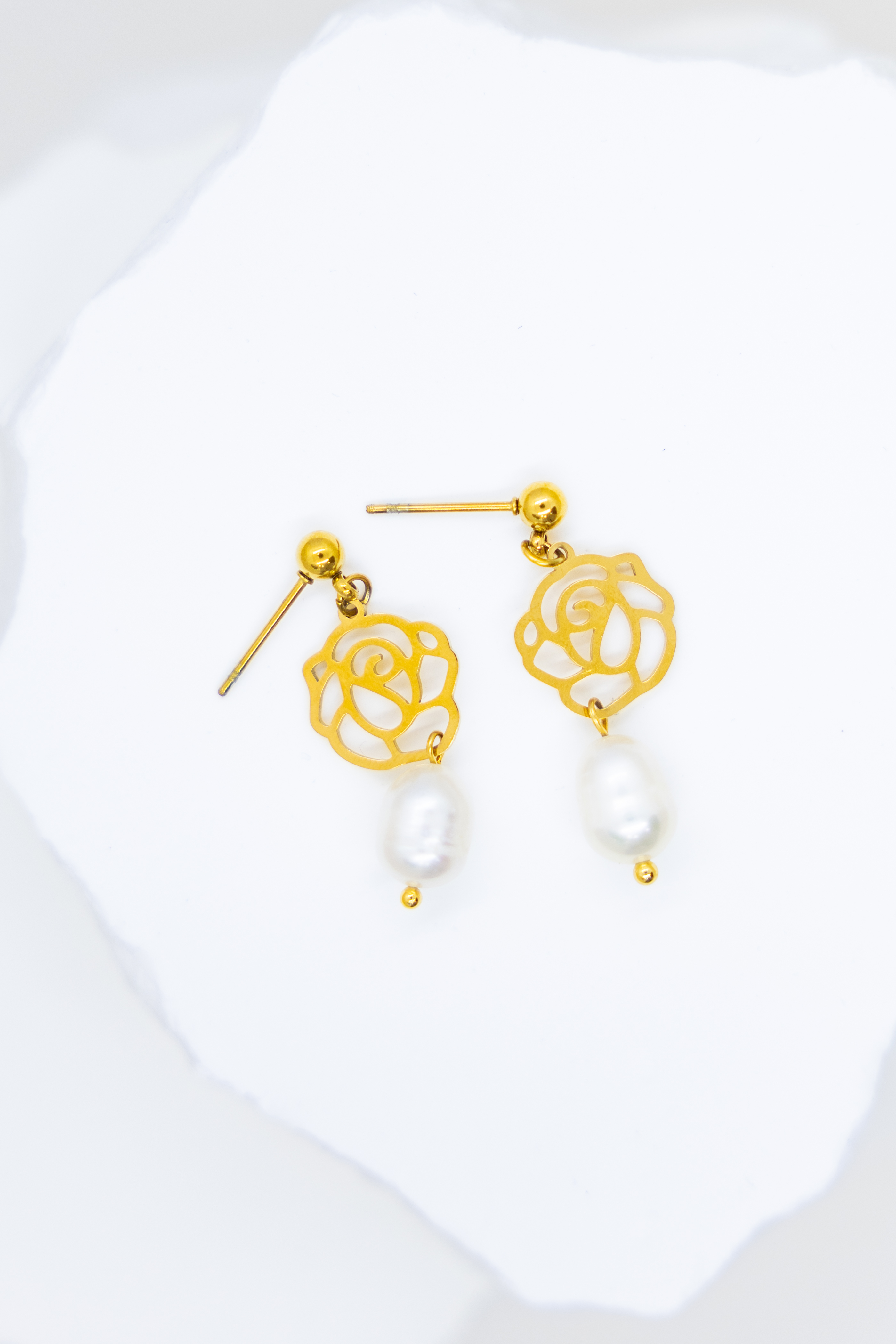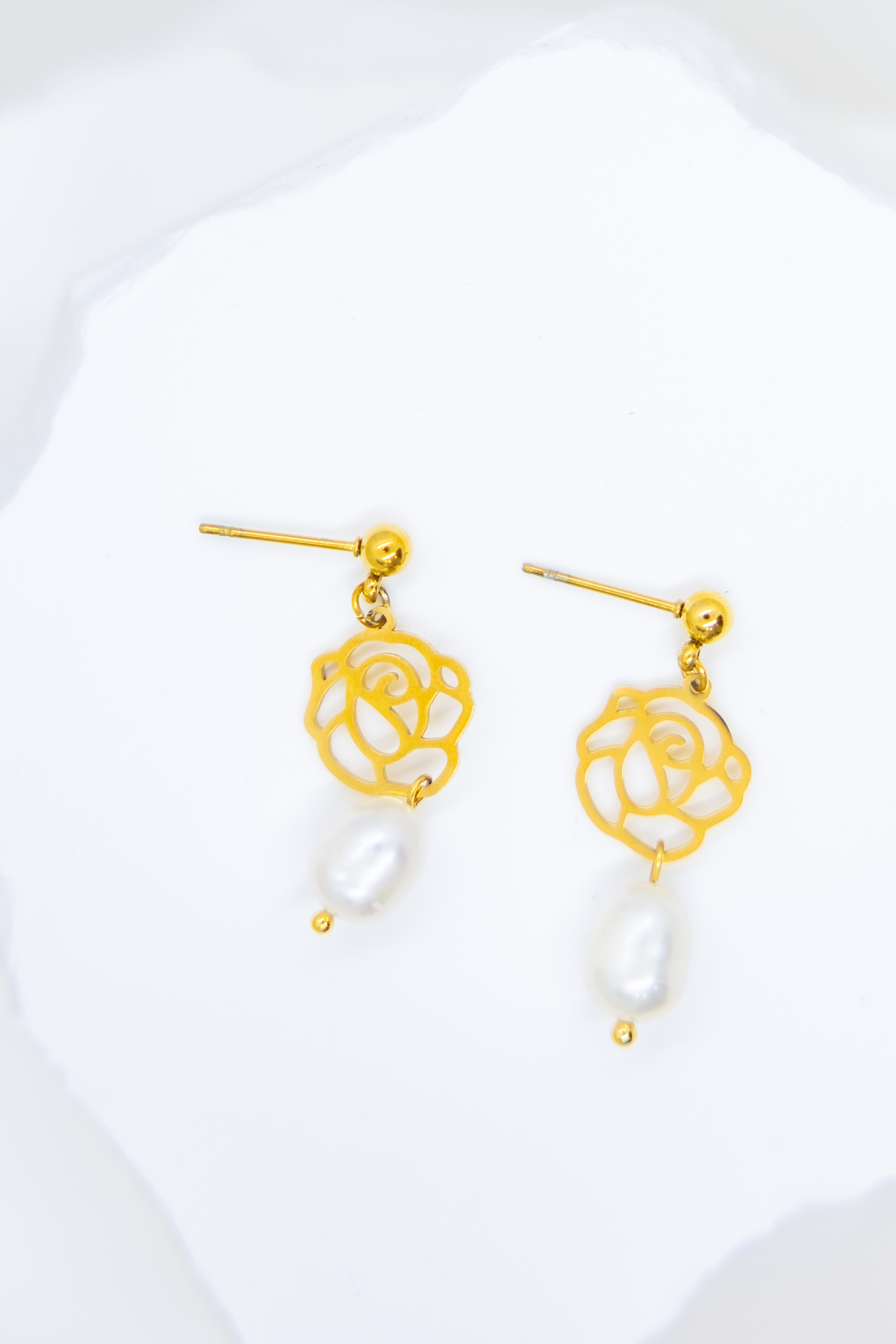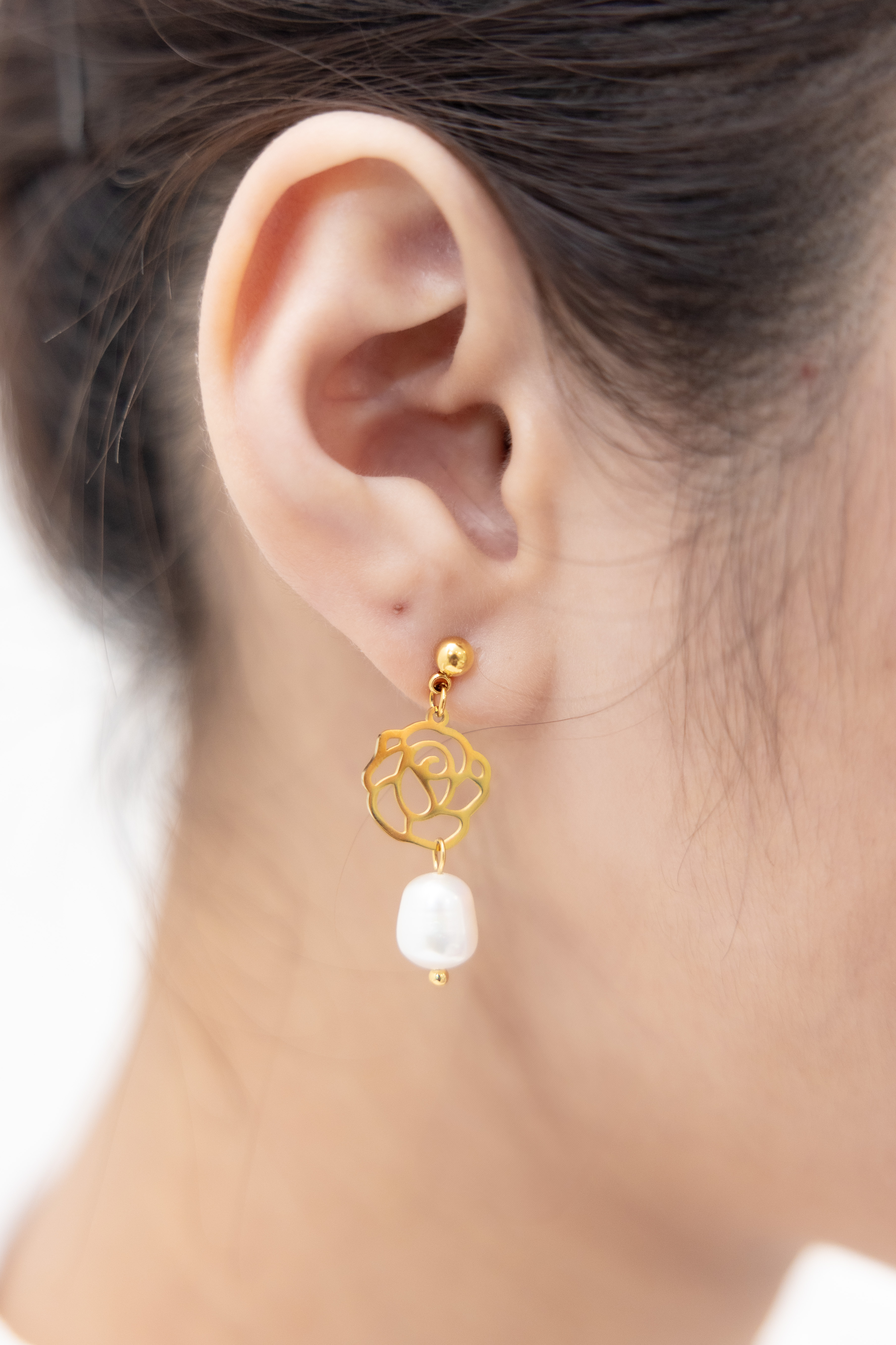 線條玫瑰花綴珍珠垂墜式耳環