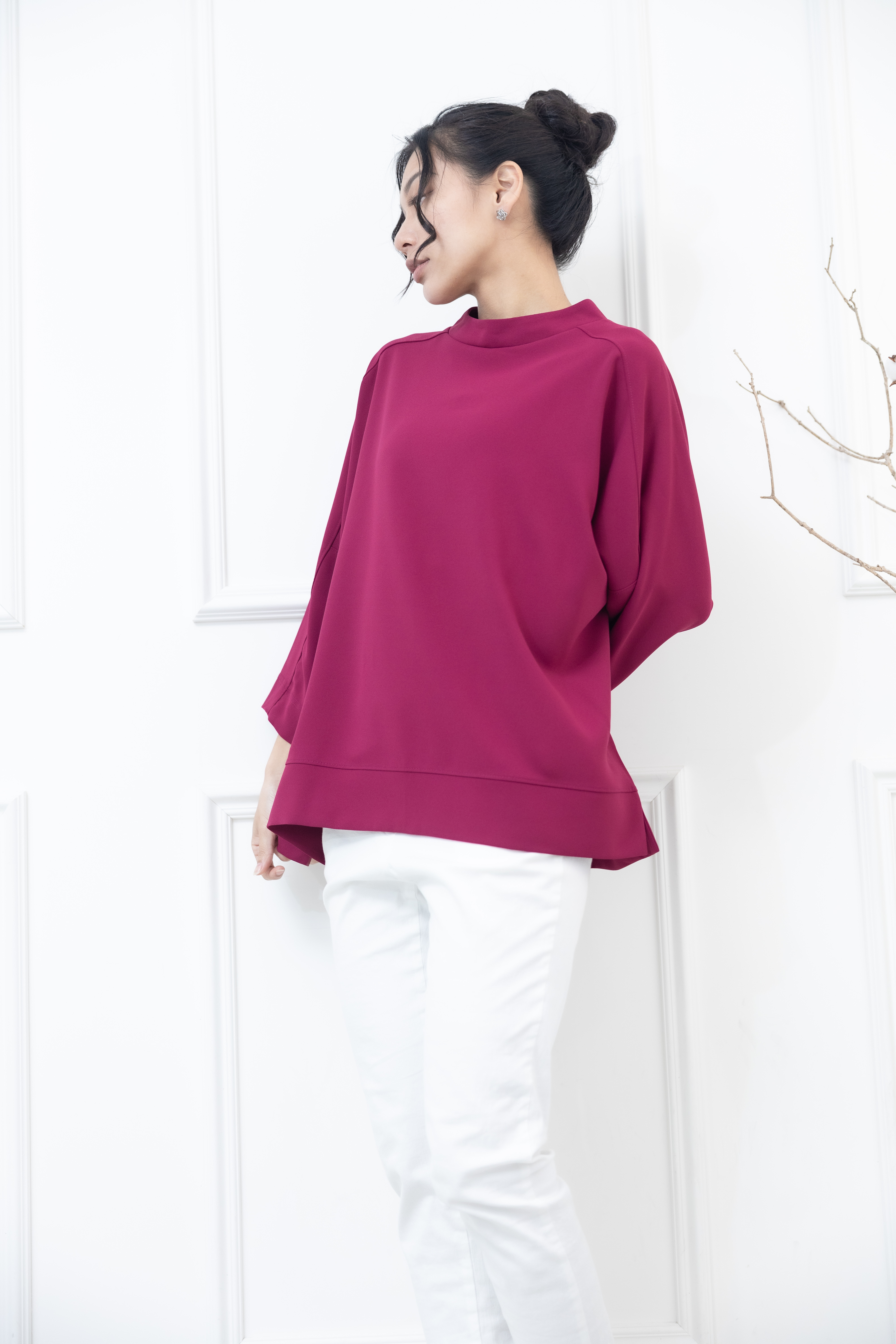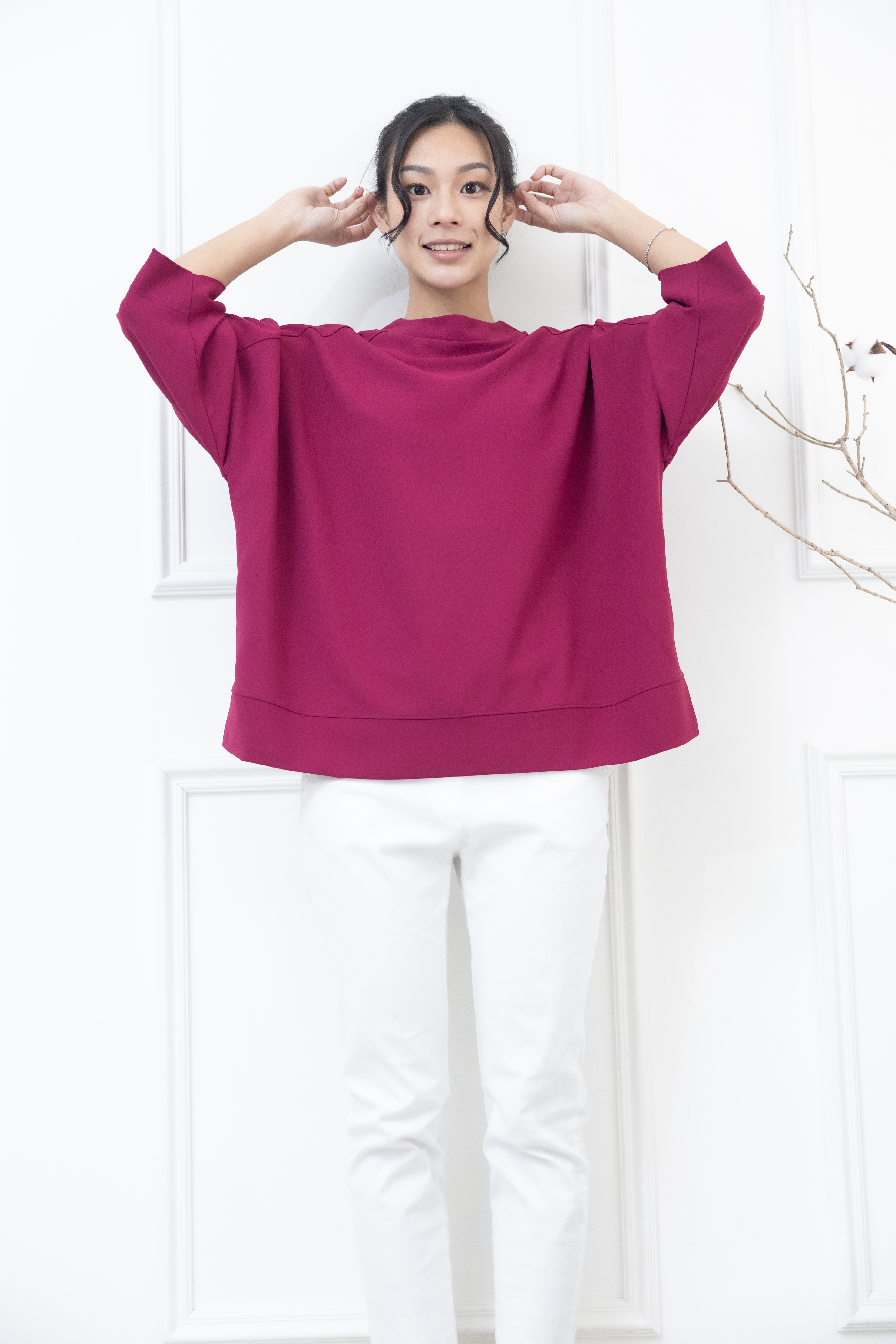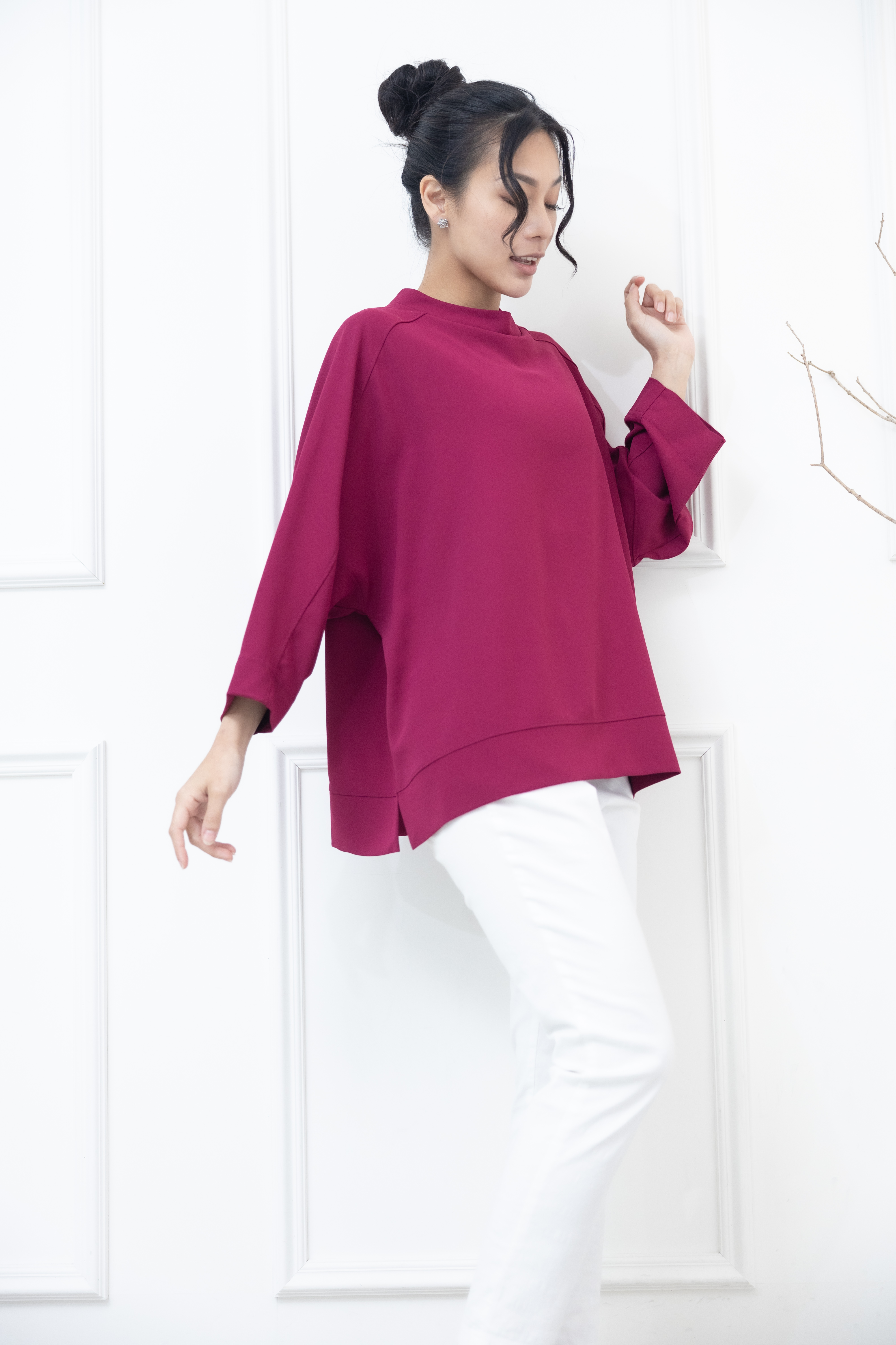 긴팔 下擺開岔背後金屬拉鍊寬版上衣 / 桃紅色