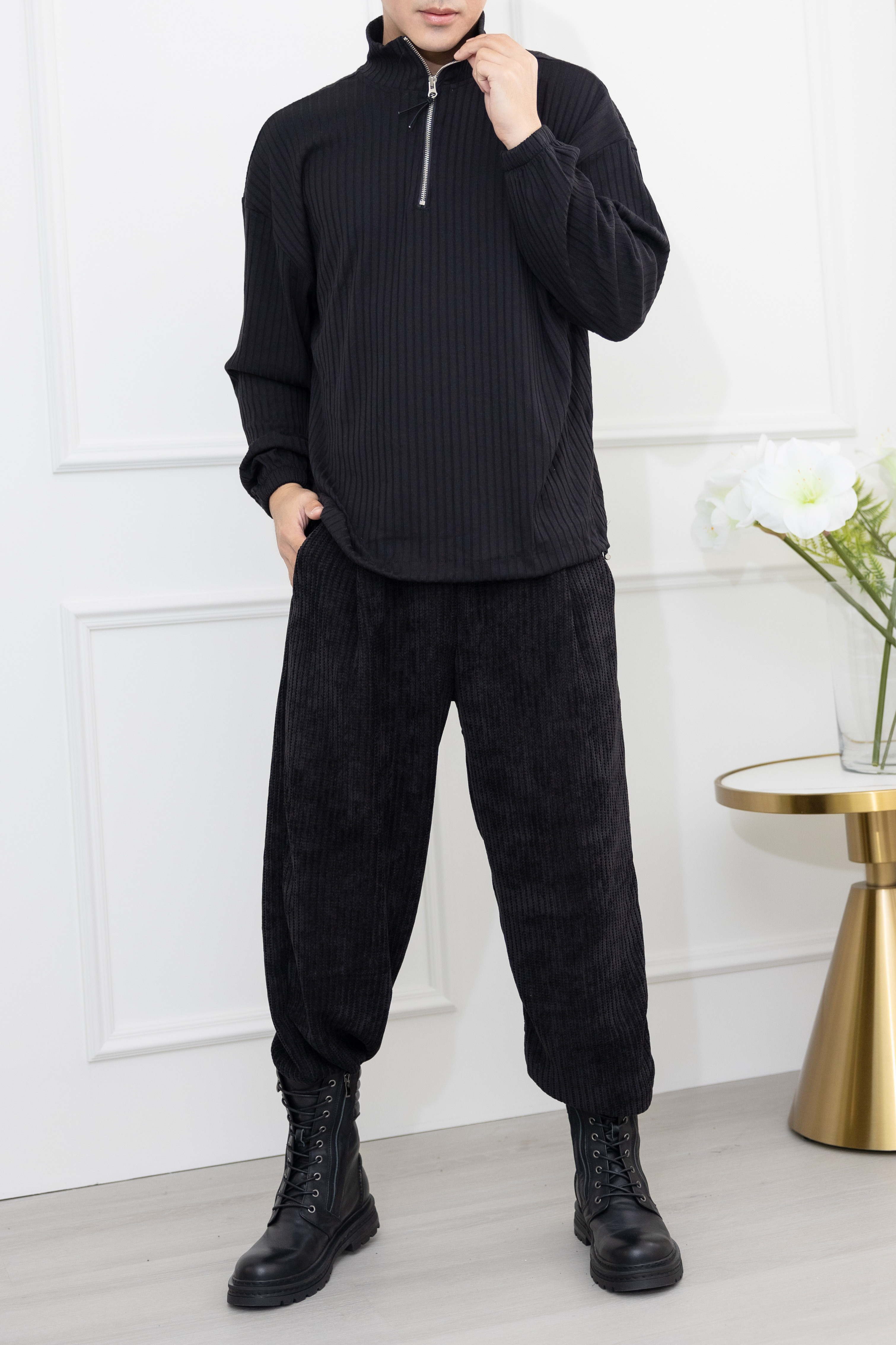 긴팔 半拉鍊直紋彈性長袖上衣/黑色