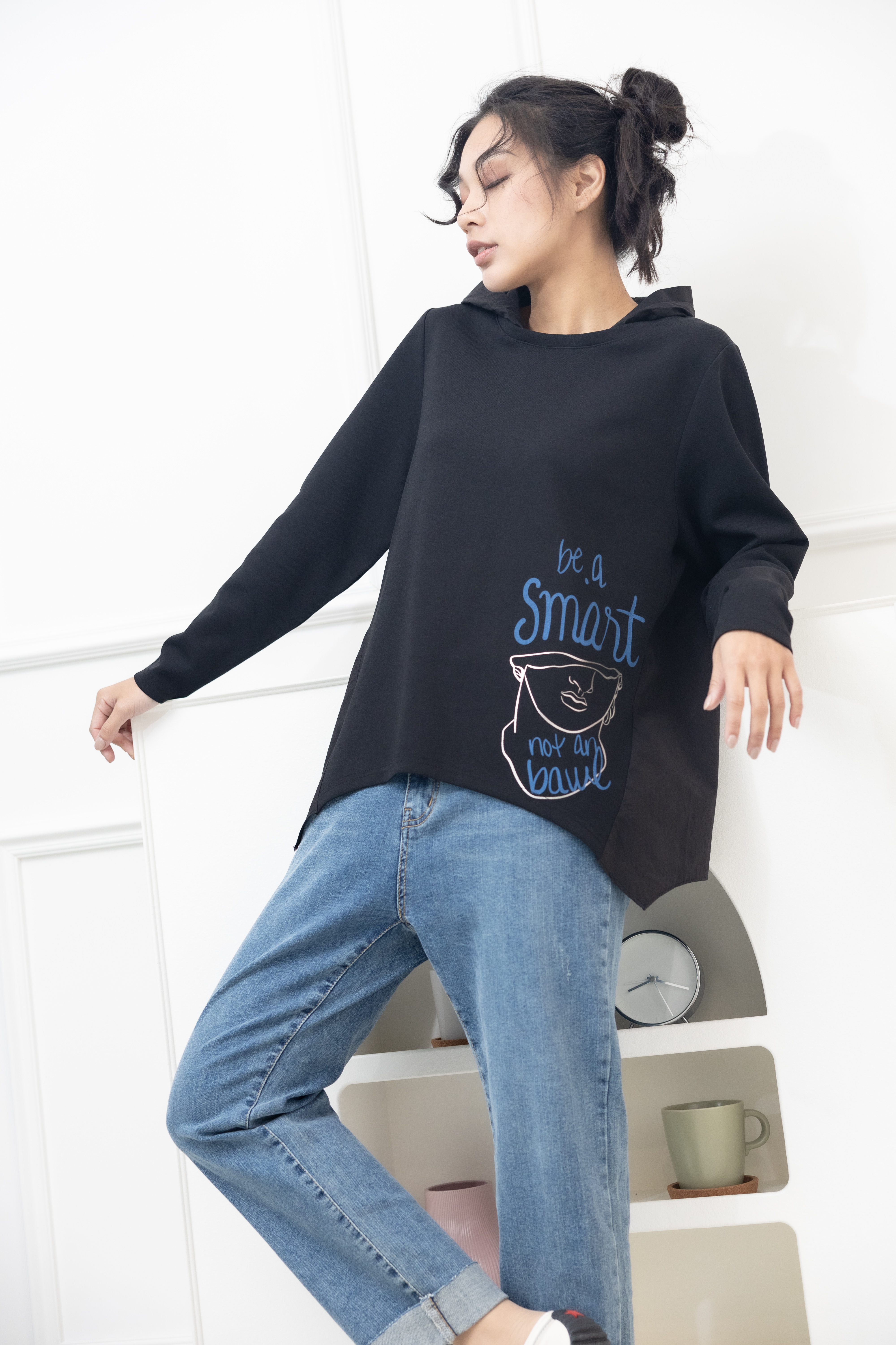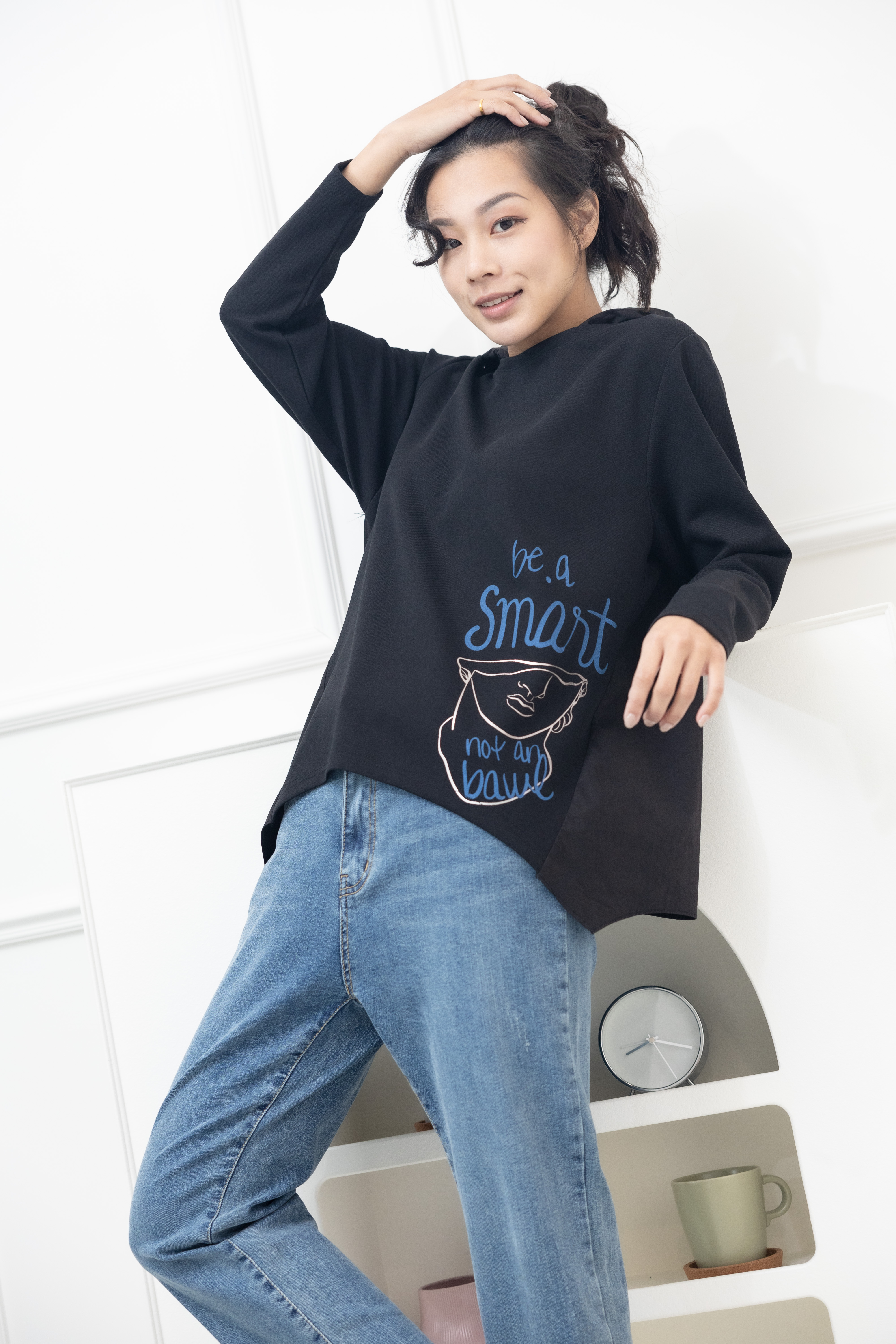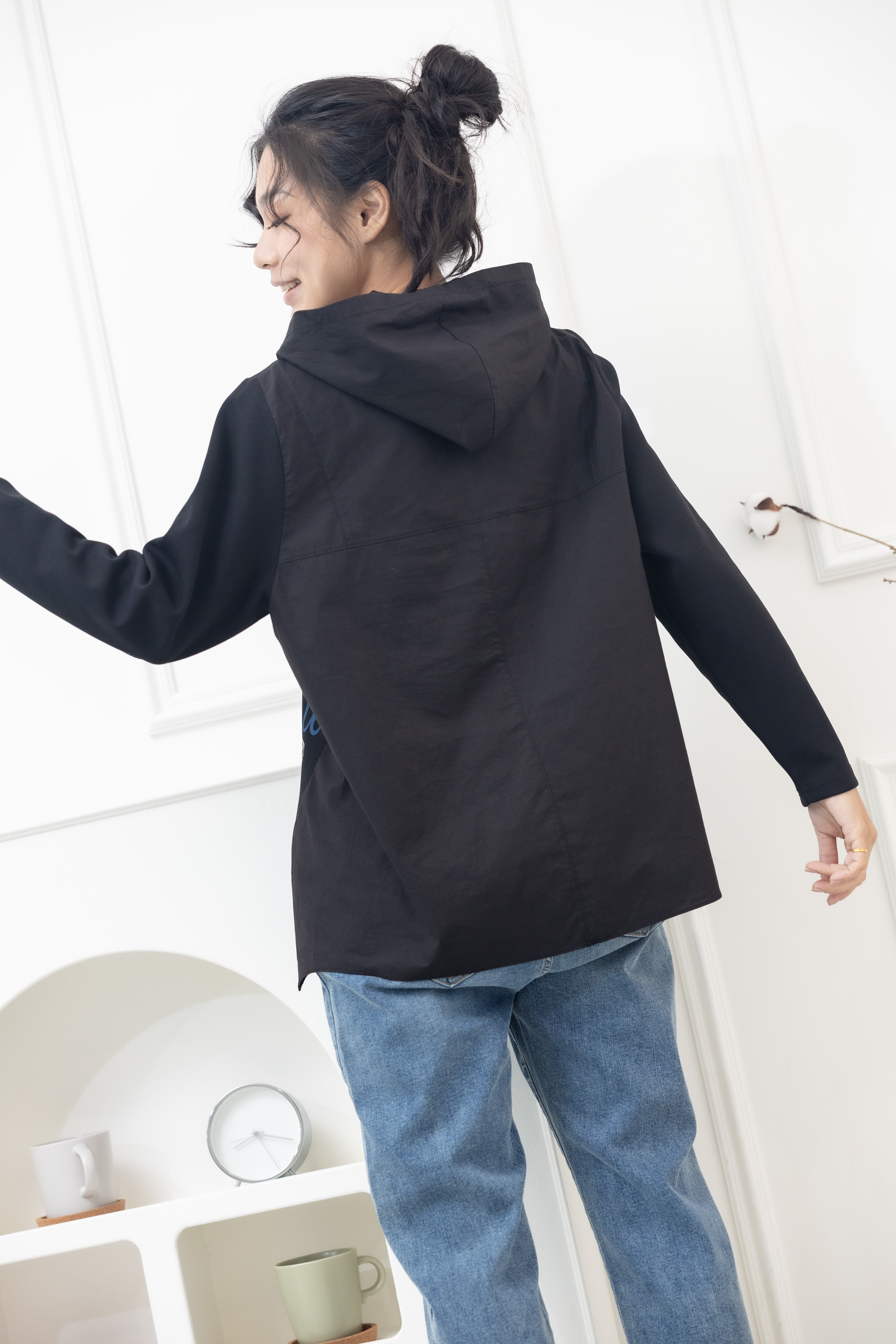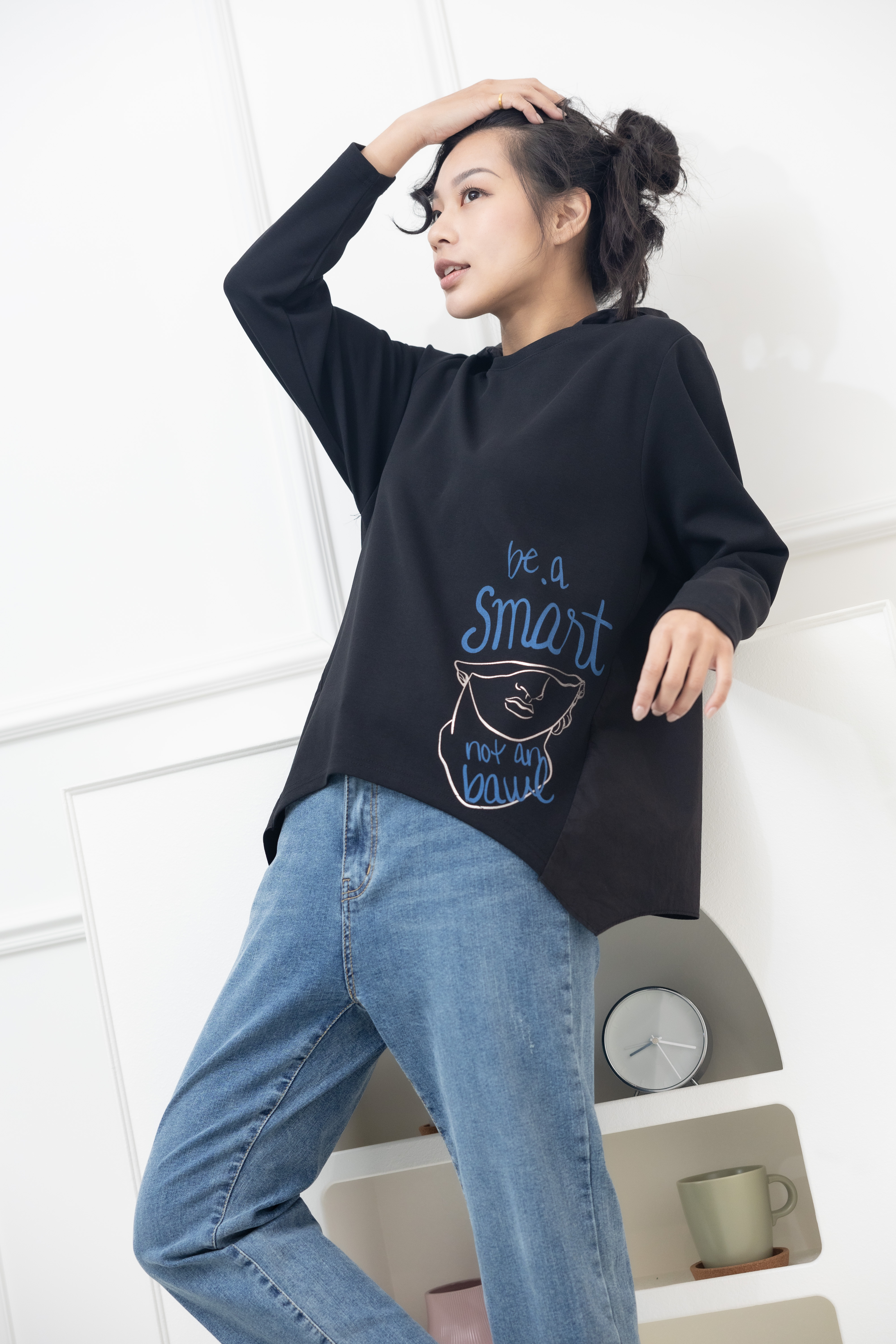 긴팔 半臉印花後拼棉布上衣 / 黑色