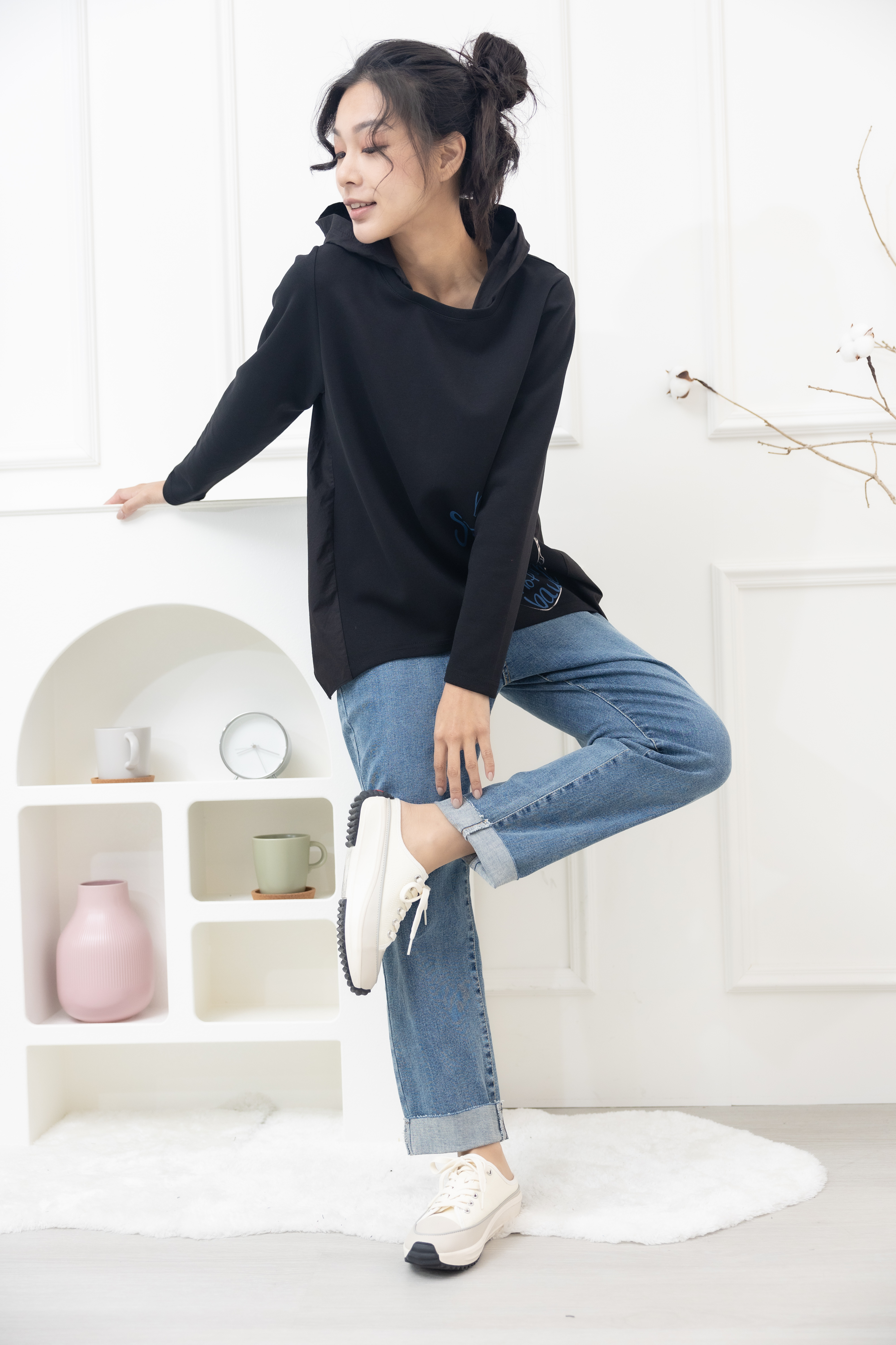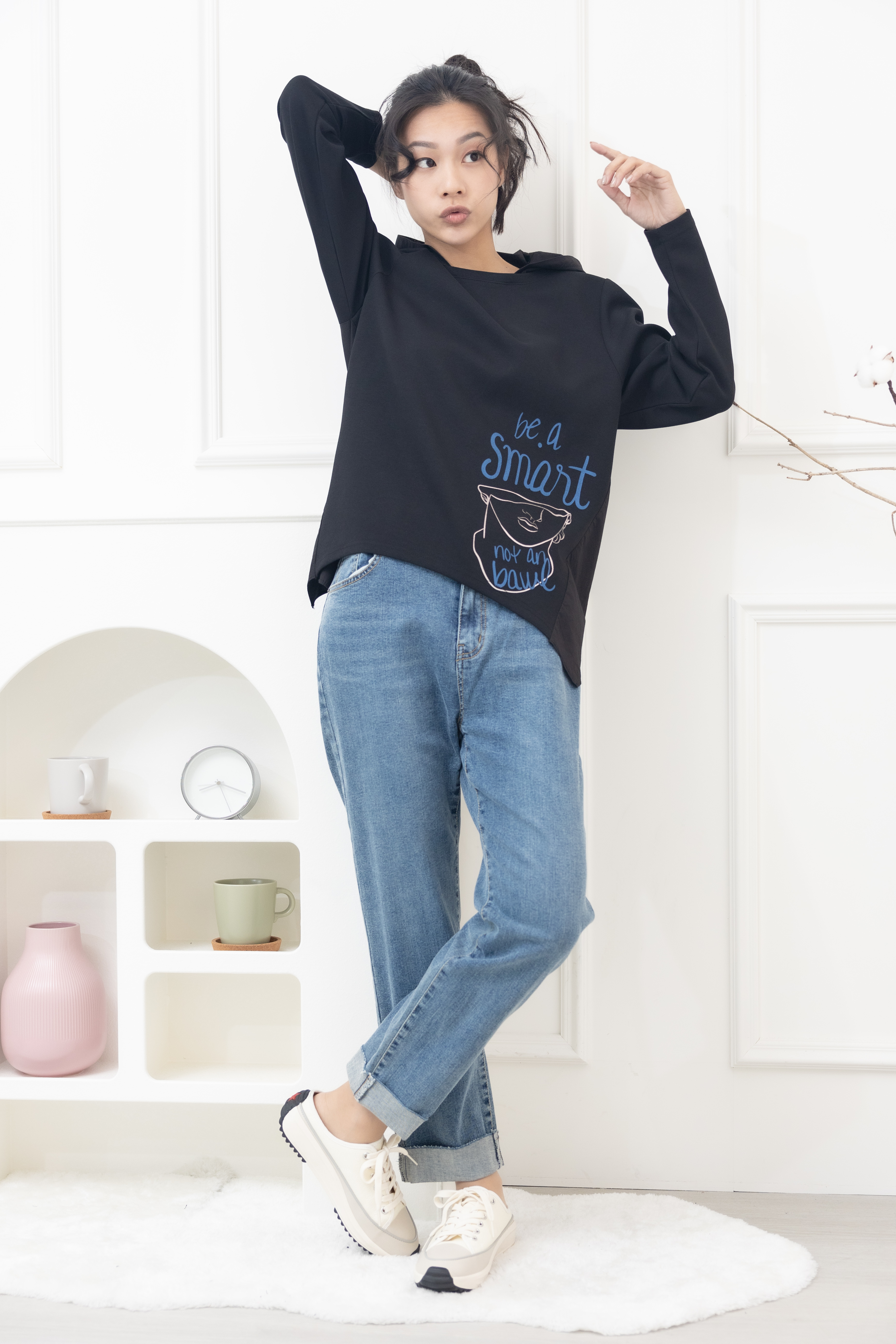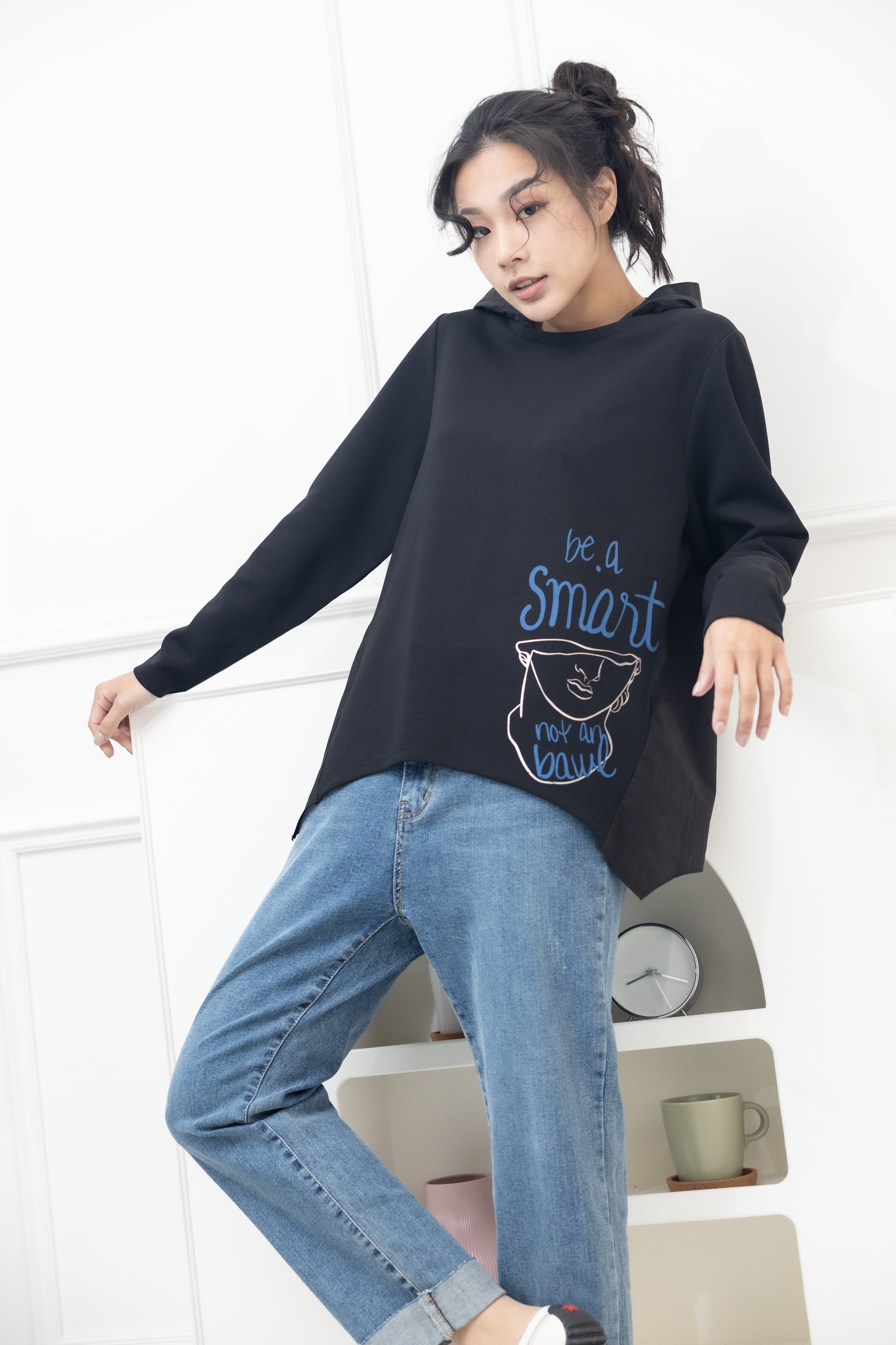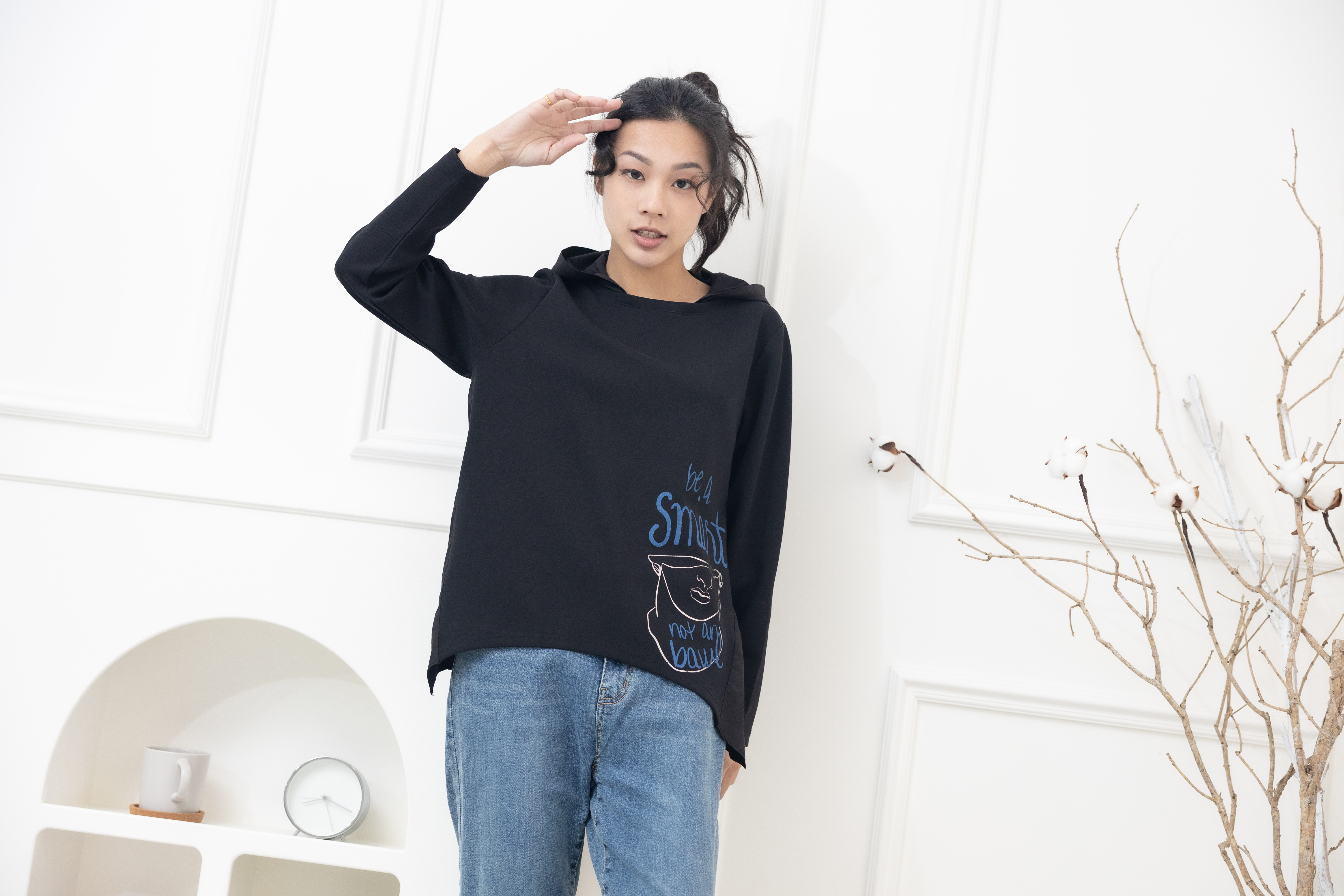 긴팔 半臉印花後拼棉布上衣 / 黑色