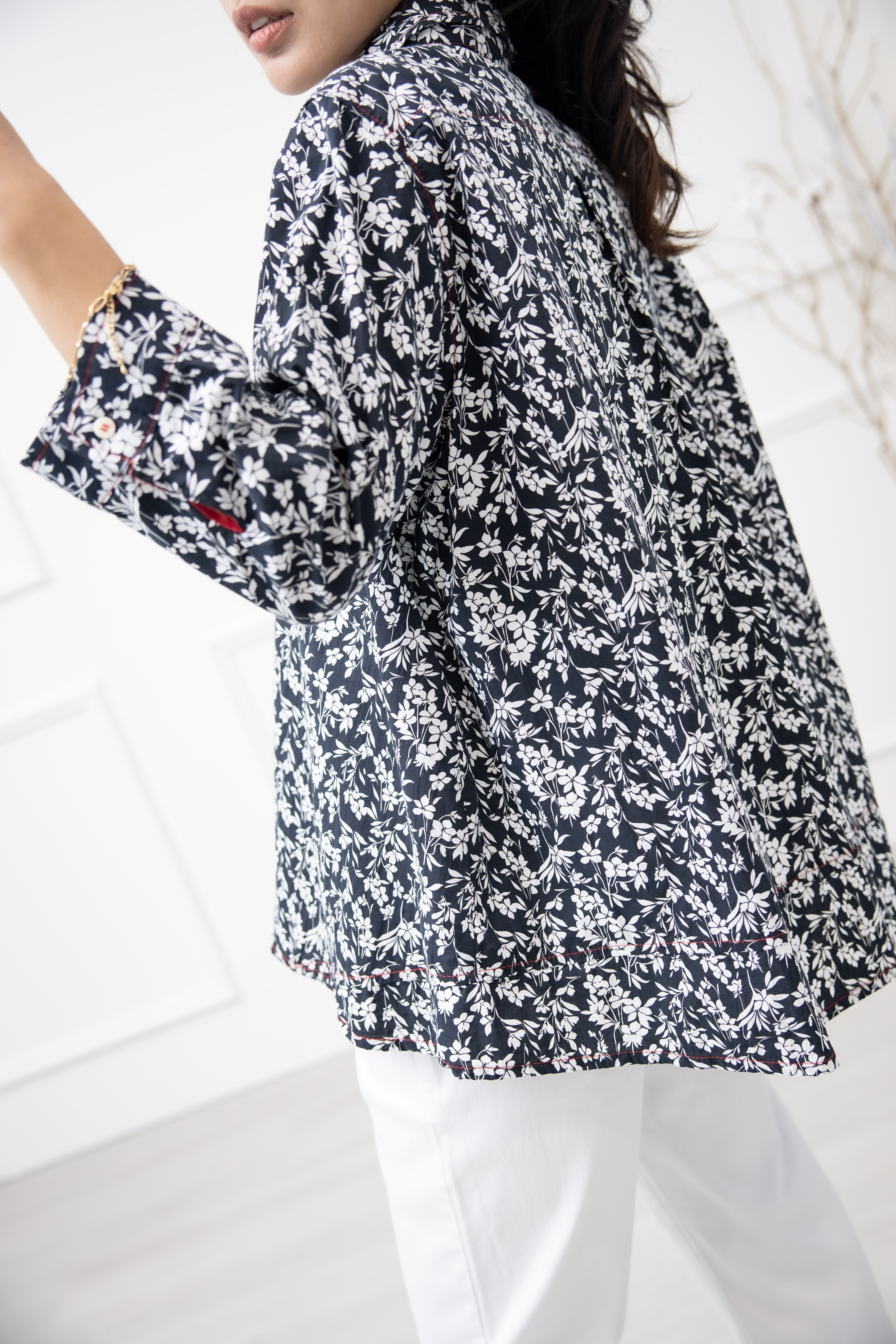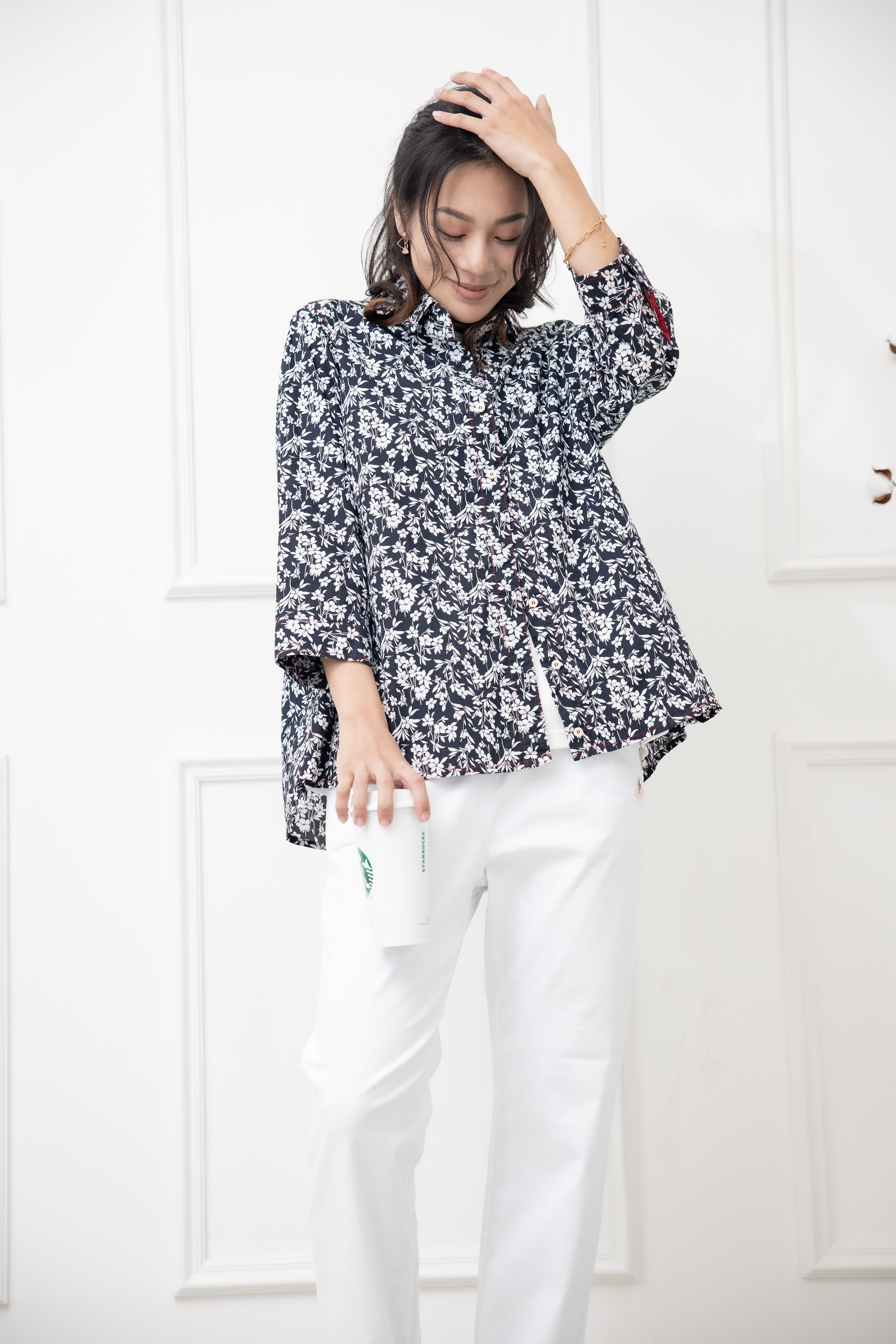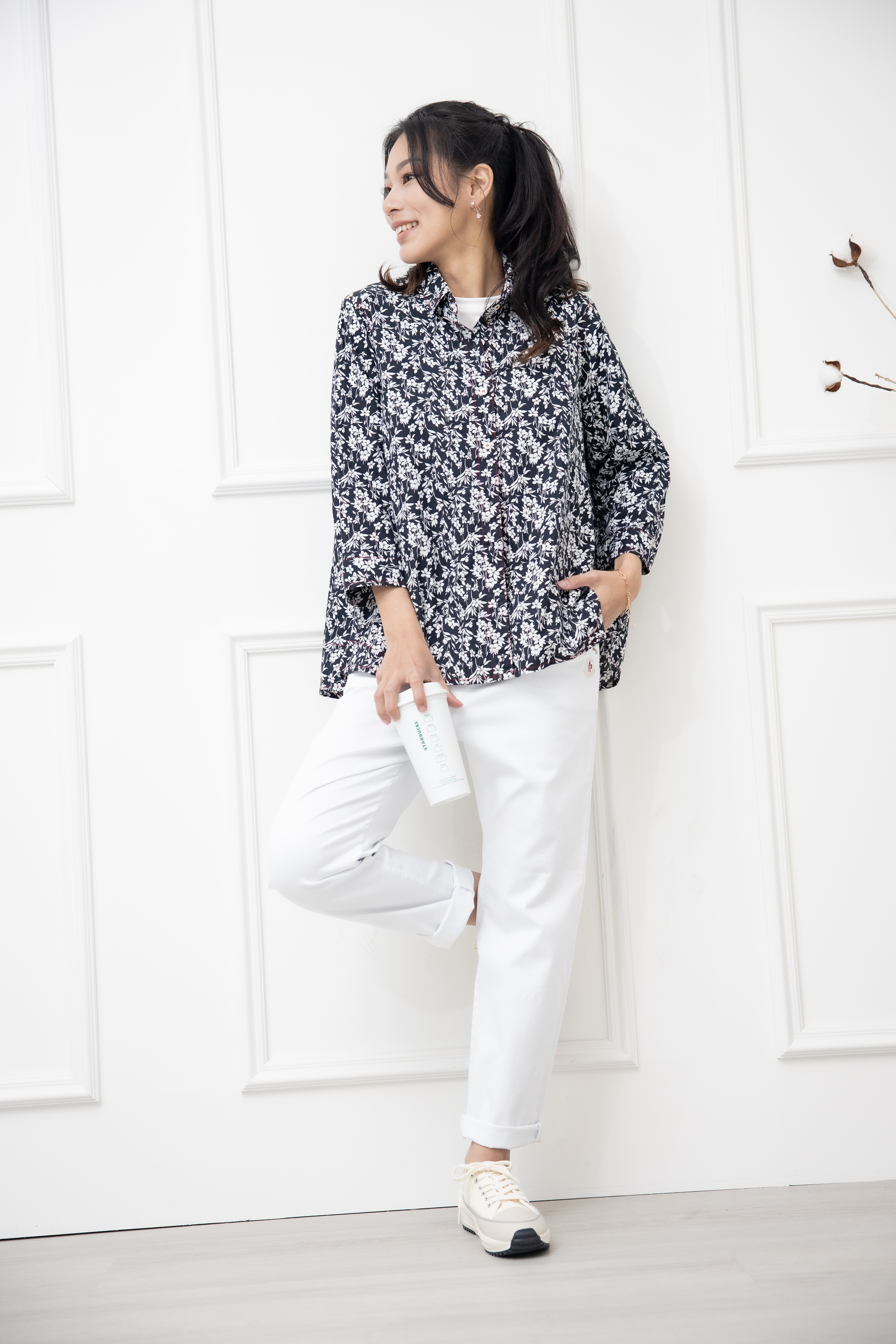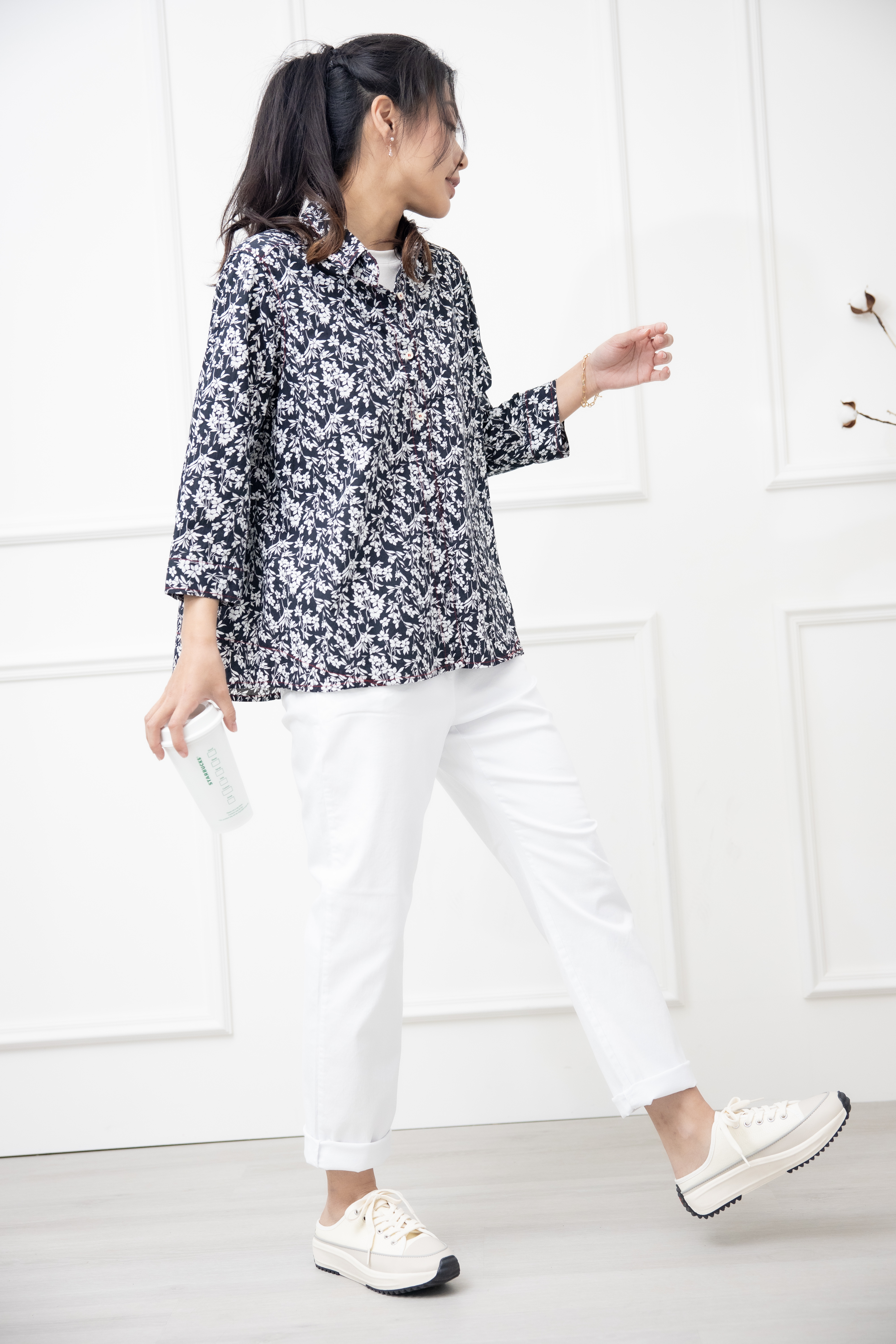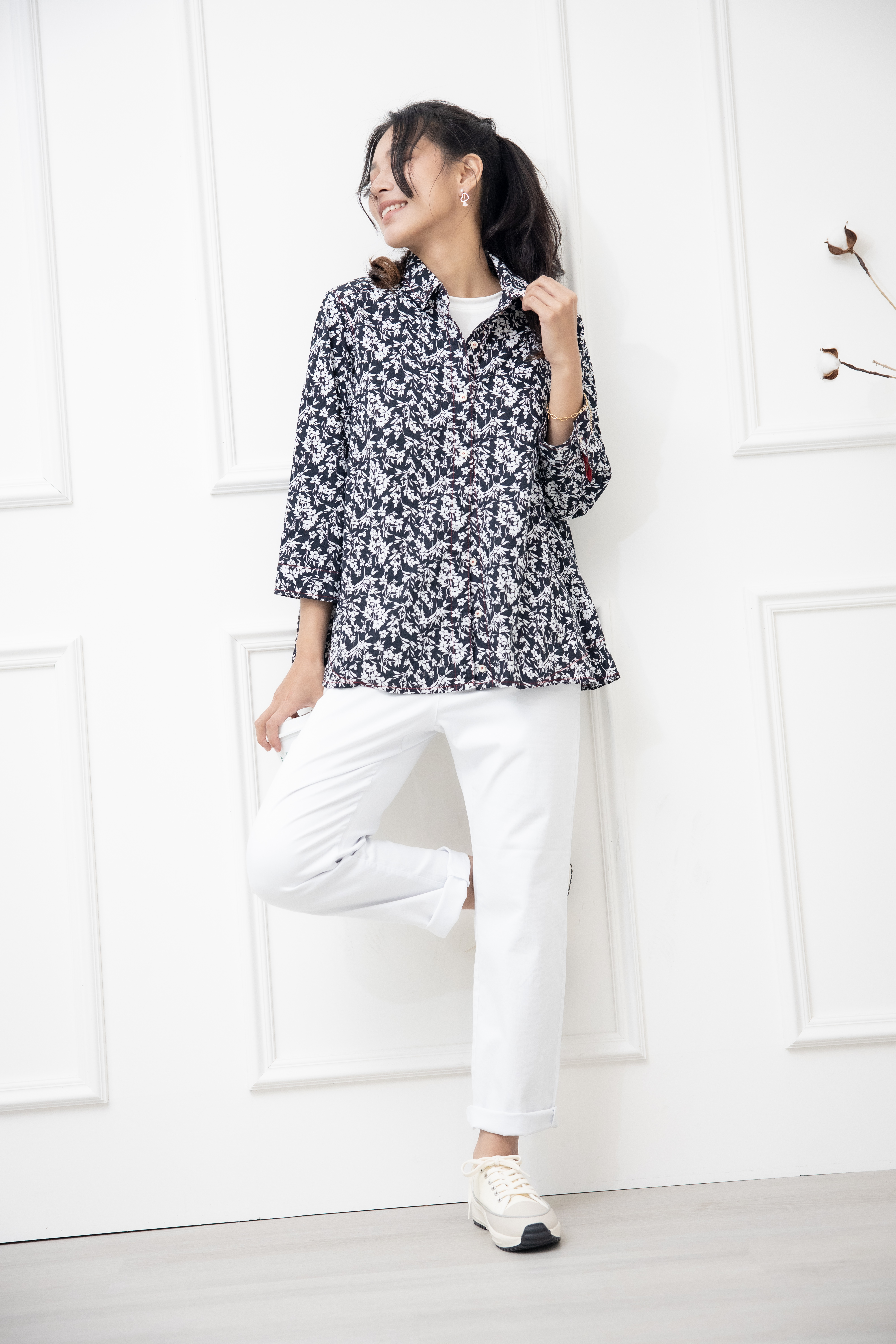 긴팔 印花七分袖襯衫上衣 /黑底白葉影