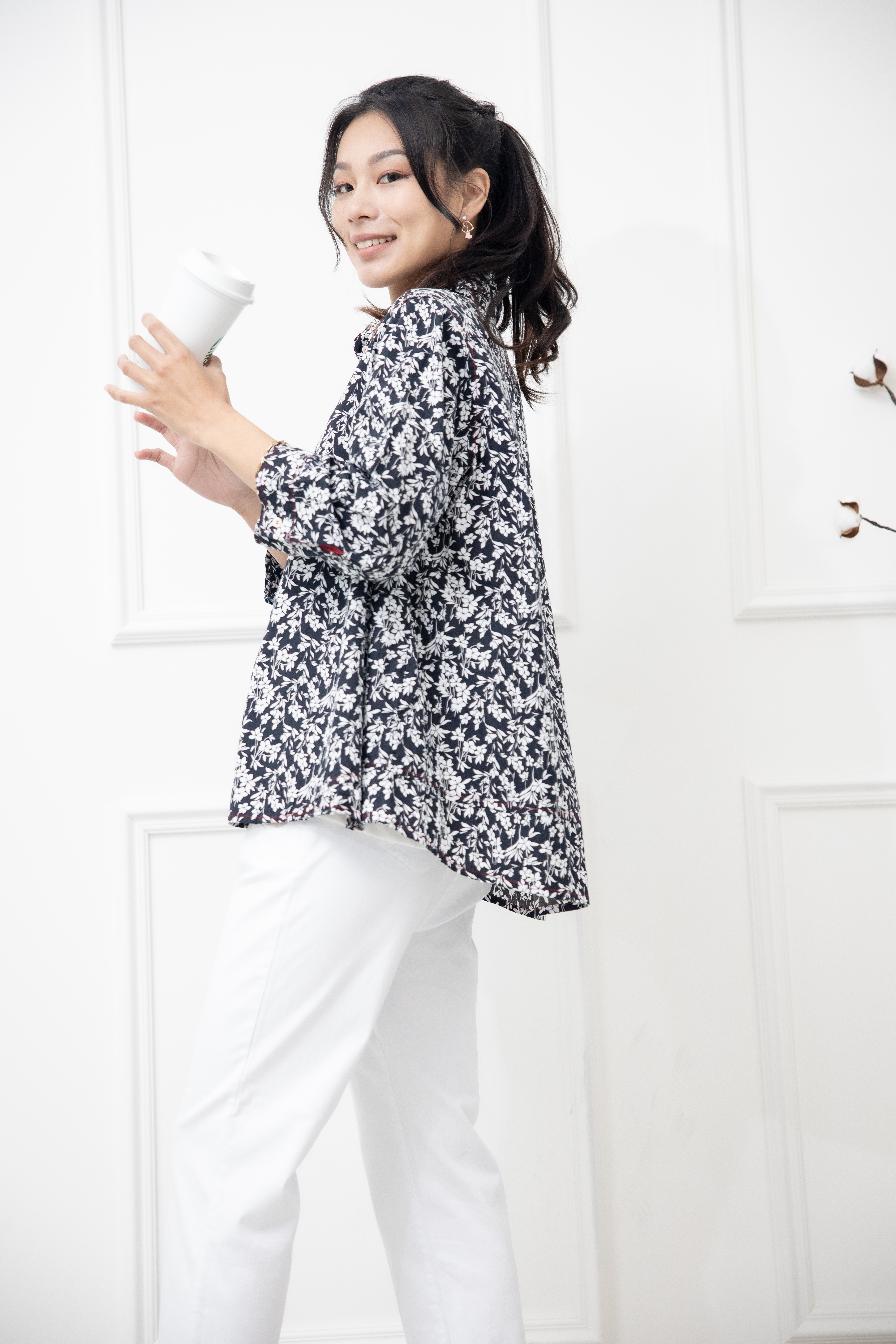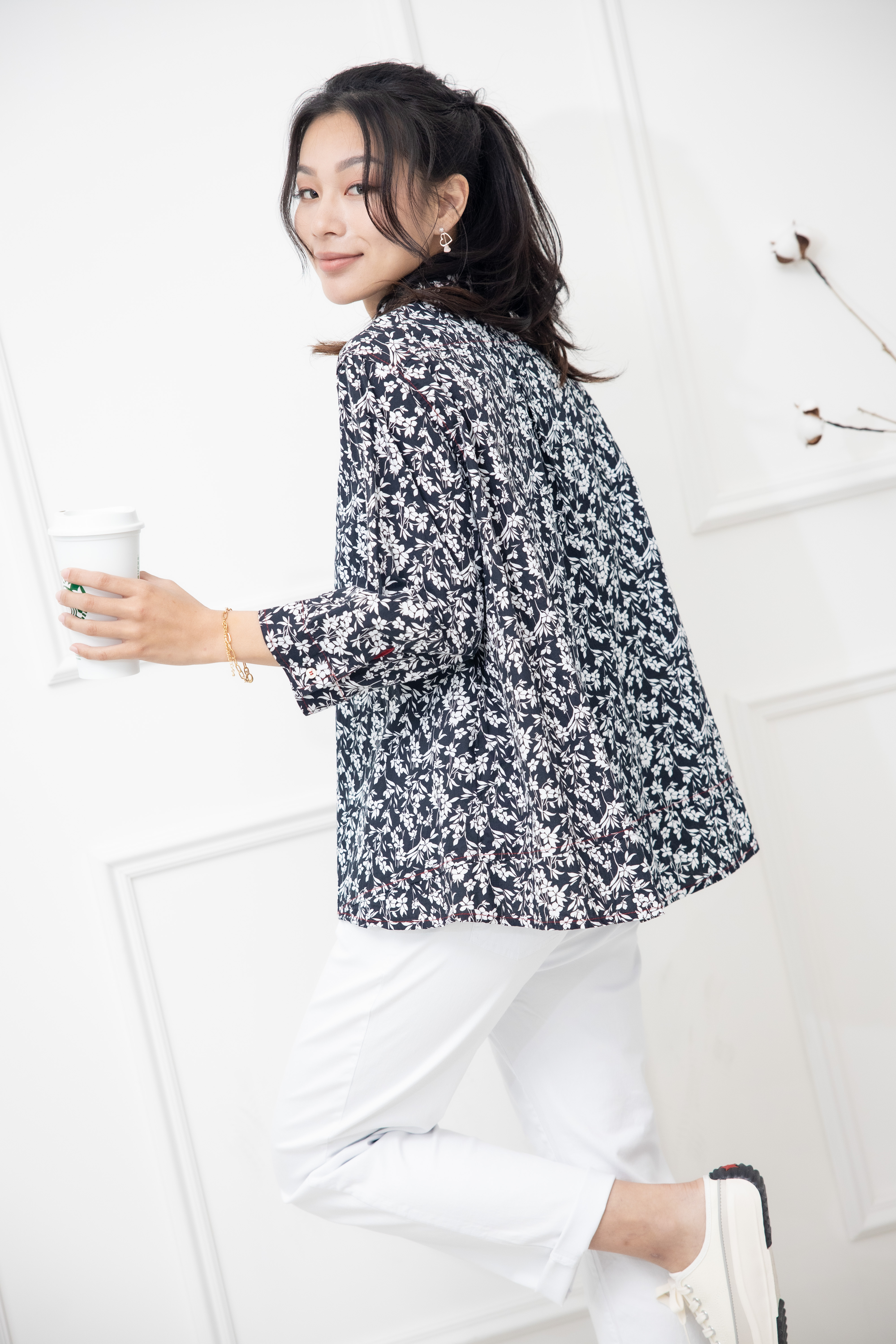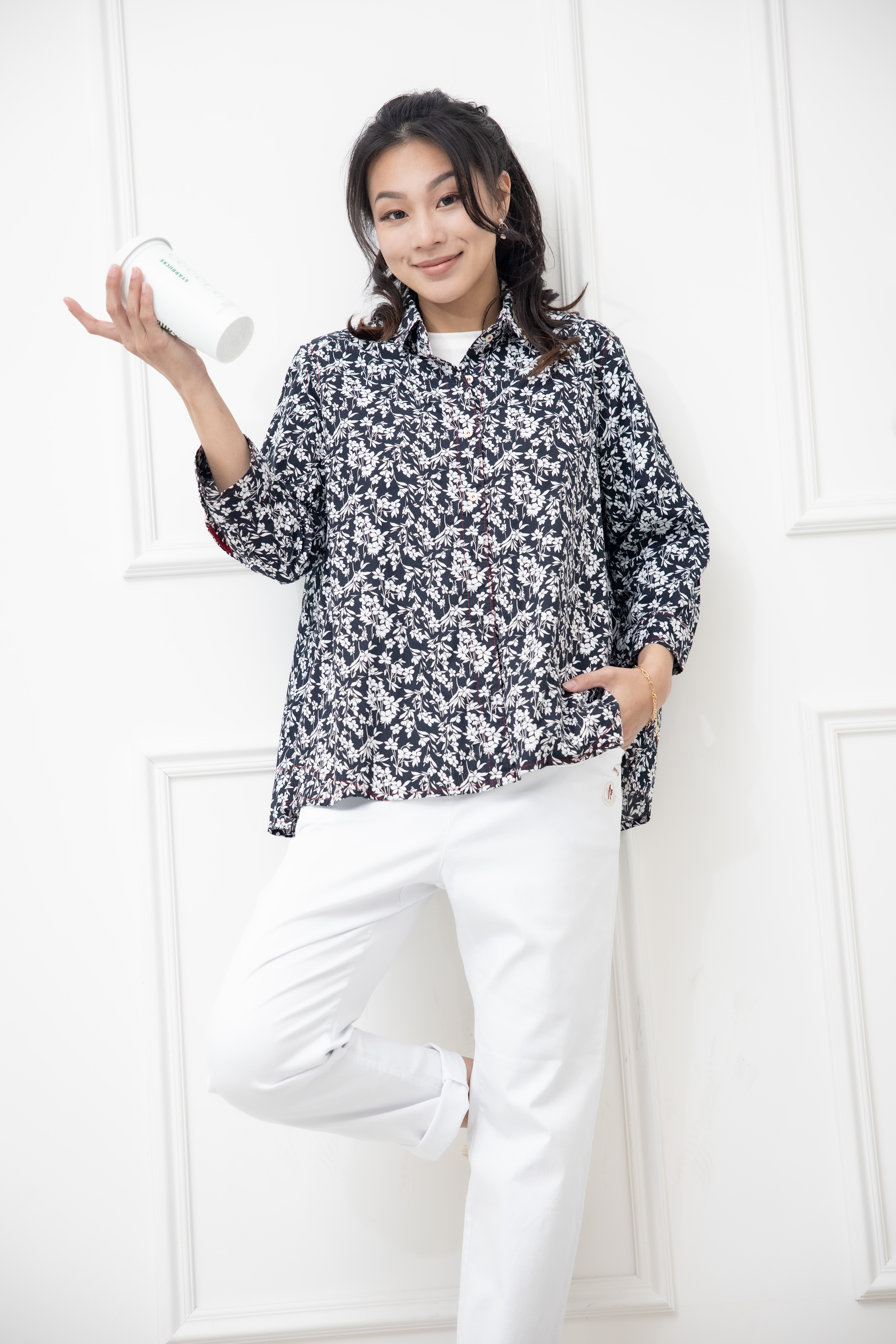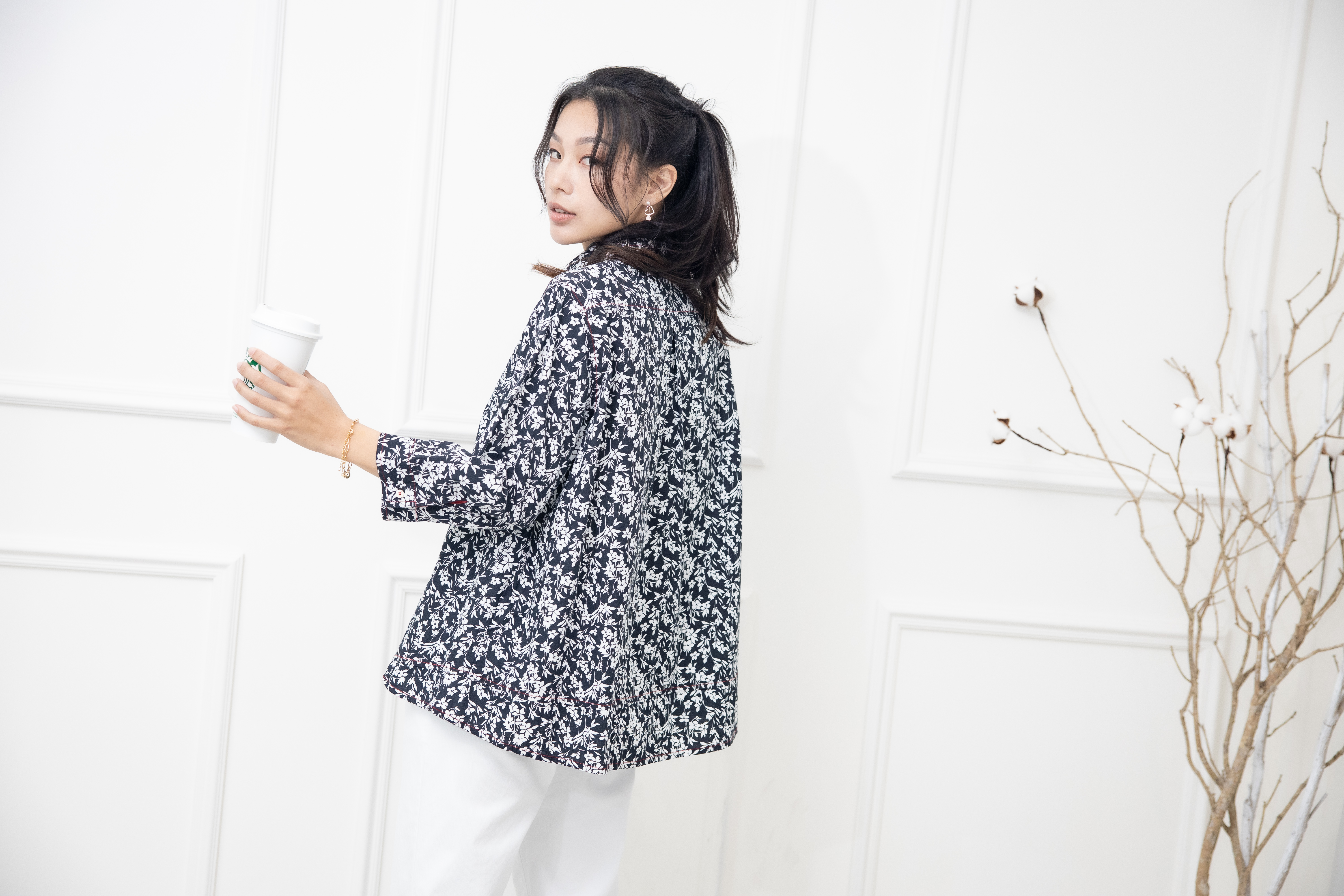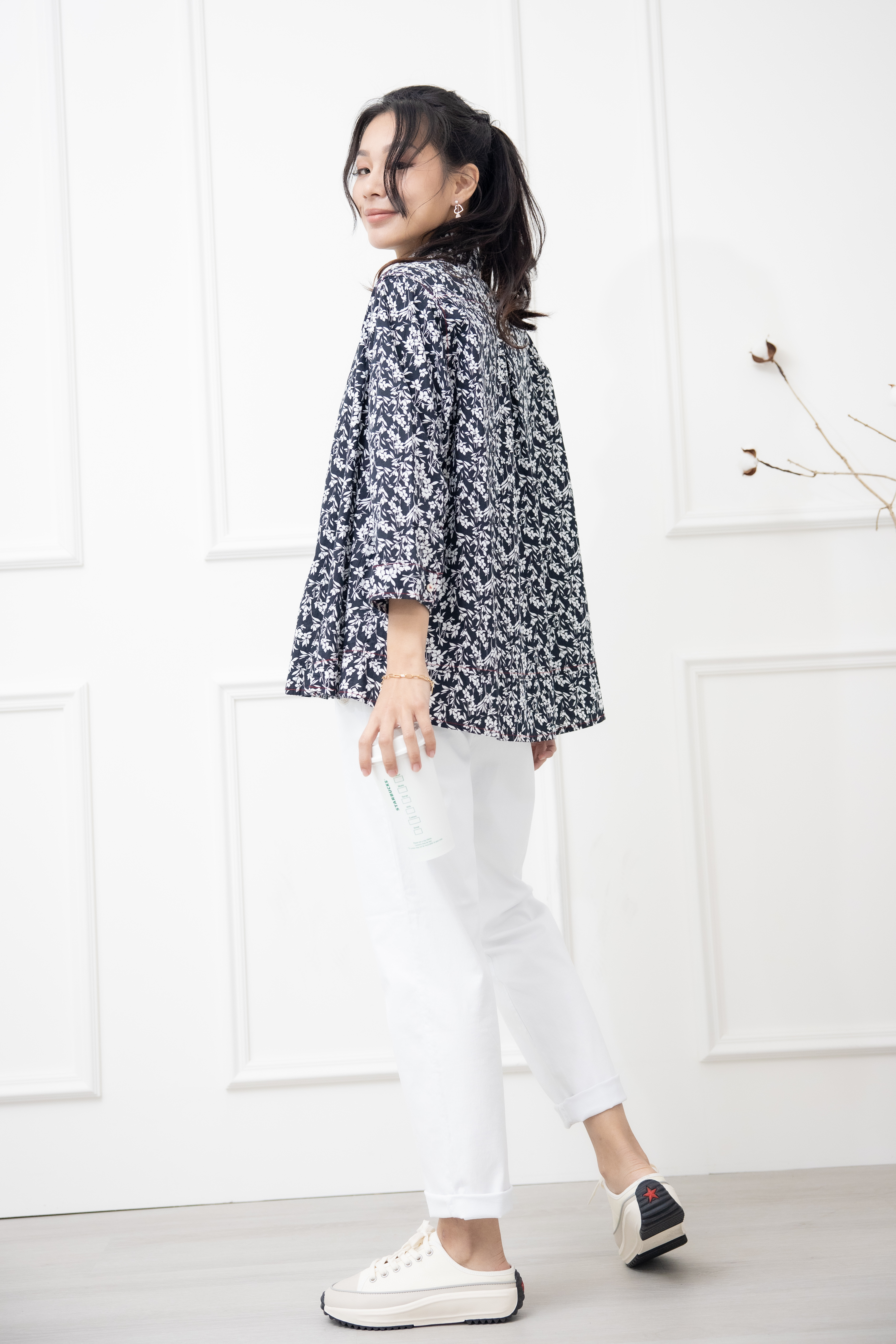 긴팔 印花七分袖襯衫上衣 /黑底白葉影