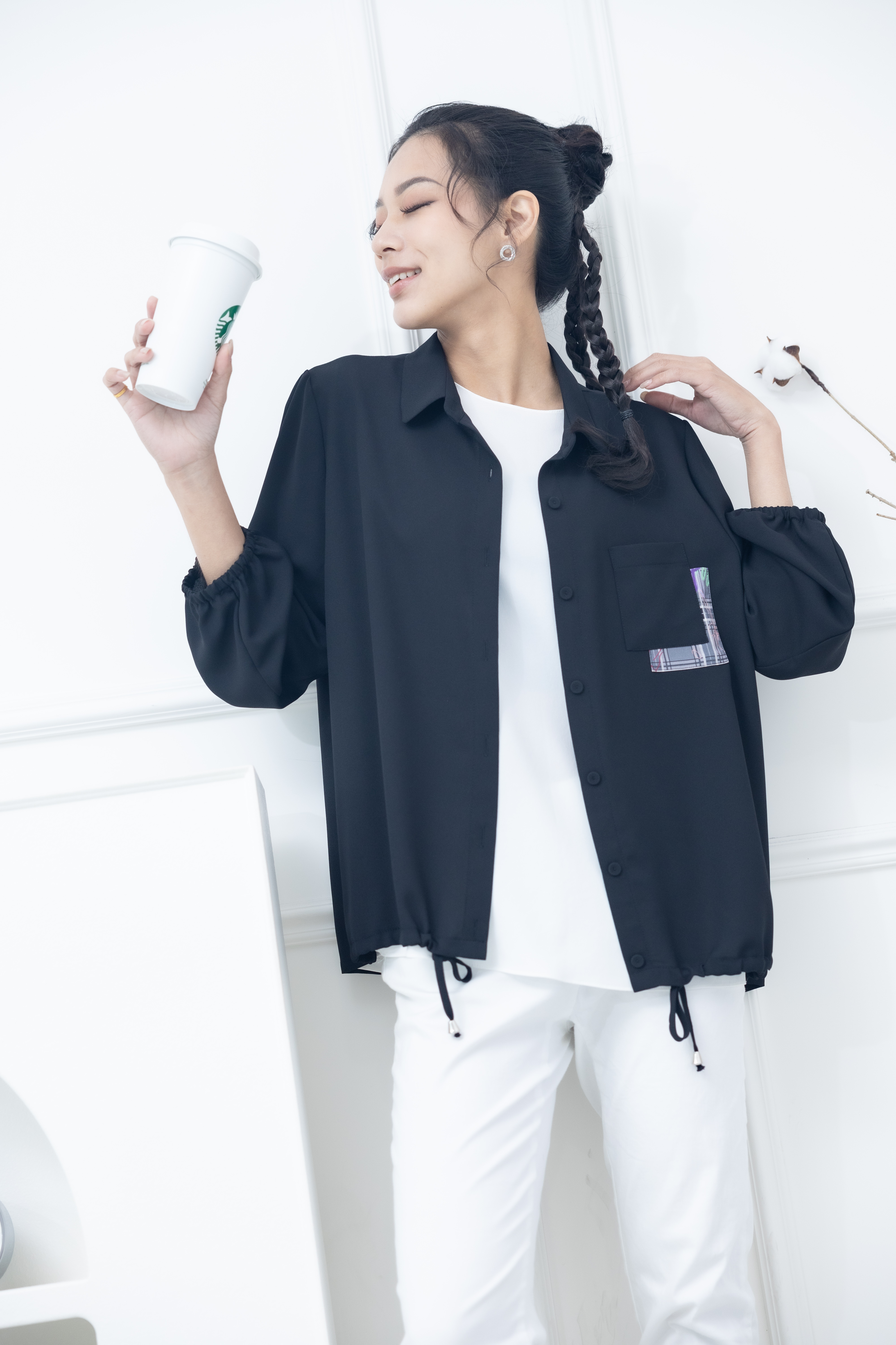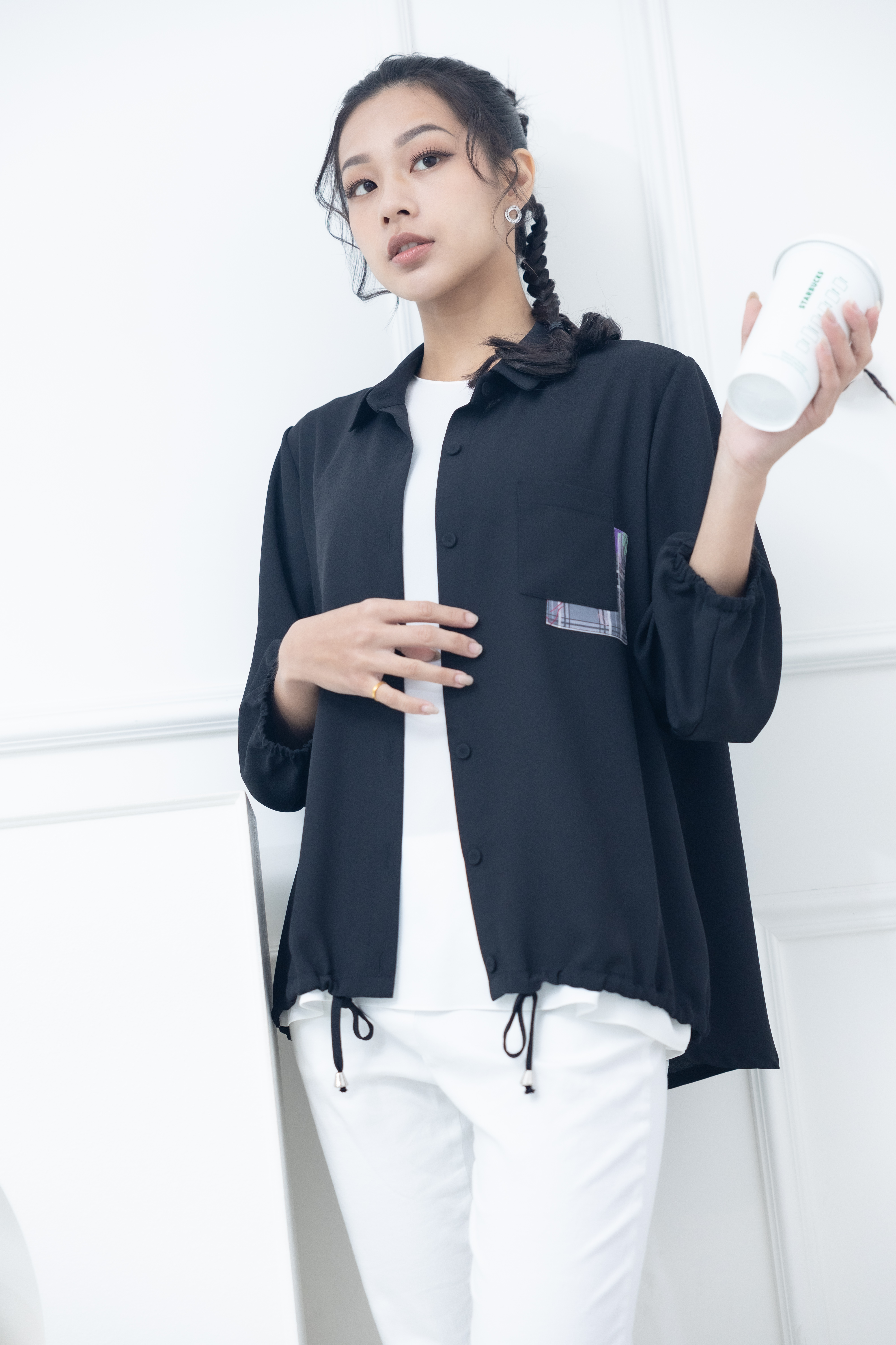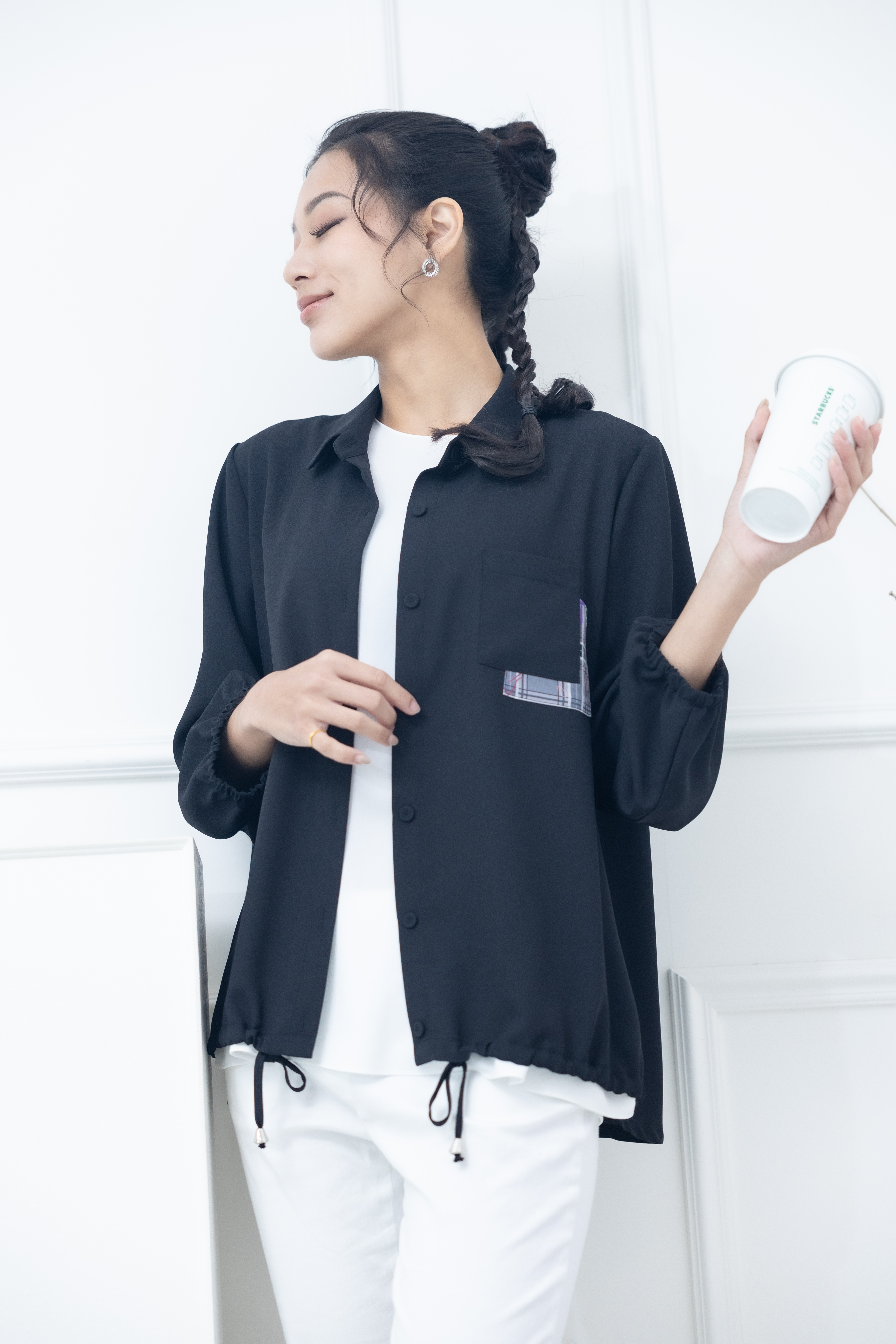 긴팔 印花口袋抽繩下擺九分袖襯杉 / 黑色