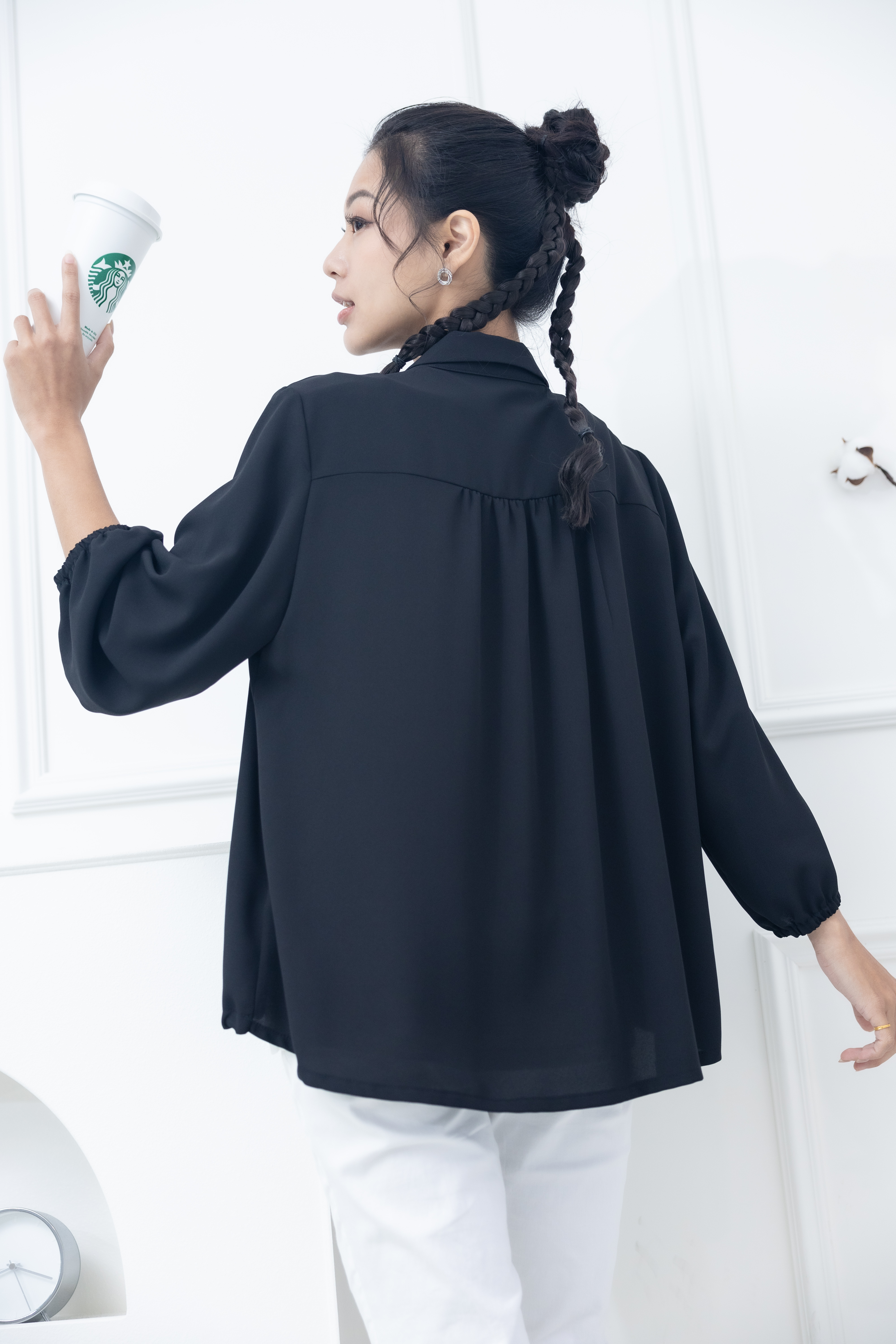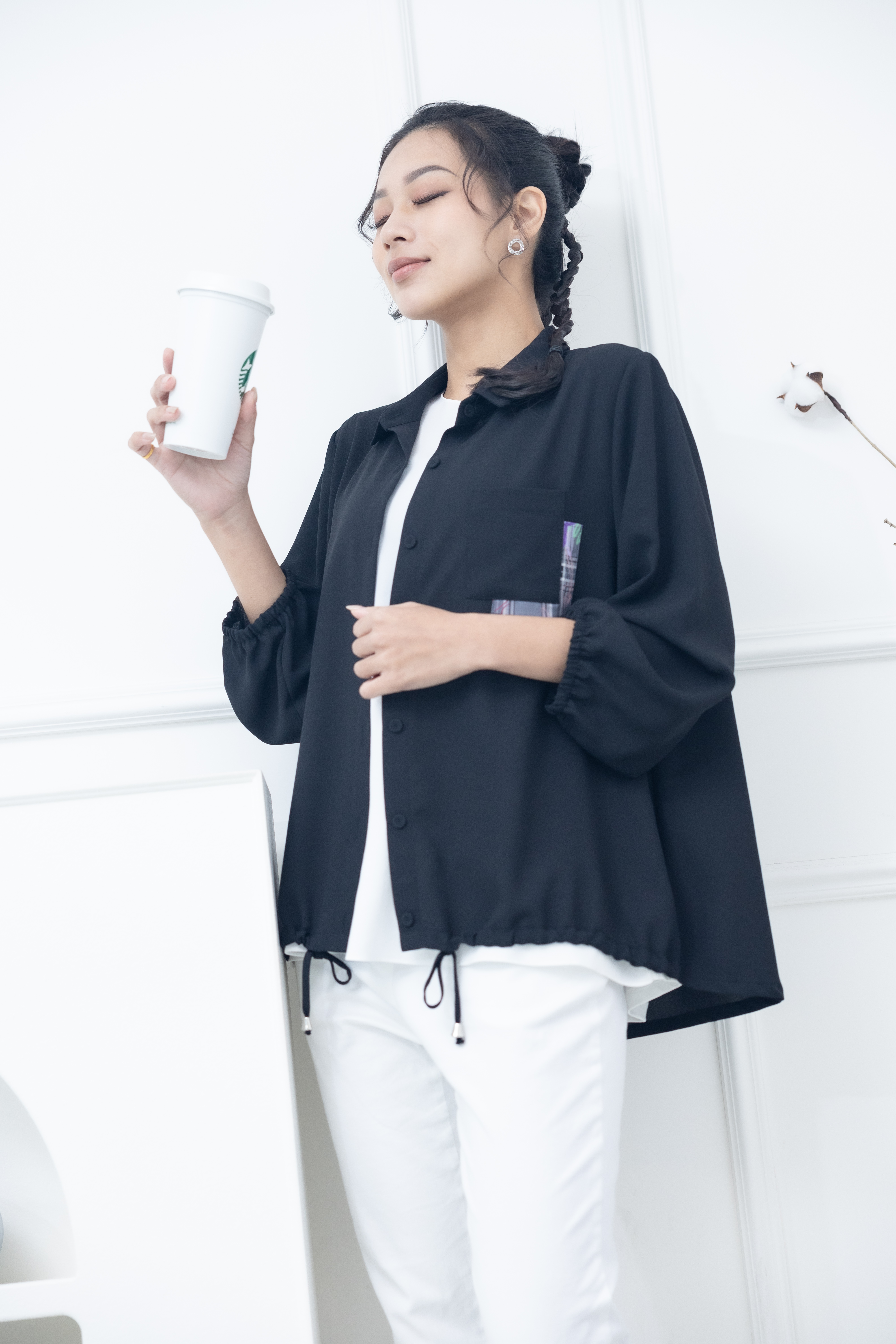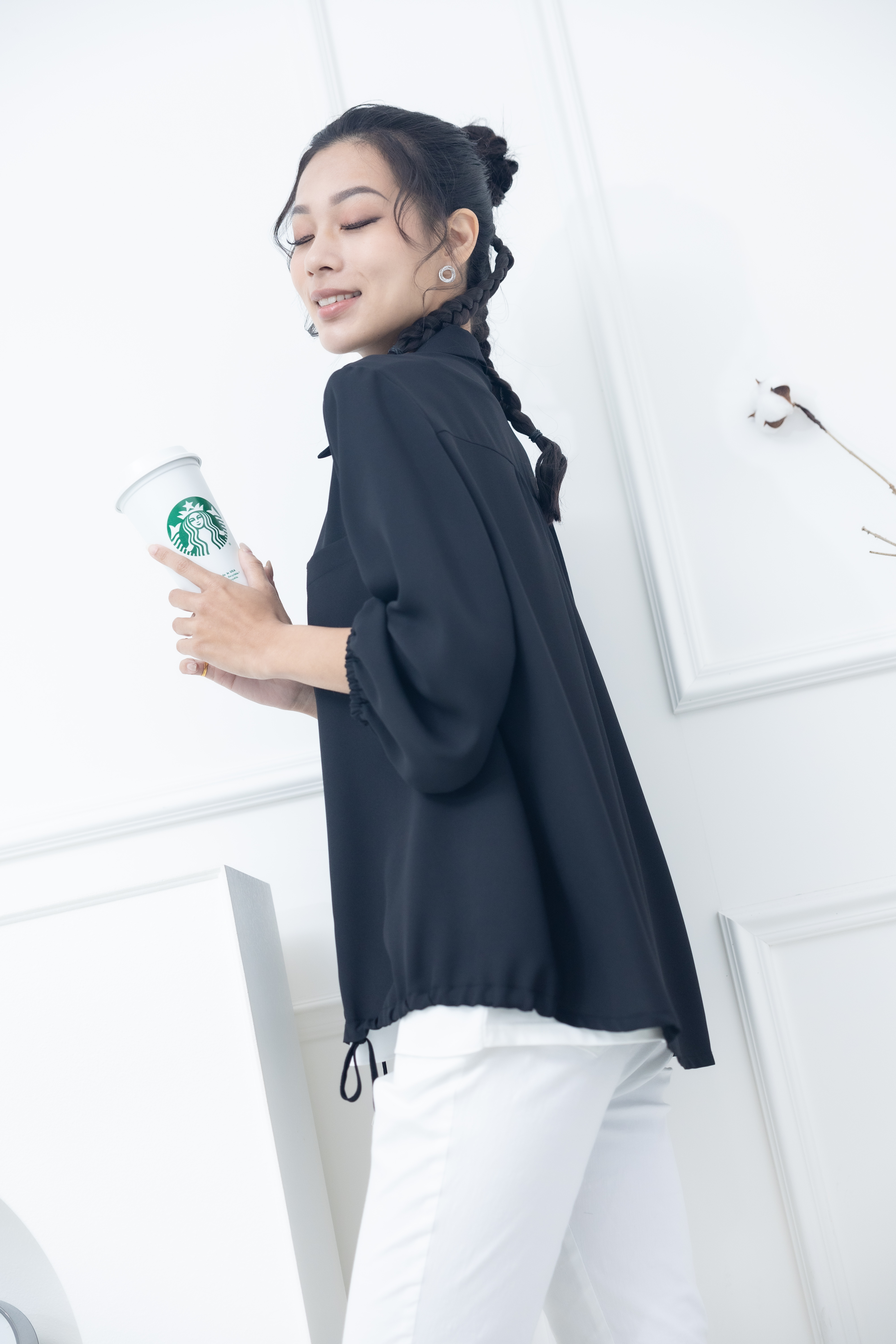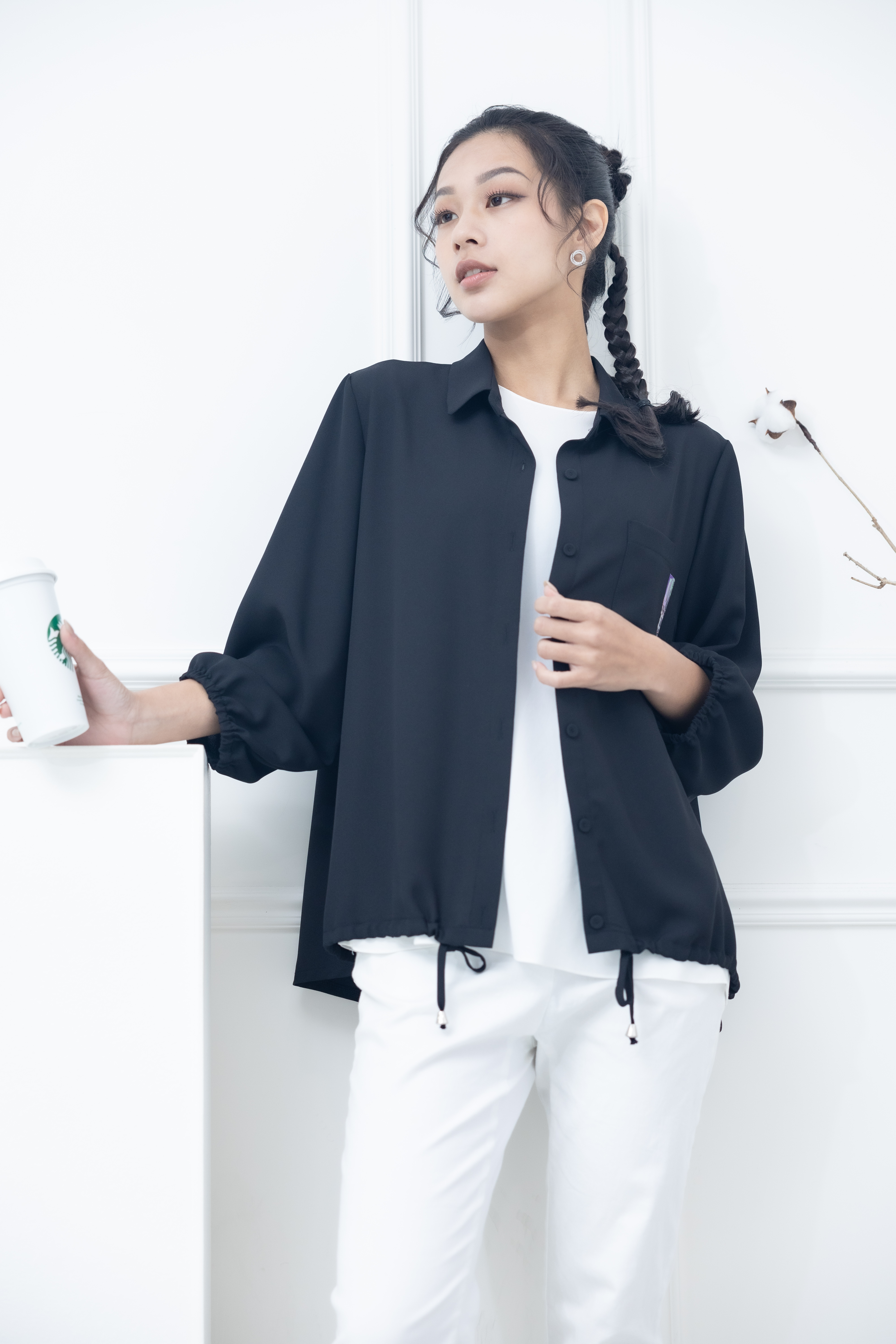 긴팔 印花口袋抽繩下擺九分袖襯杉 / 黑色