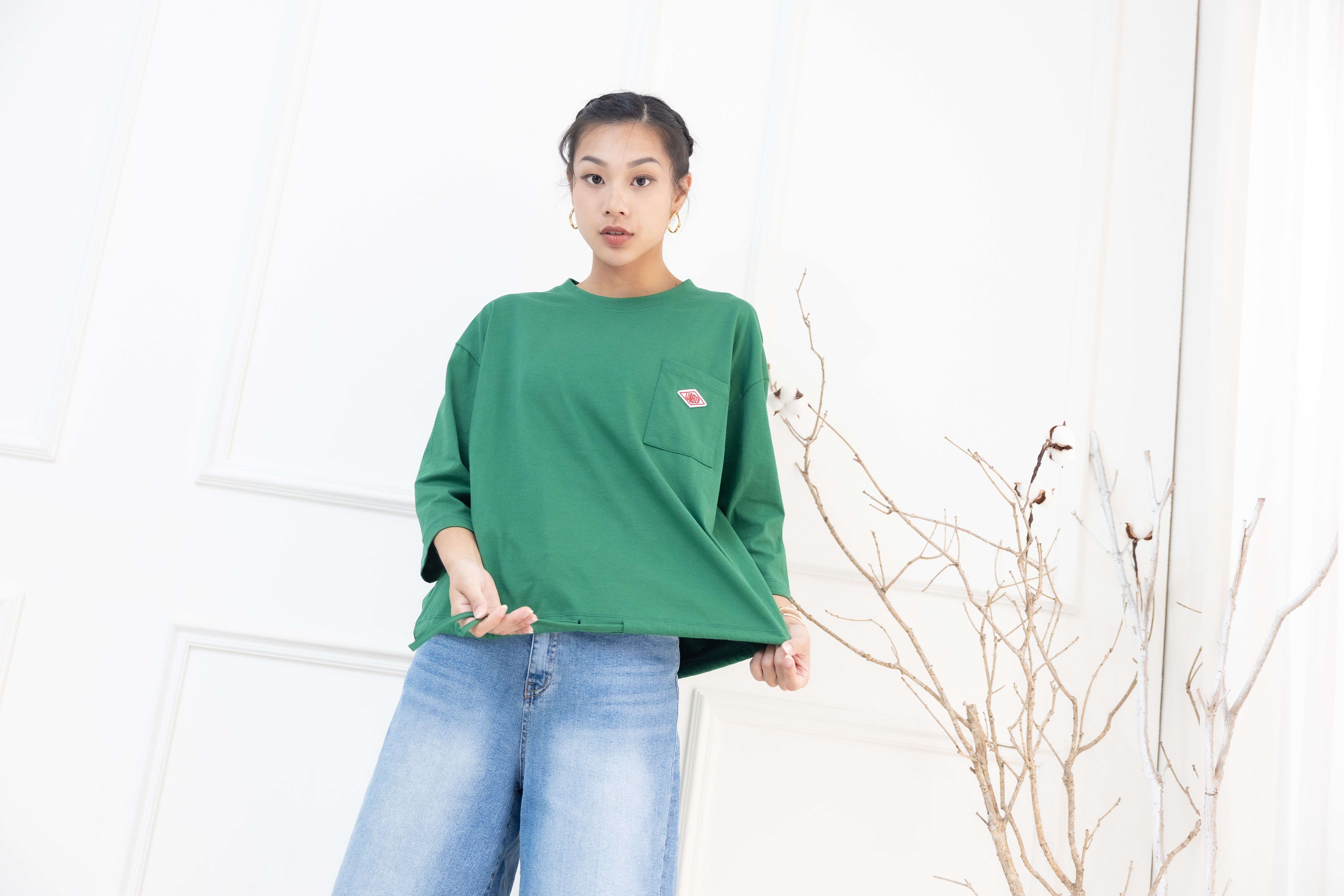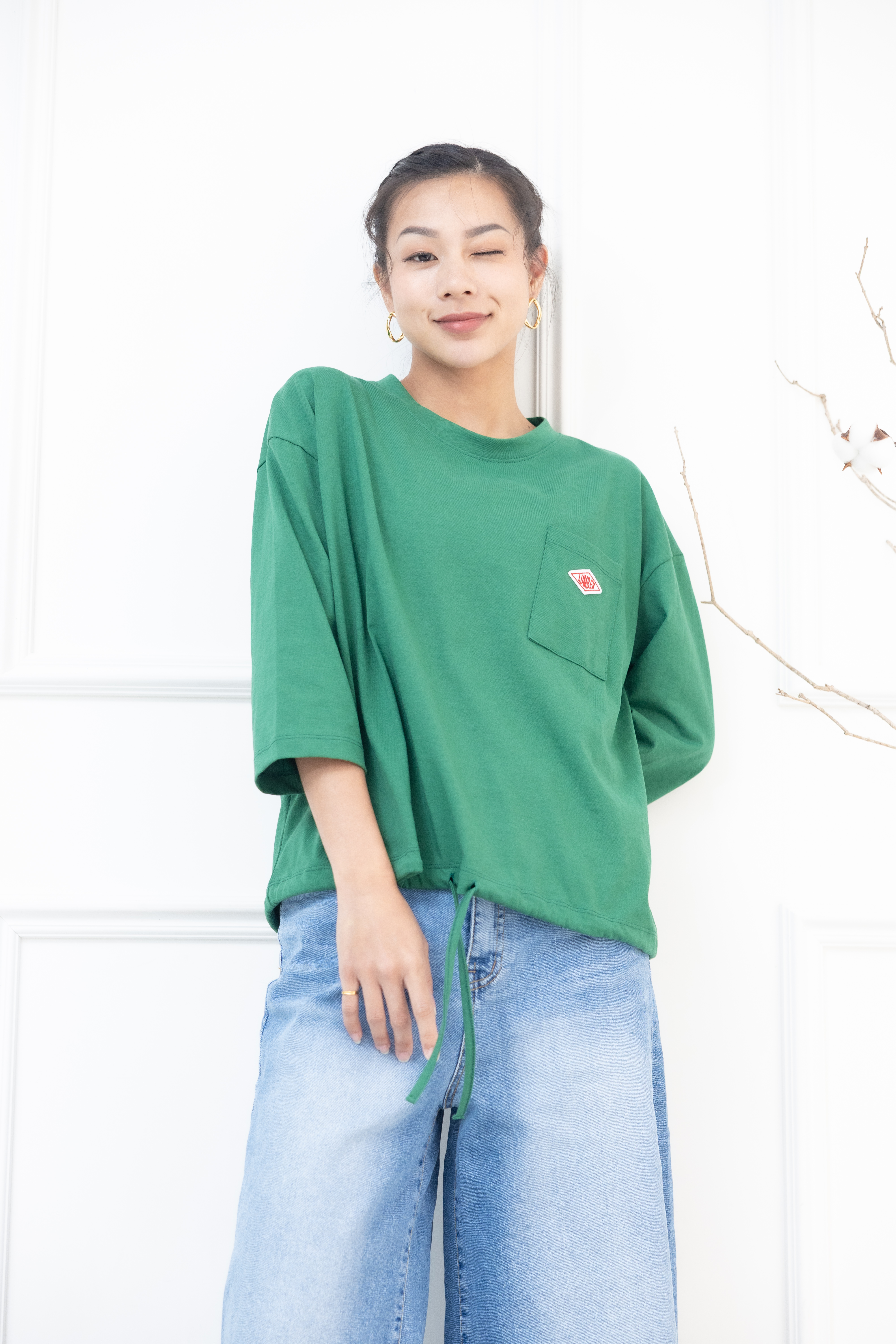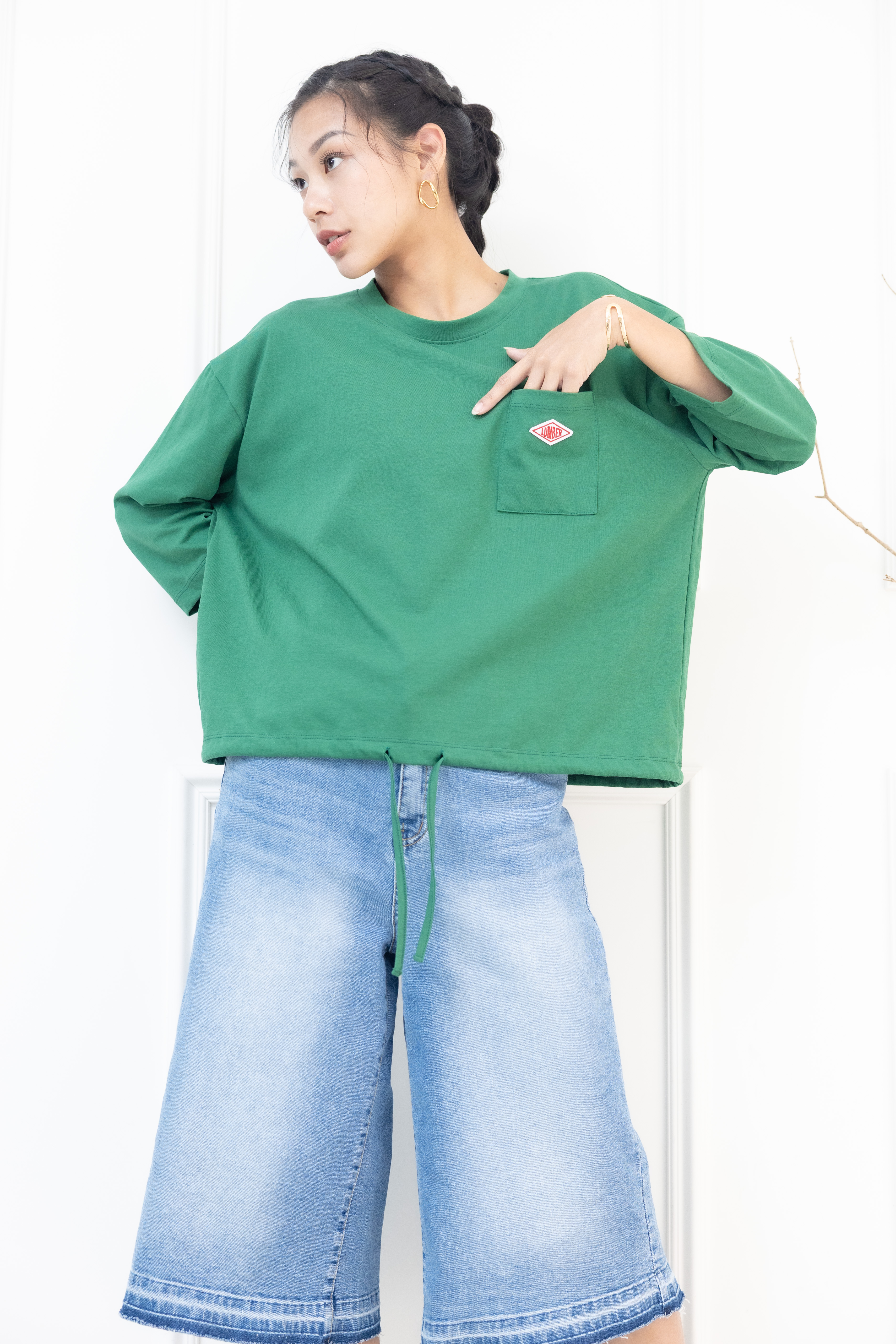 긴팔 左胸口袋刺繡標七分袖上衣 / 綠色