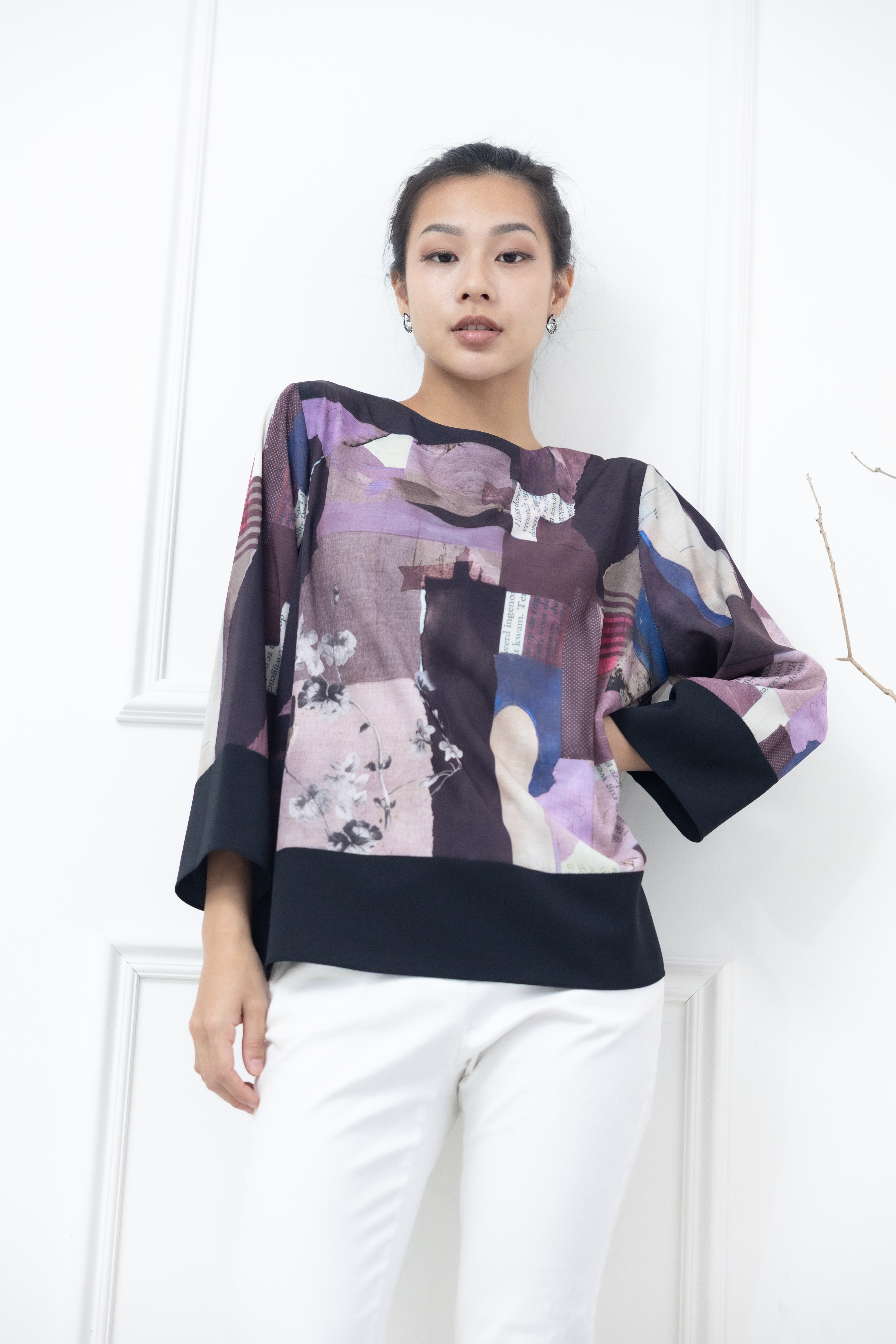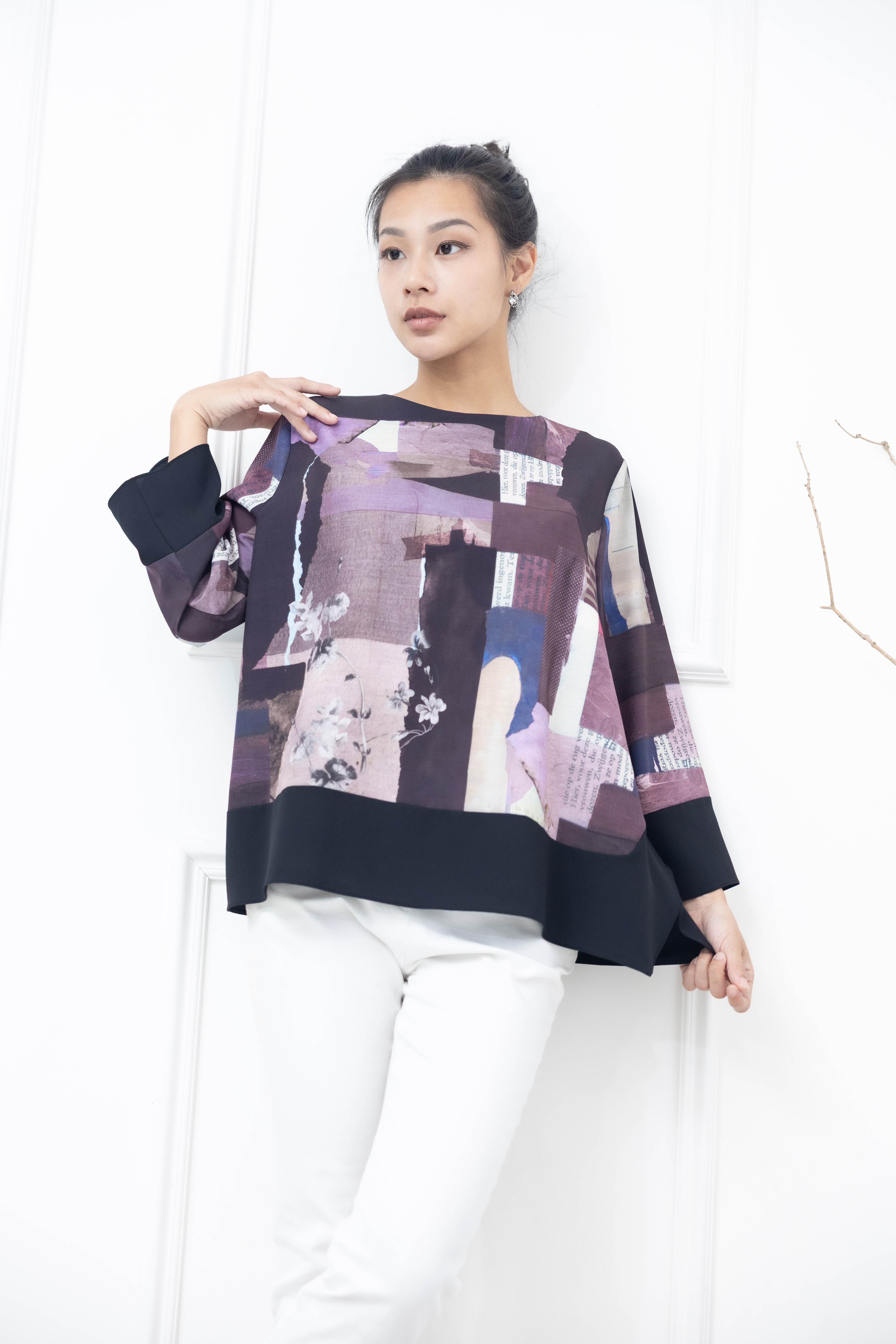 긴팔 手帳素材袖口.下擺拼黑色長袖上衣 / 紫色