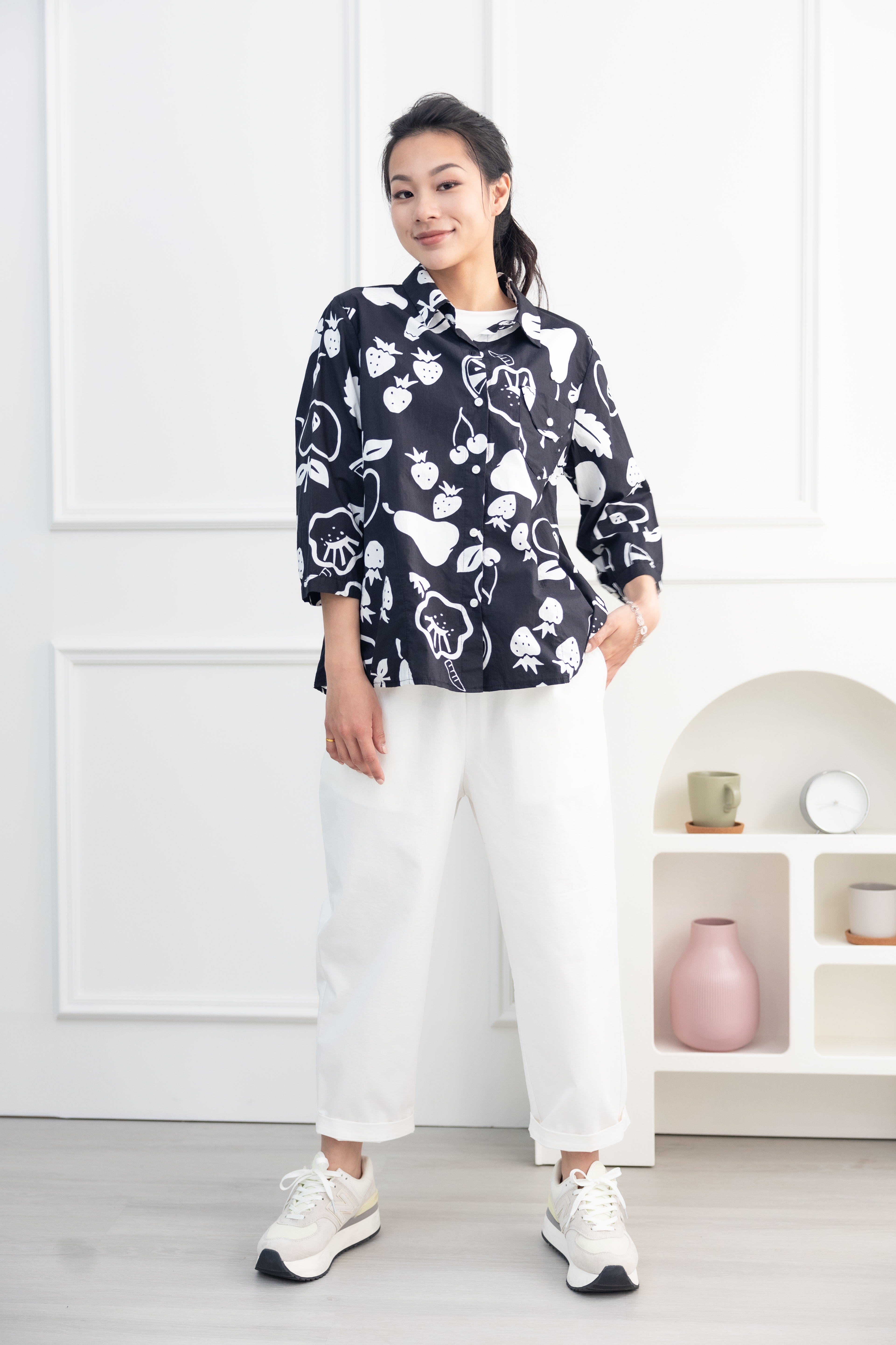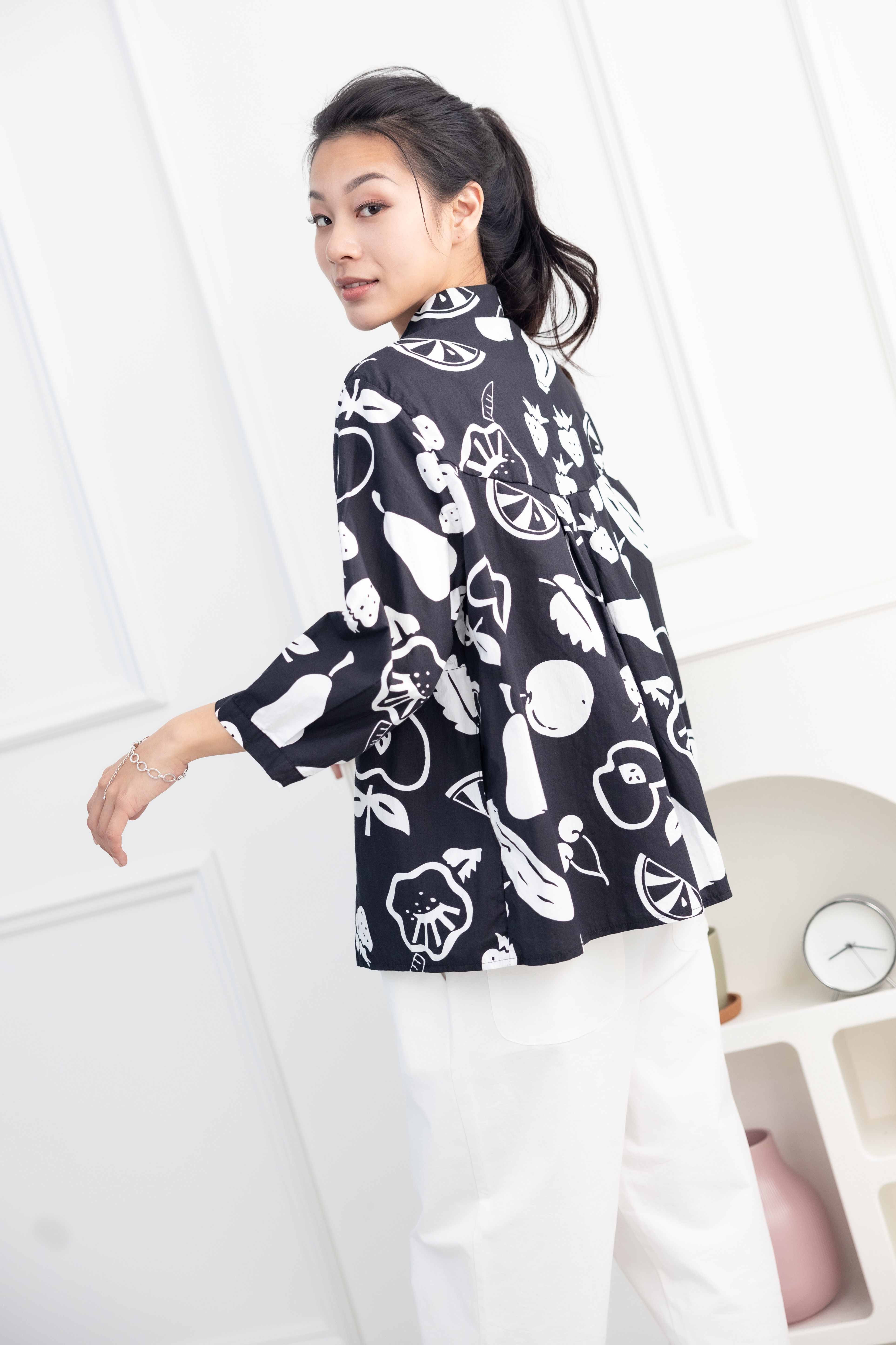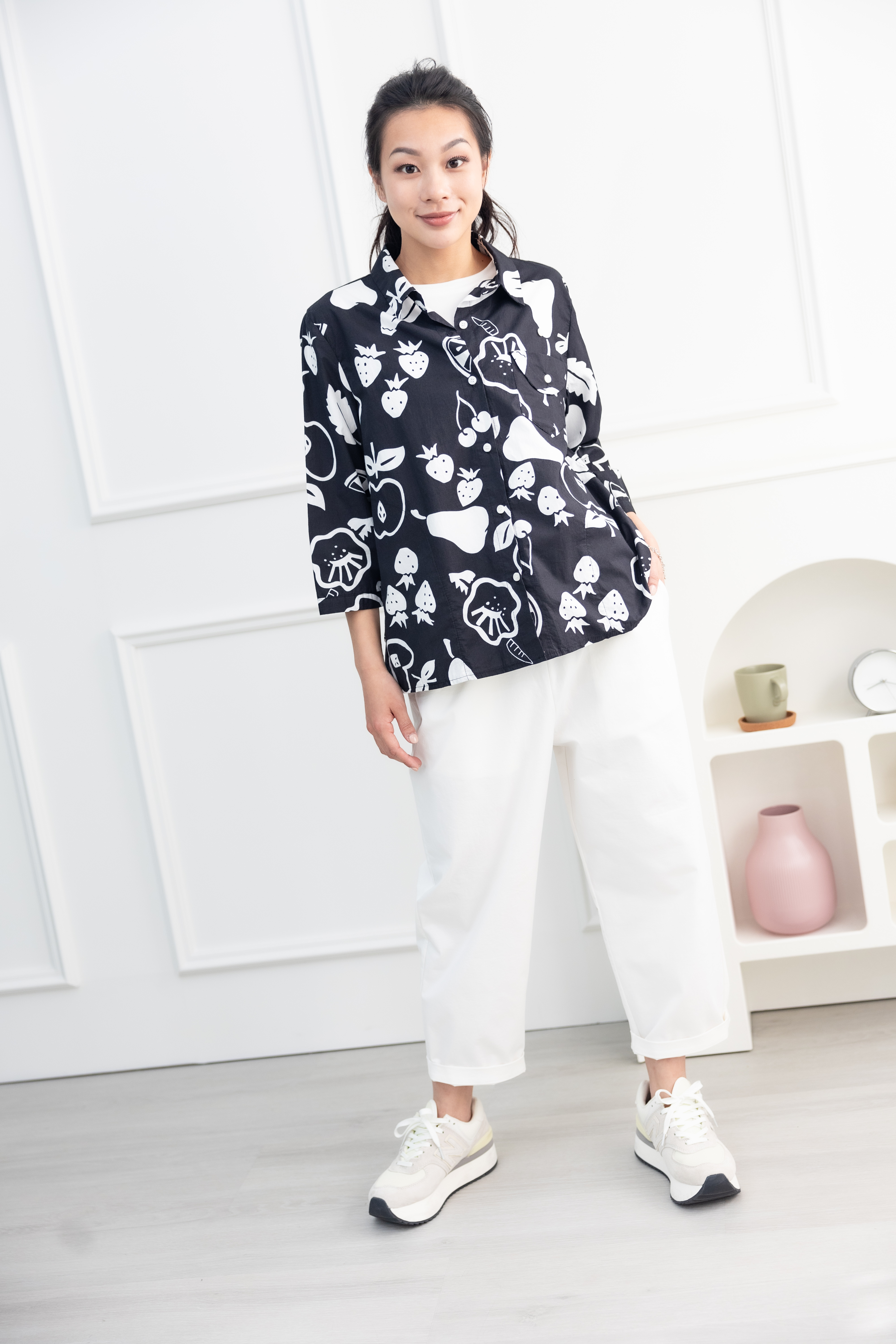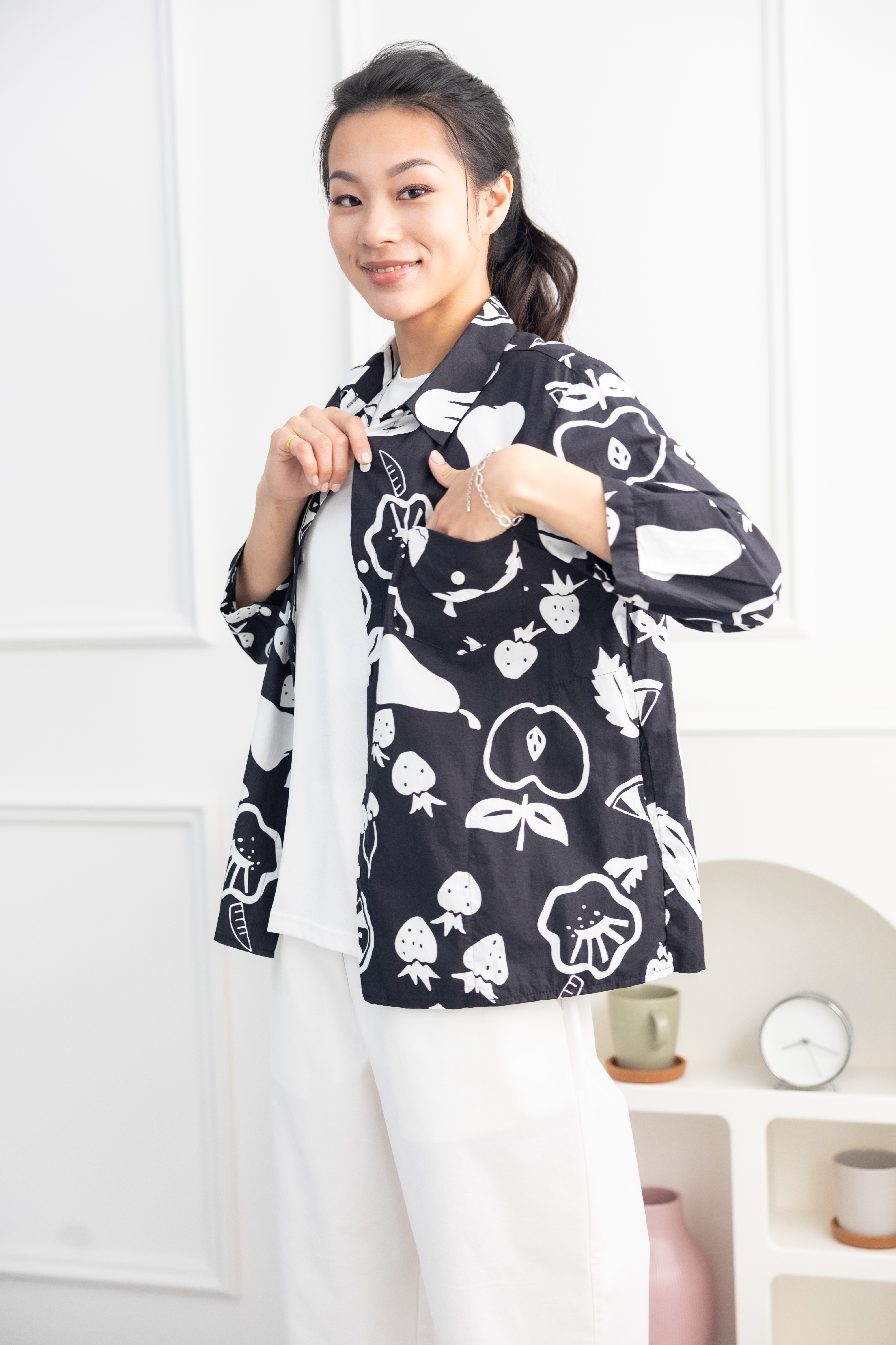 긴팔 手繪水果開襟七分袖襯衫上衣 / 黑色