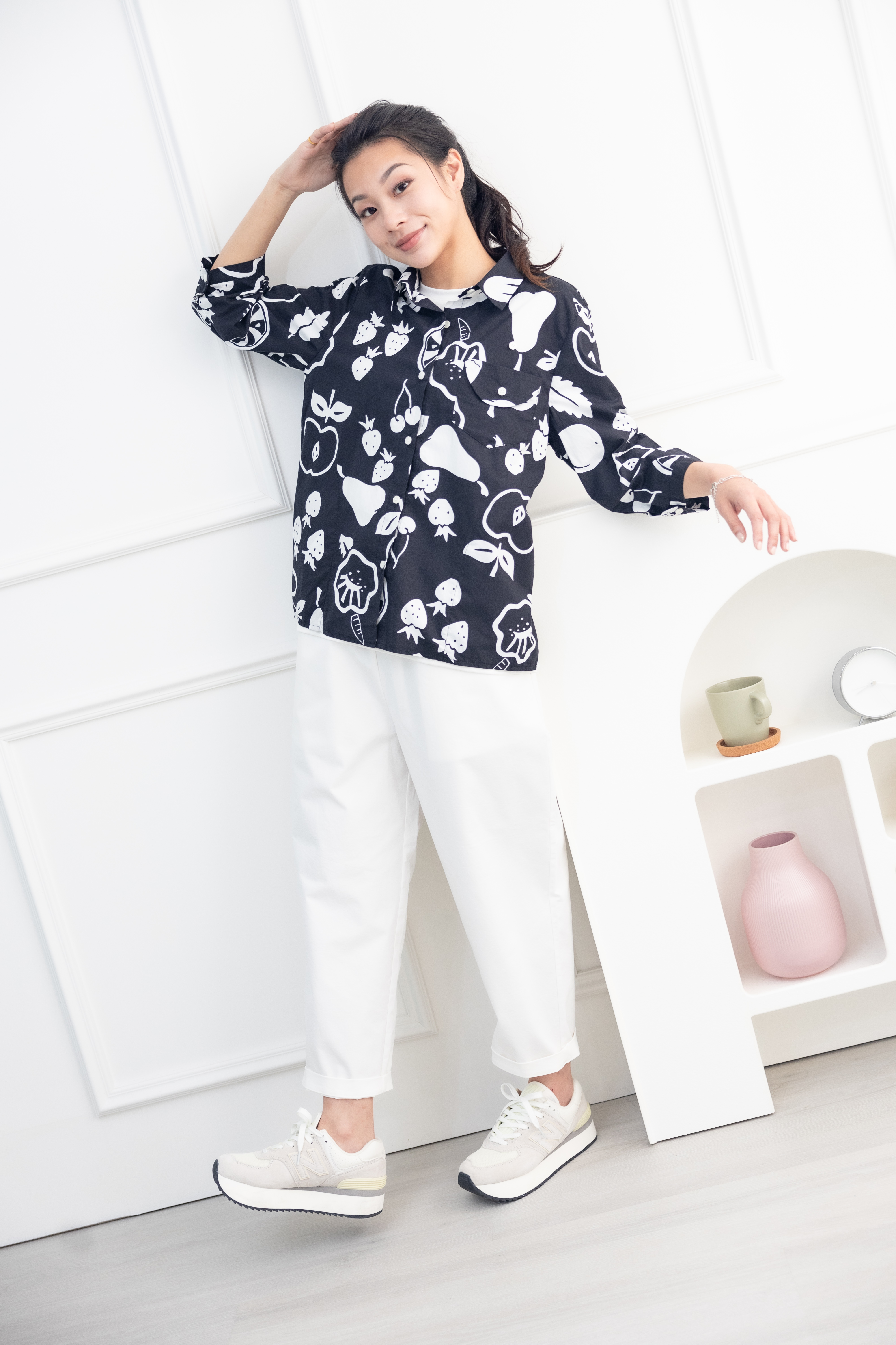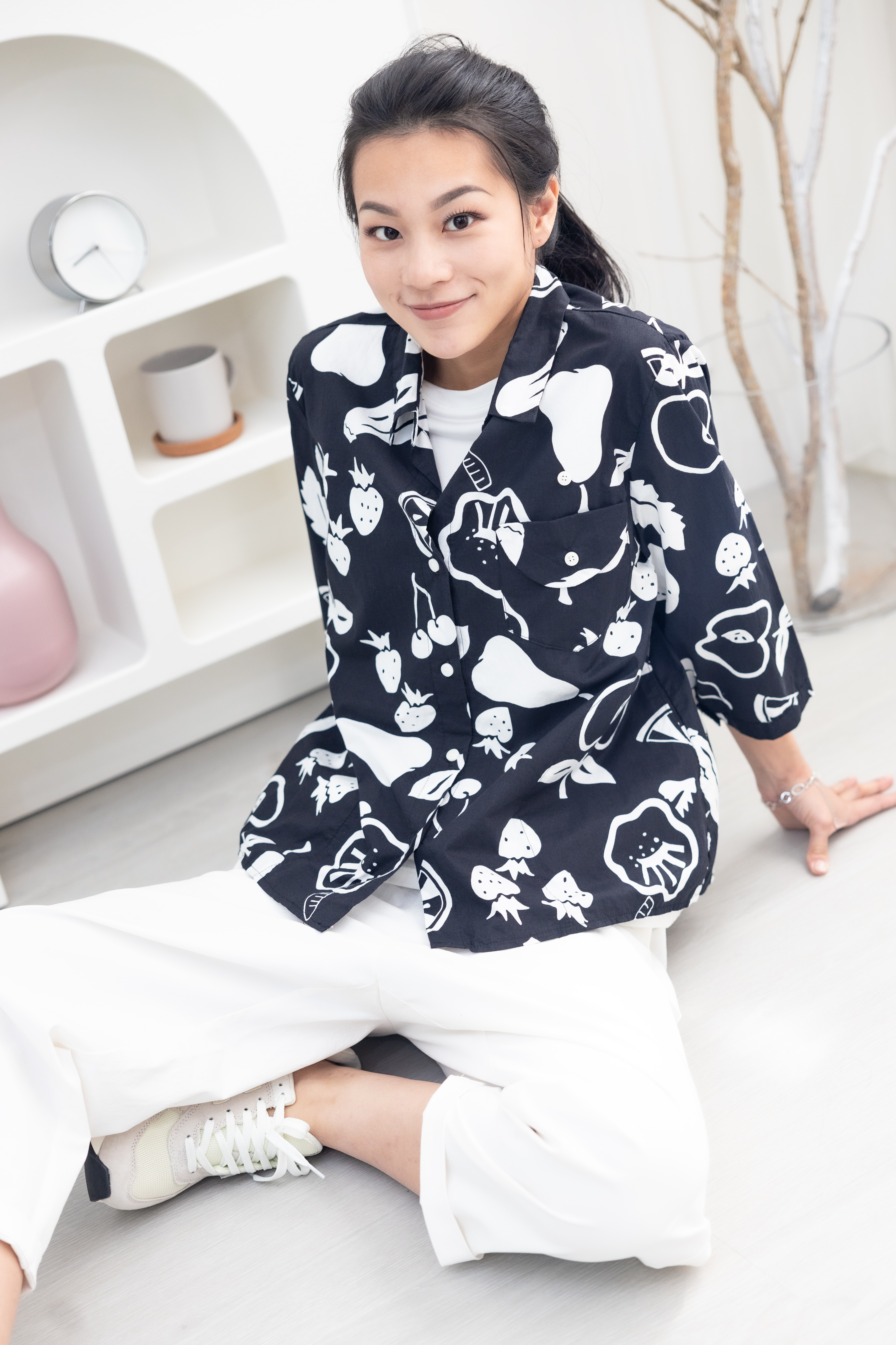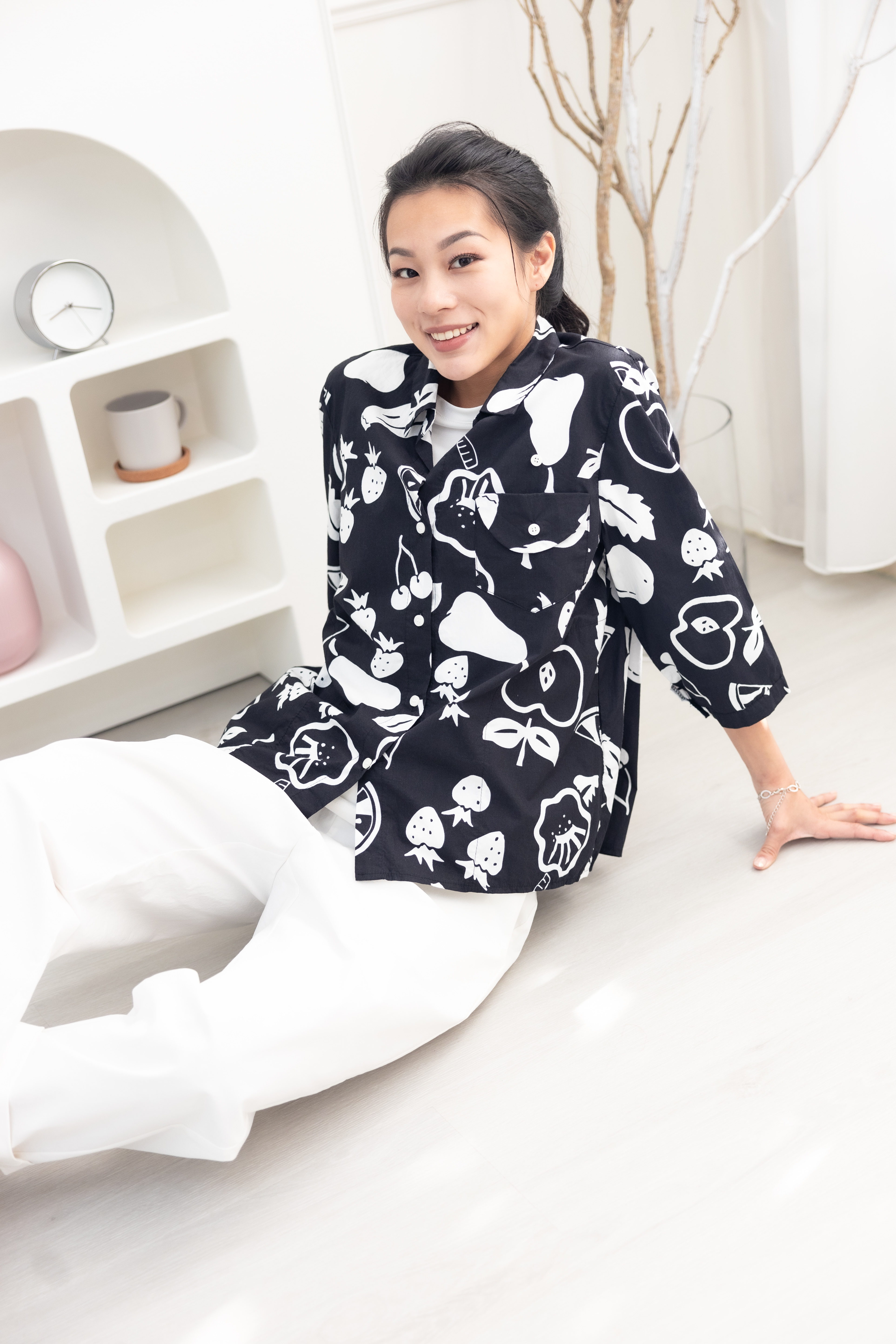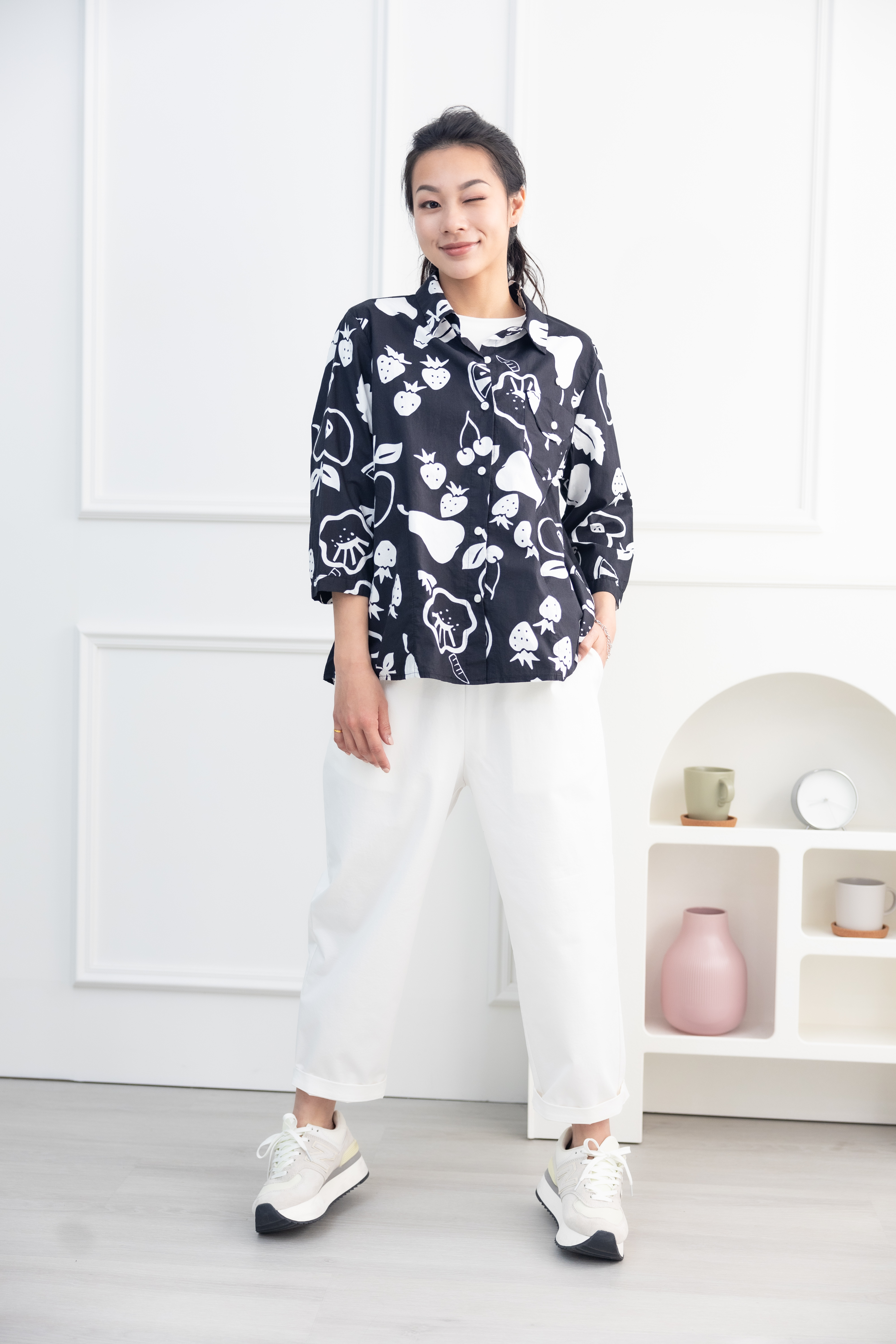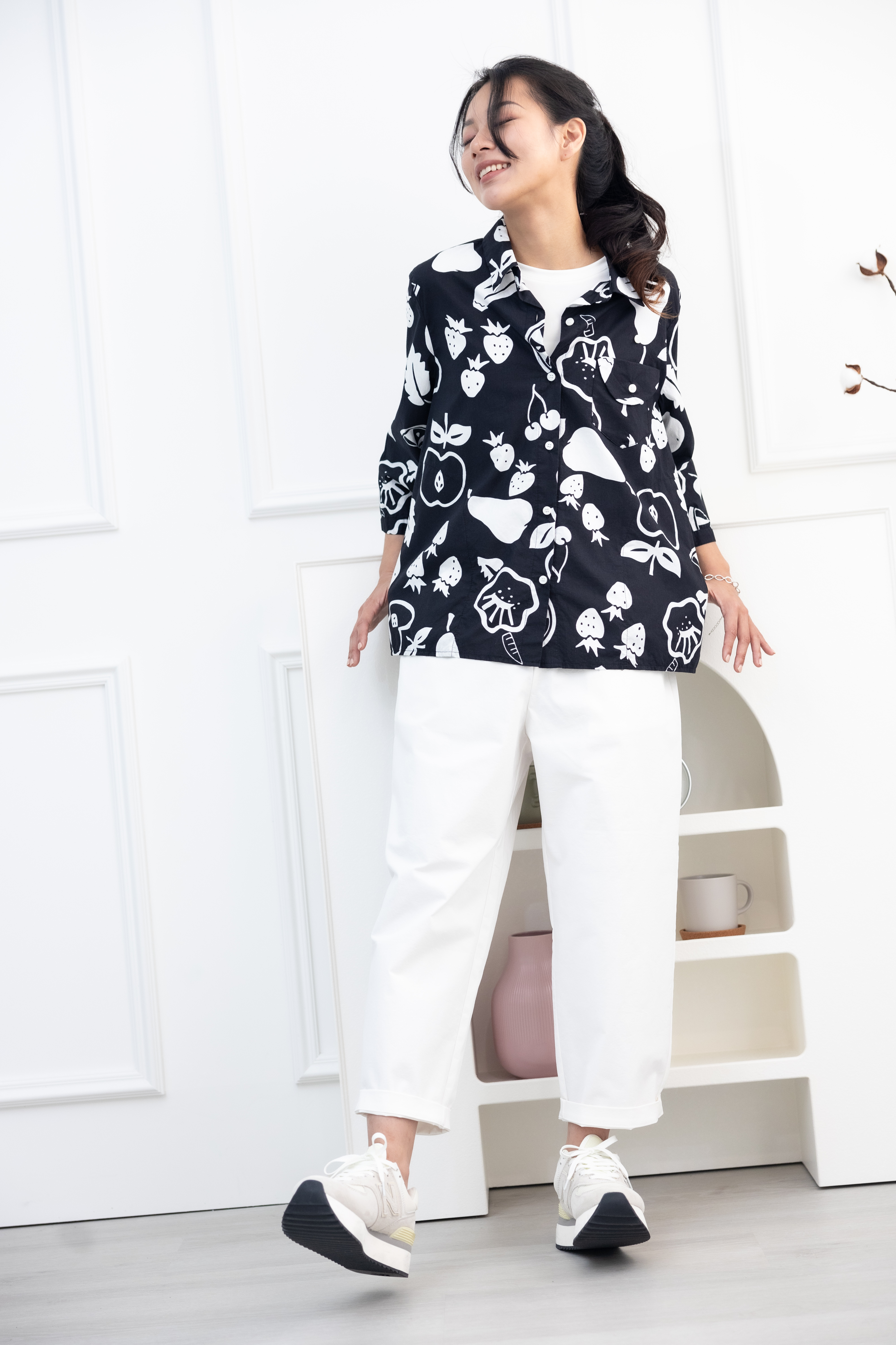긴팔 手繪水果開襟七分袖襯衫上衣 / 黑色