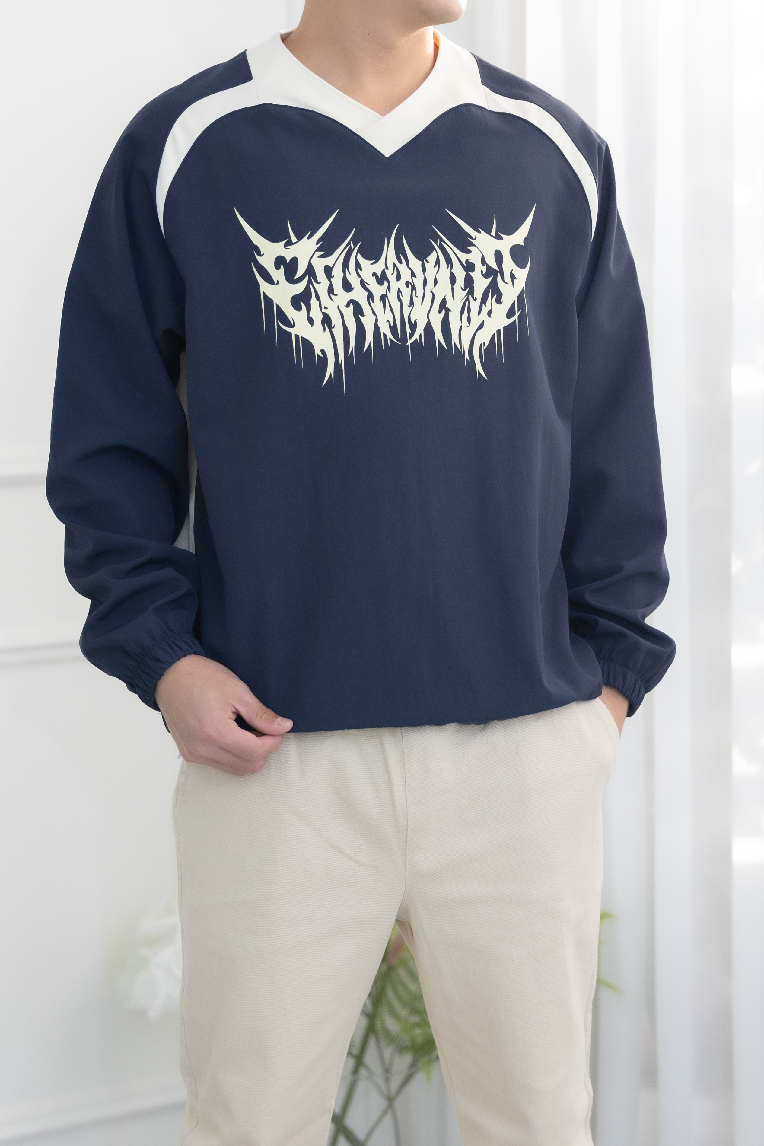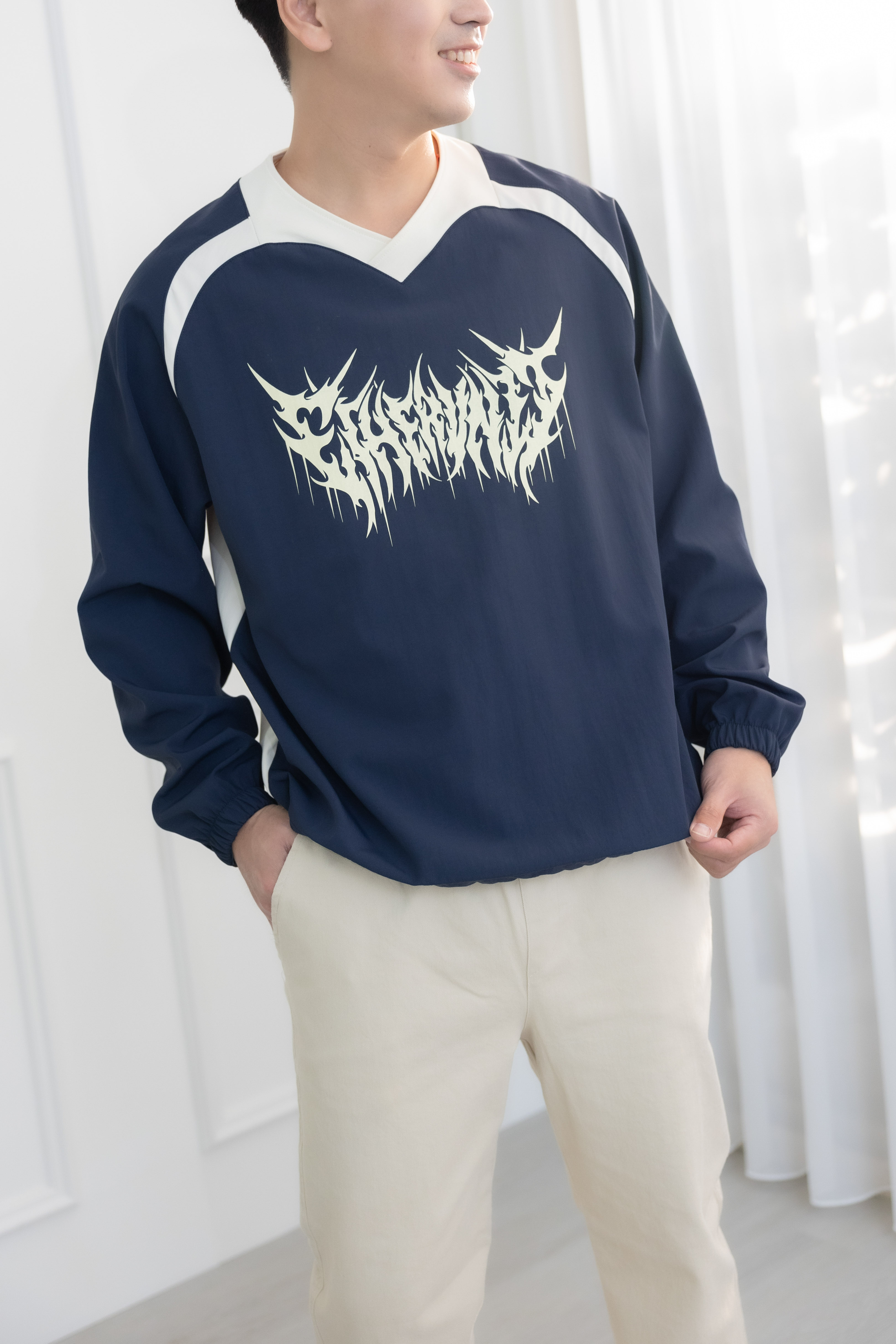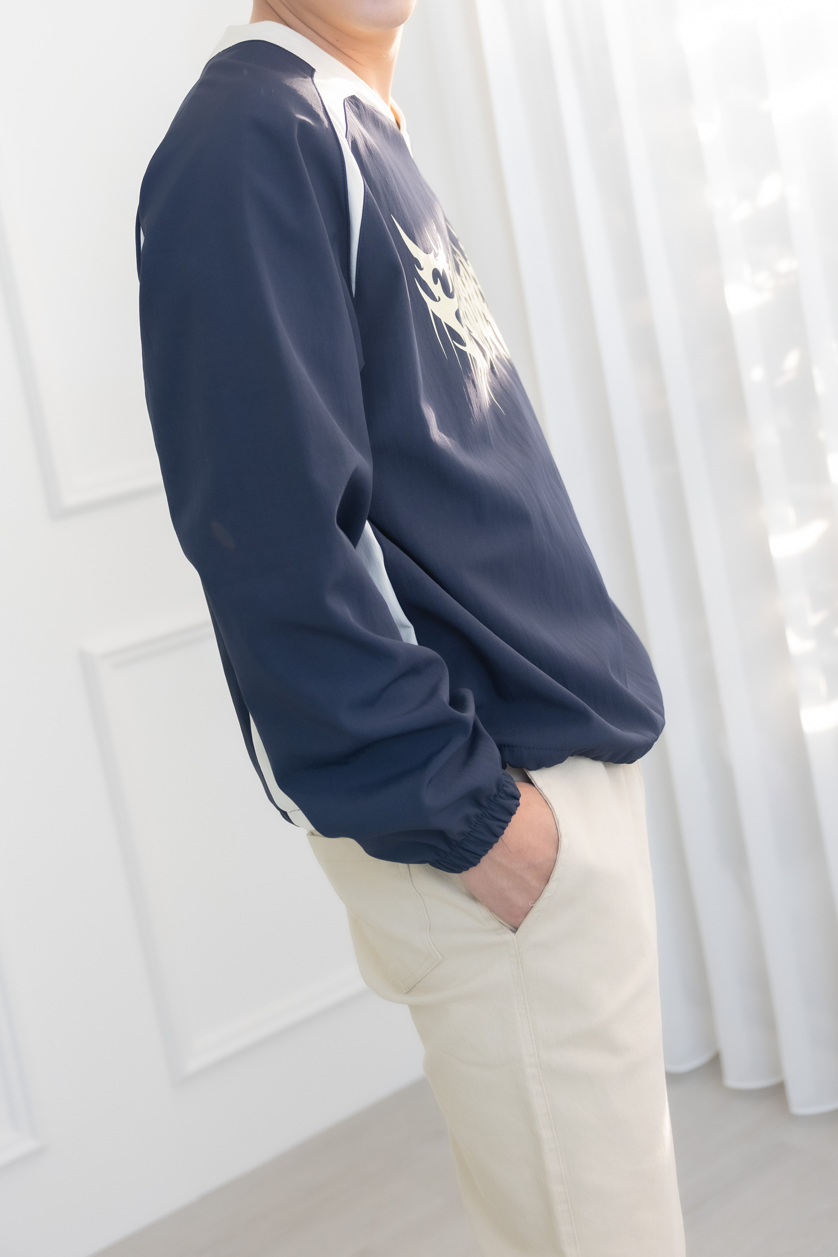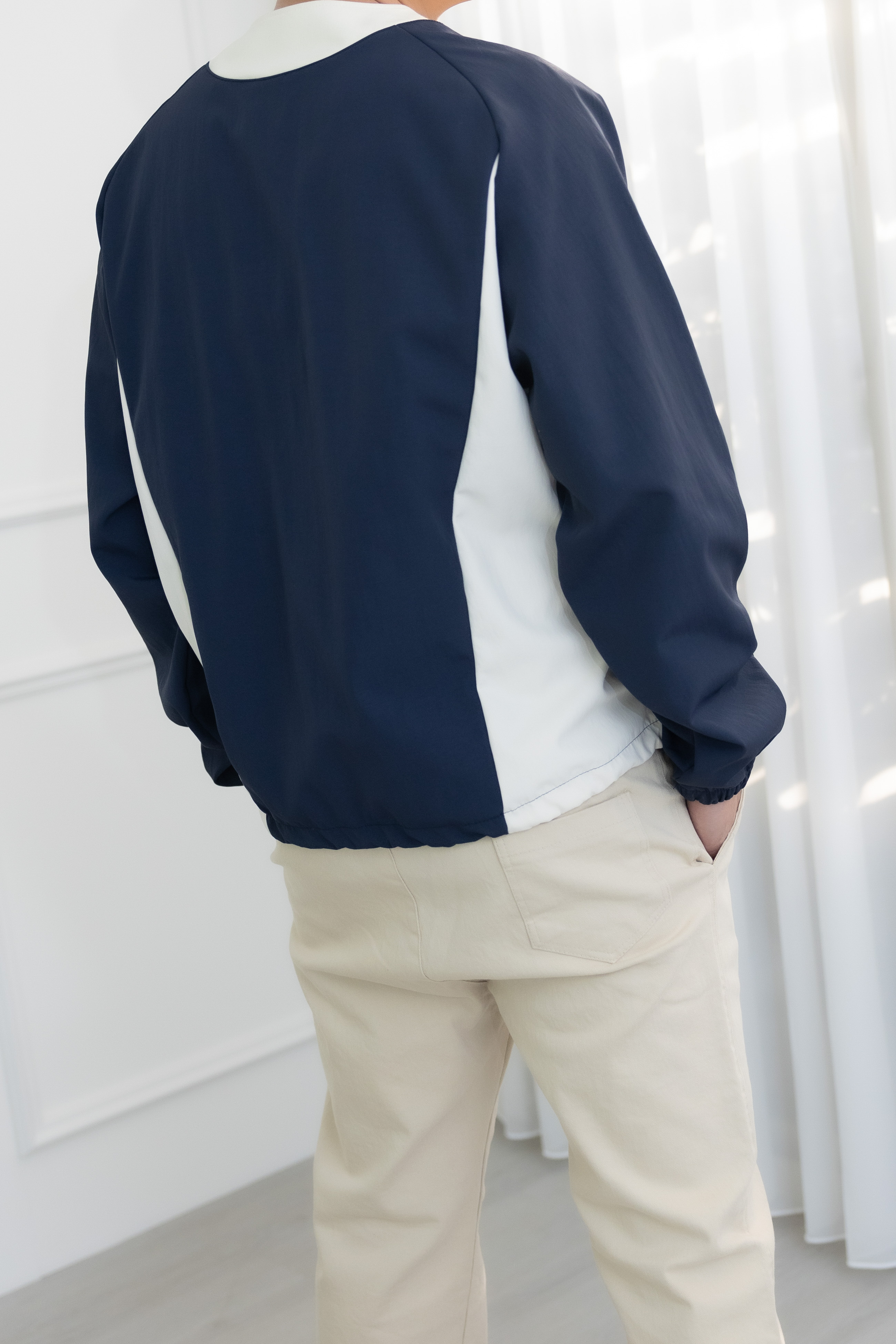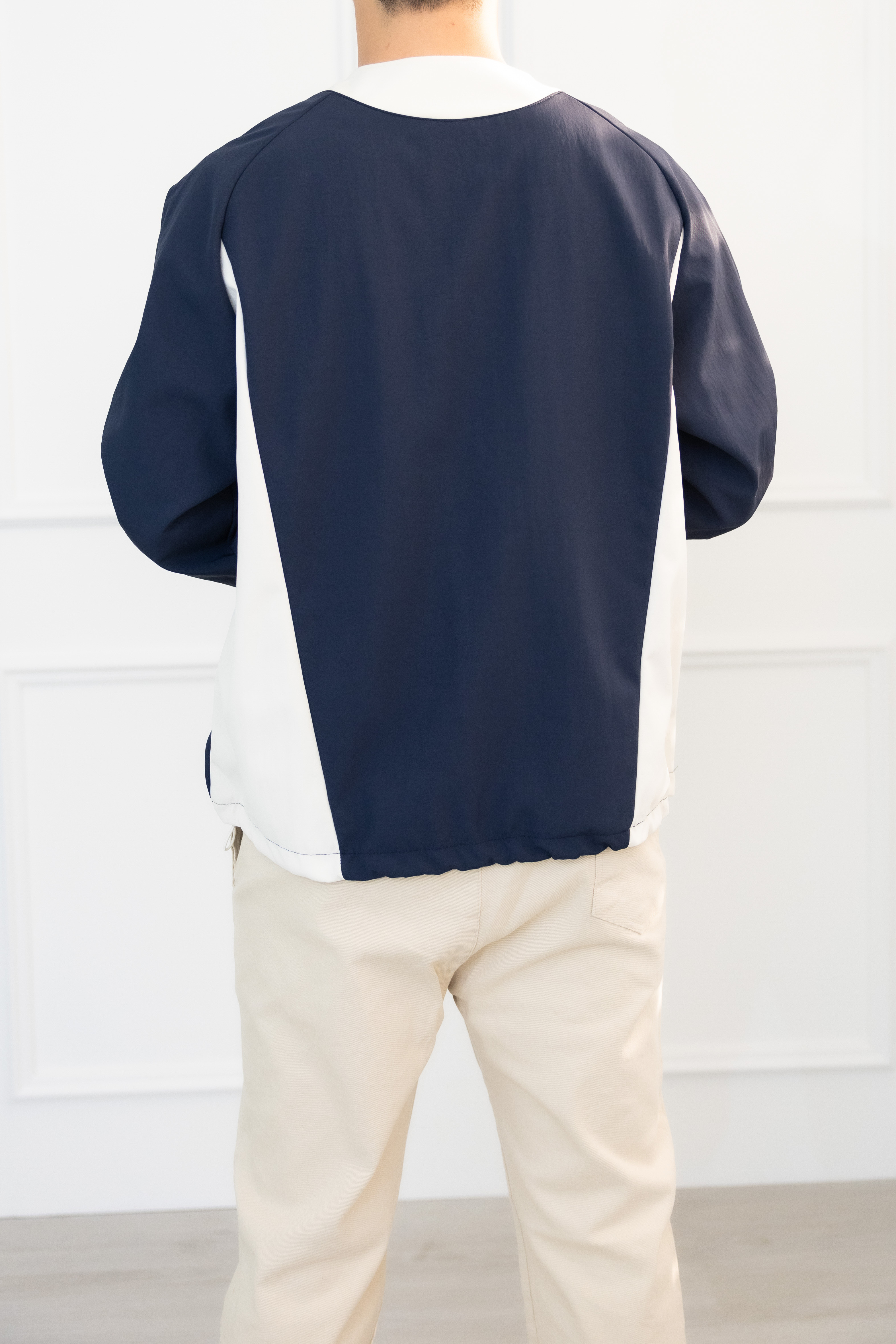 긴팔 拼色短刷毛下擺束繩長袖上衣/海軍藍(拼米色)