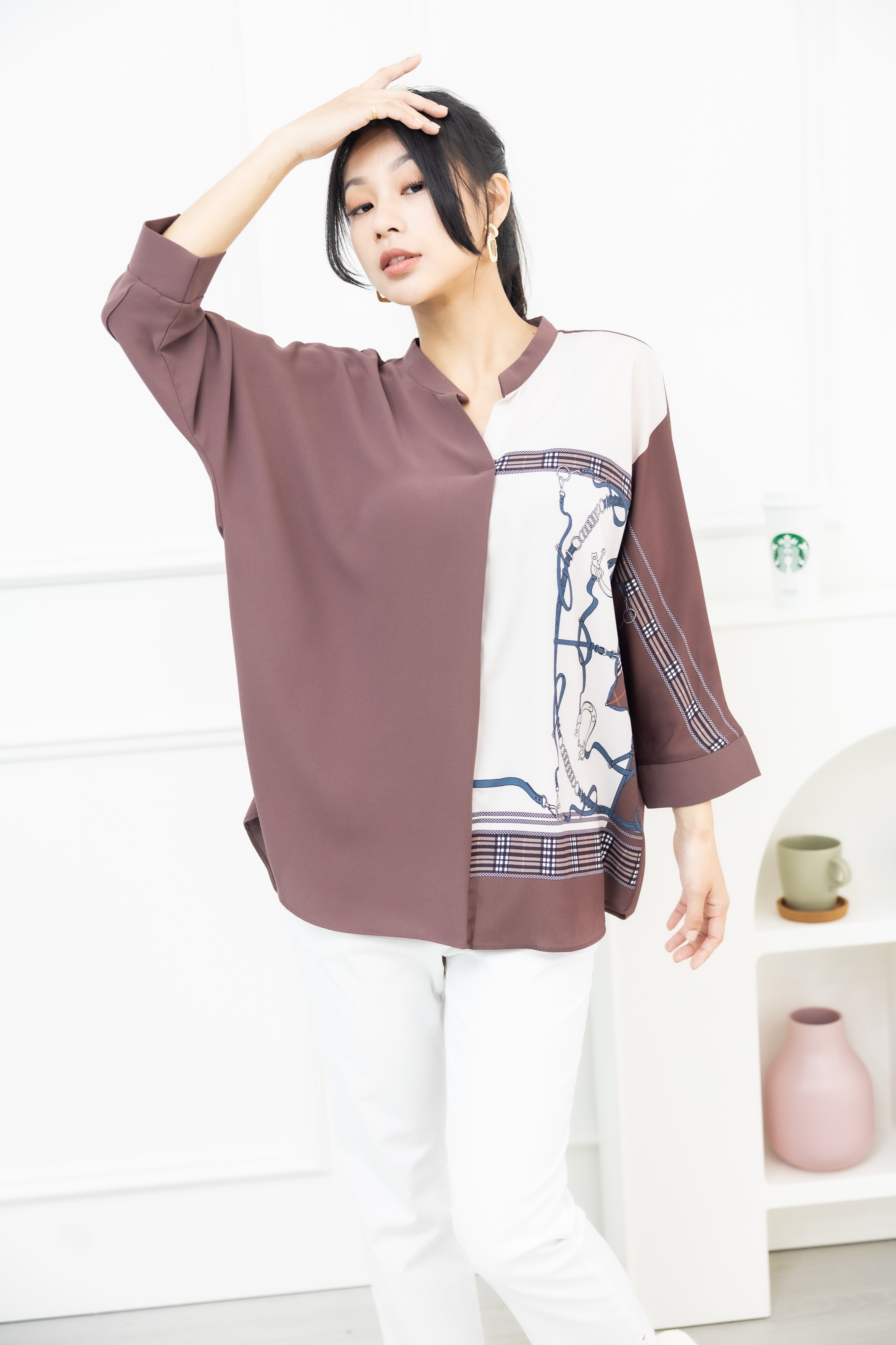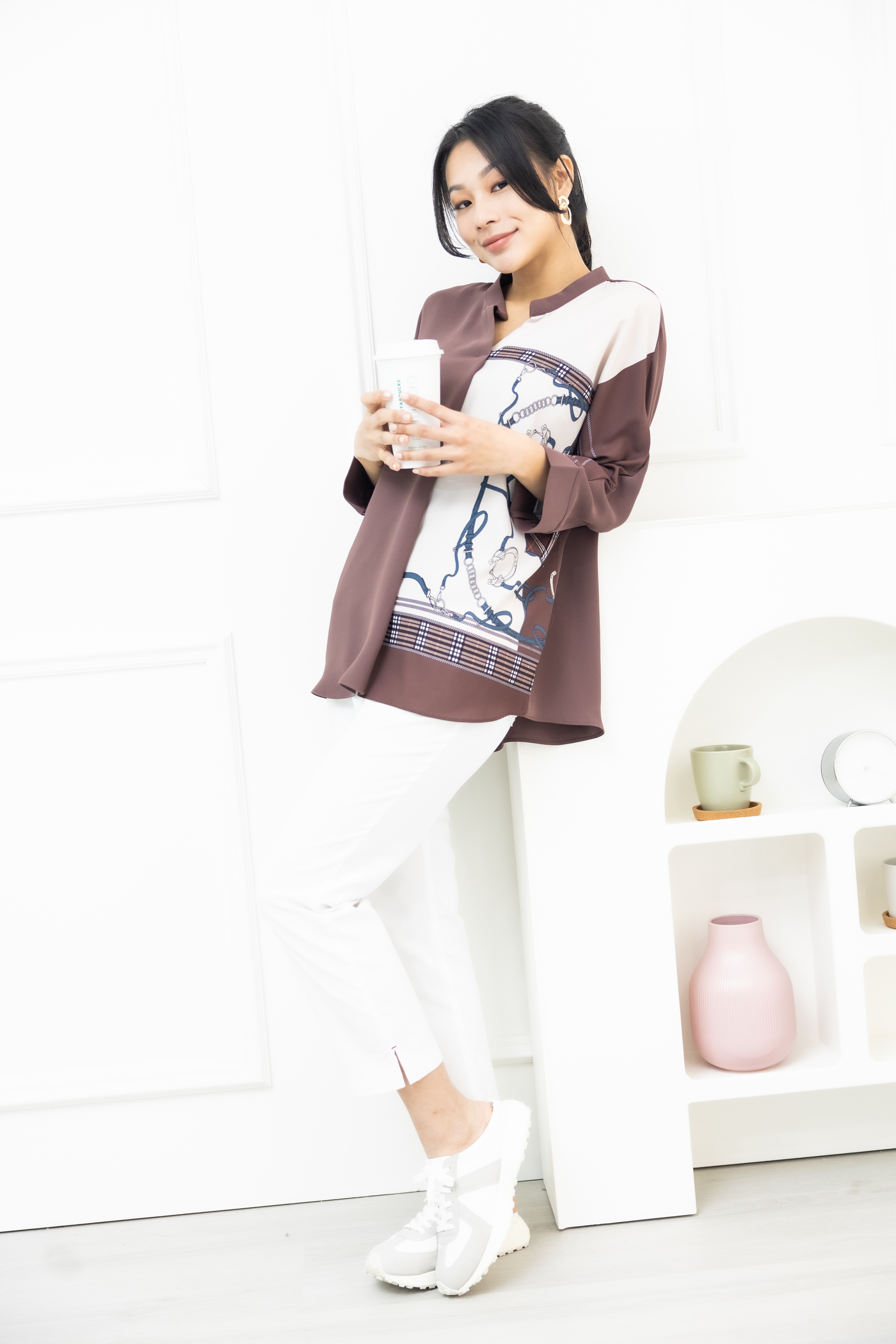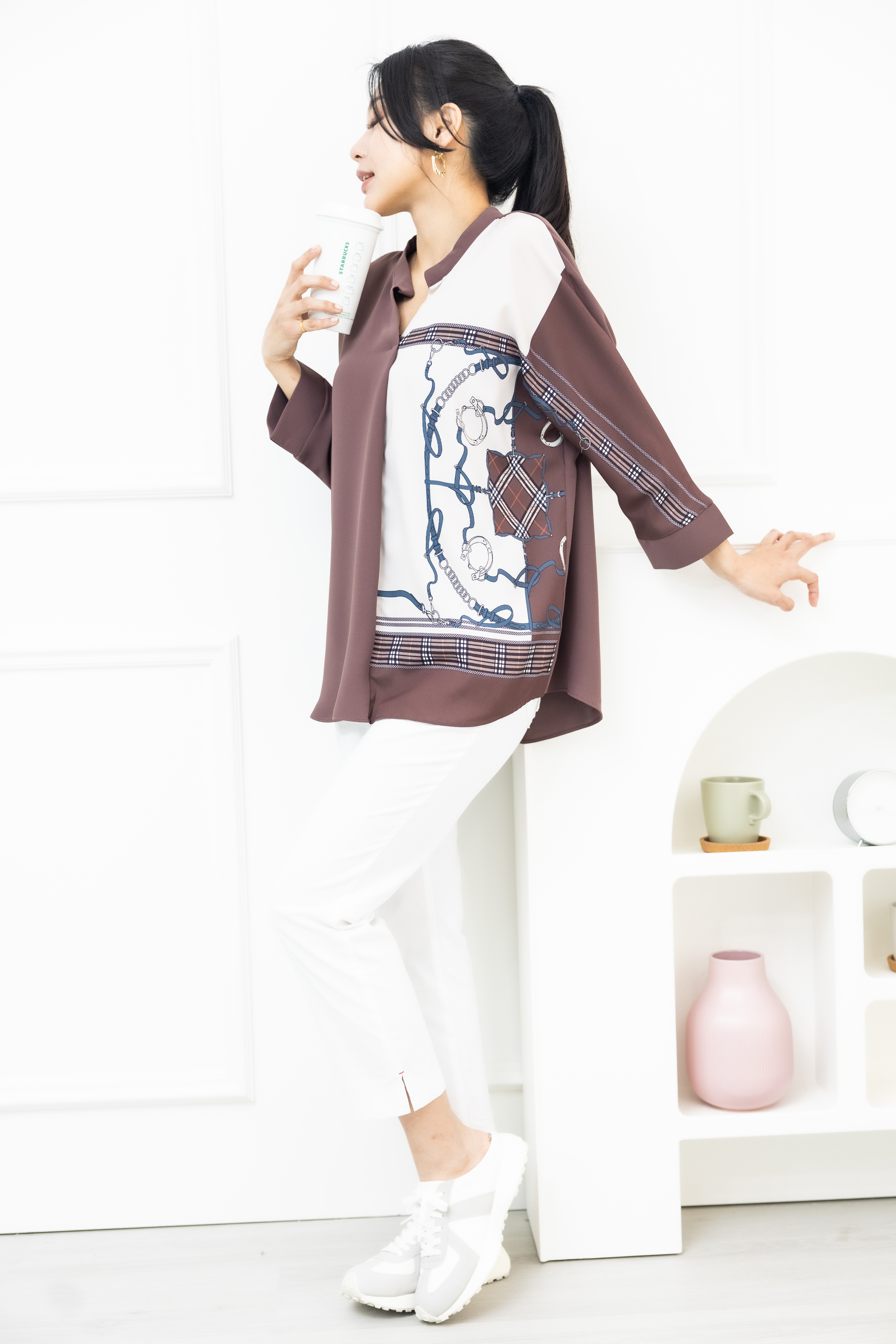 긴팔 格子金屬圖騰 半領微開襟七分袖上衣 / 咖啡色