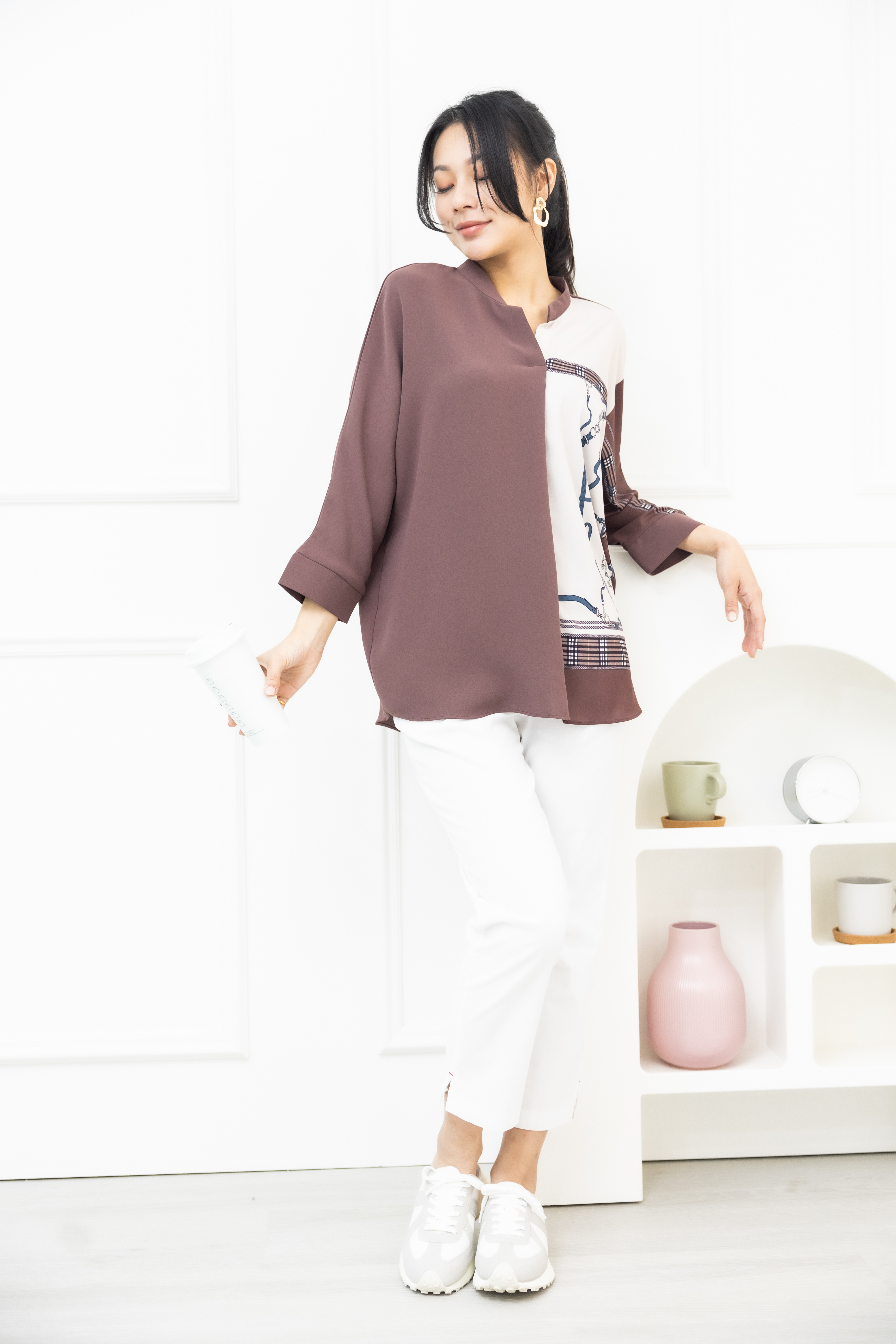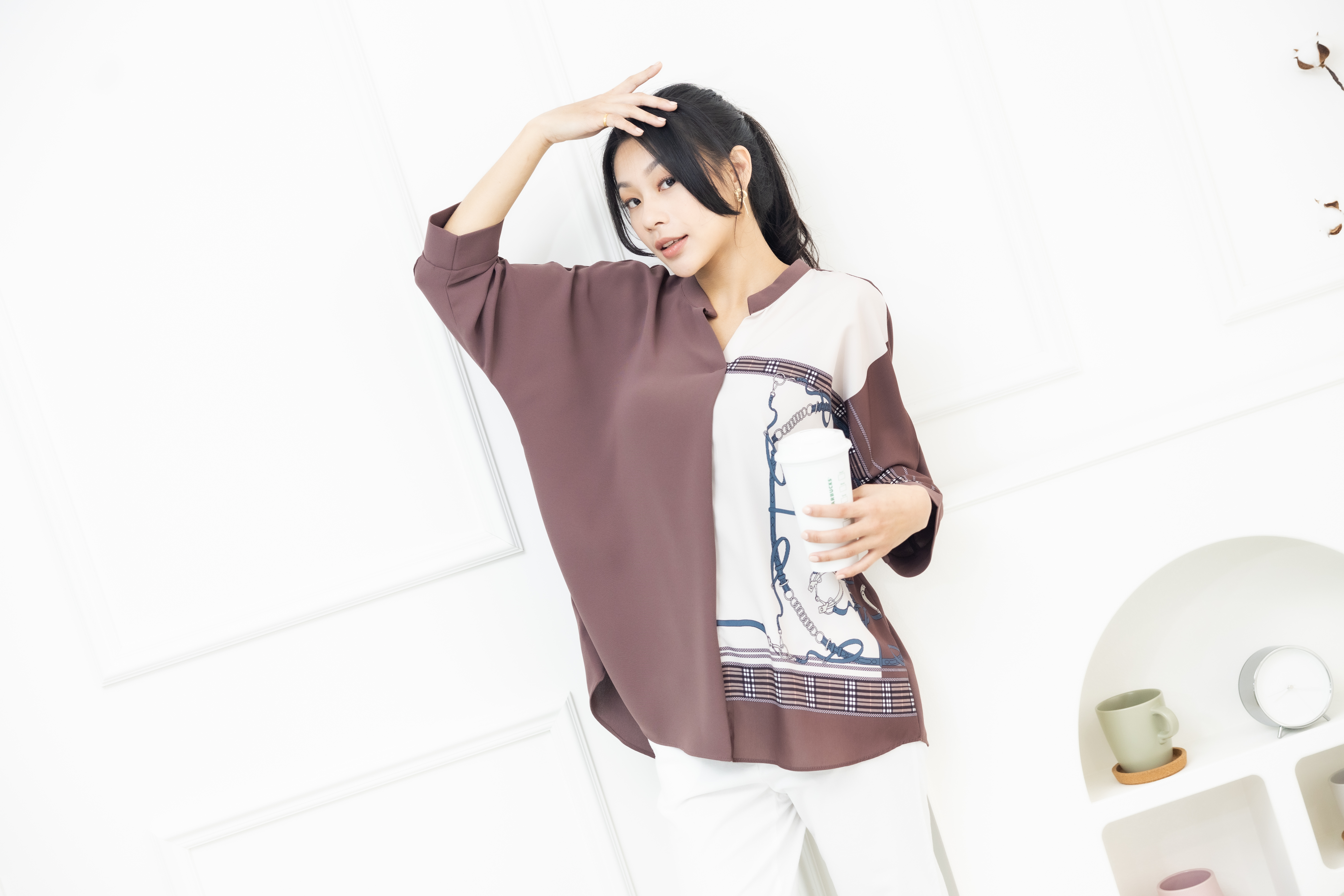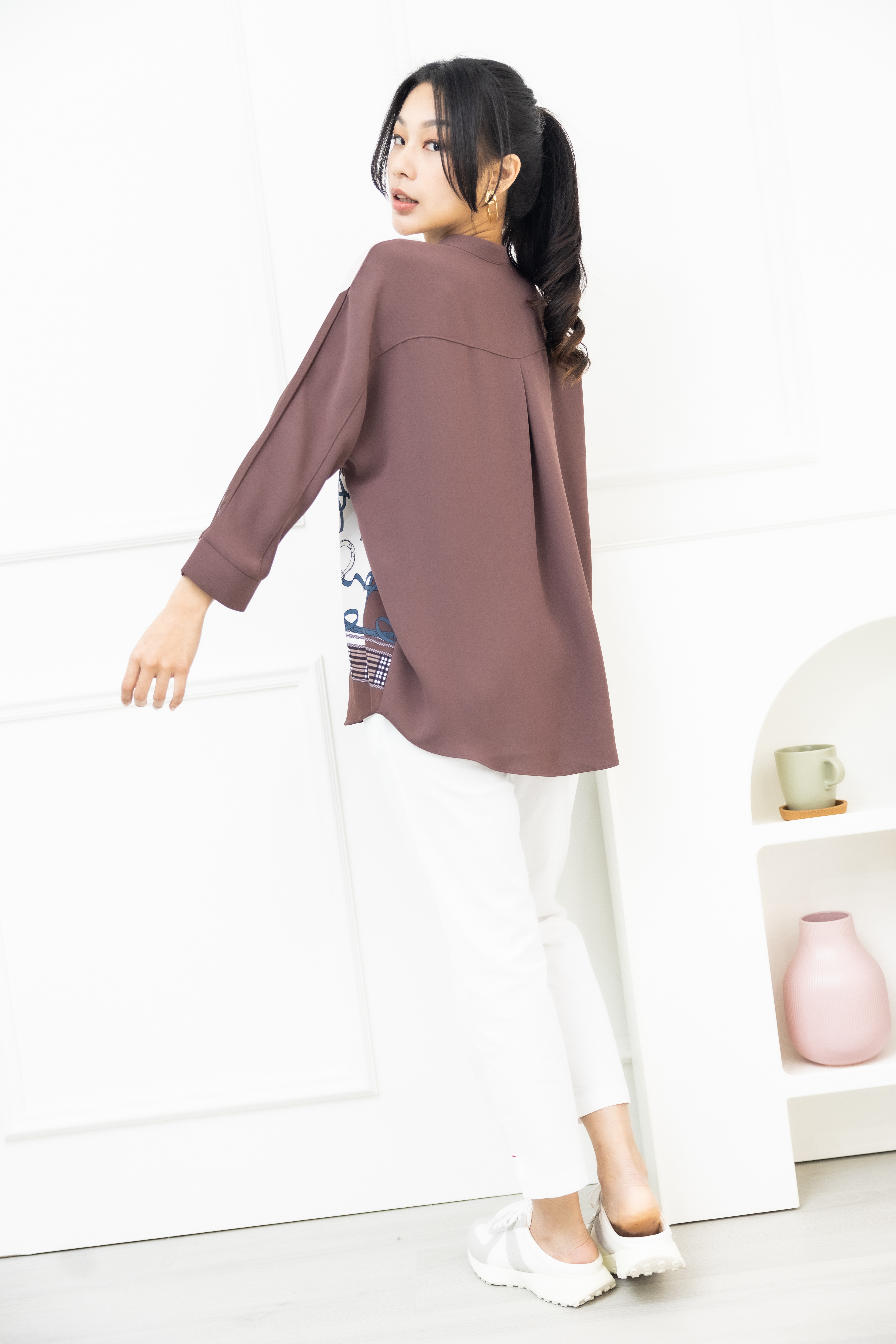 긴팔 格子金屬圖騰 半領微開襟七分袖上衣 / 咖啡色