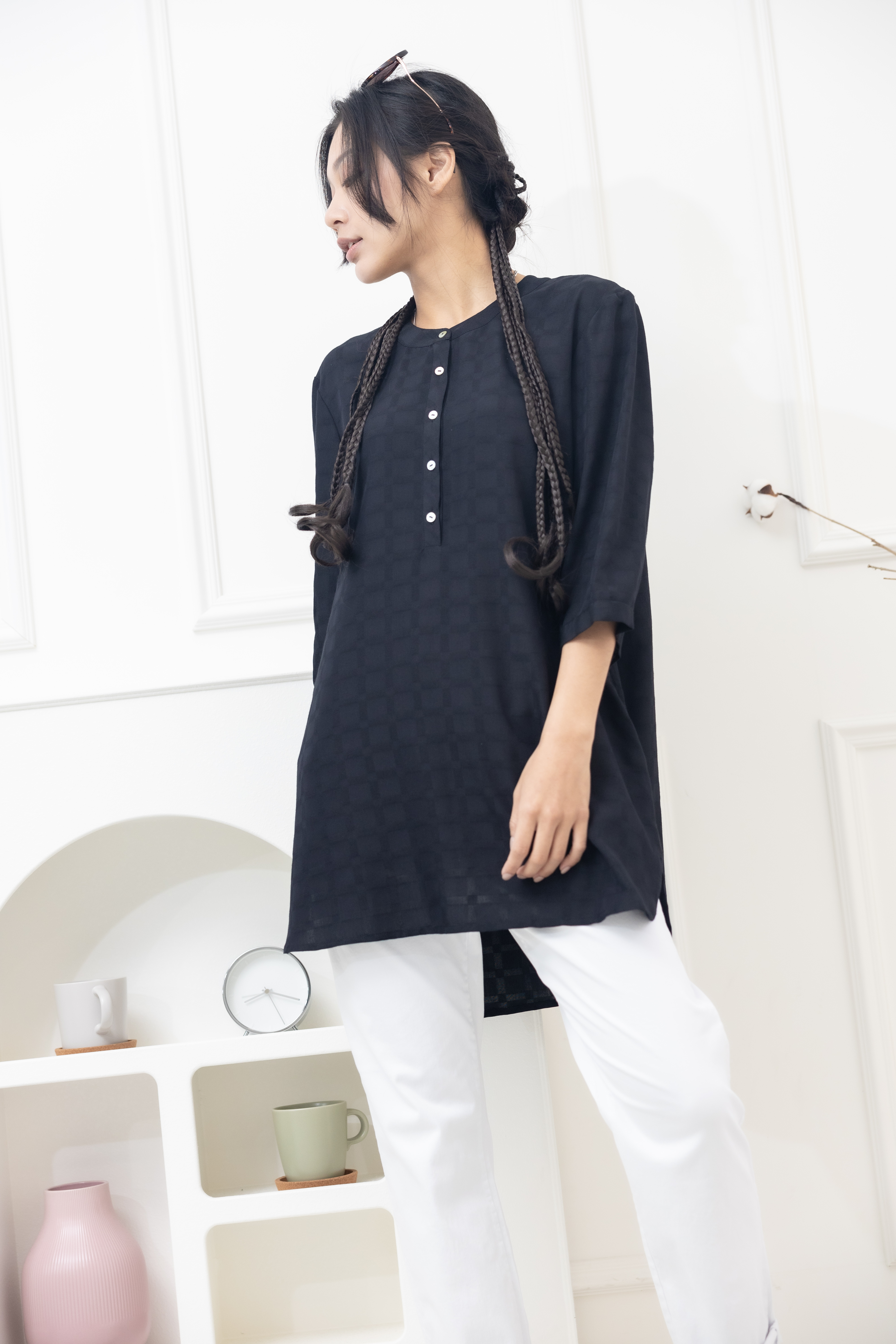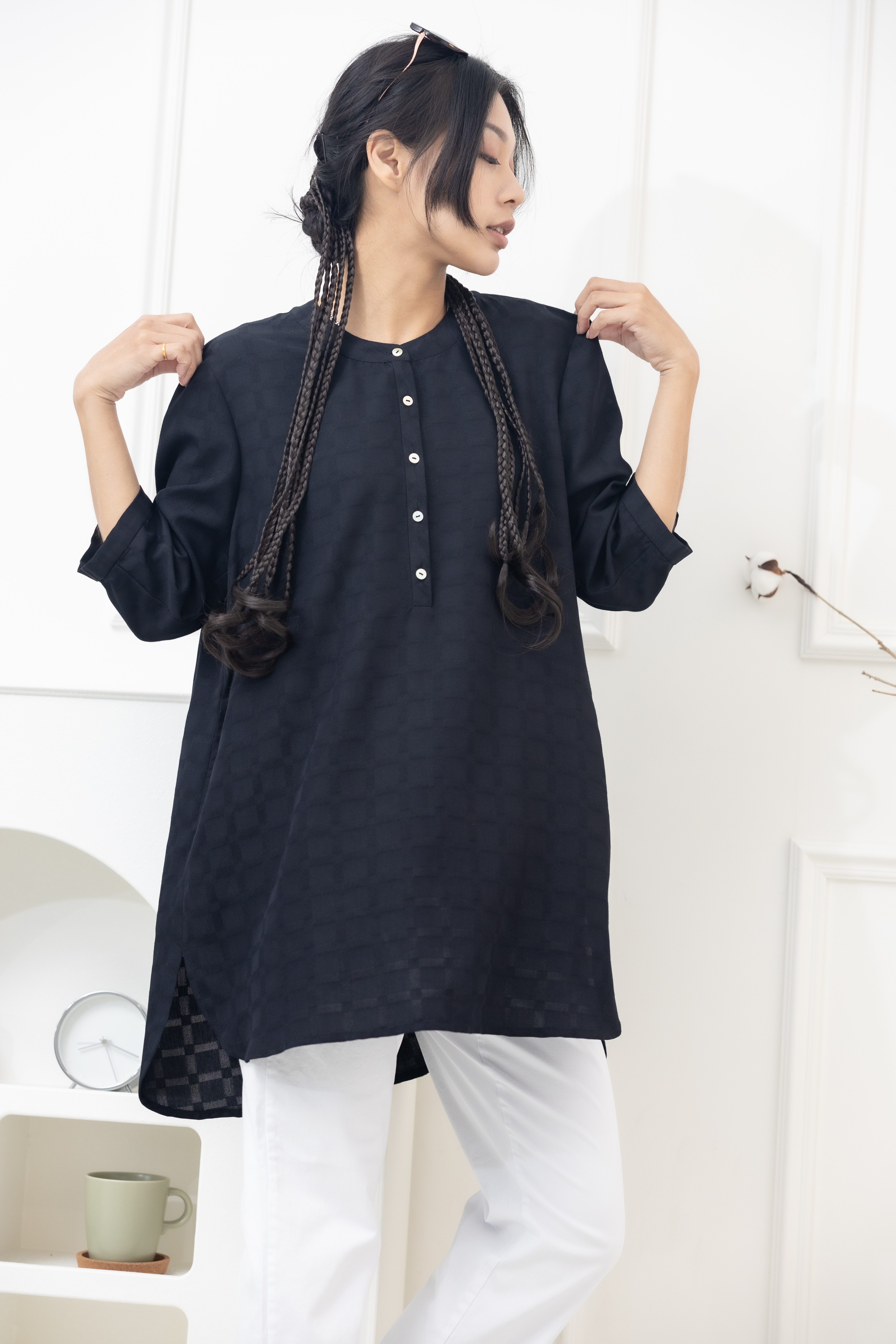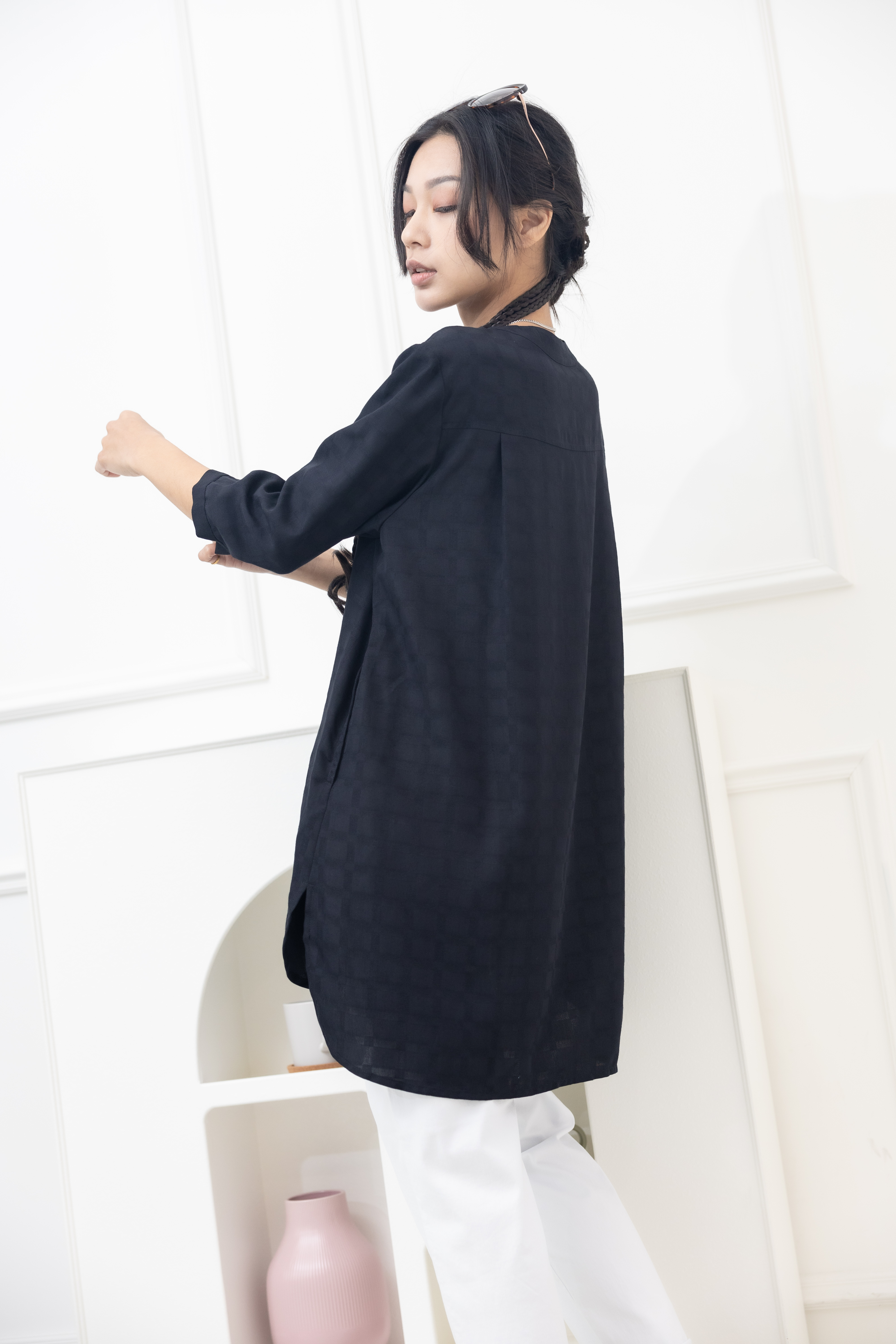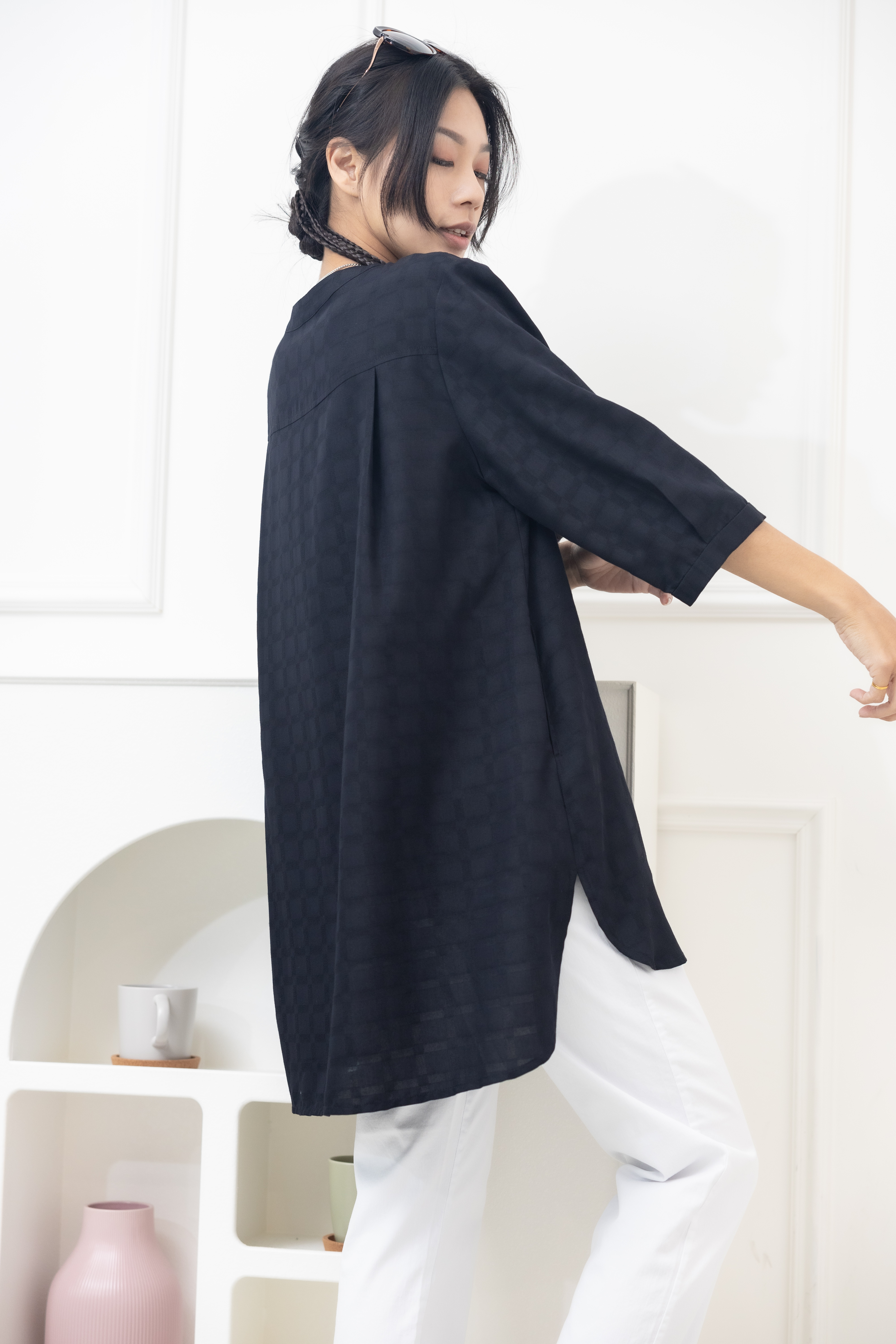 긴팔 格紋七分袖上衣/黑色