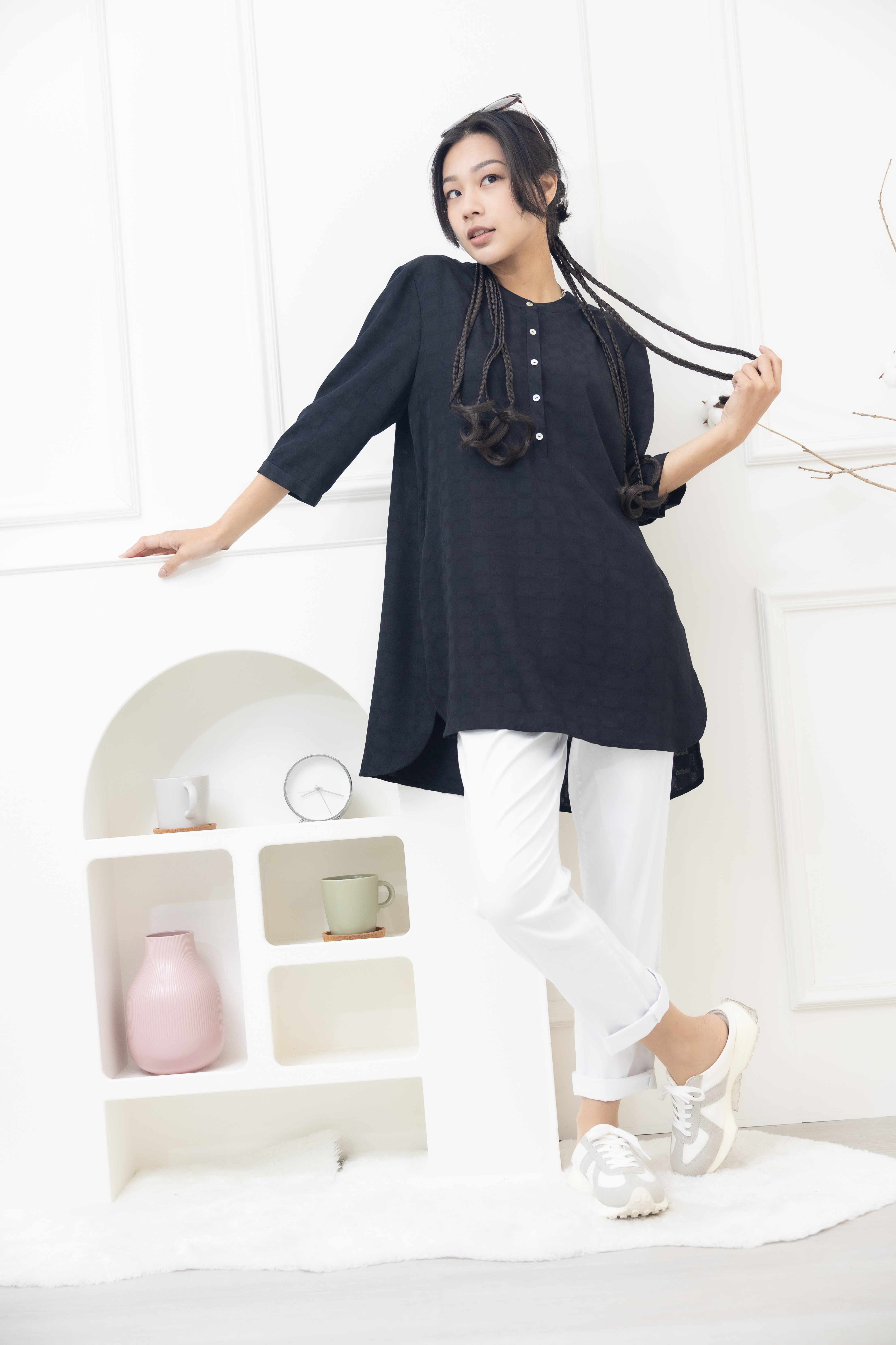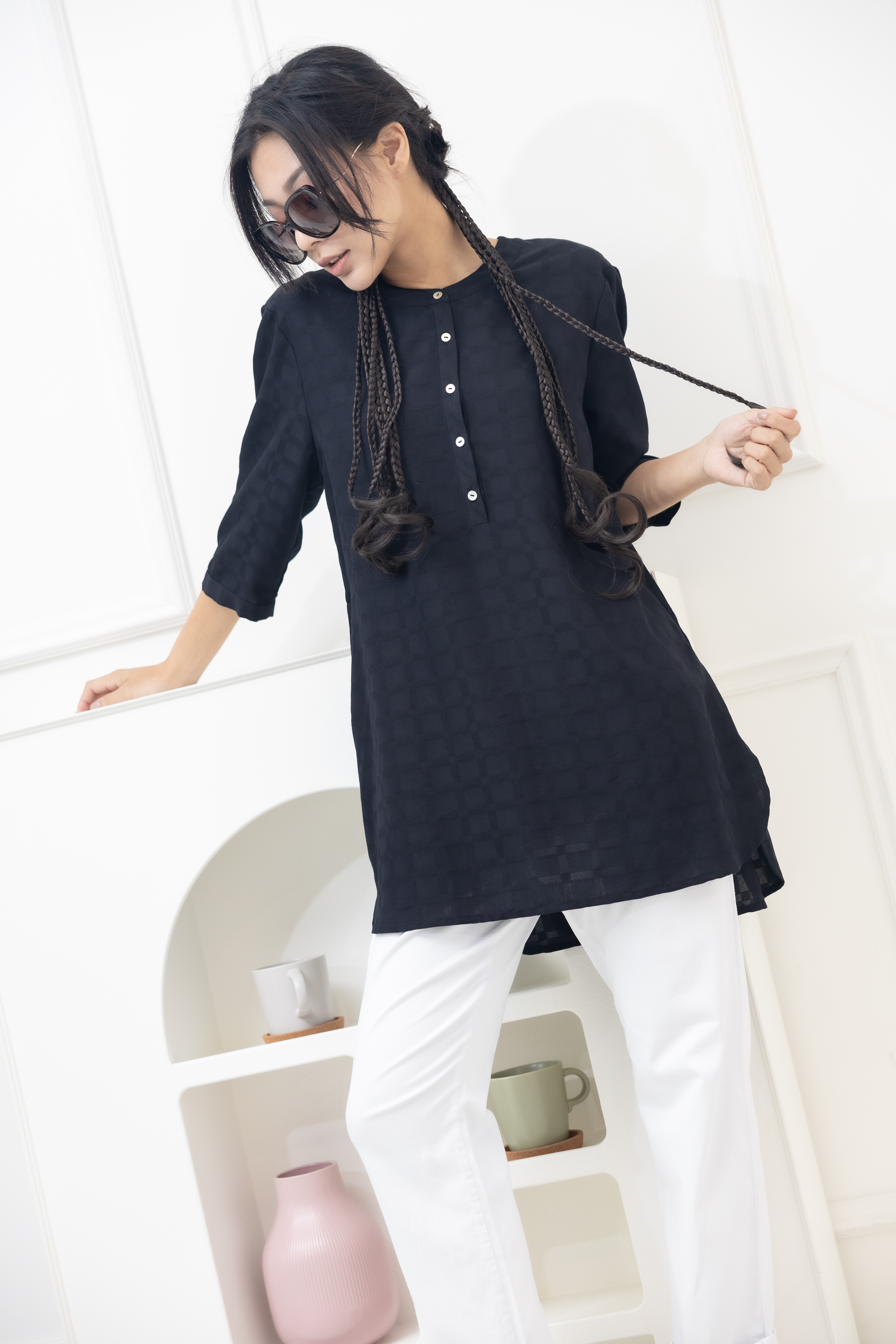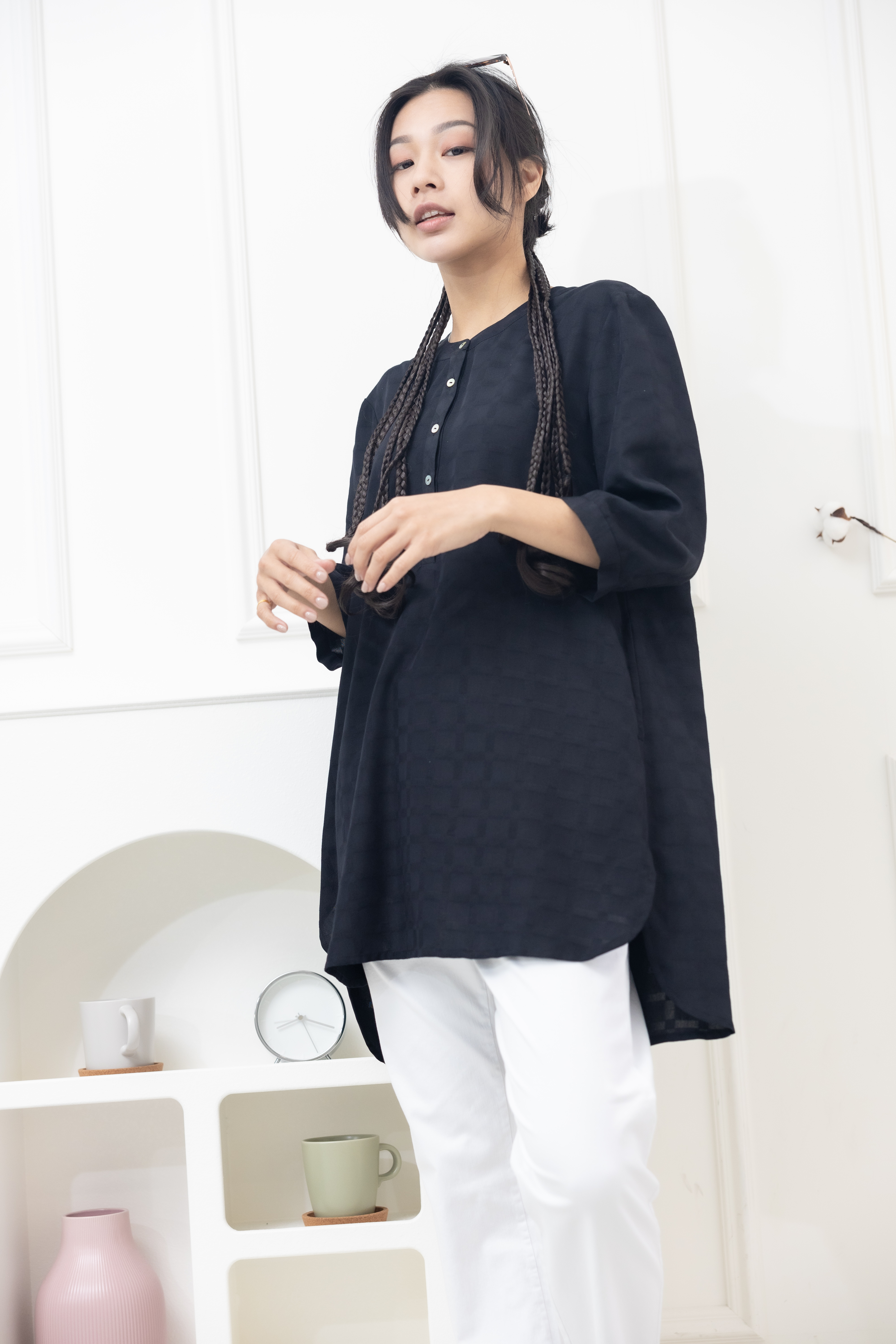 긴팔 格紋七分袖上衣/黑色