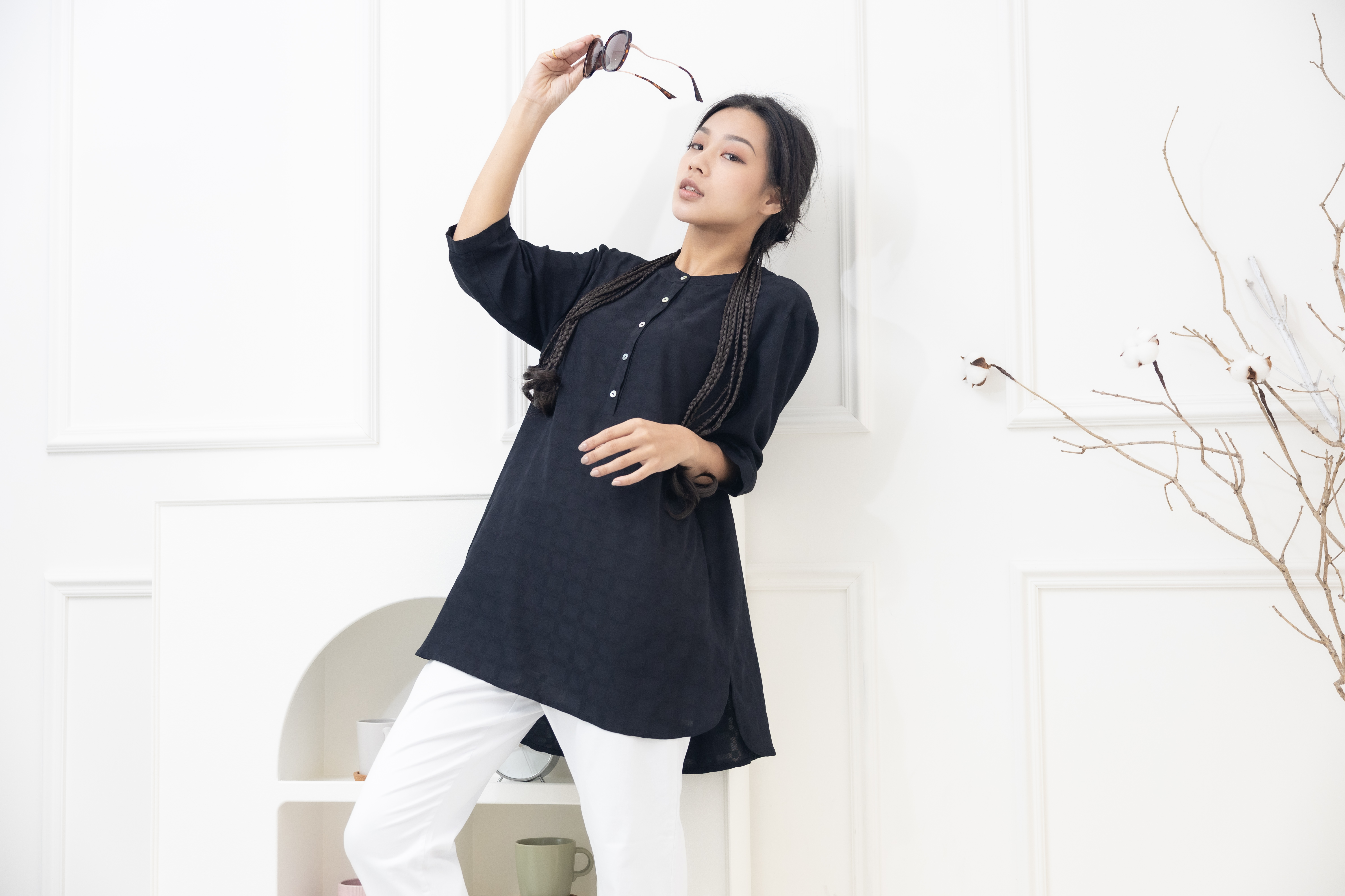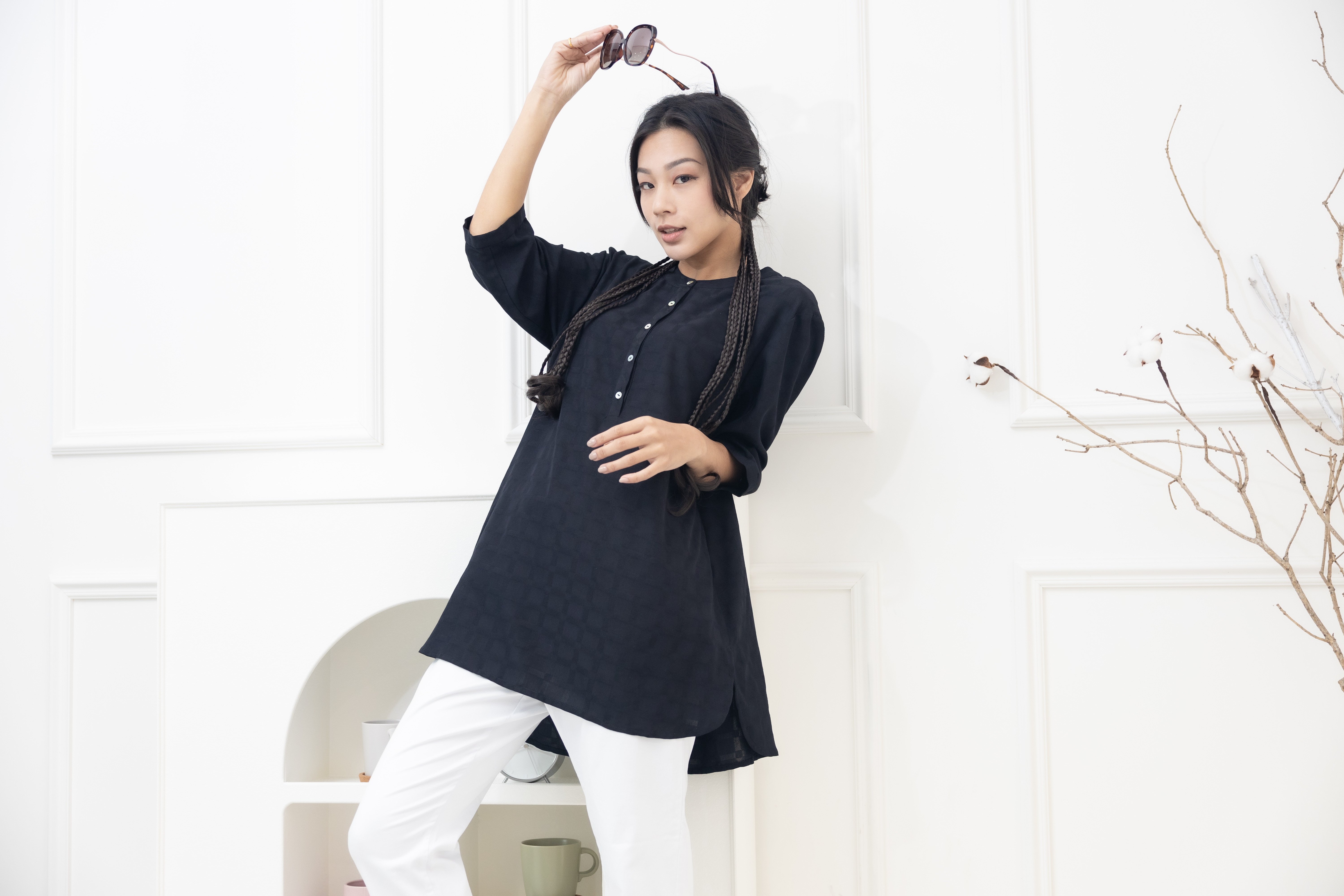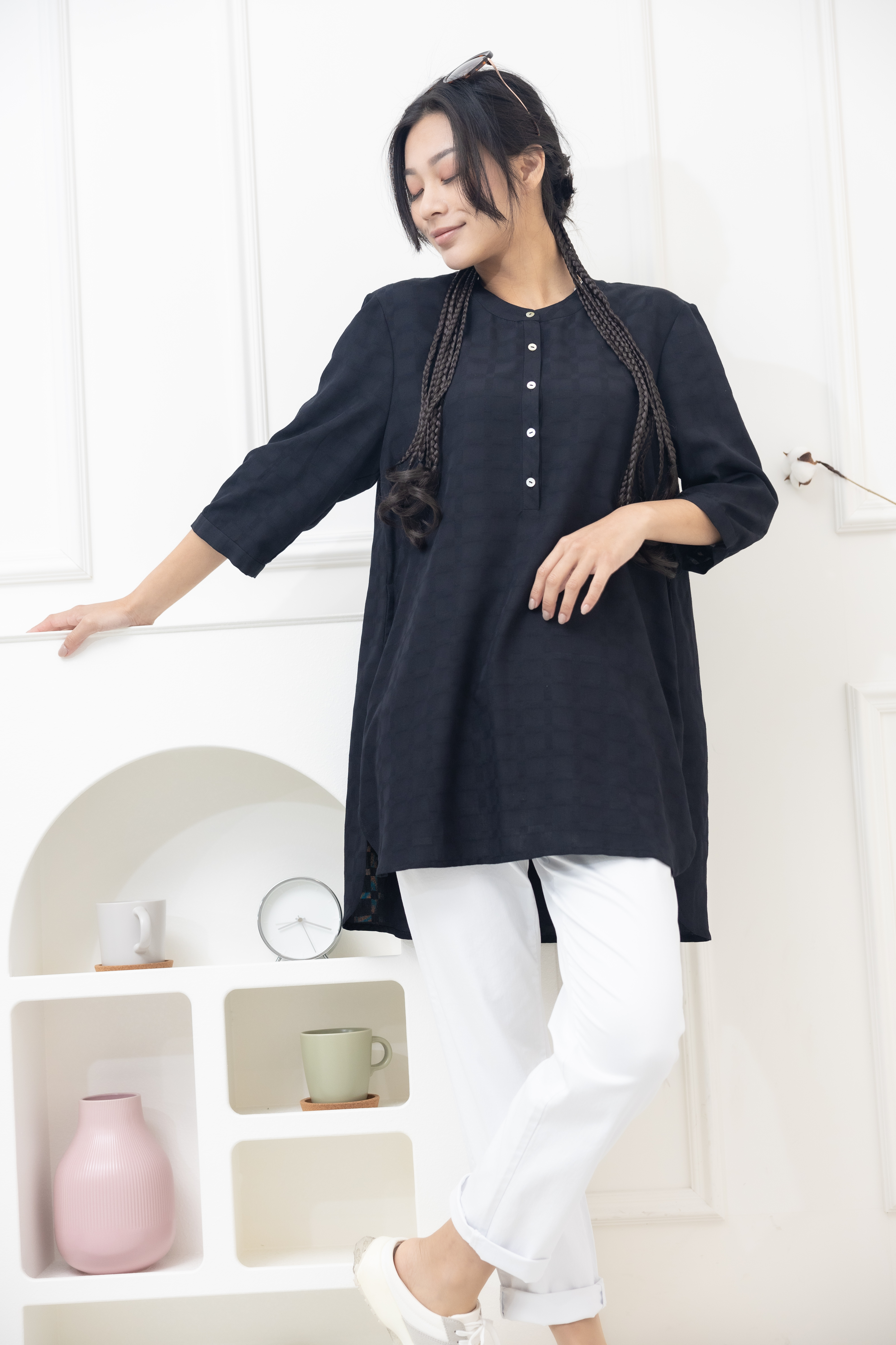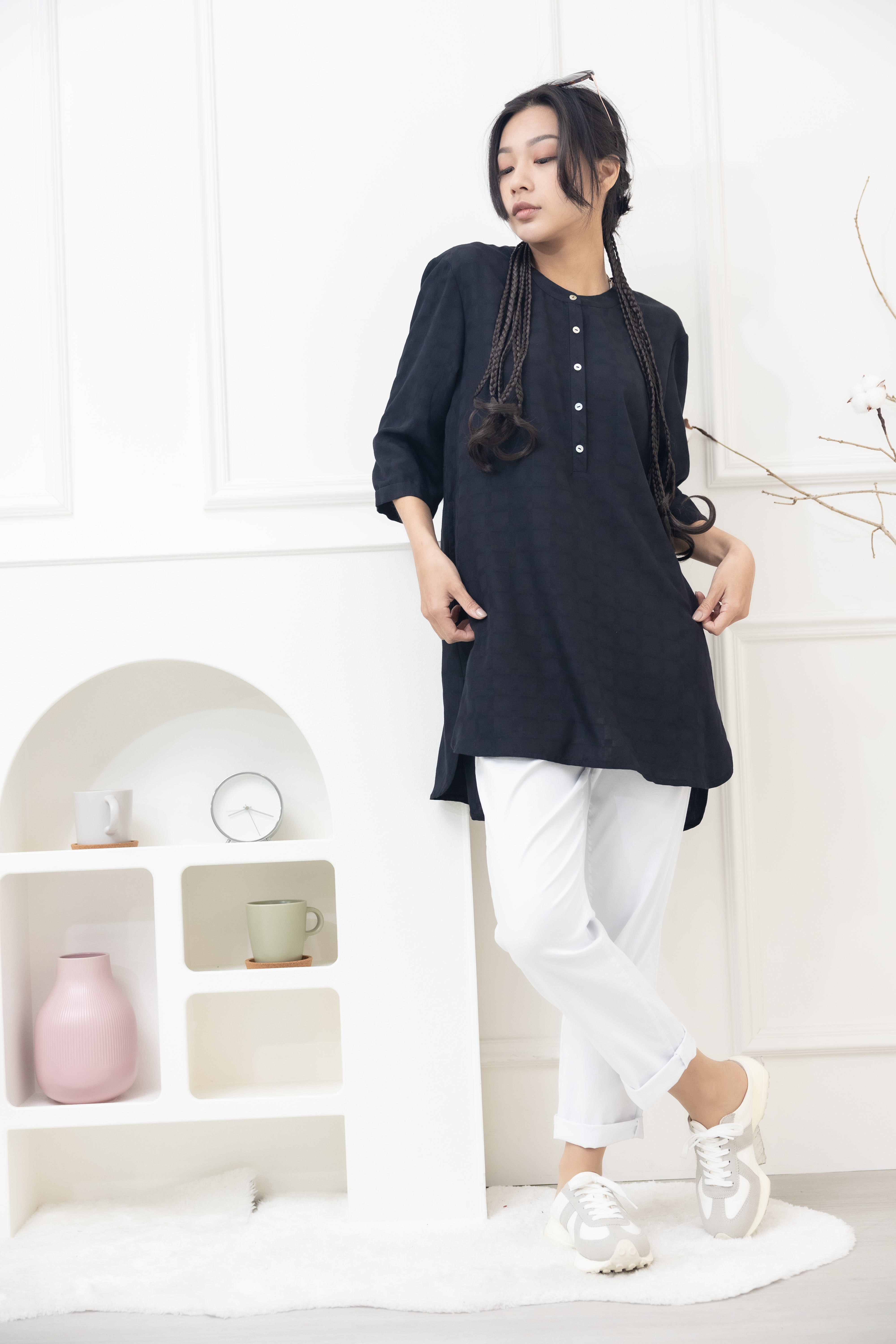 긴팔 格紋七分袖上衣/黑色