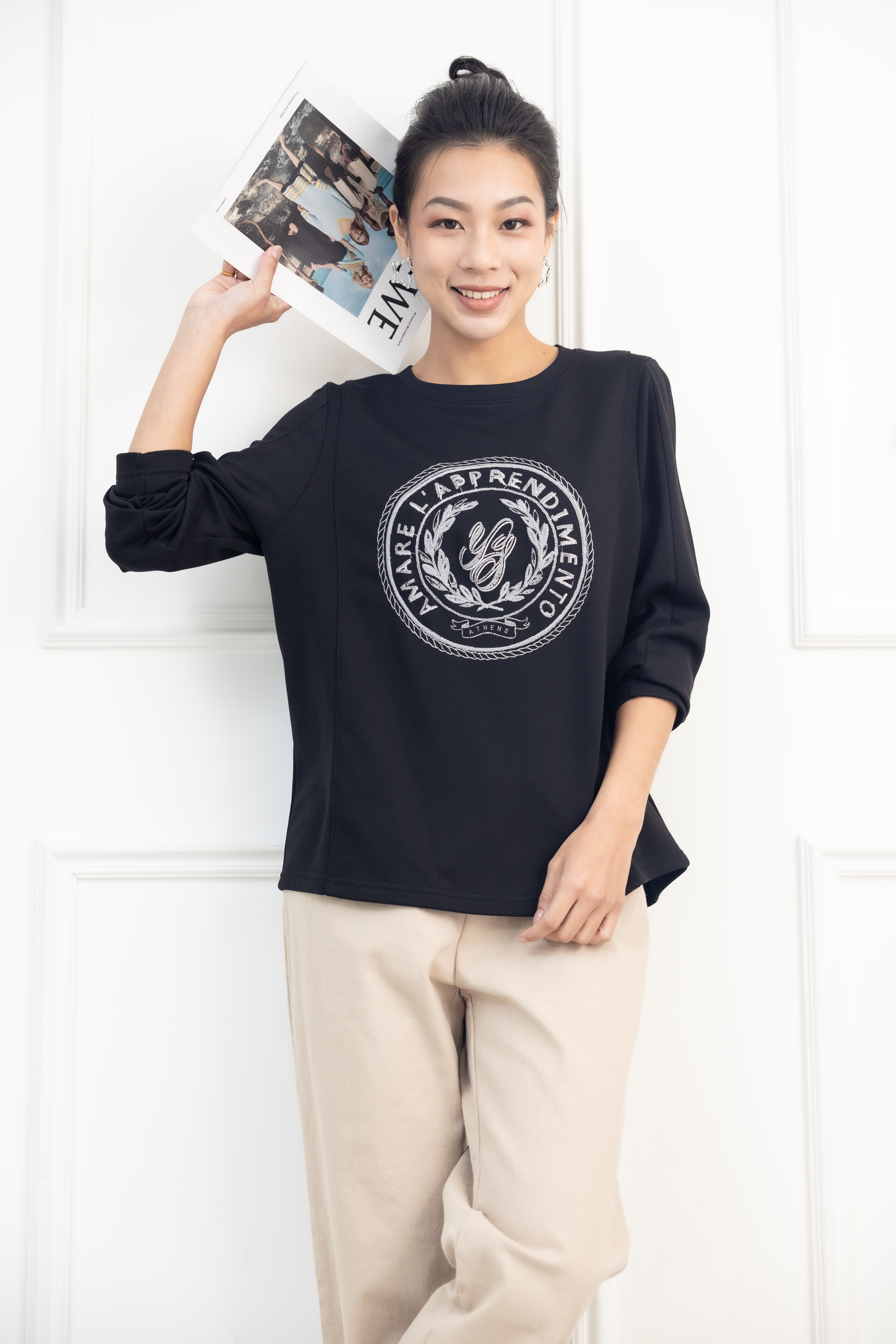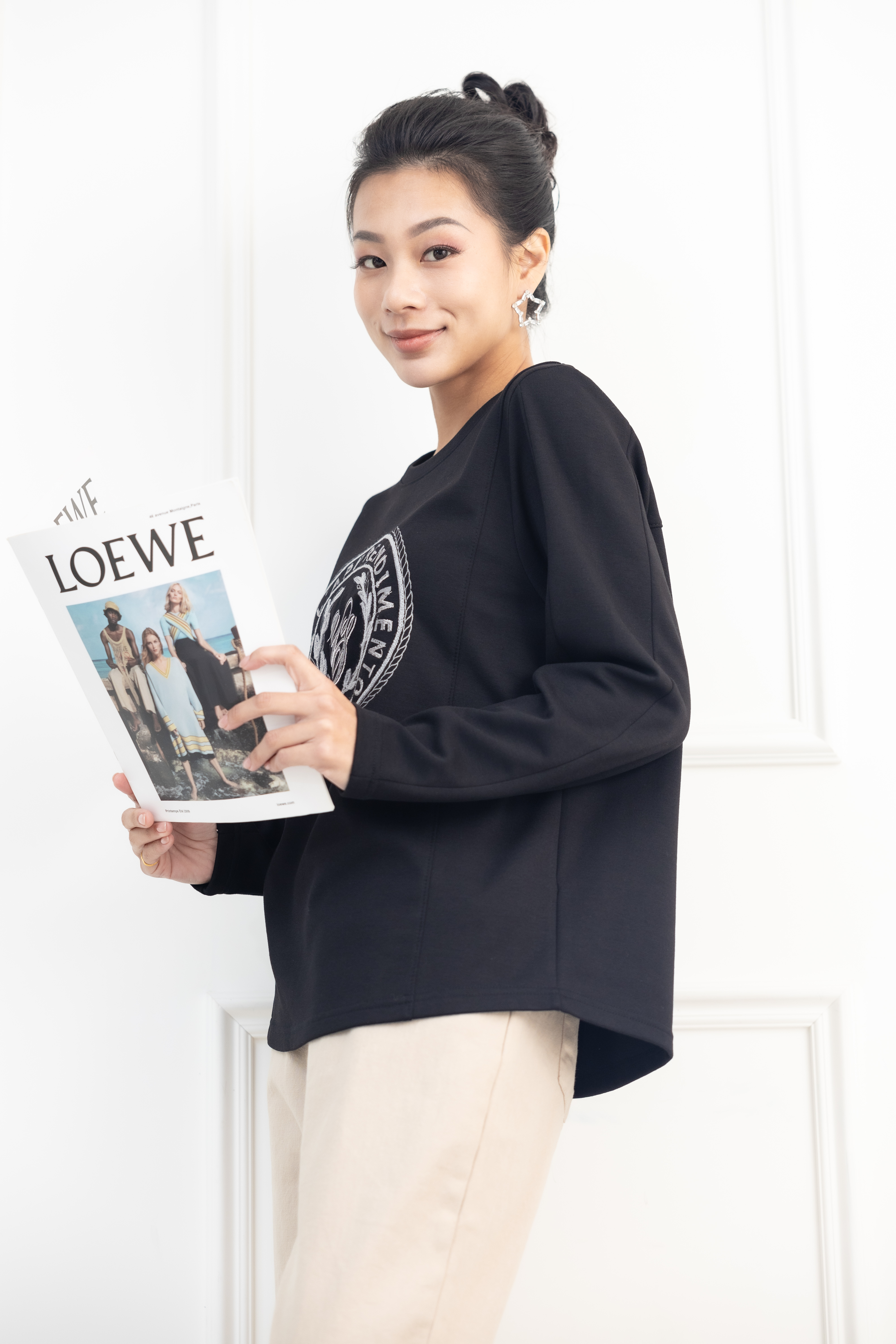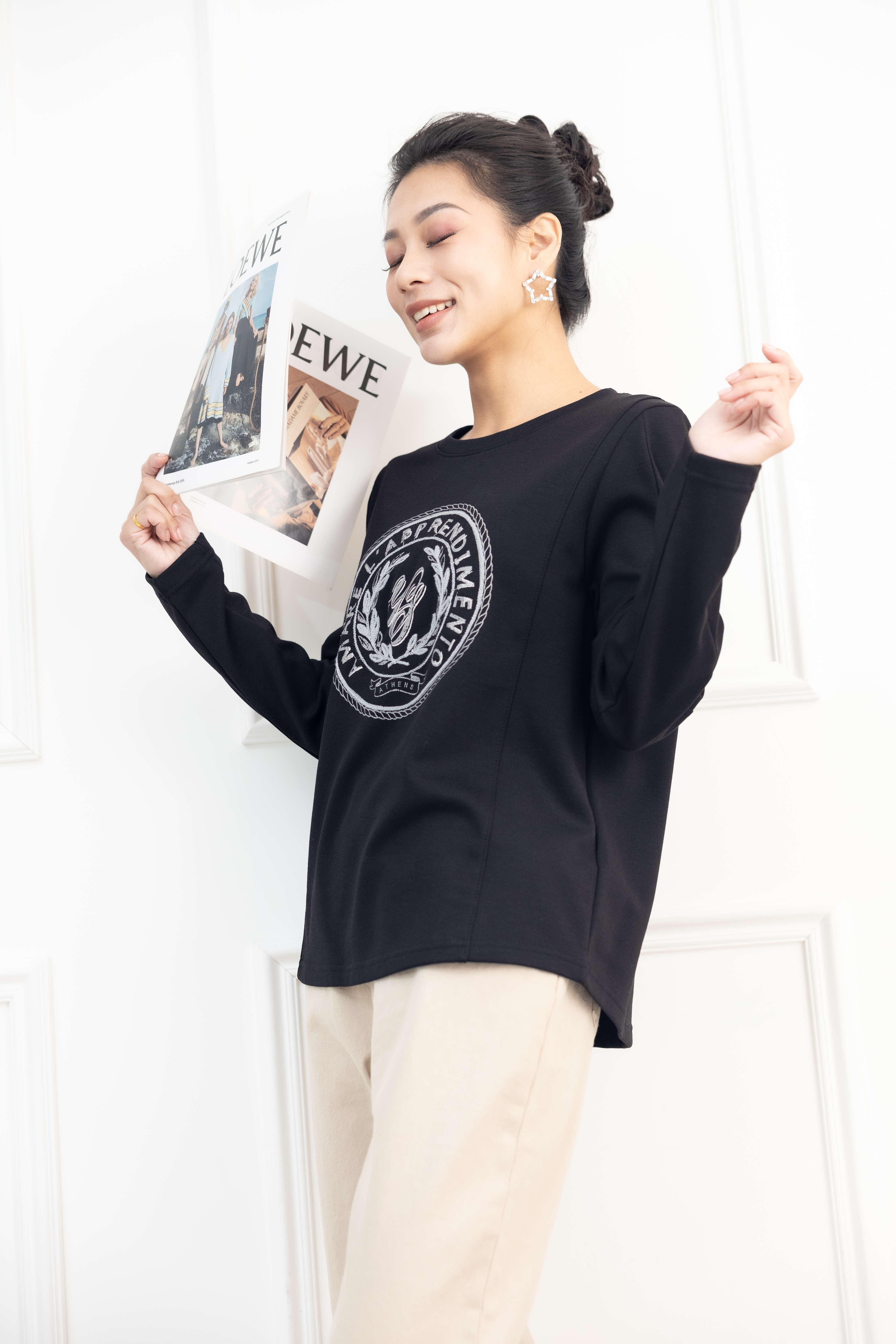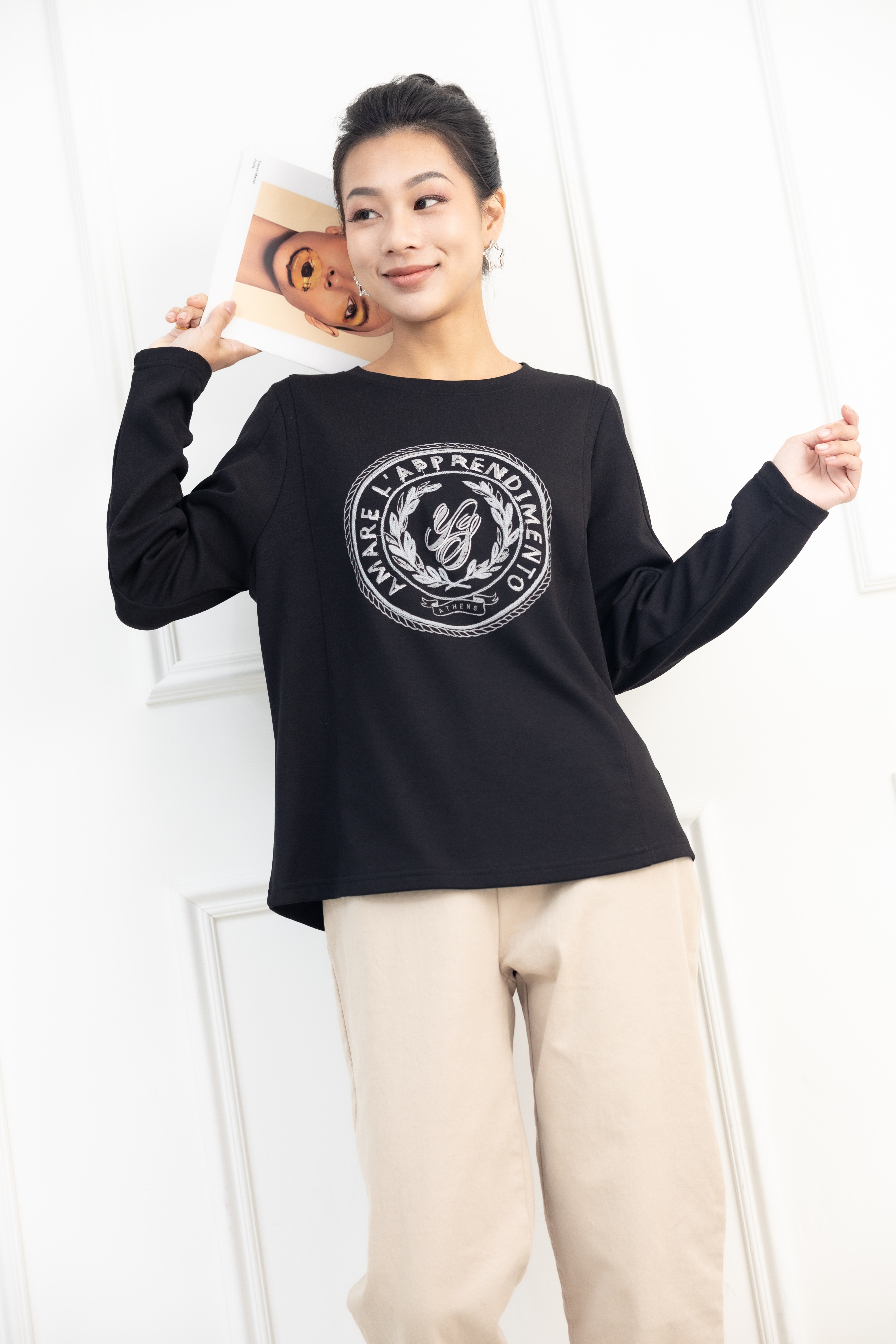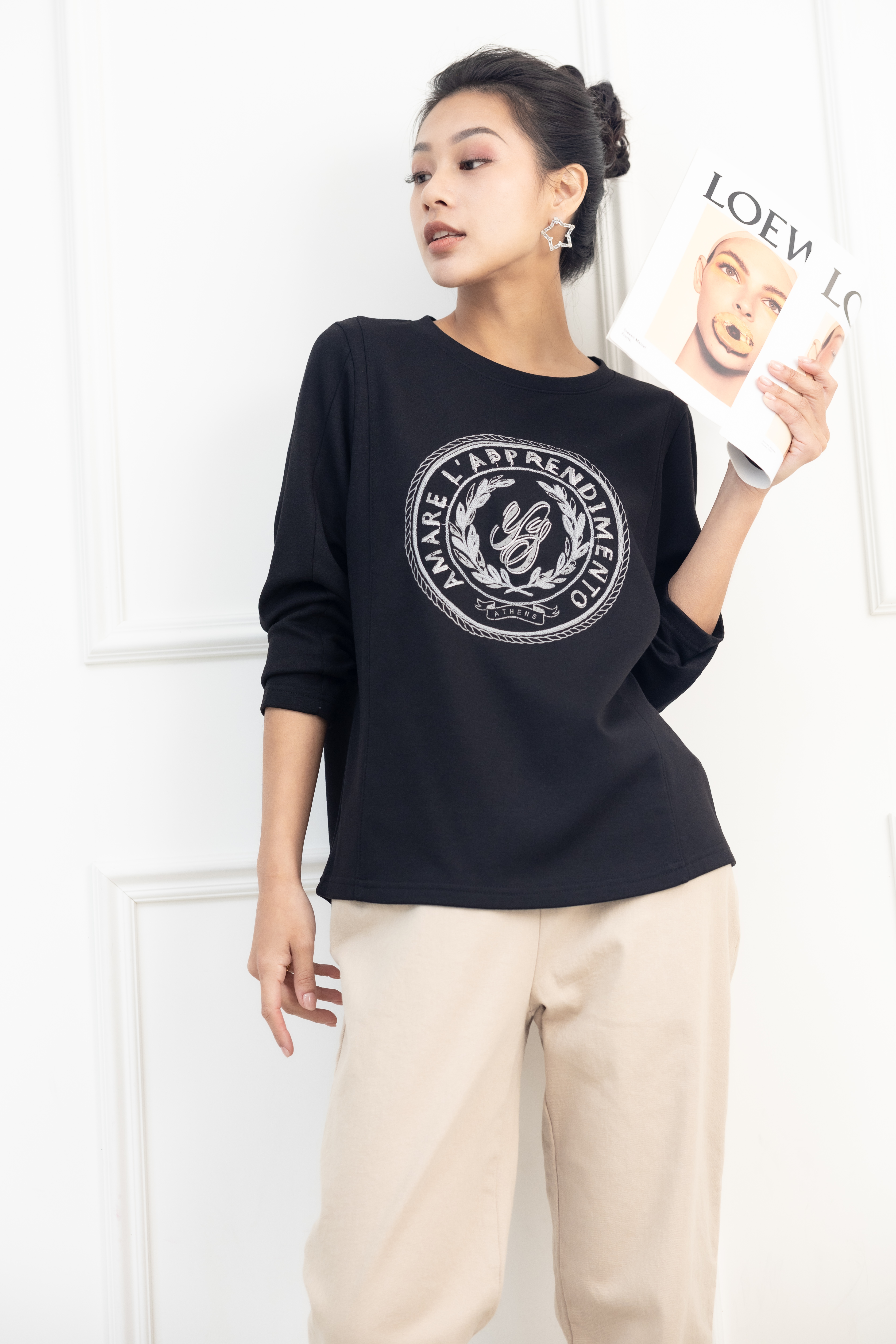 긴팔 毛線圓型圖騰 u領上衣 / 黑色