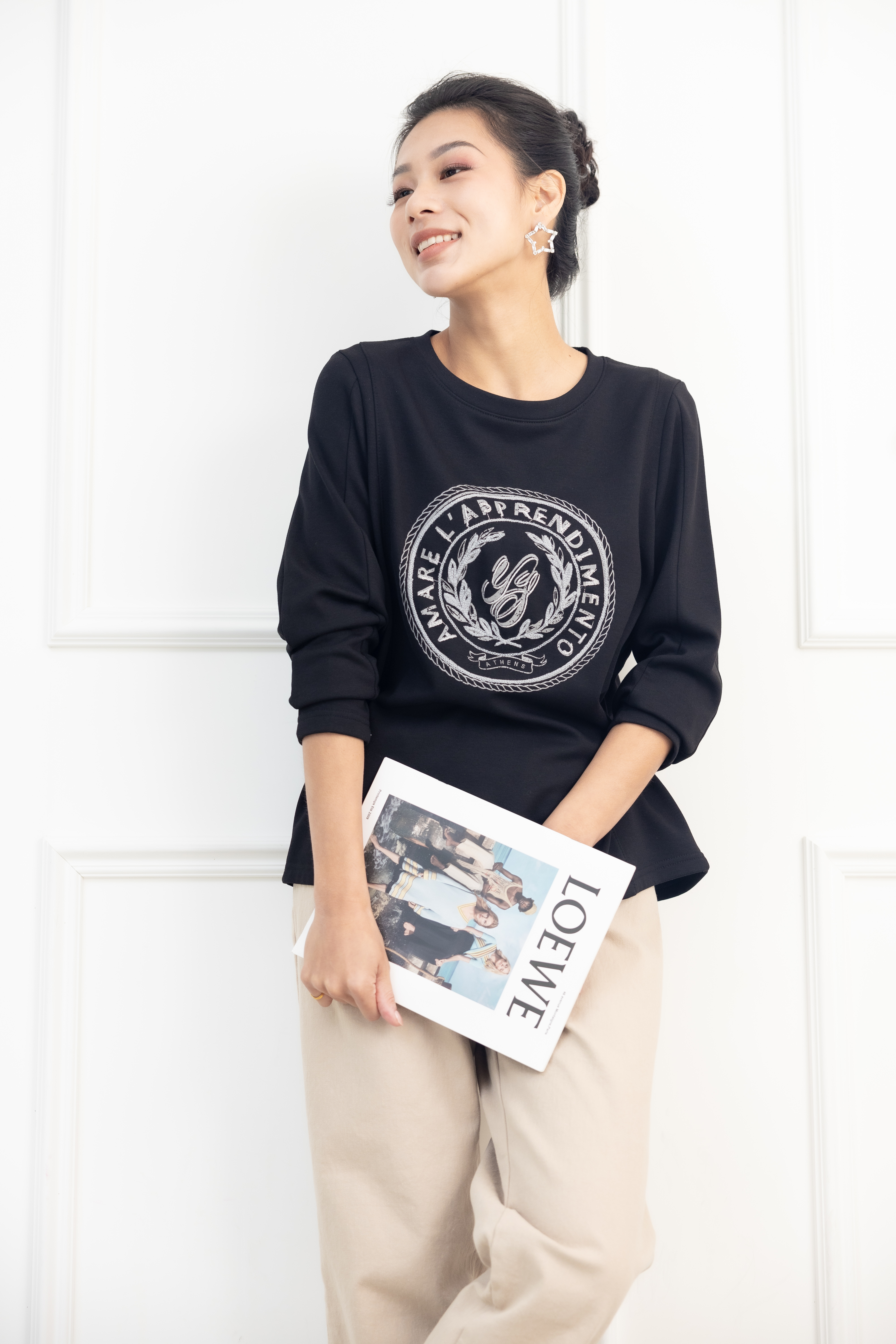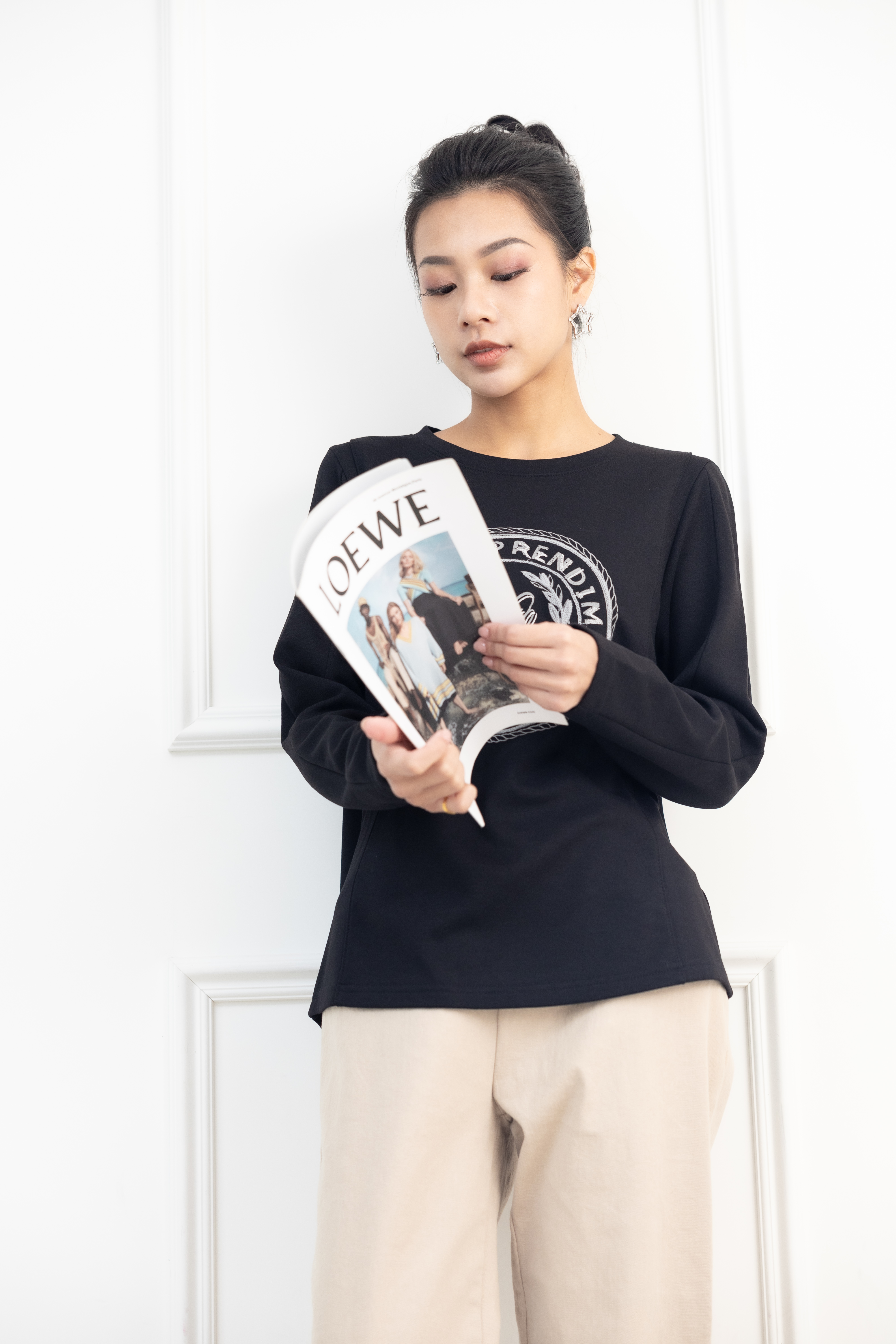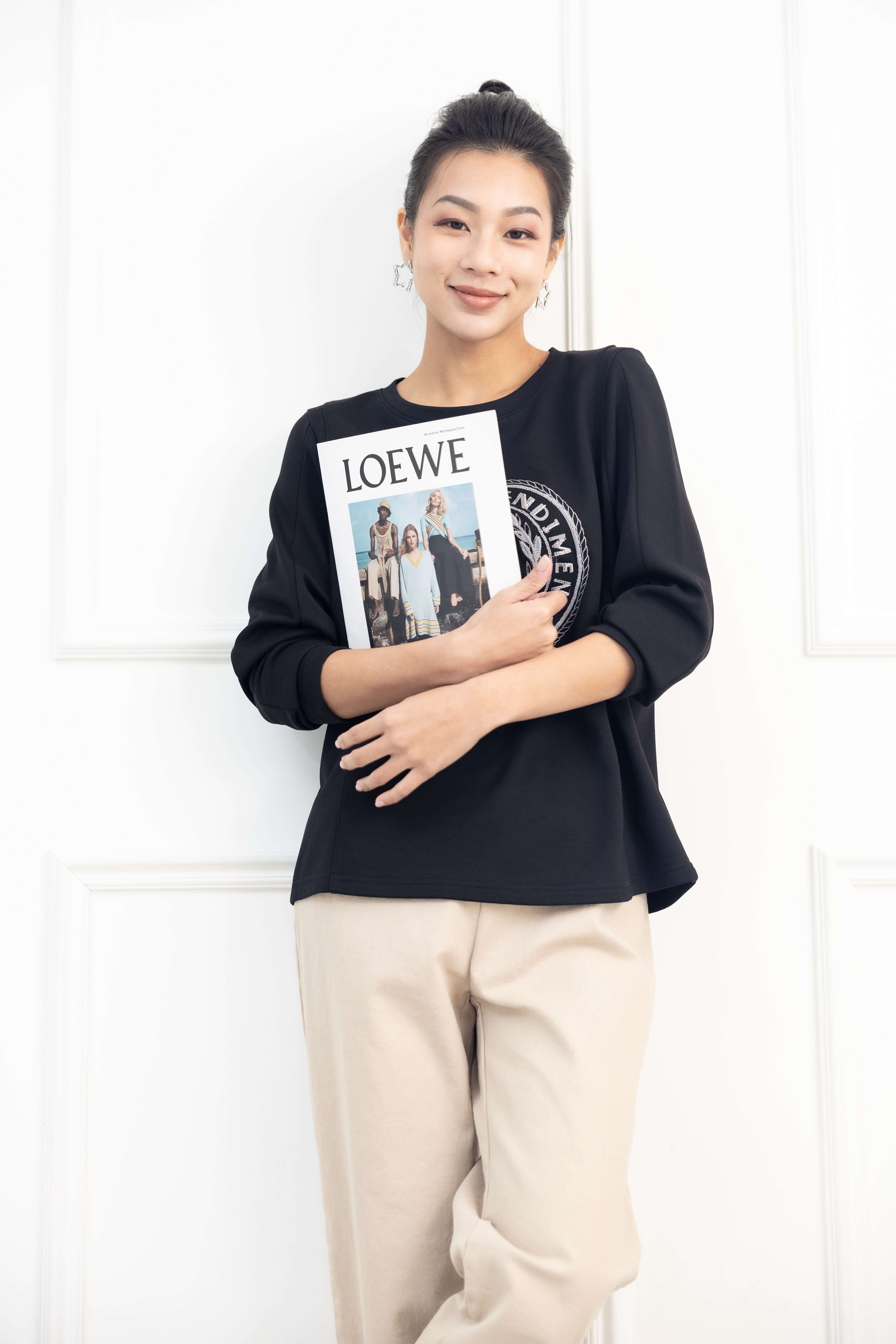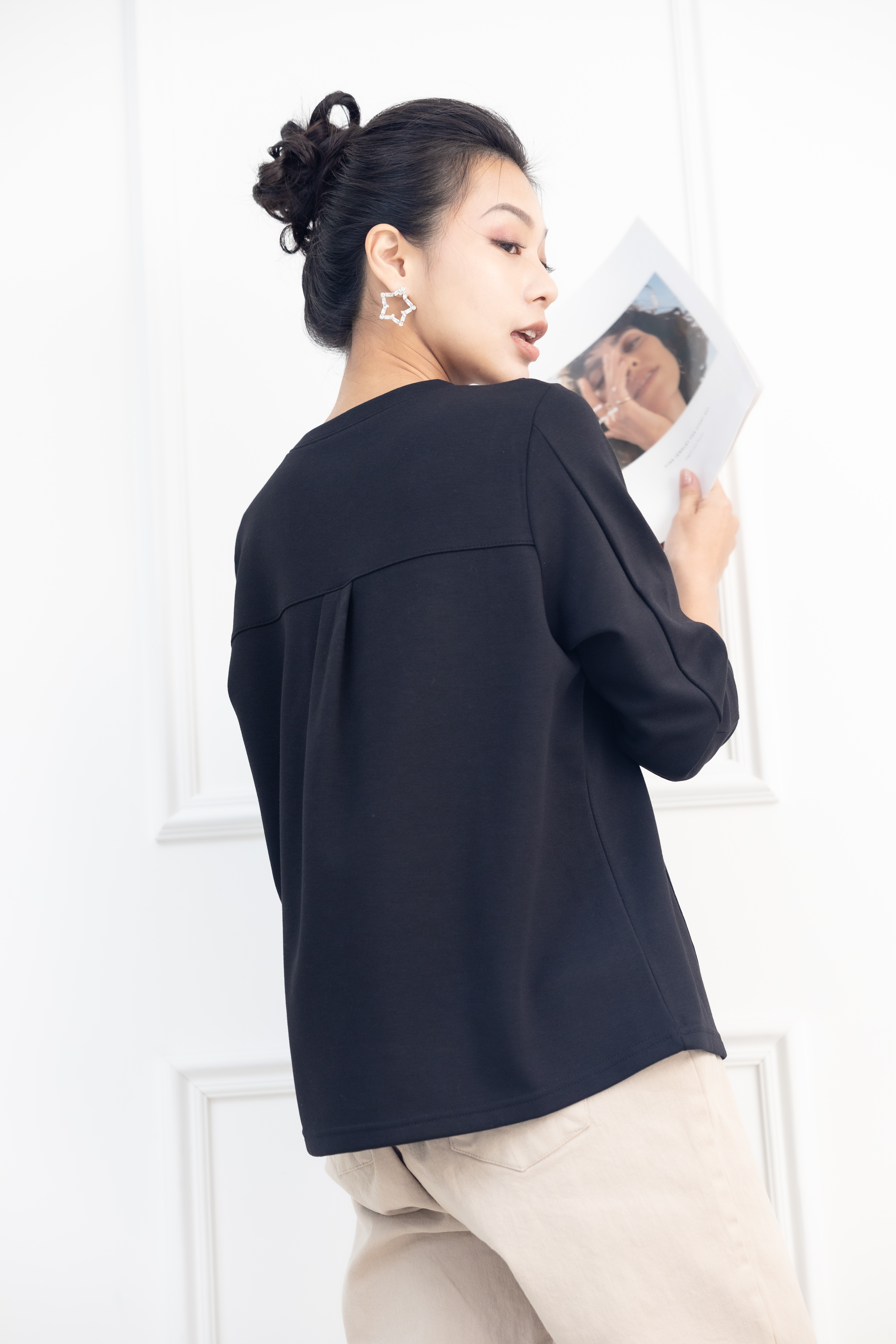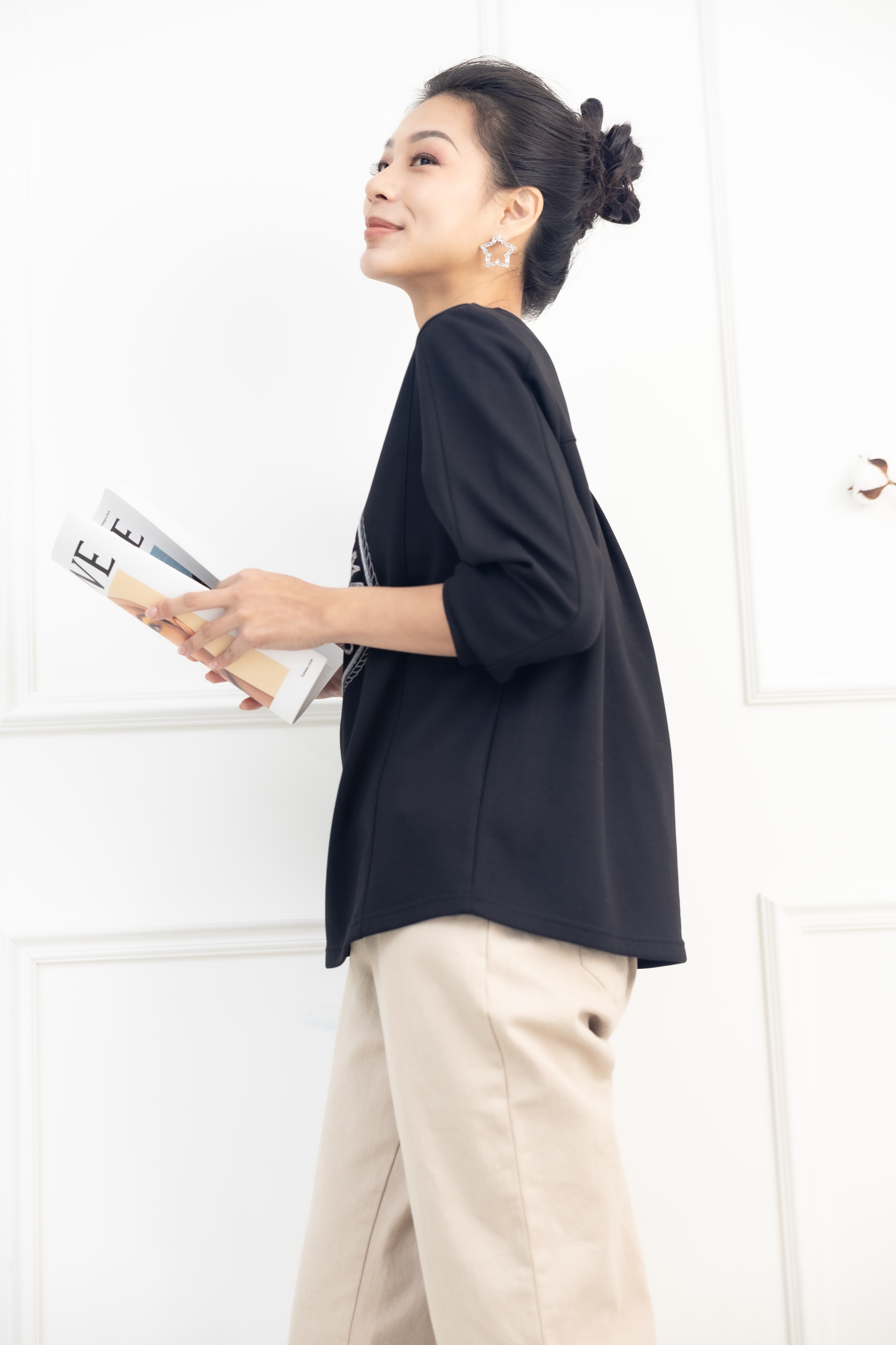 긴팔 毛線圓型圖騰 u領上衣 / 黑色