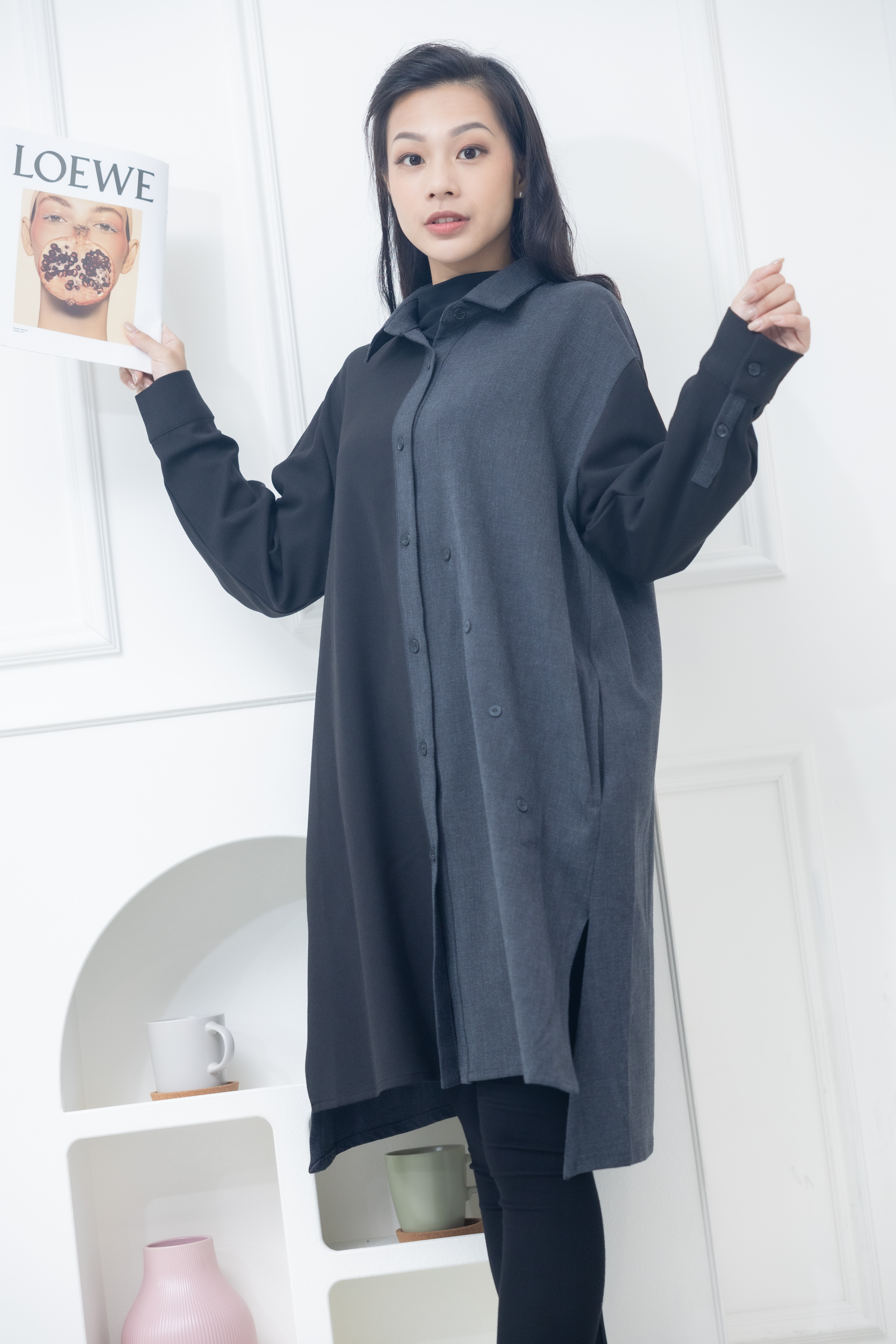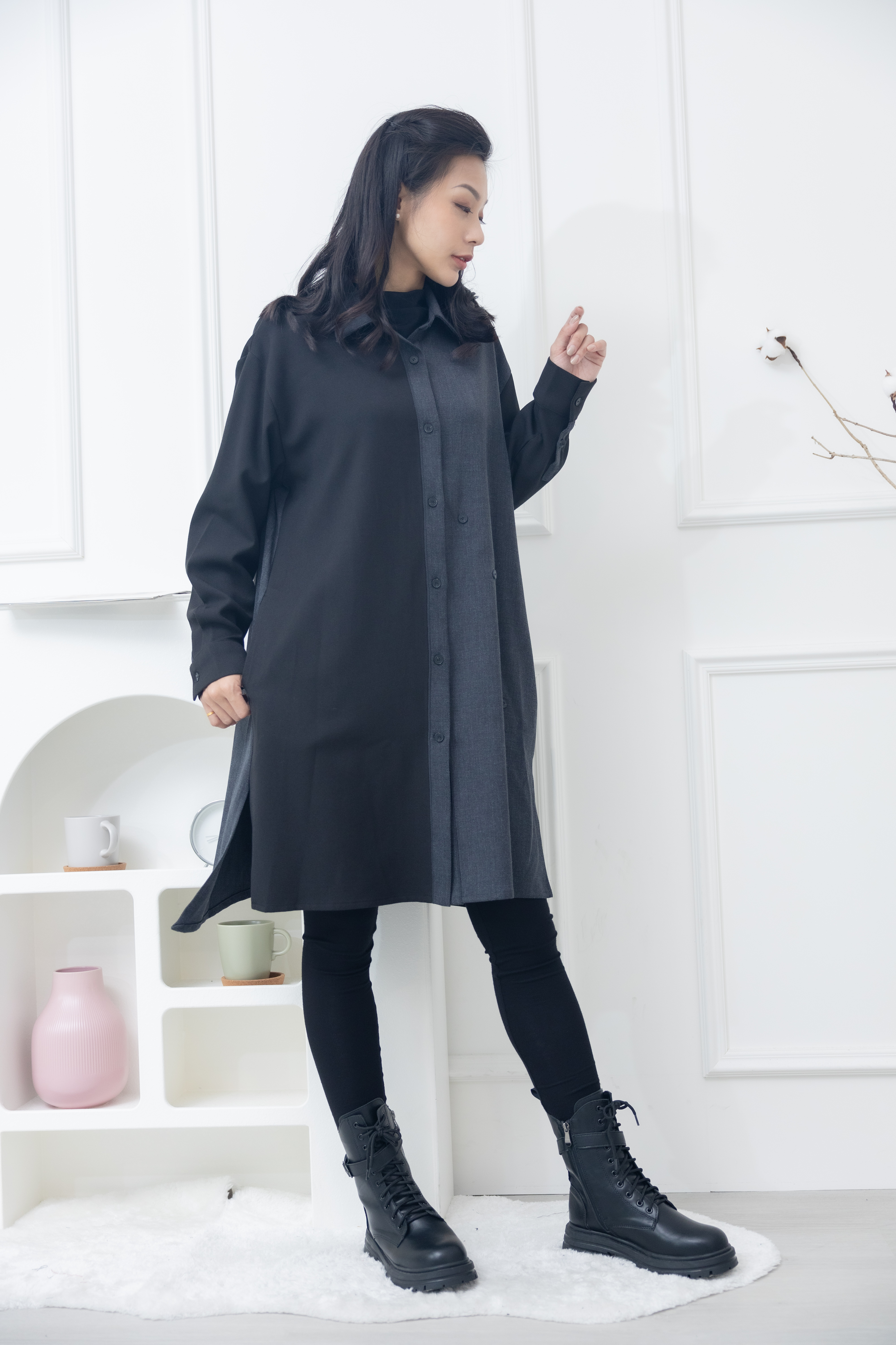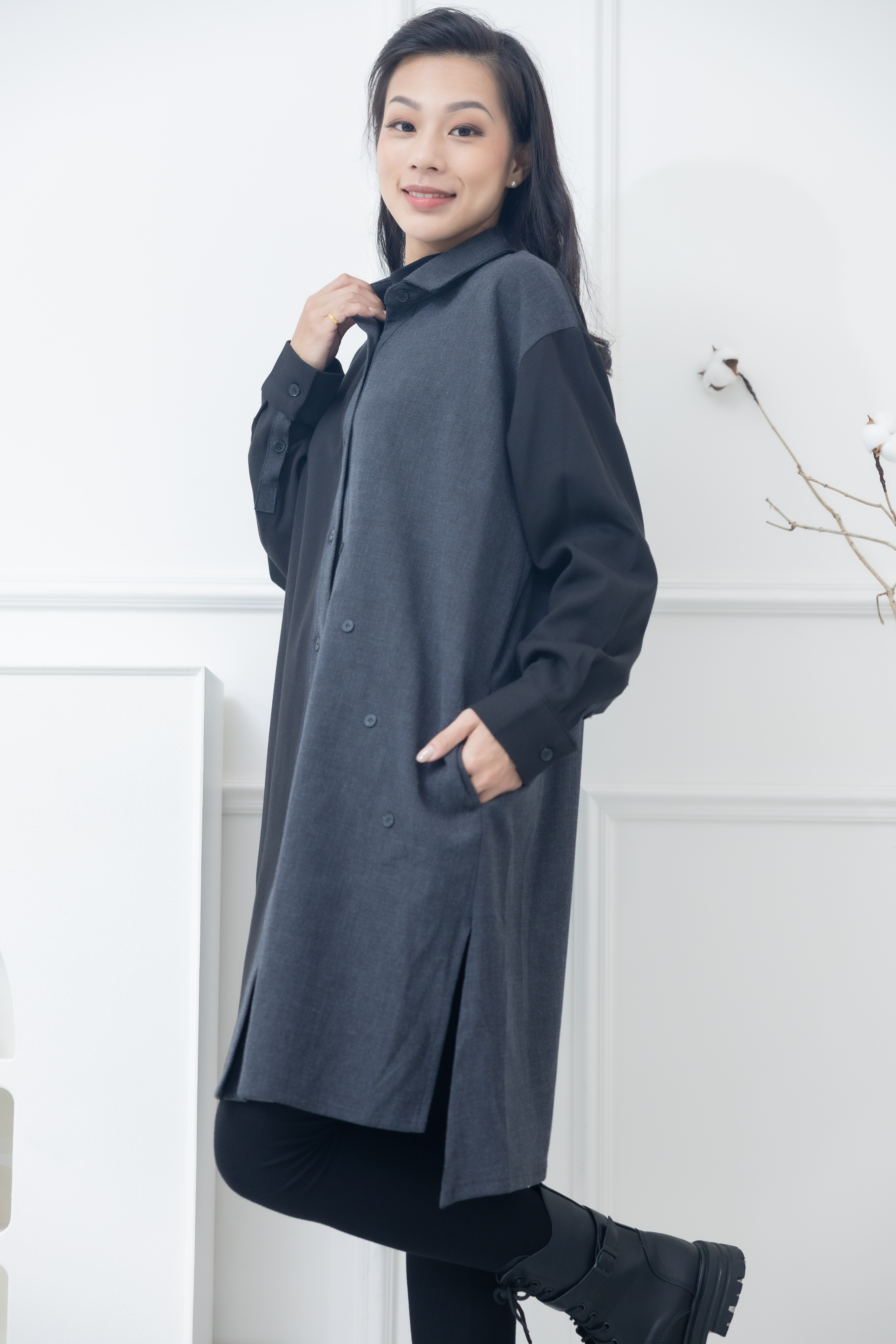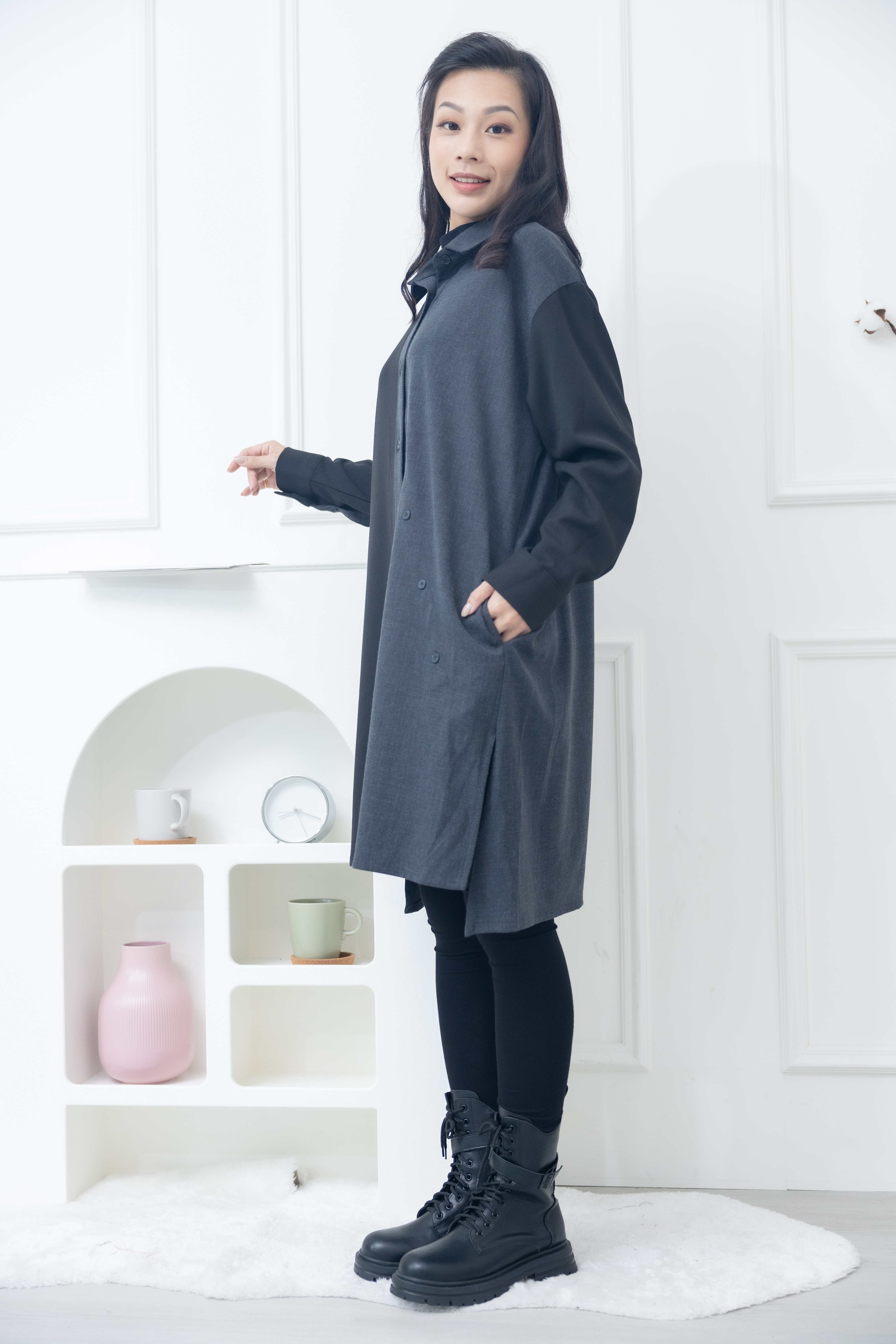긴팔 灰拼黑立領長版上衣