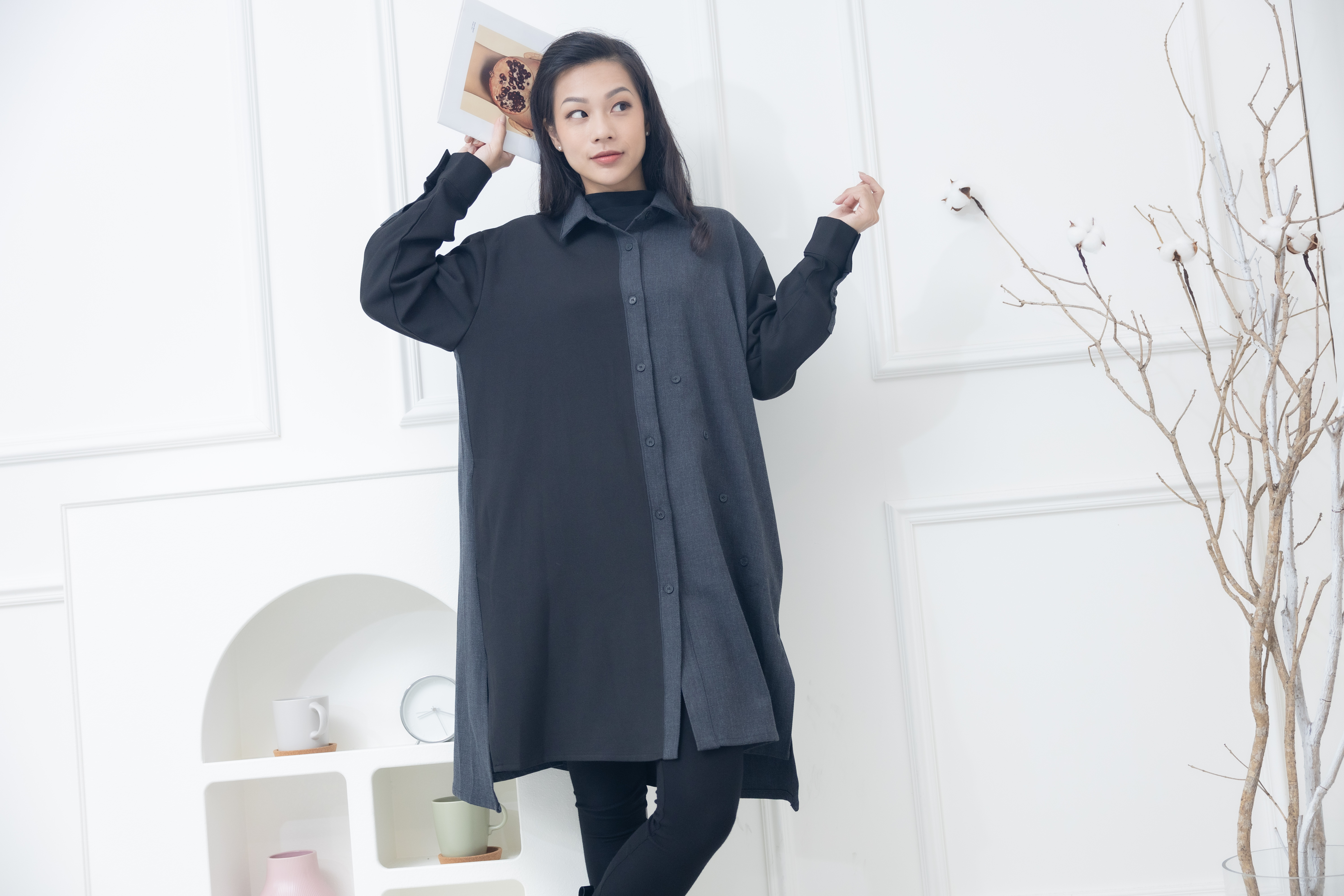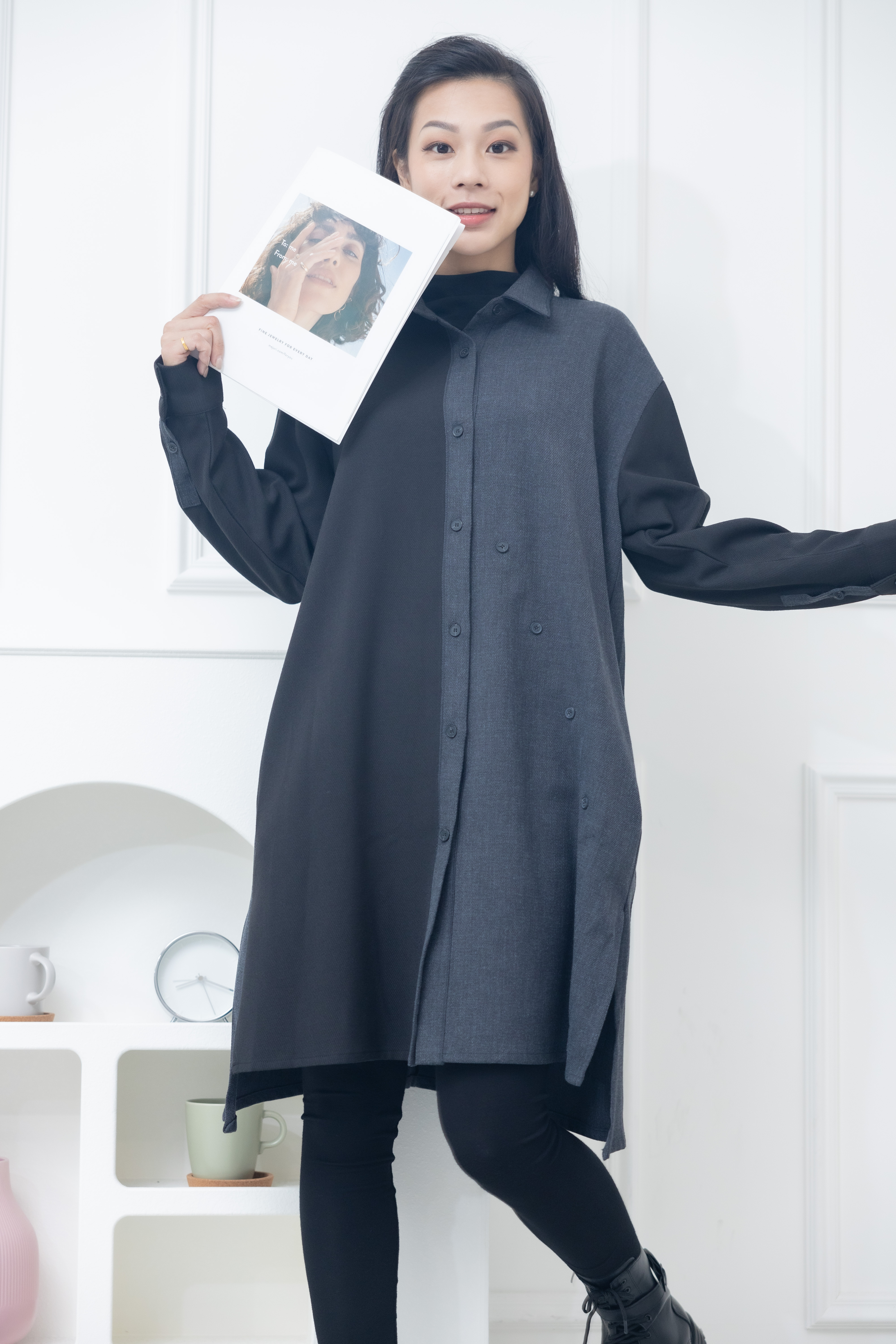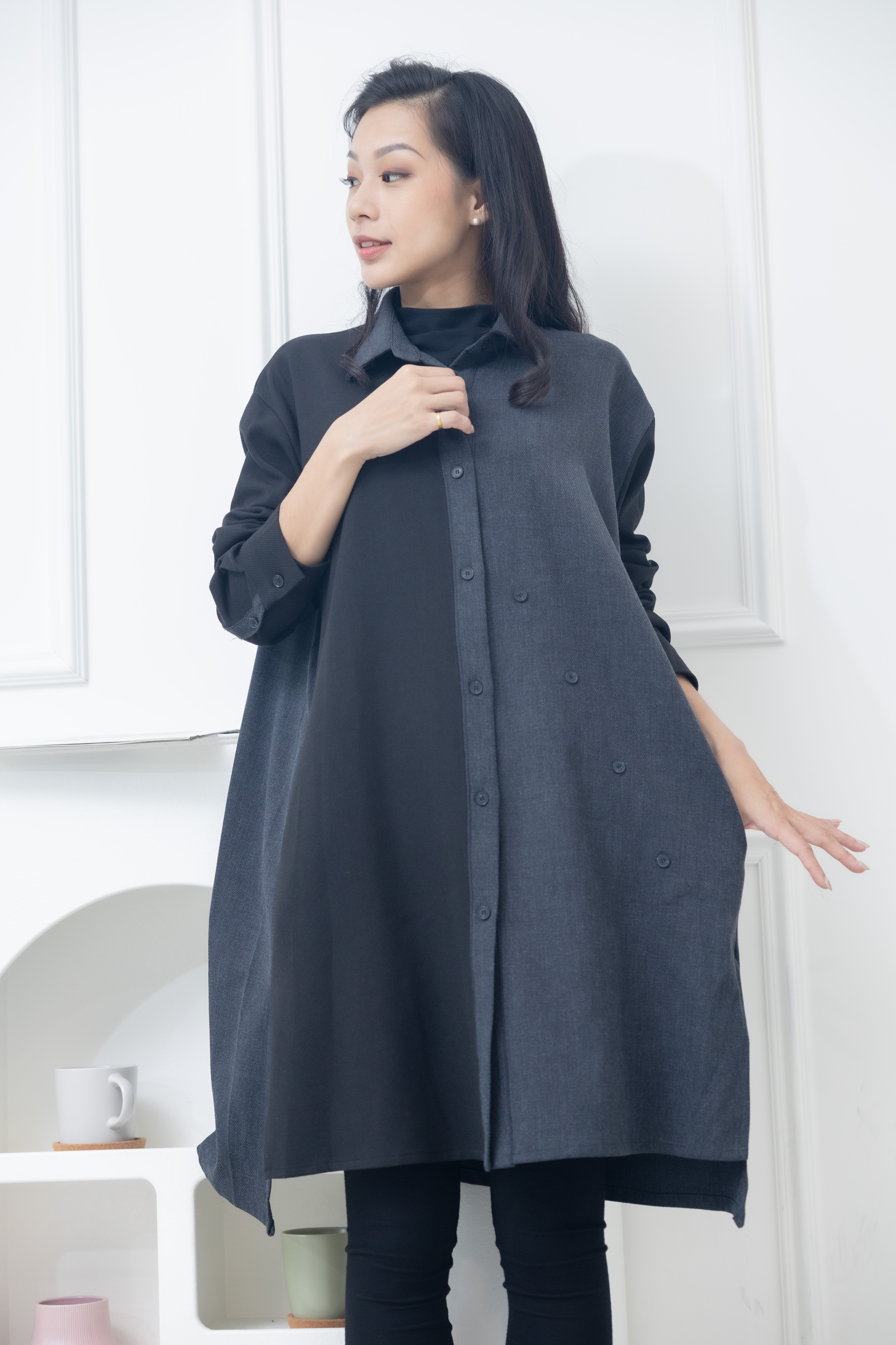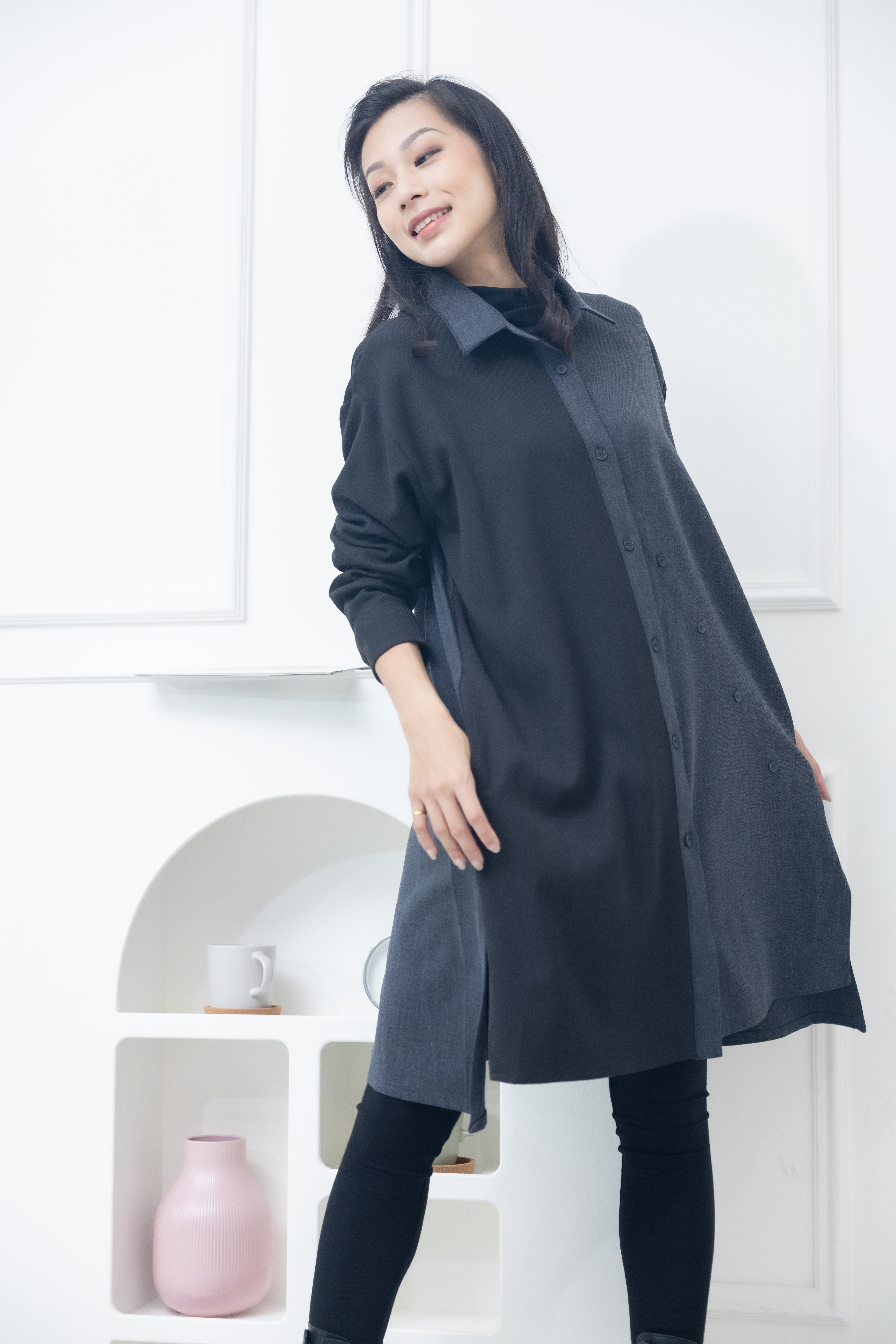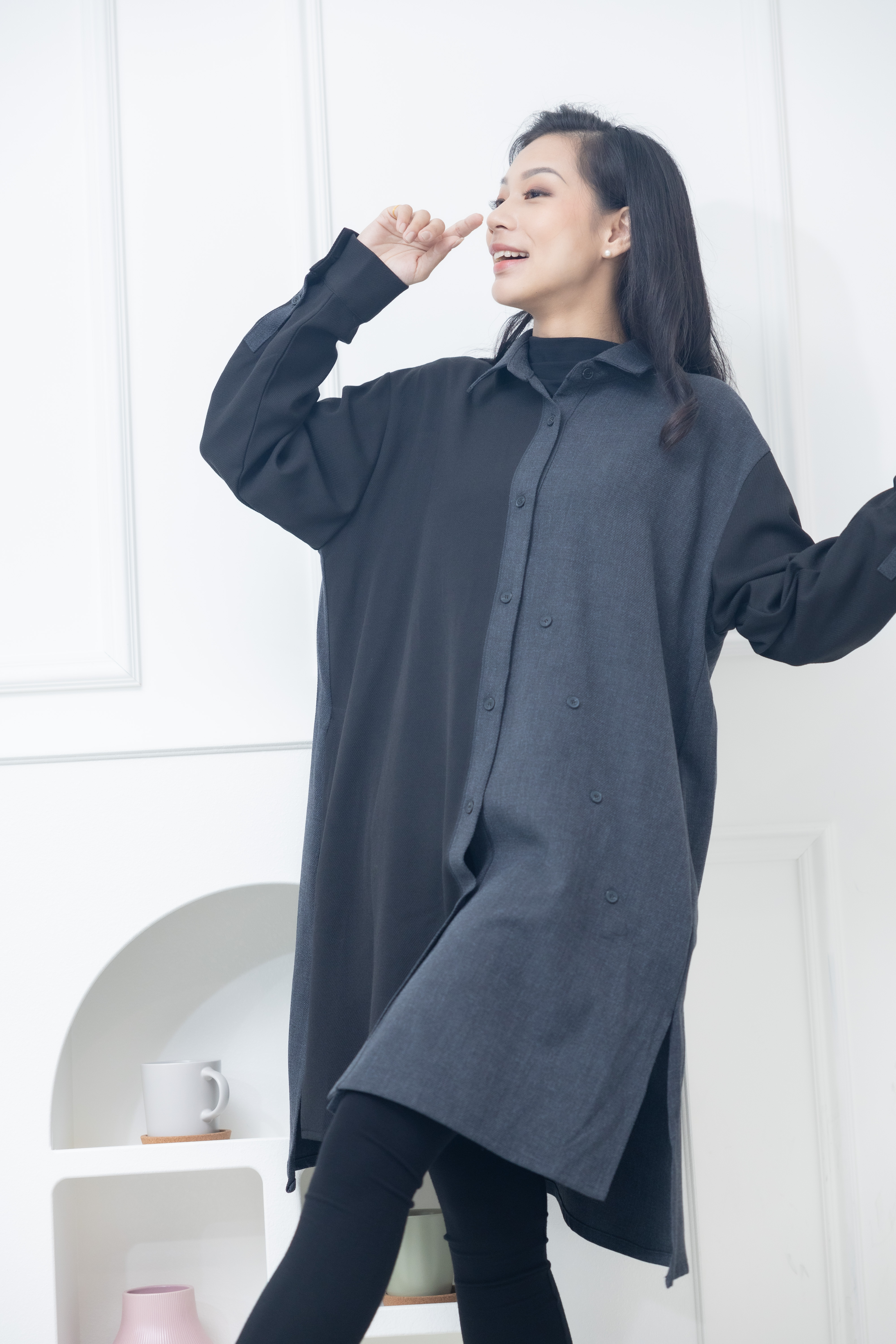 긴팔 灰拼黑立領長版上衣