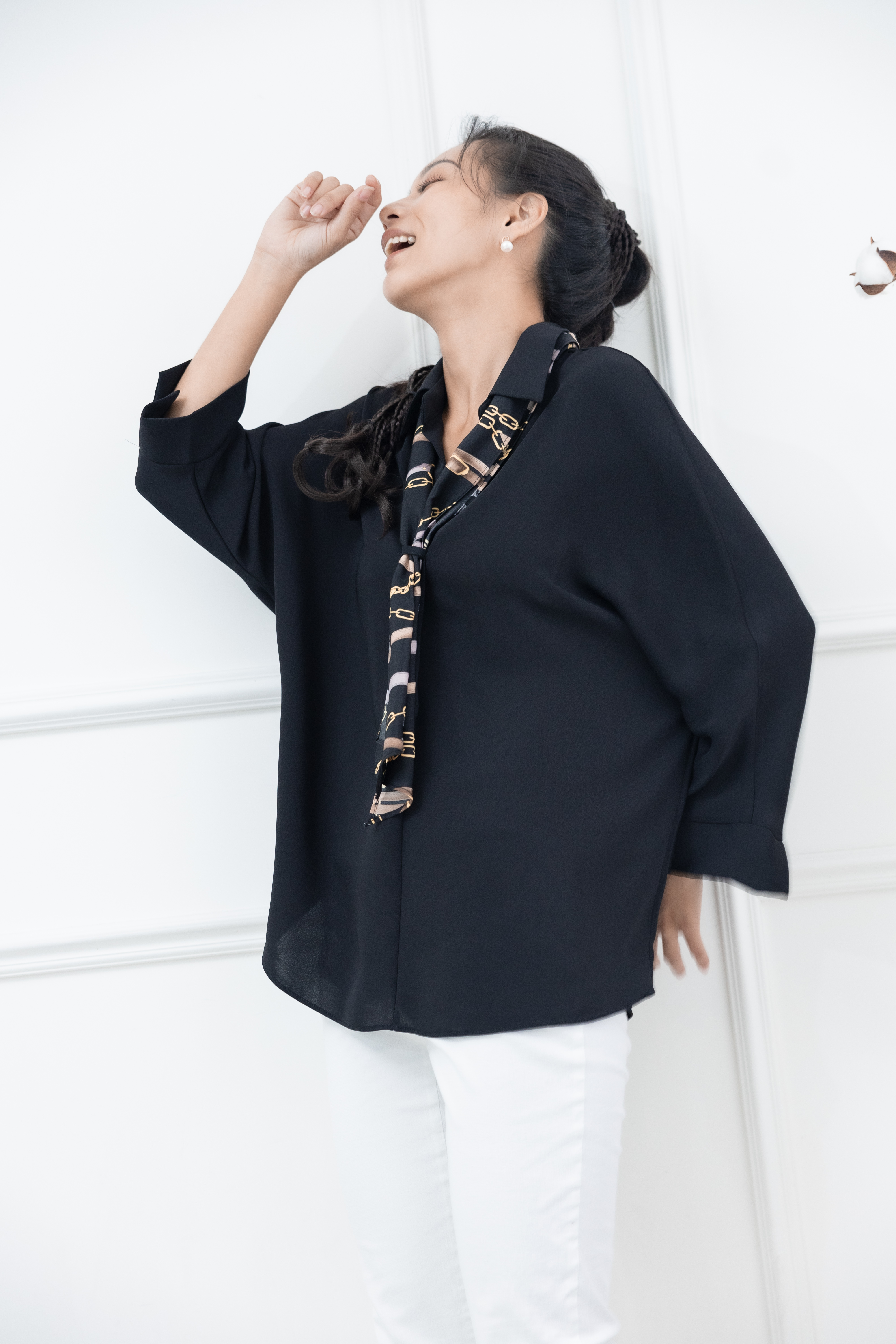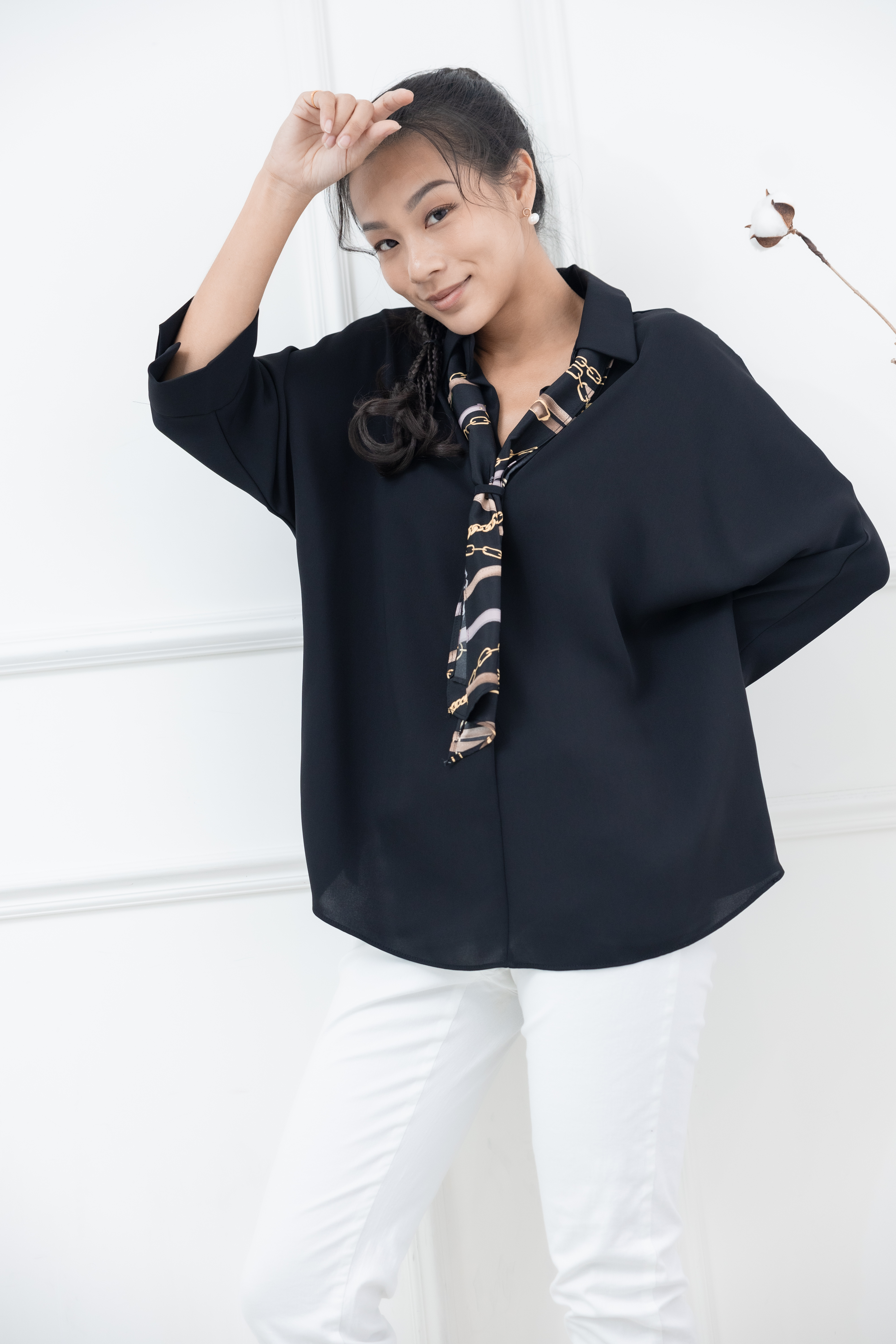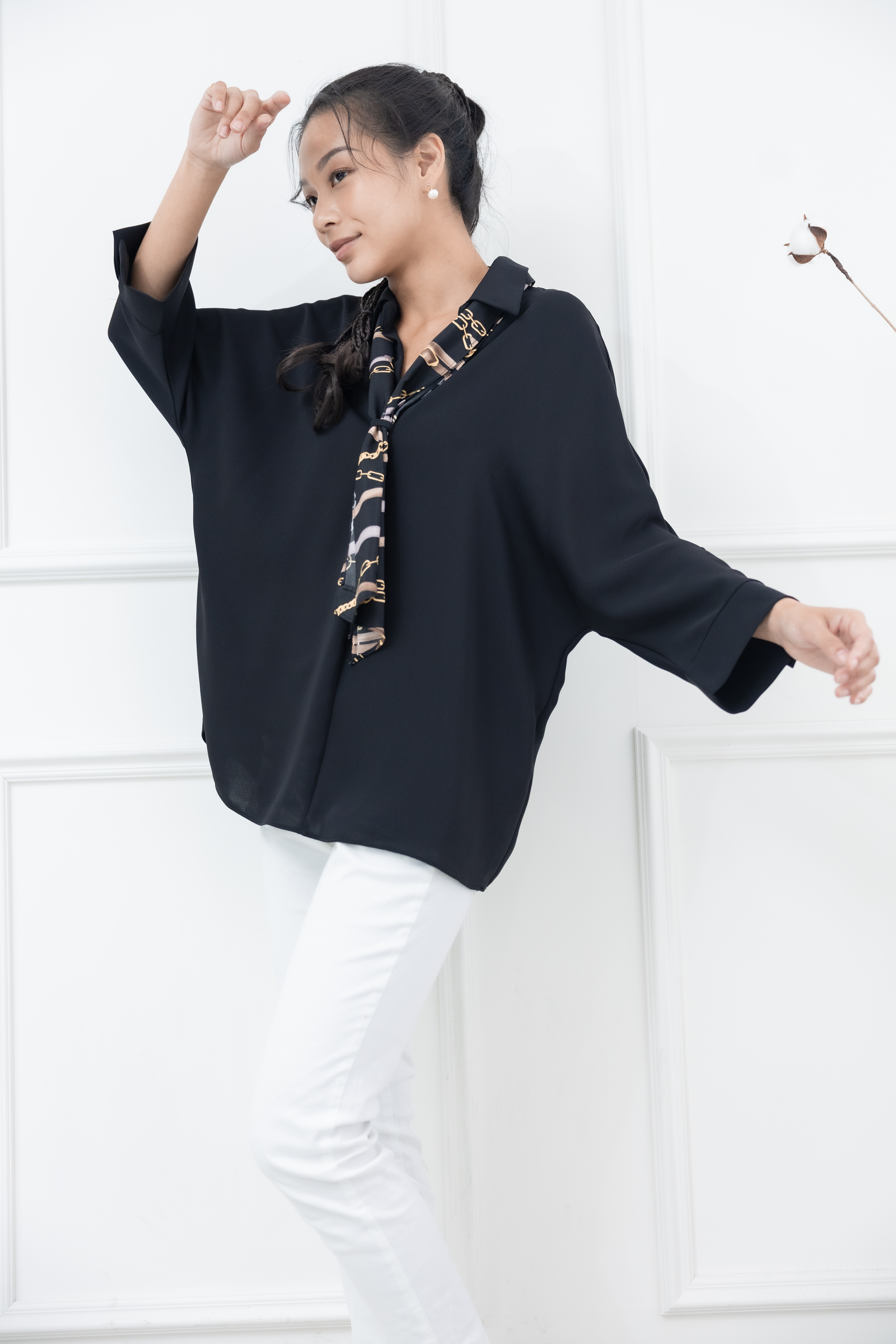 긴팔 立領落肩七分袖上衣(附領巾 ) / 黑色