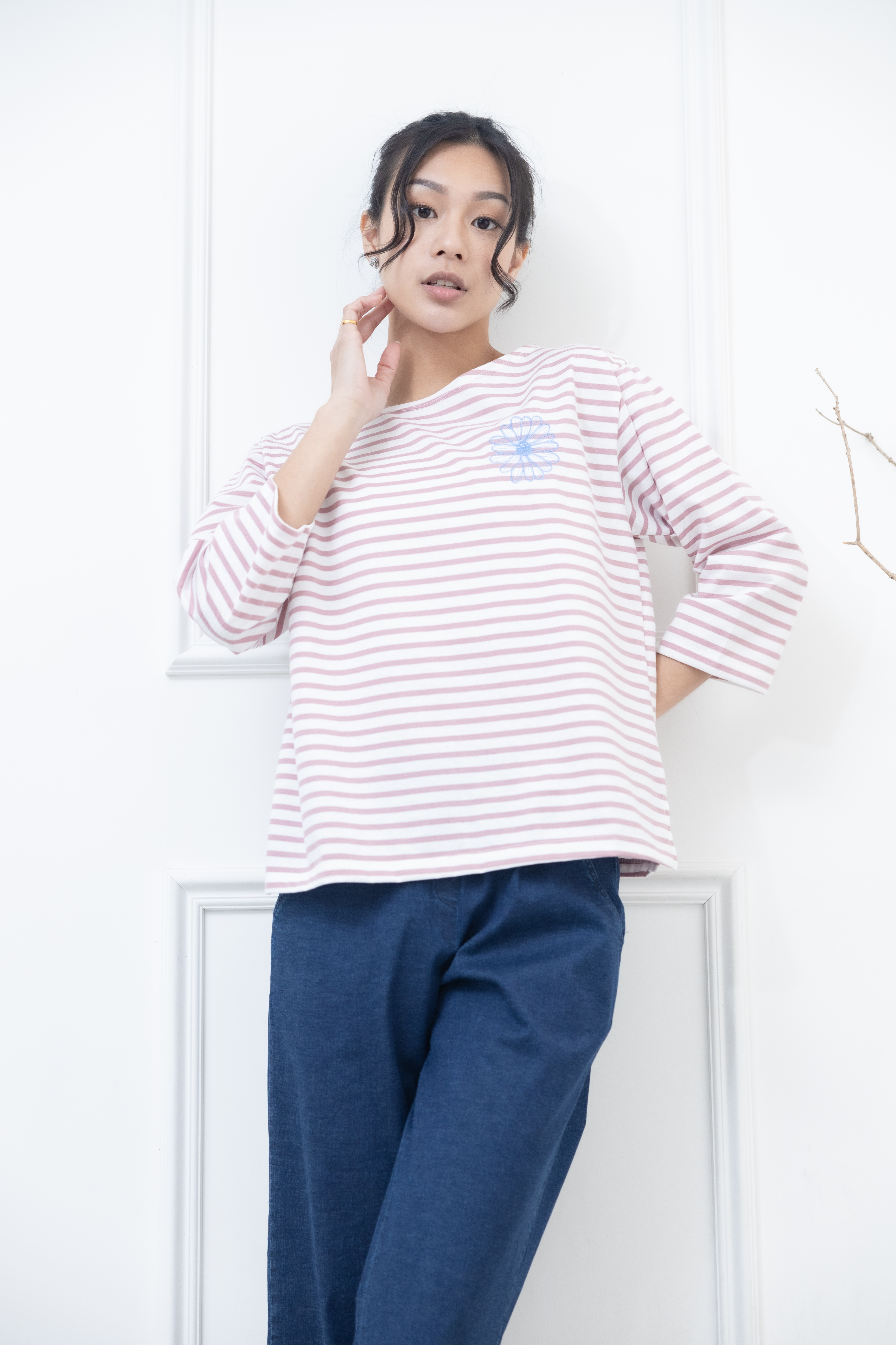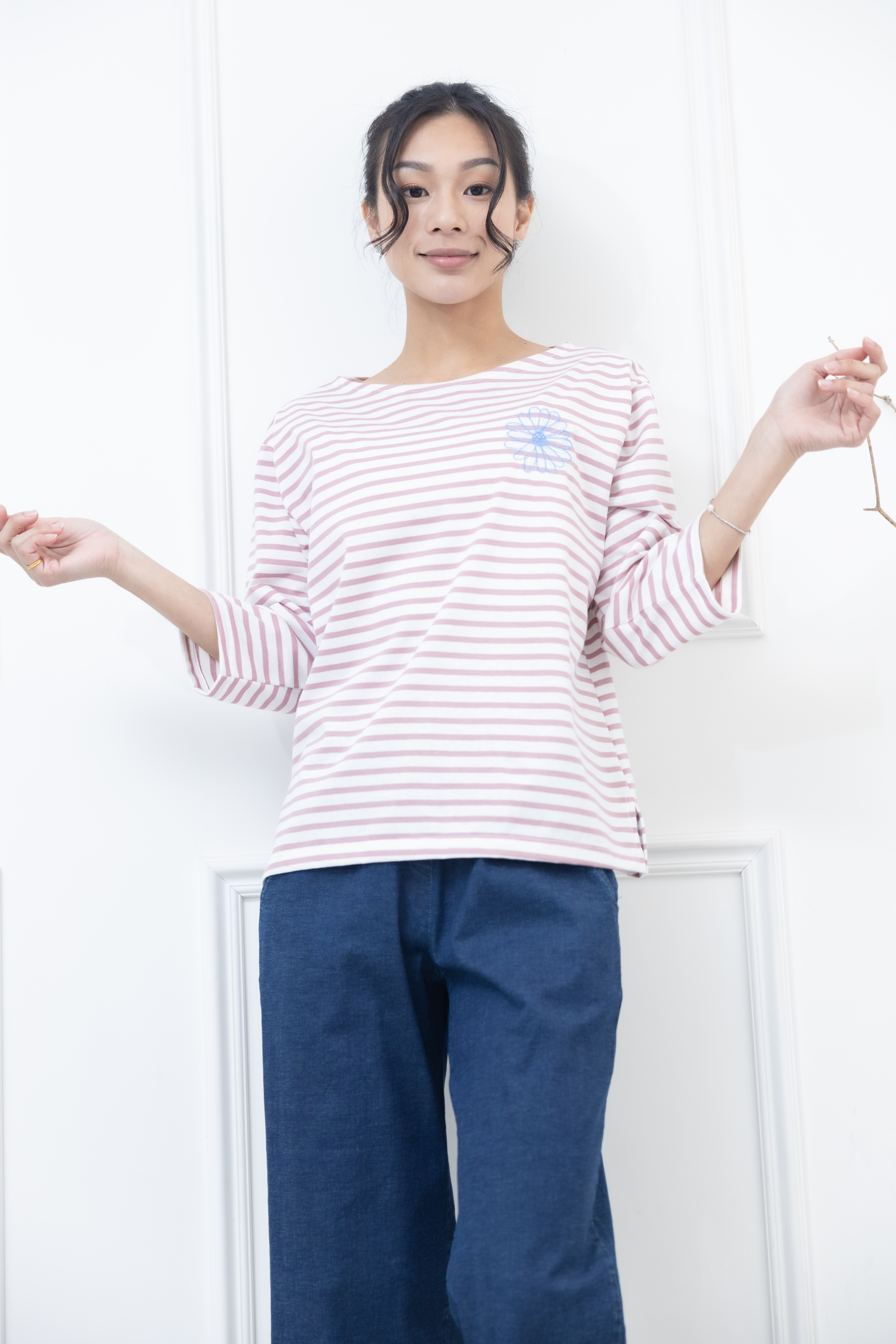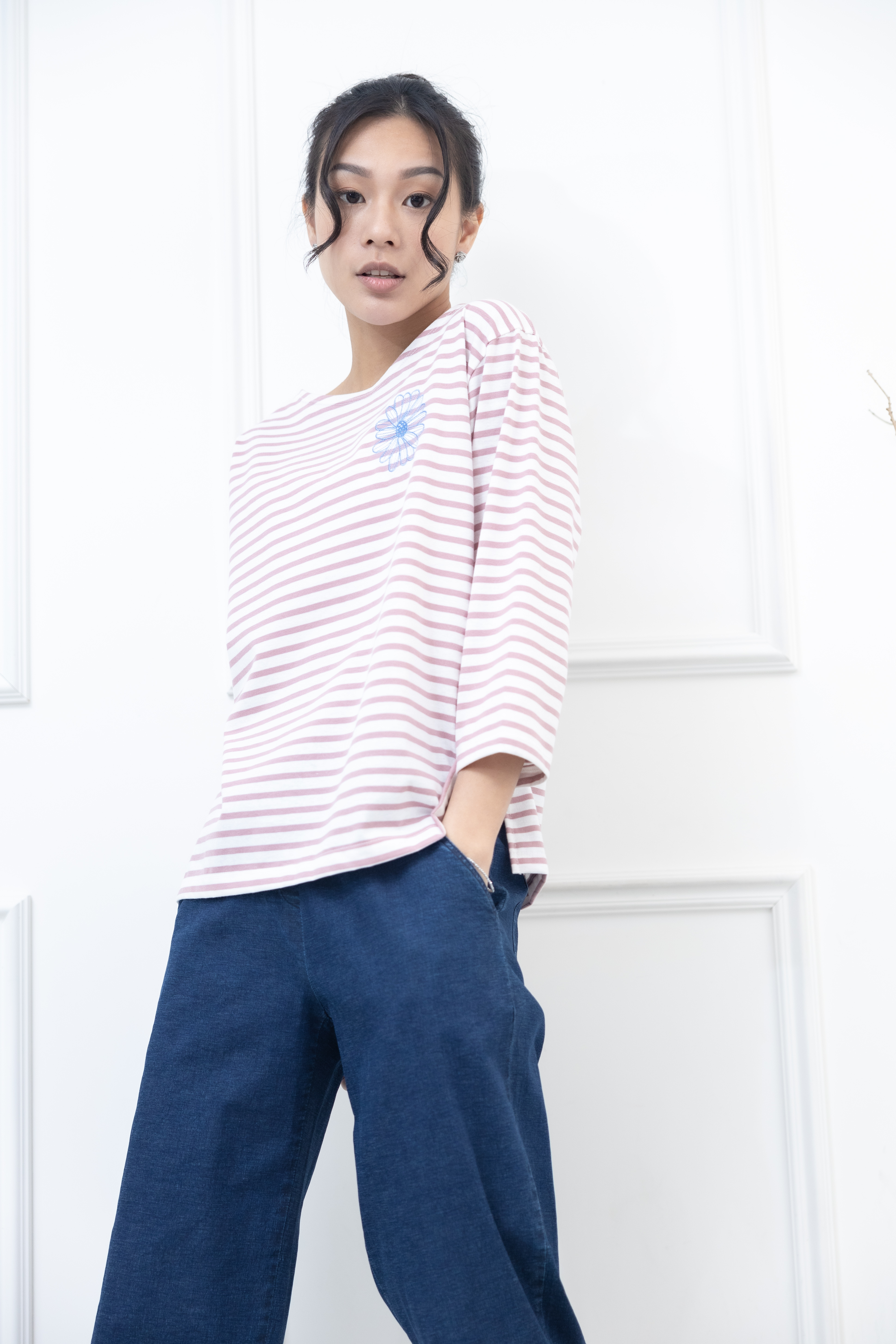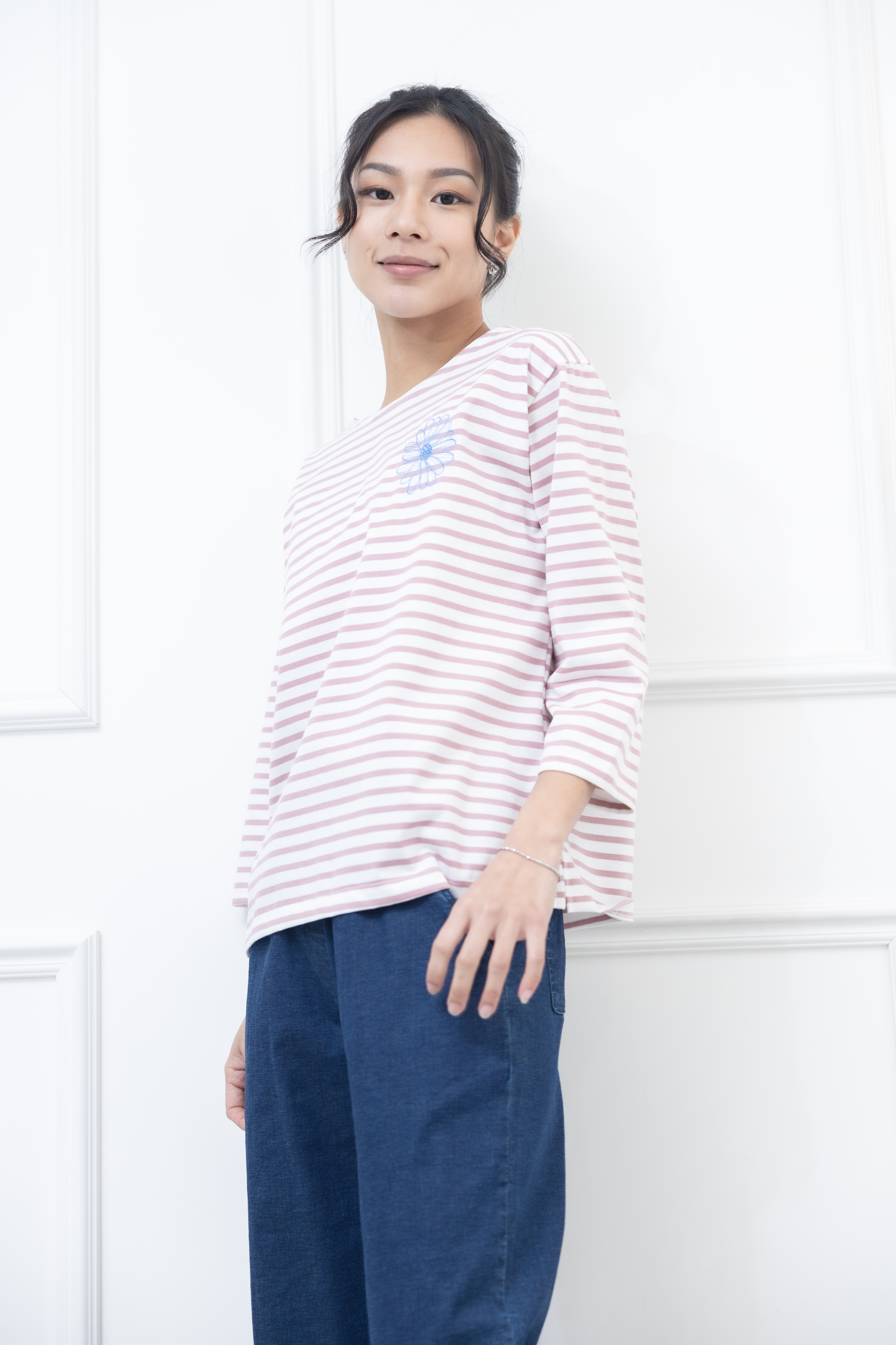 긴팔 粉紅色條紋電繡藍菊花上衣 / 白底