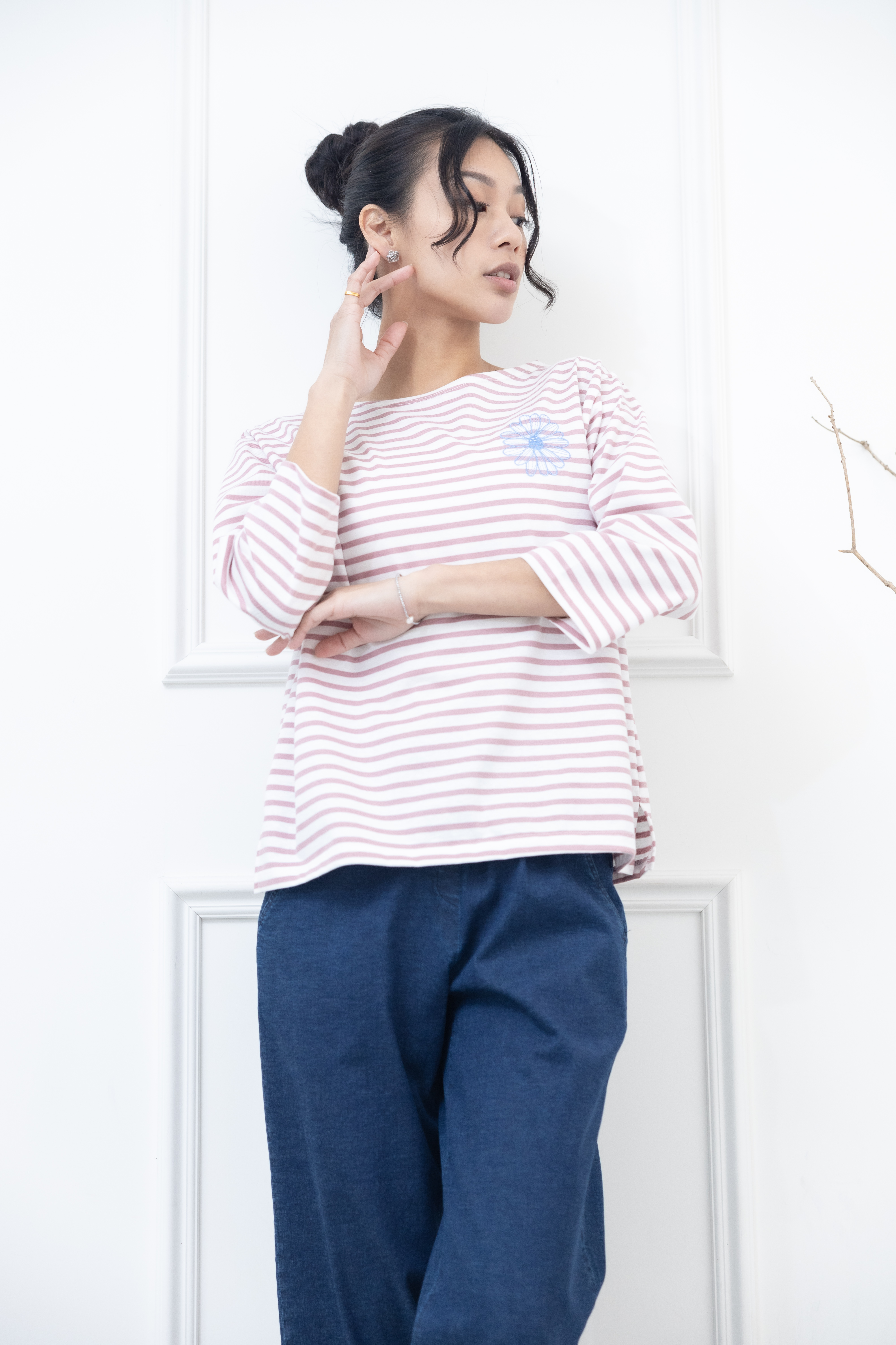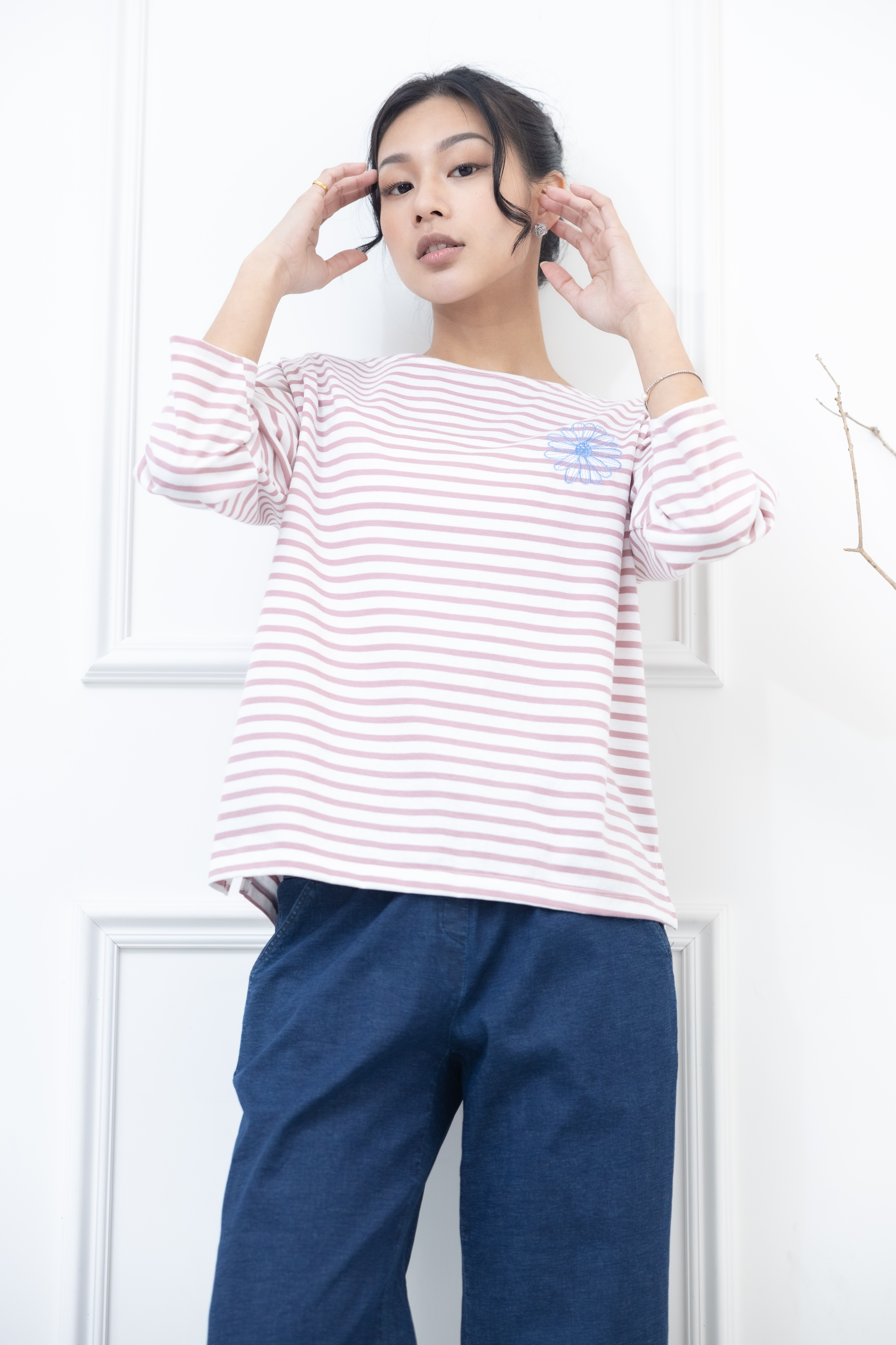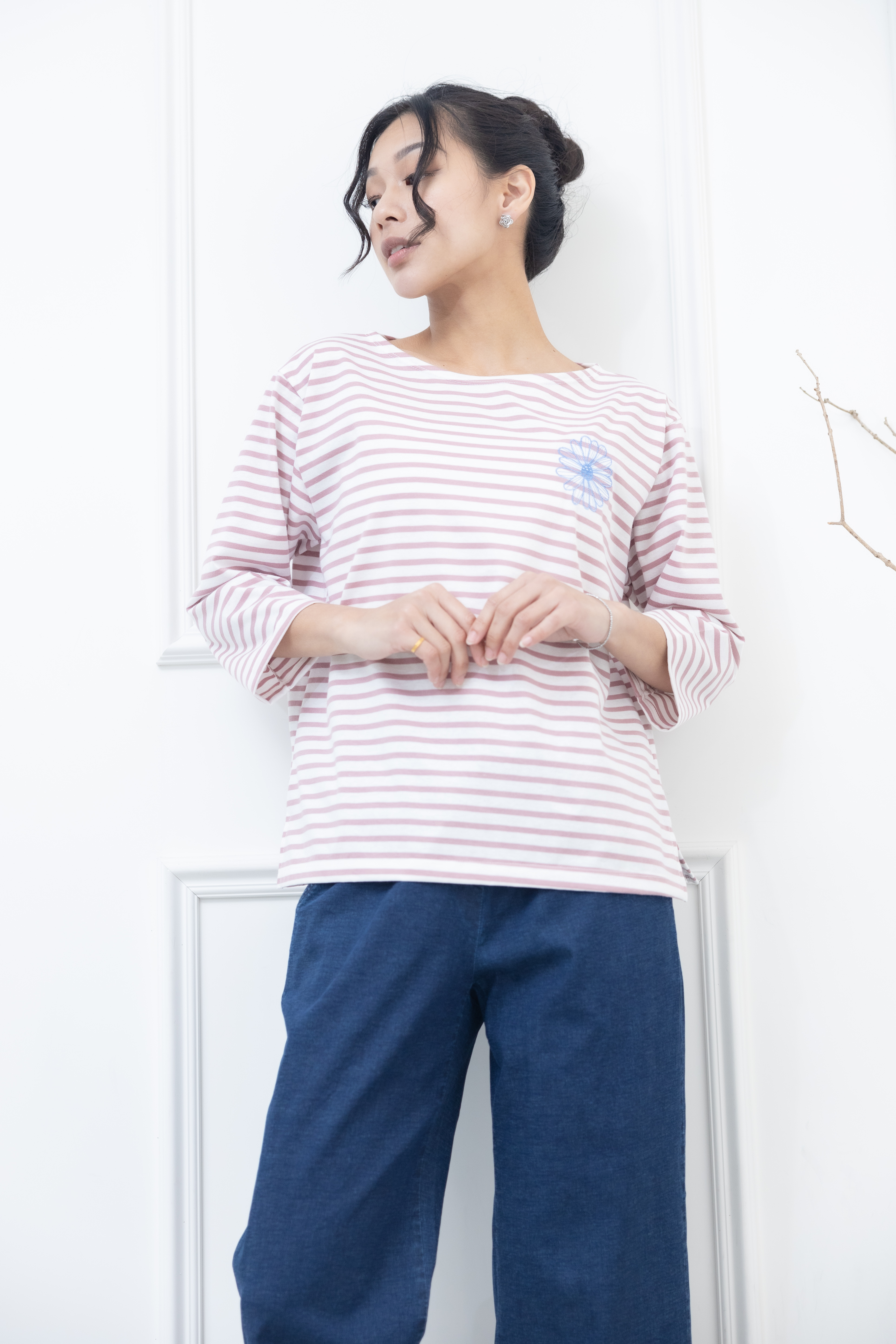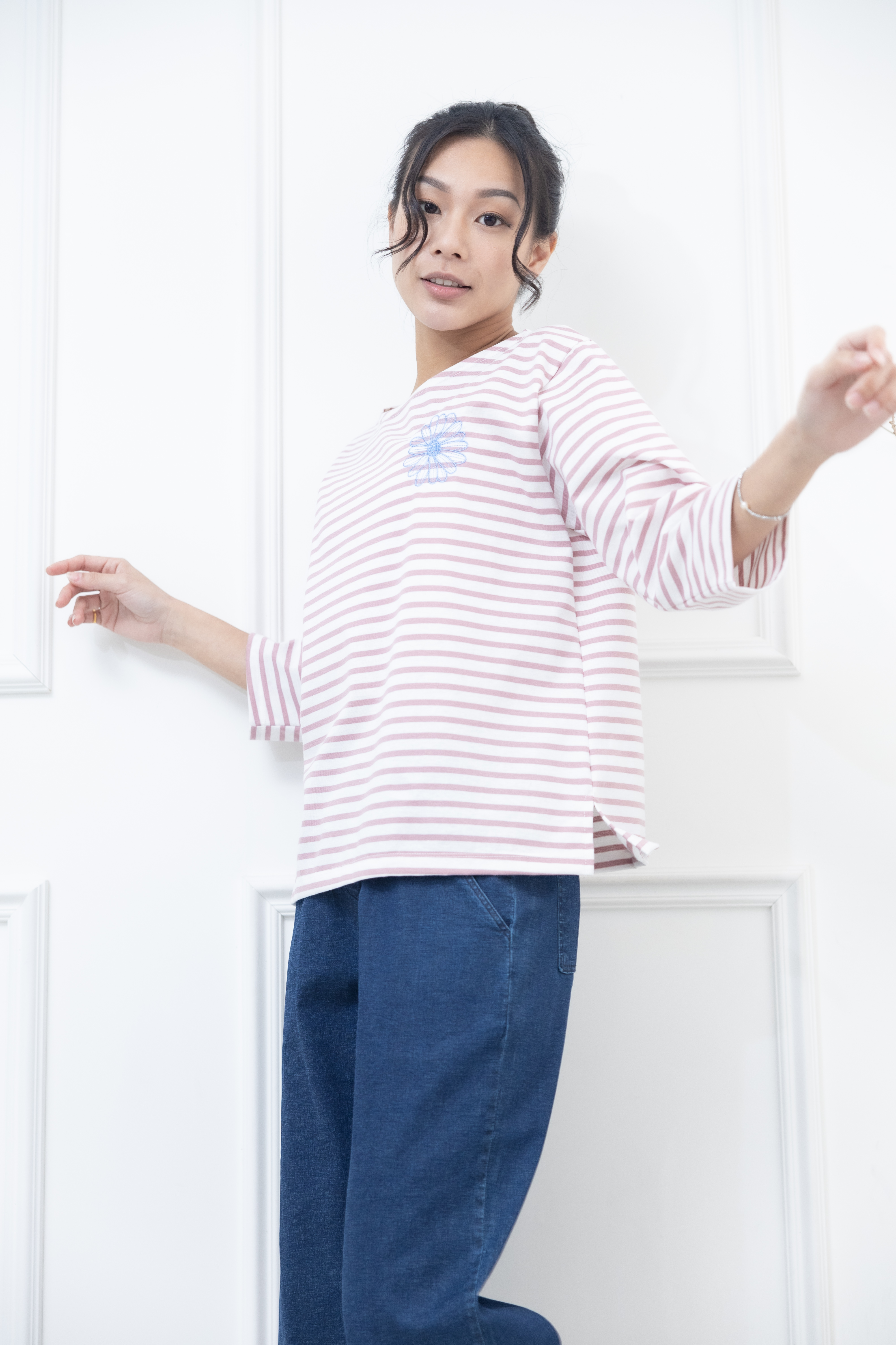 긴팔 粉紅色條紋電繡藍菊花上衣 / 白底