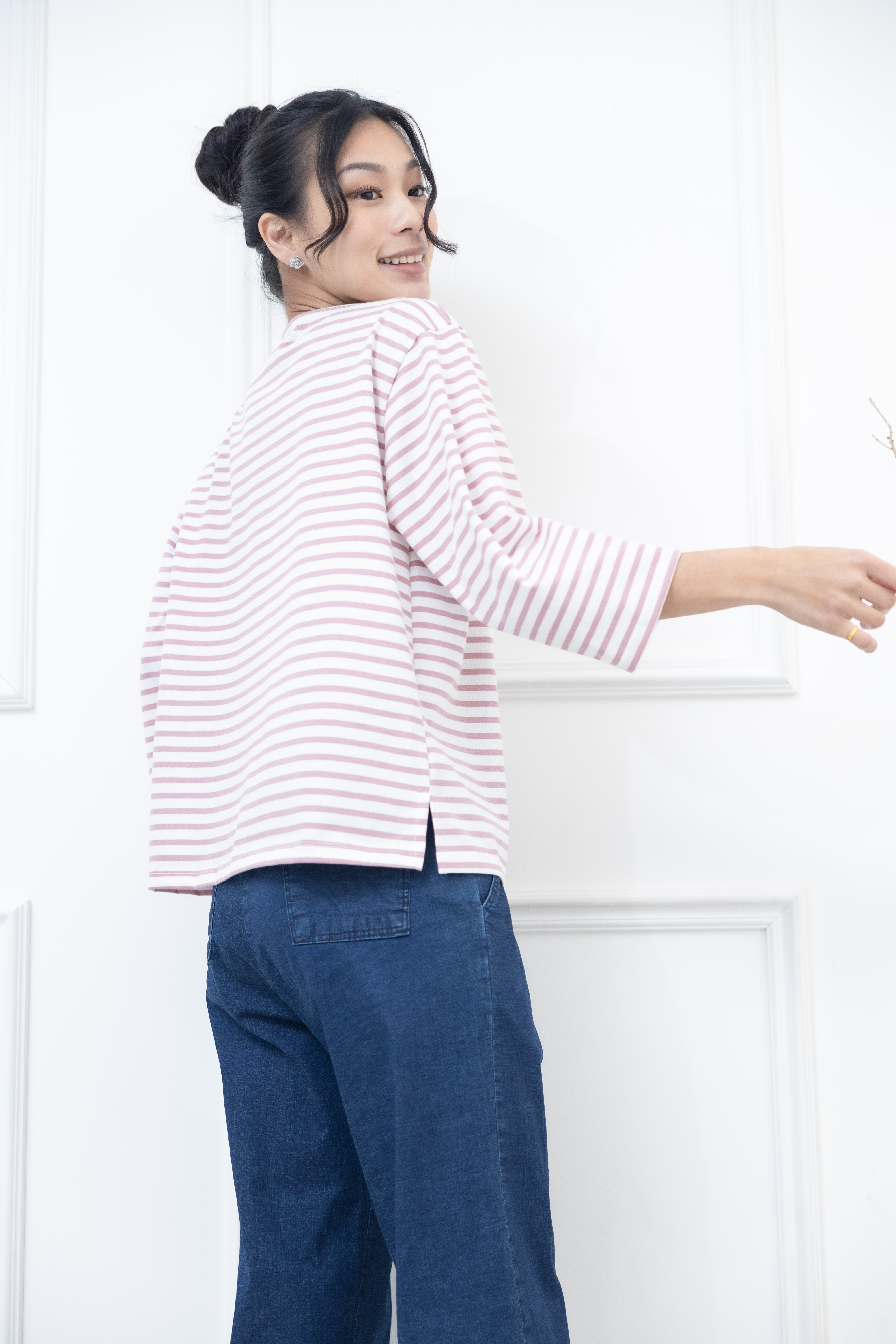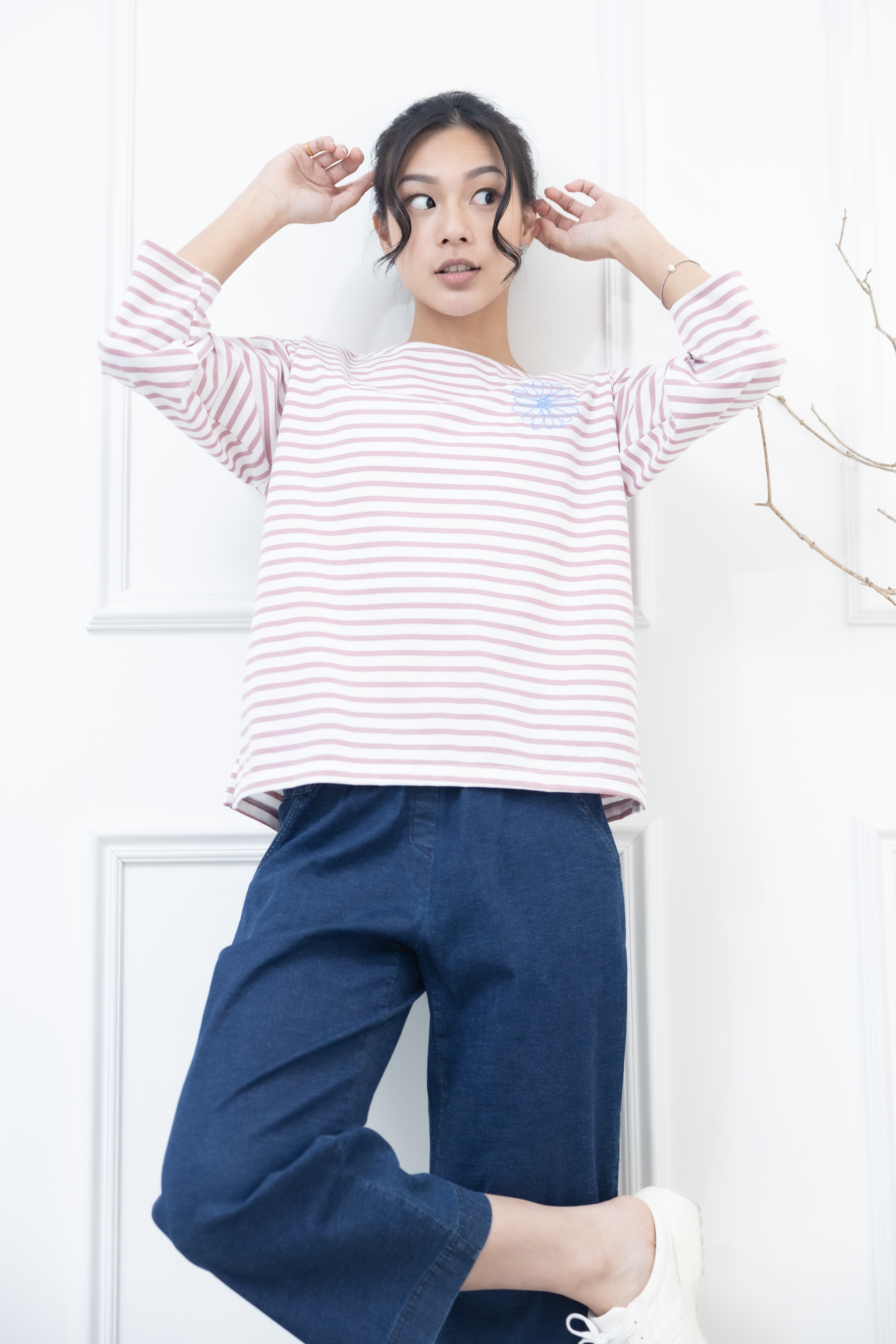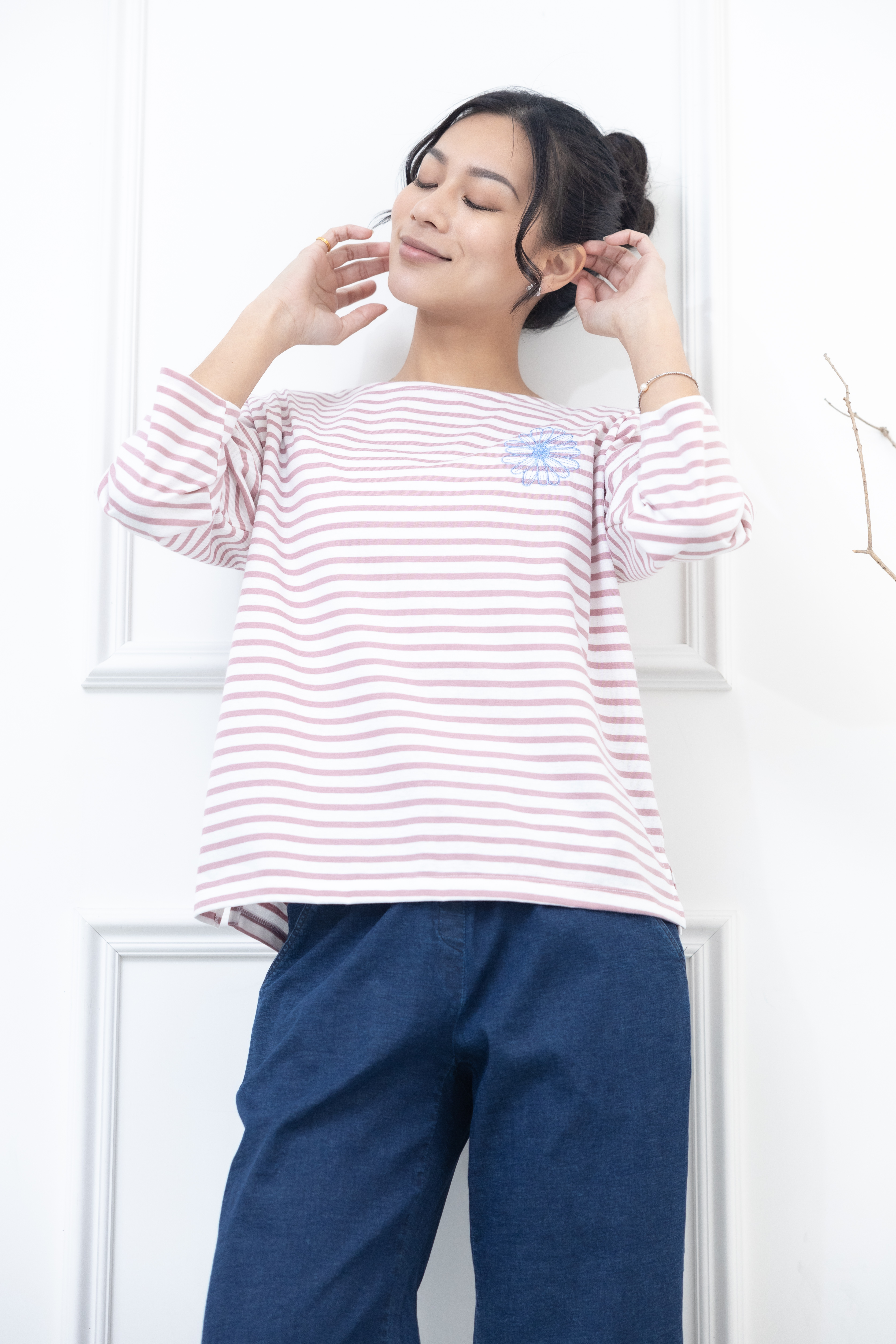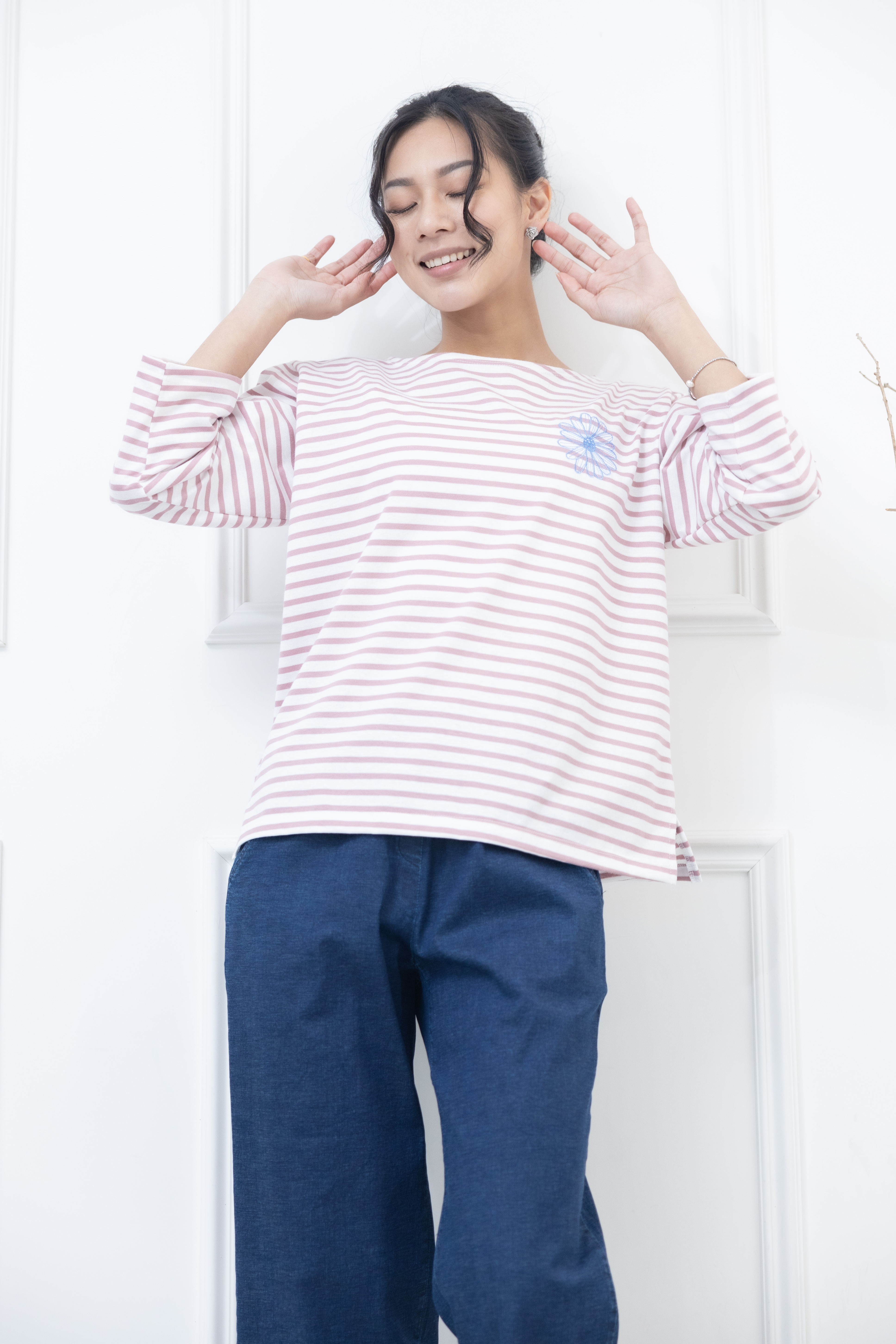 긴팔 粉紅色條紋電繡藍菊花上衣 / 白底