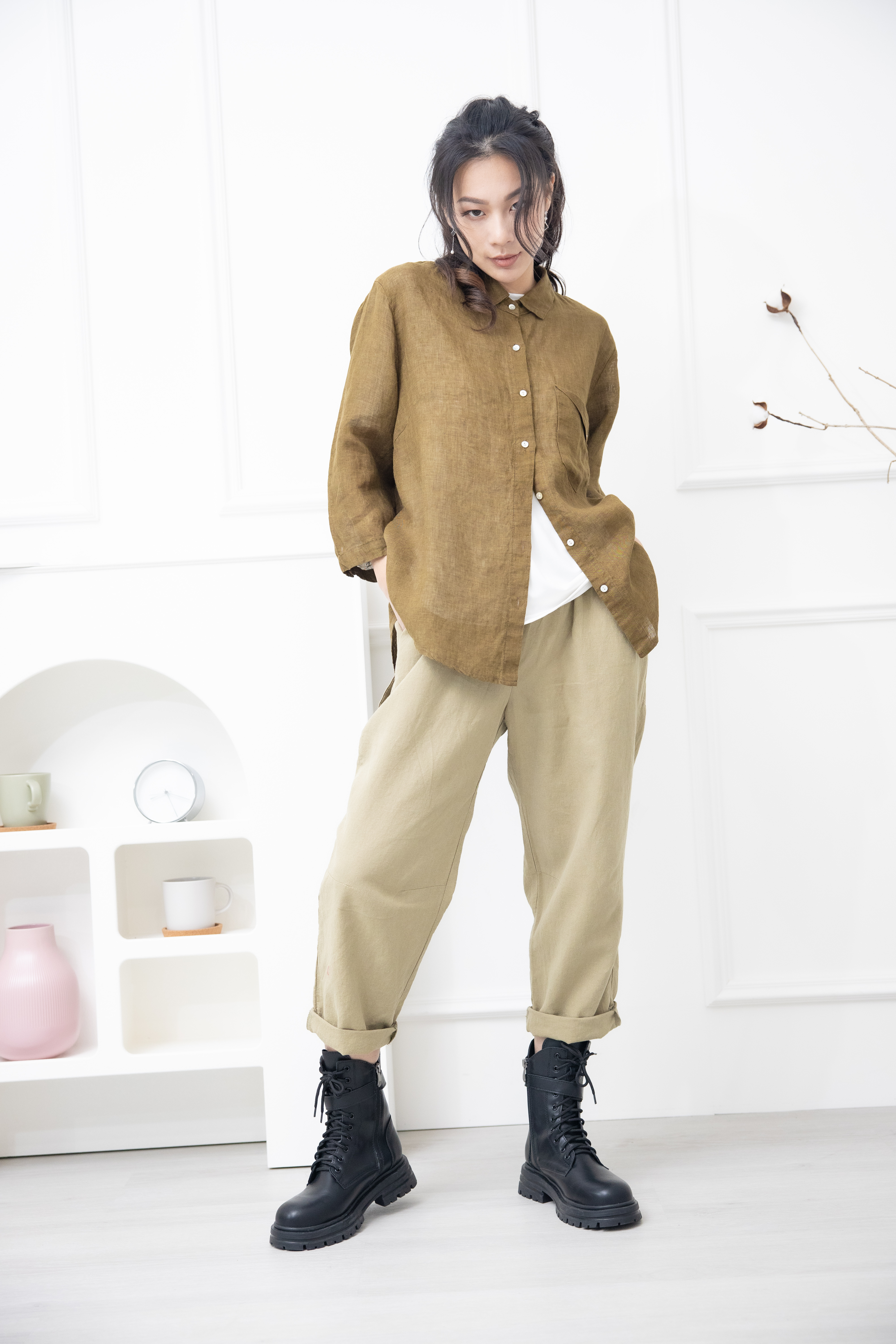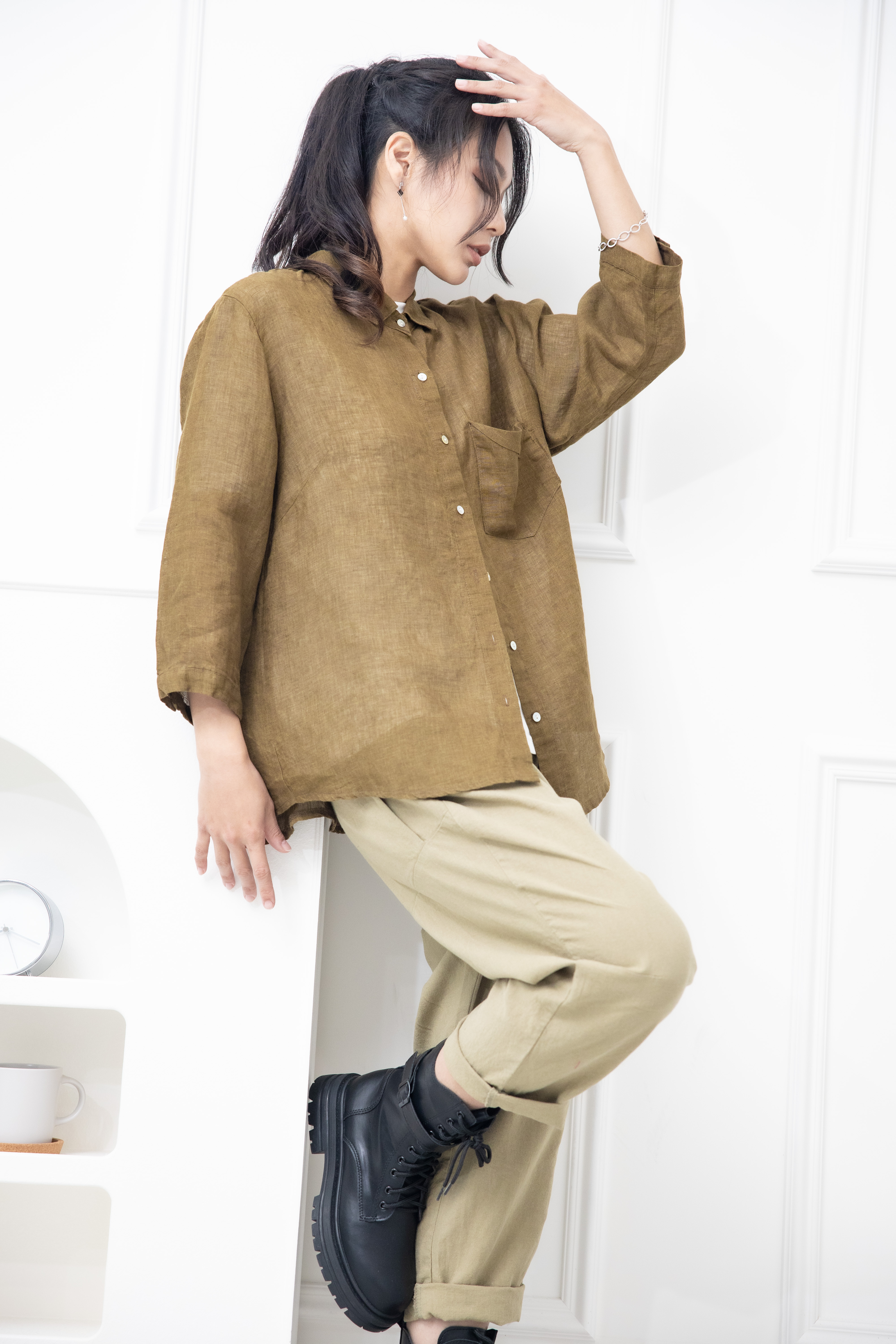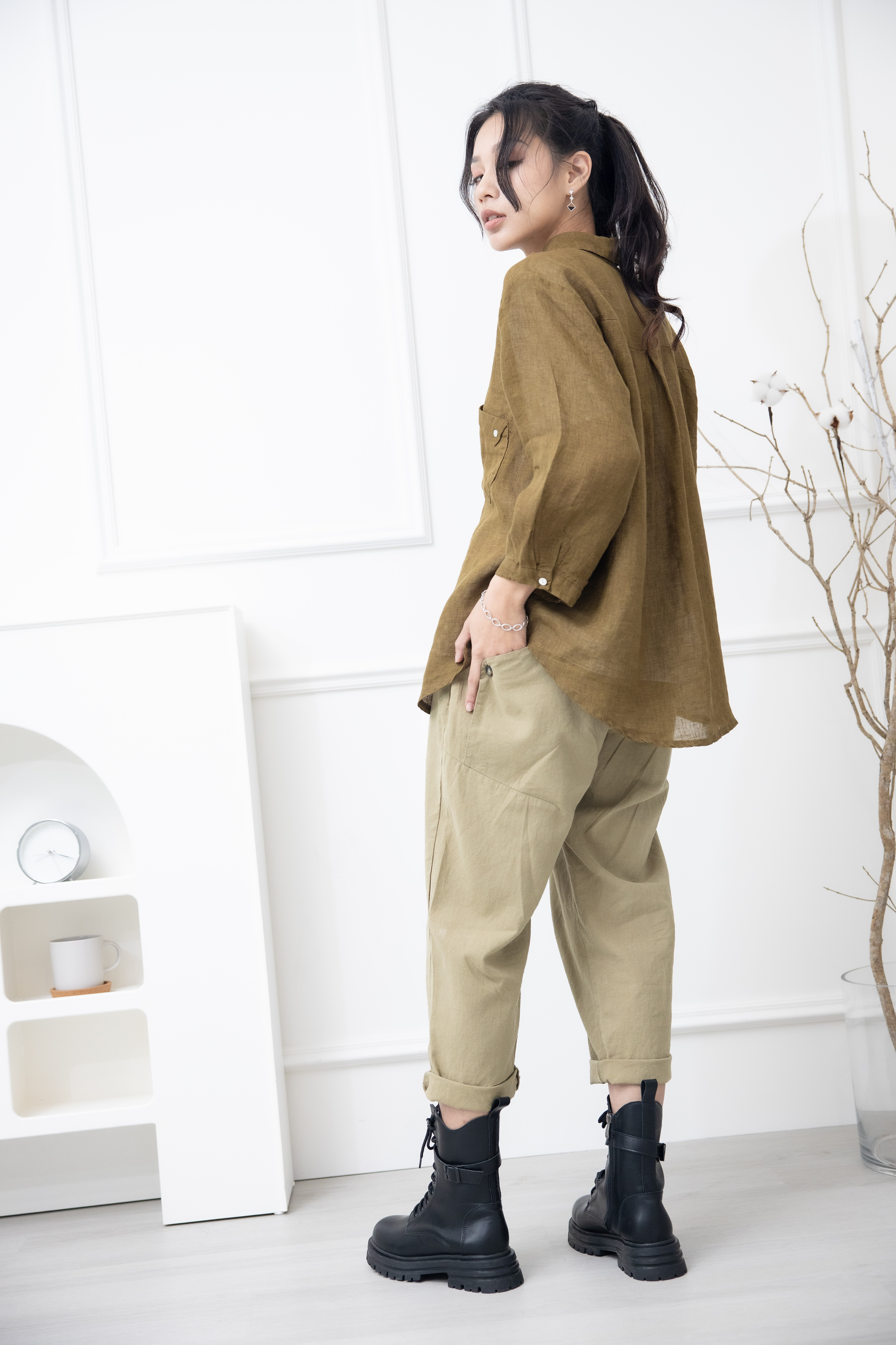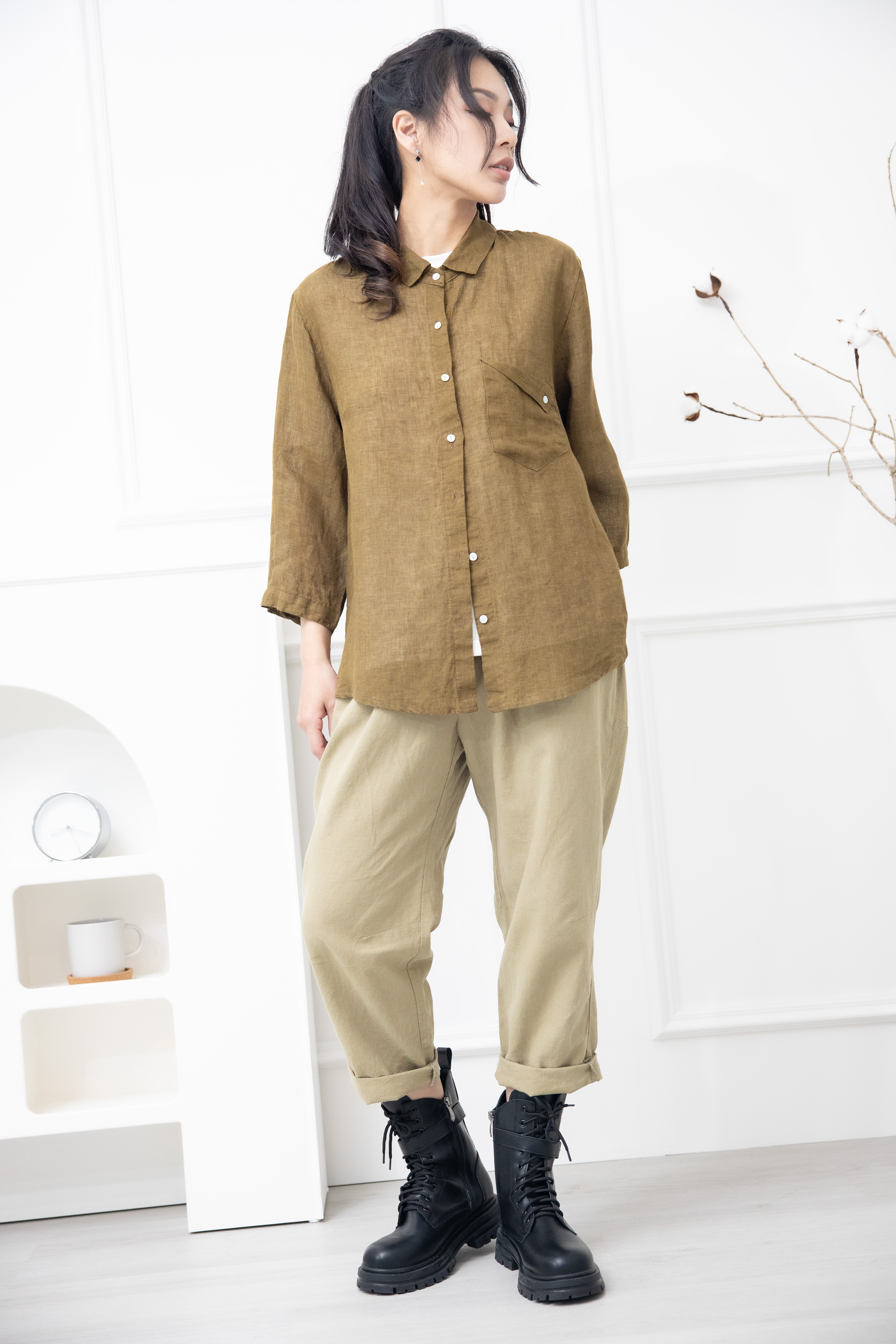 긴팔 素面造型口袋七分袖襯衫上衣 / 卡其色