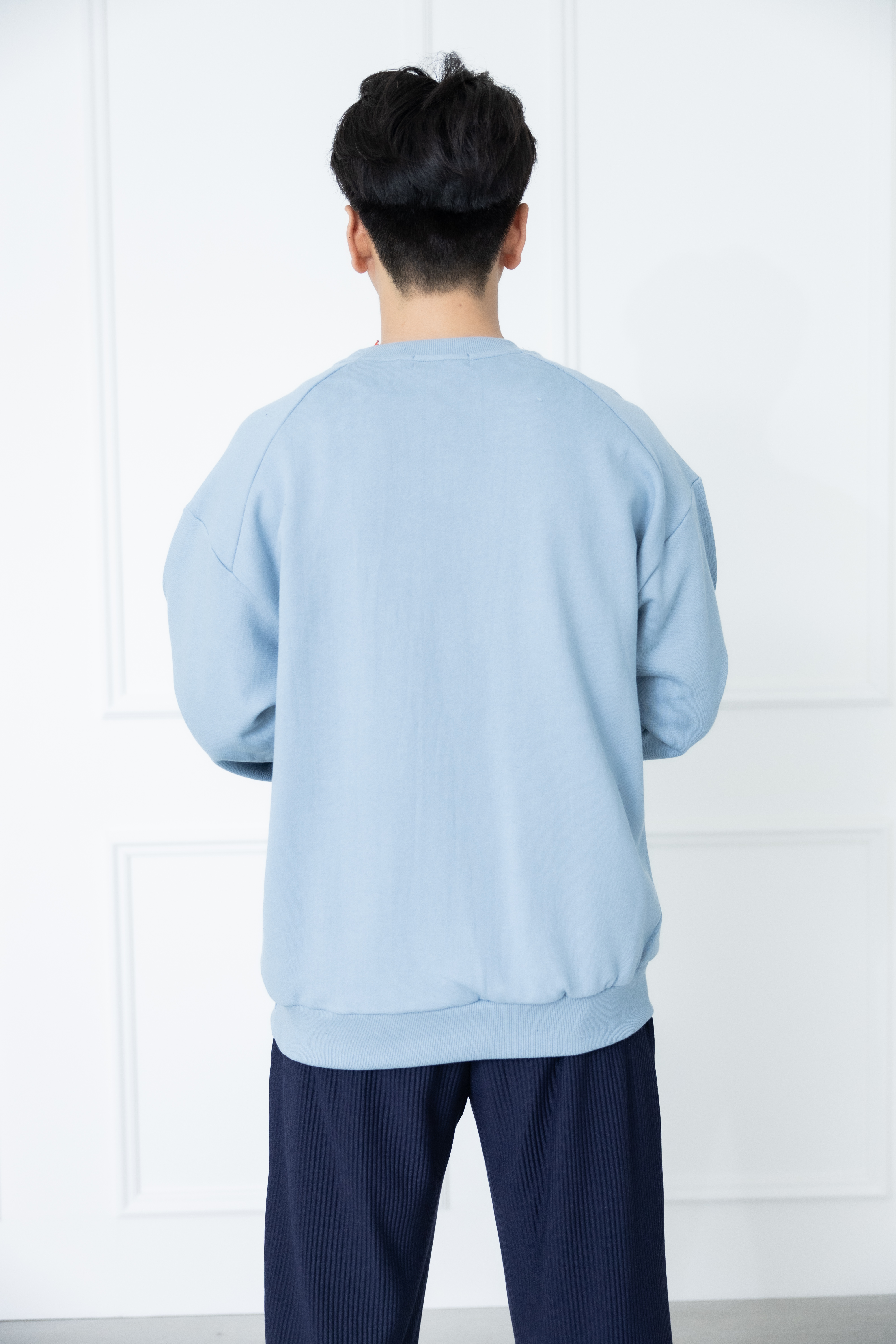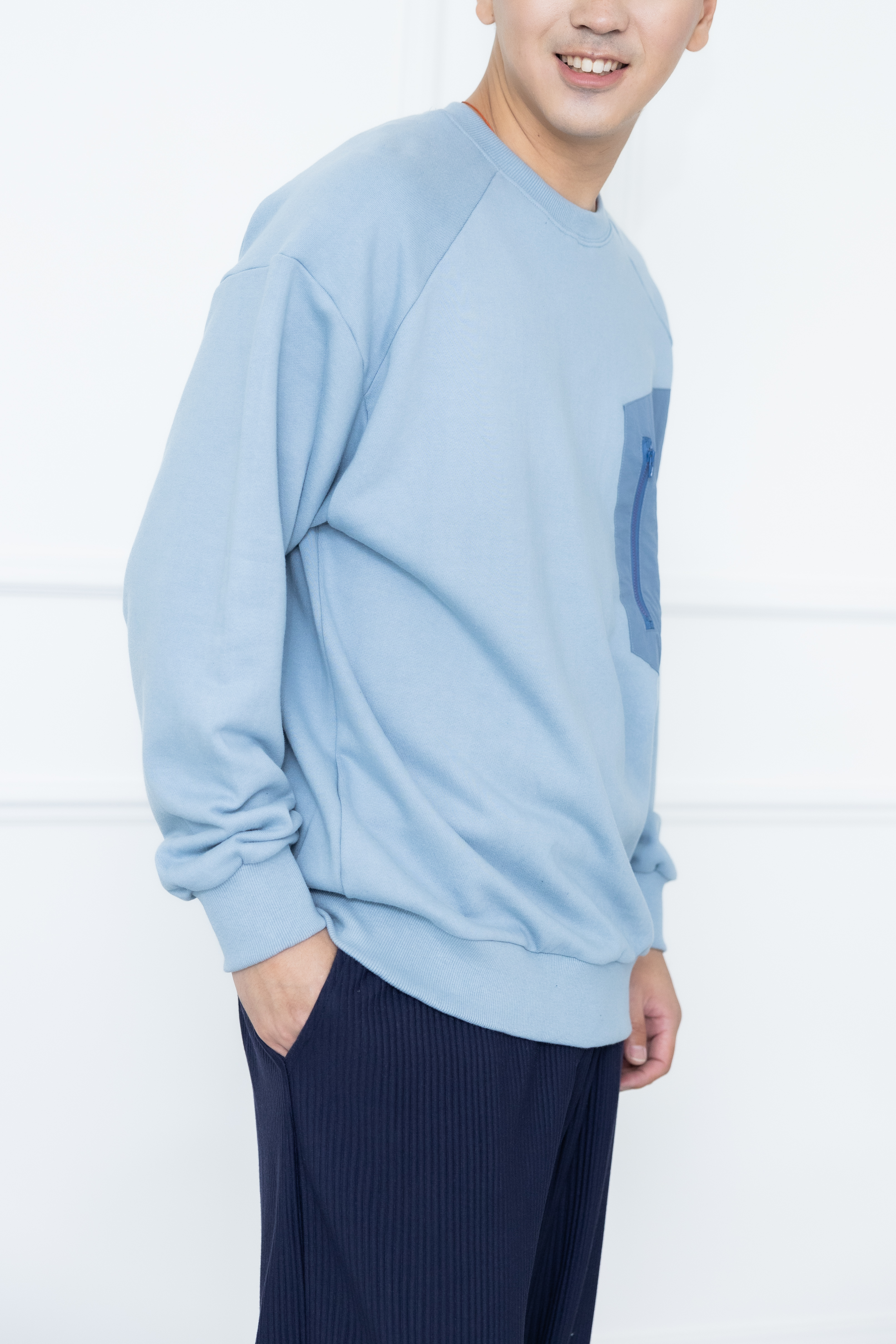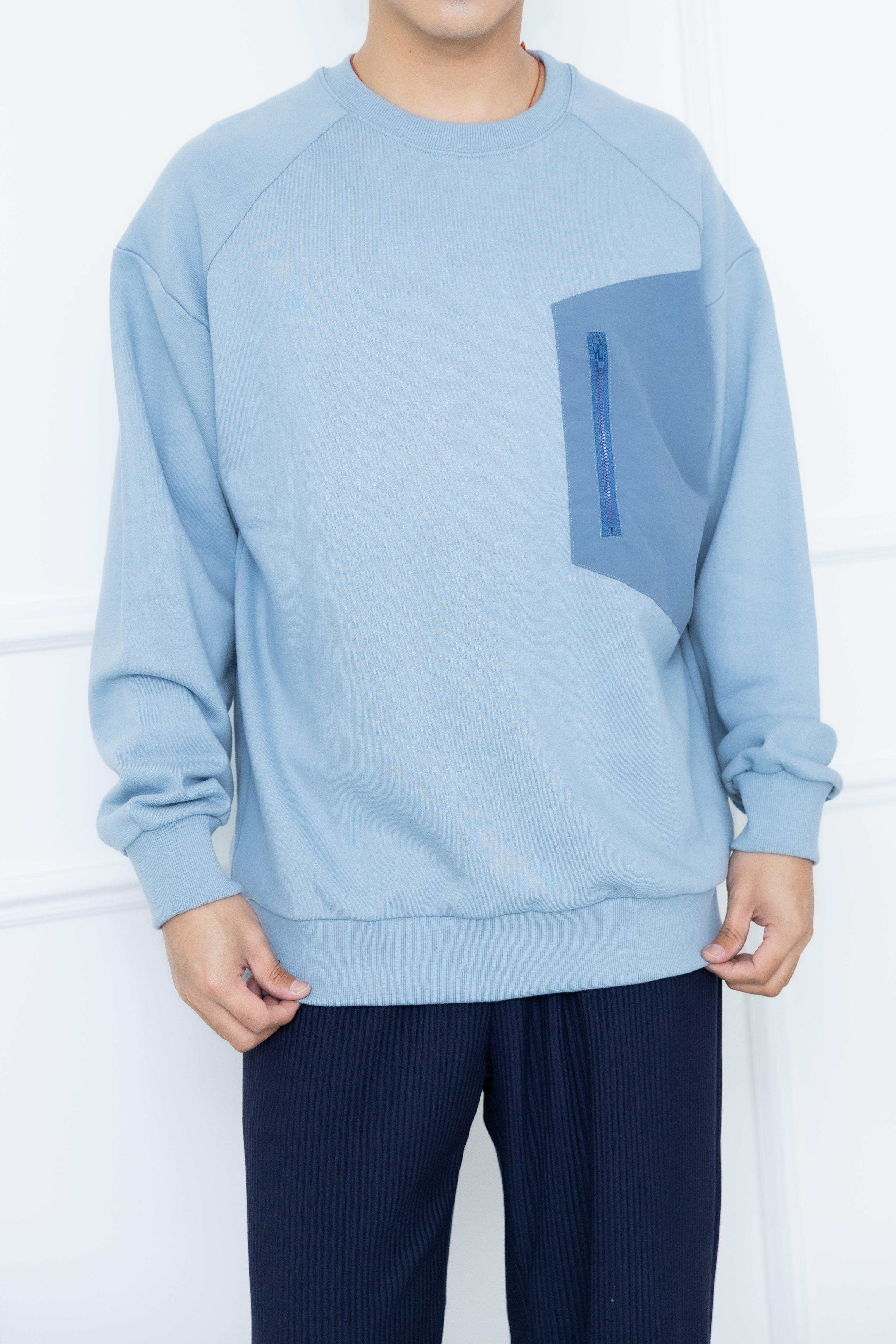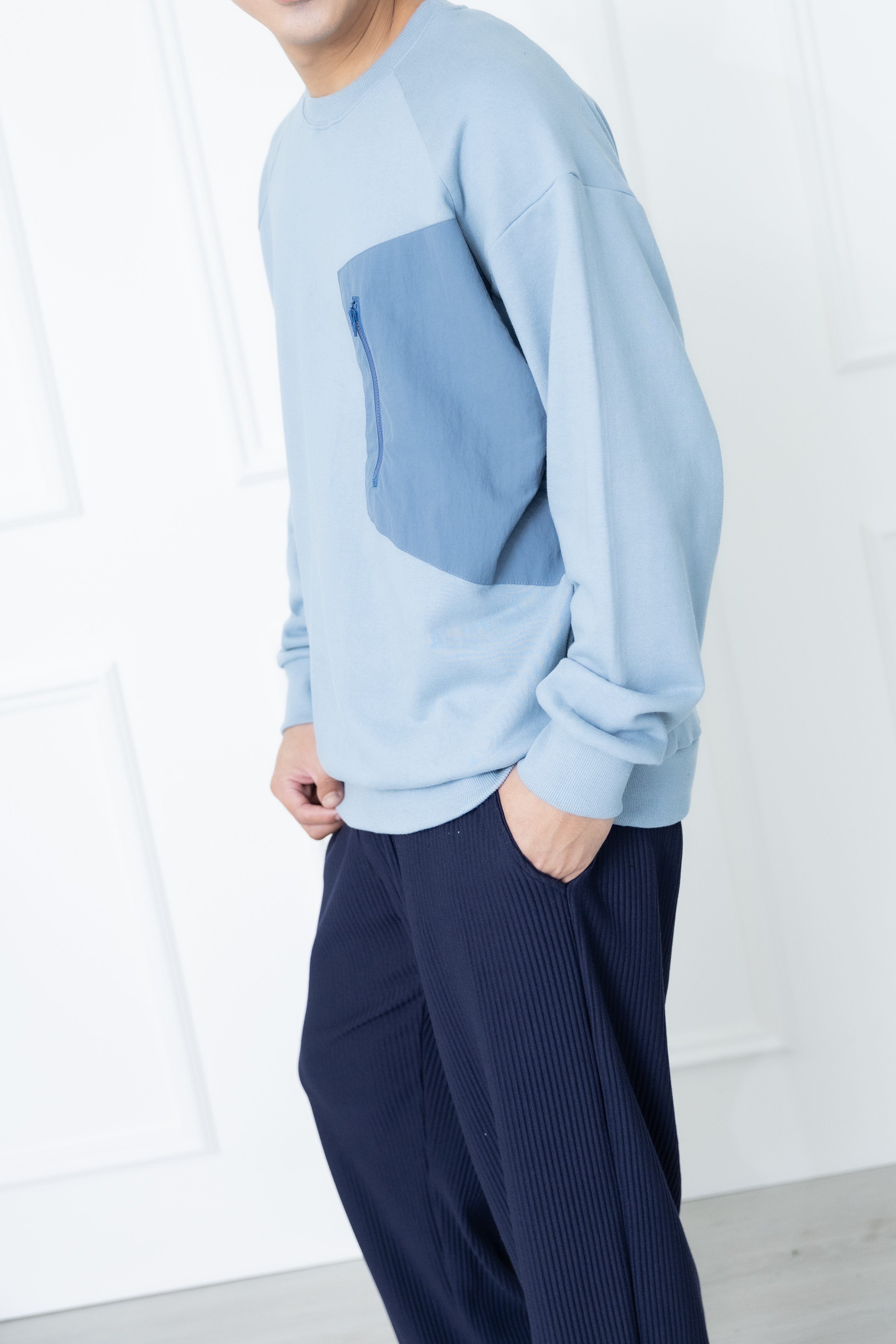 긴팔 胸前拉鍊口袋長袖上衣/藍色