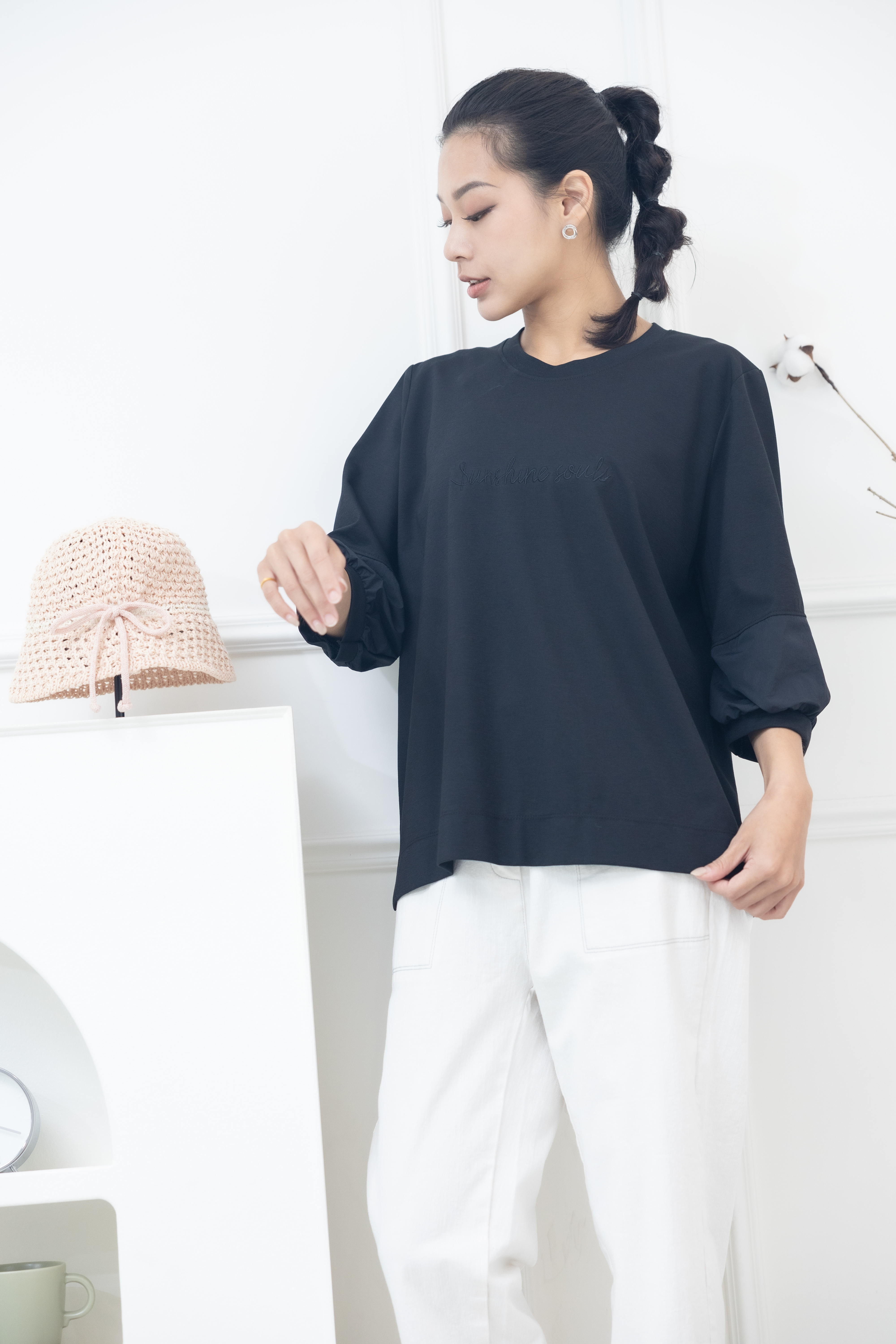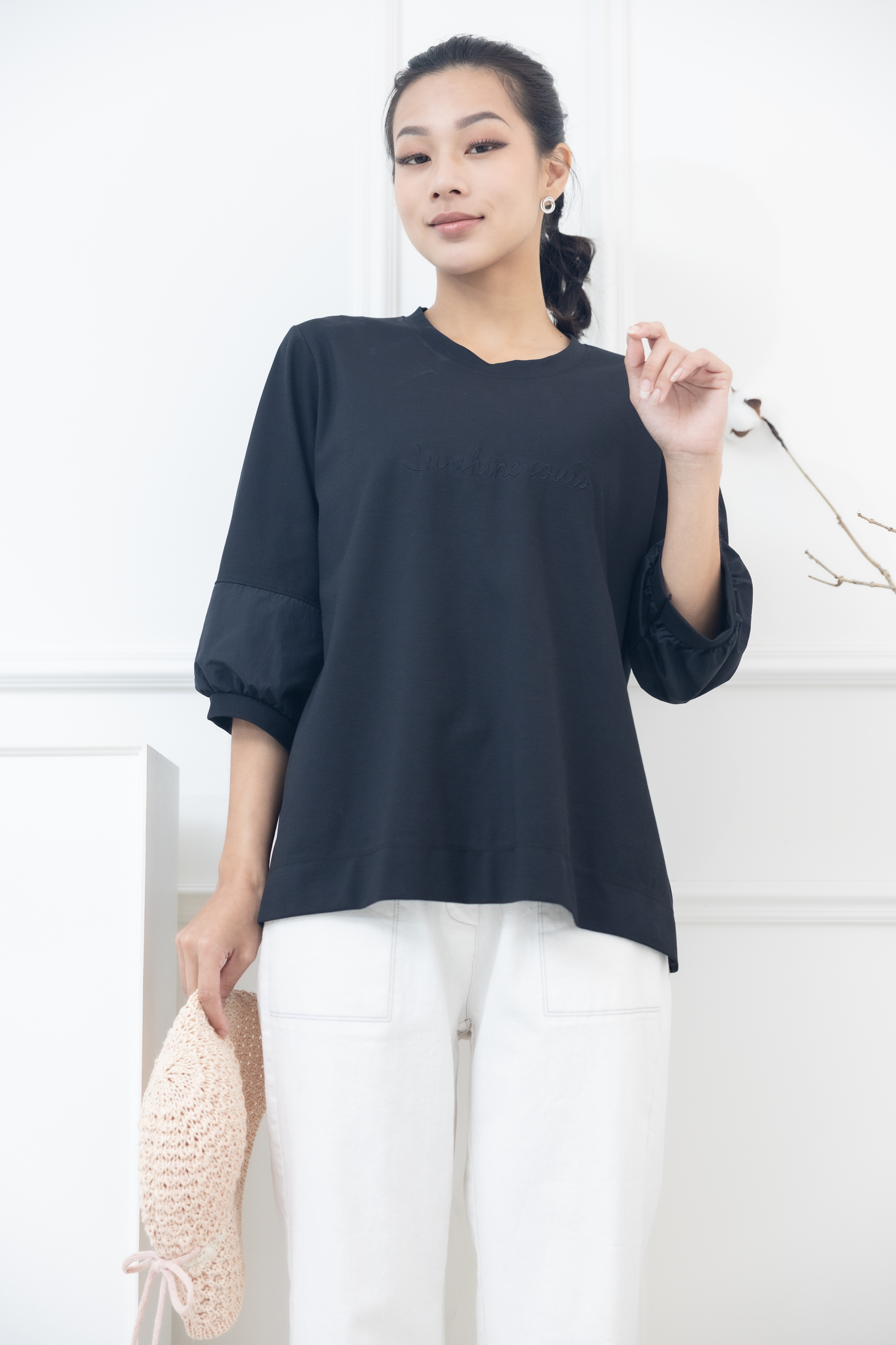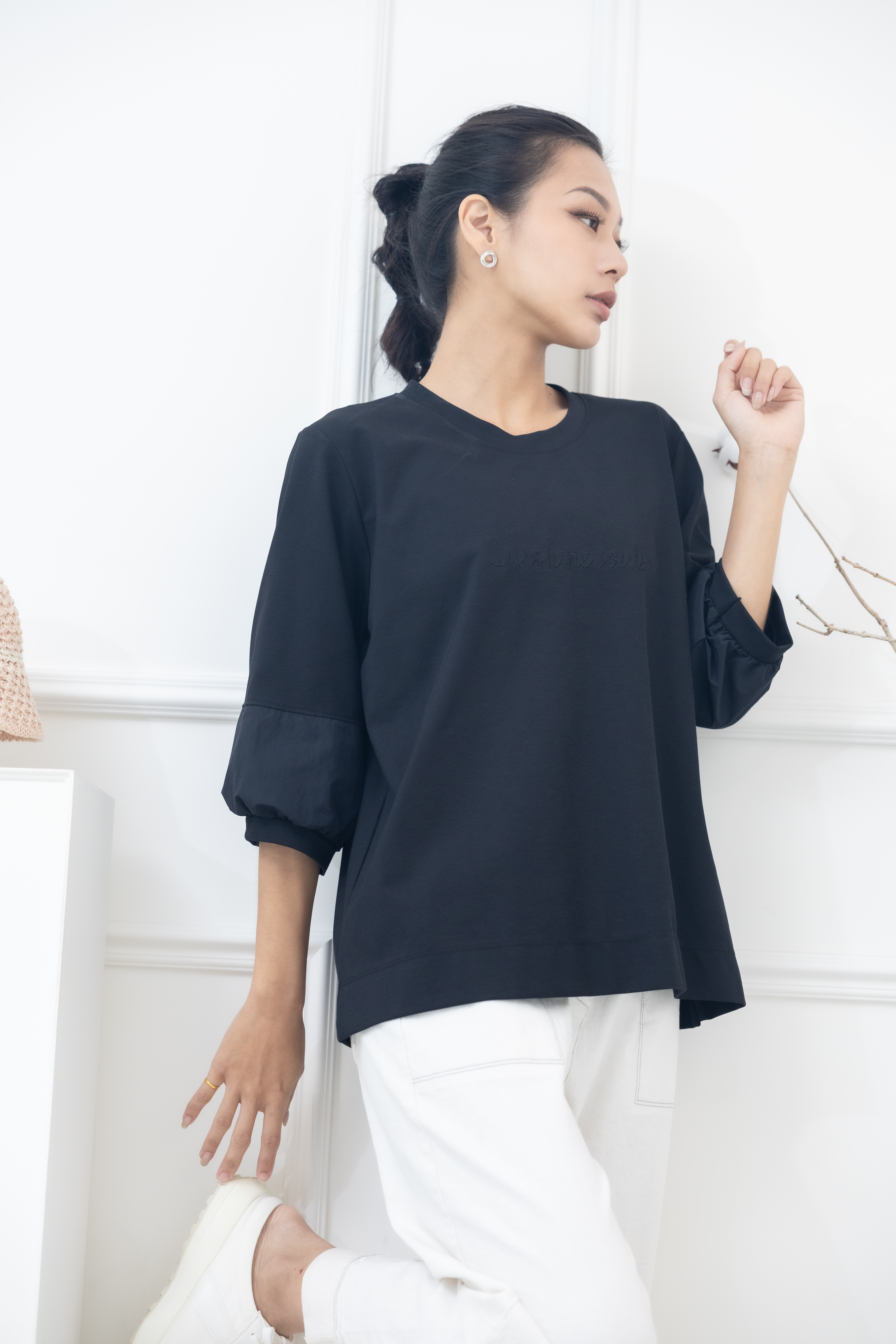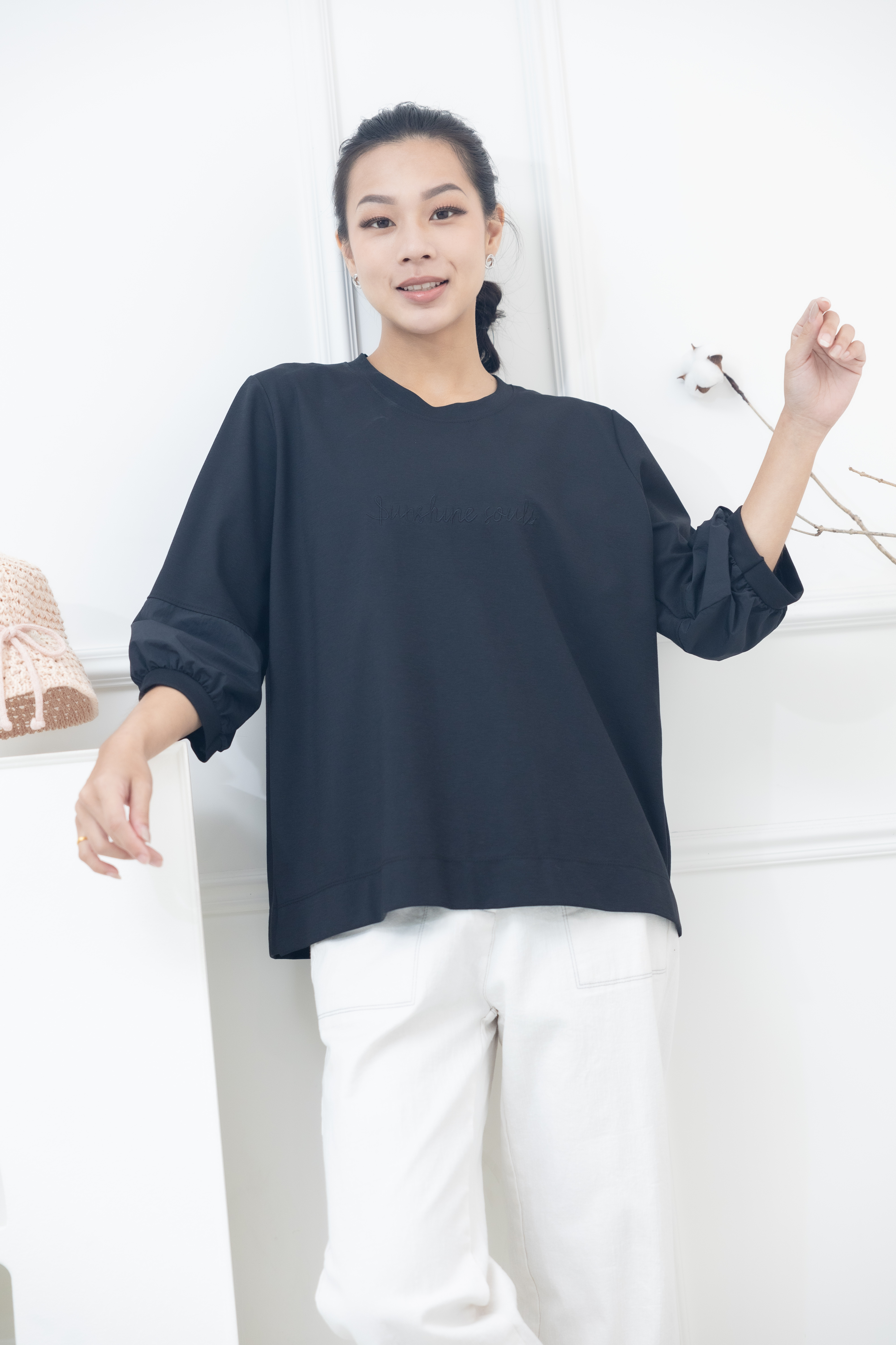 긴팔 胸前sunshine souls字七分袖上衣 / 黑色