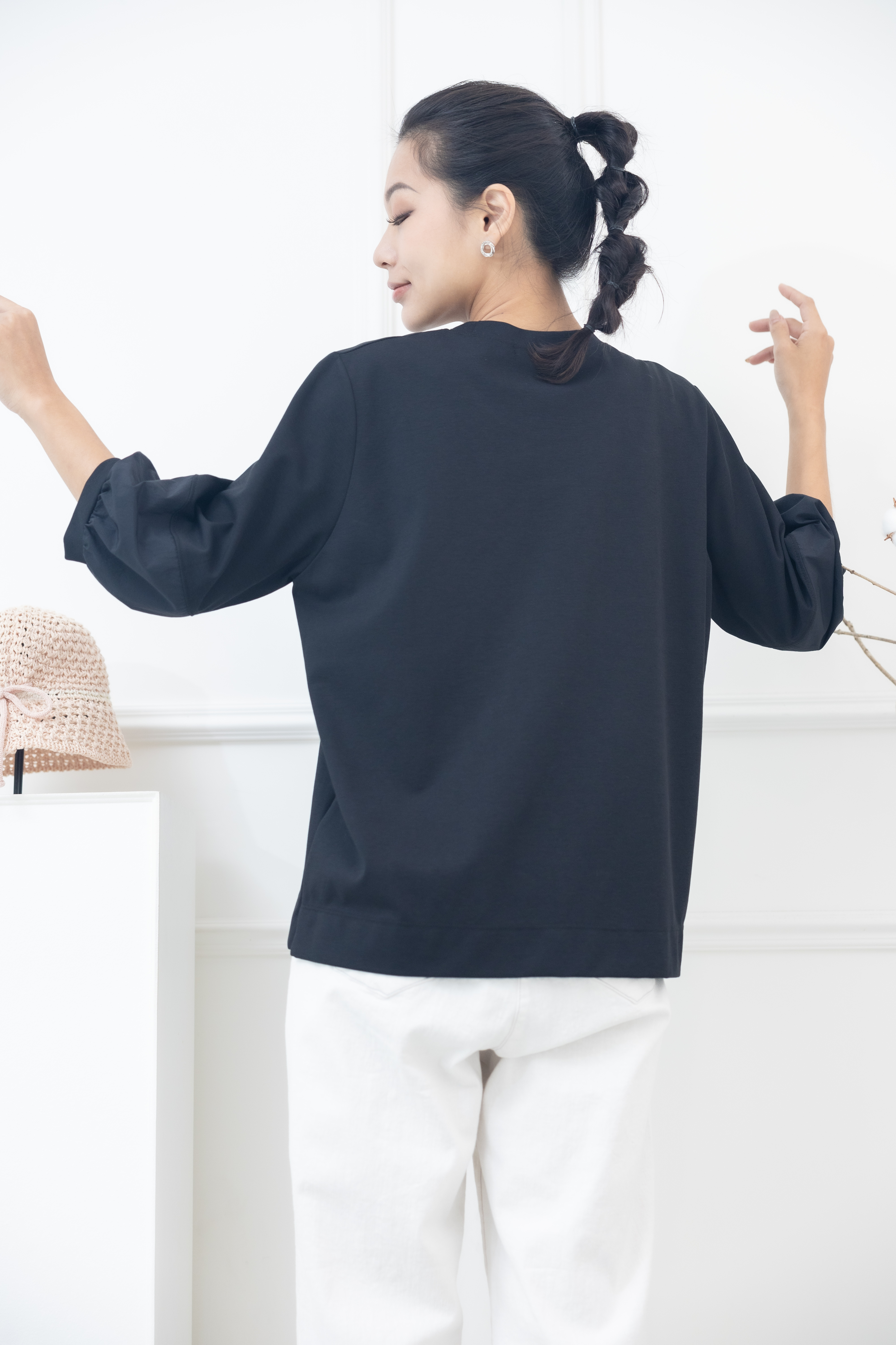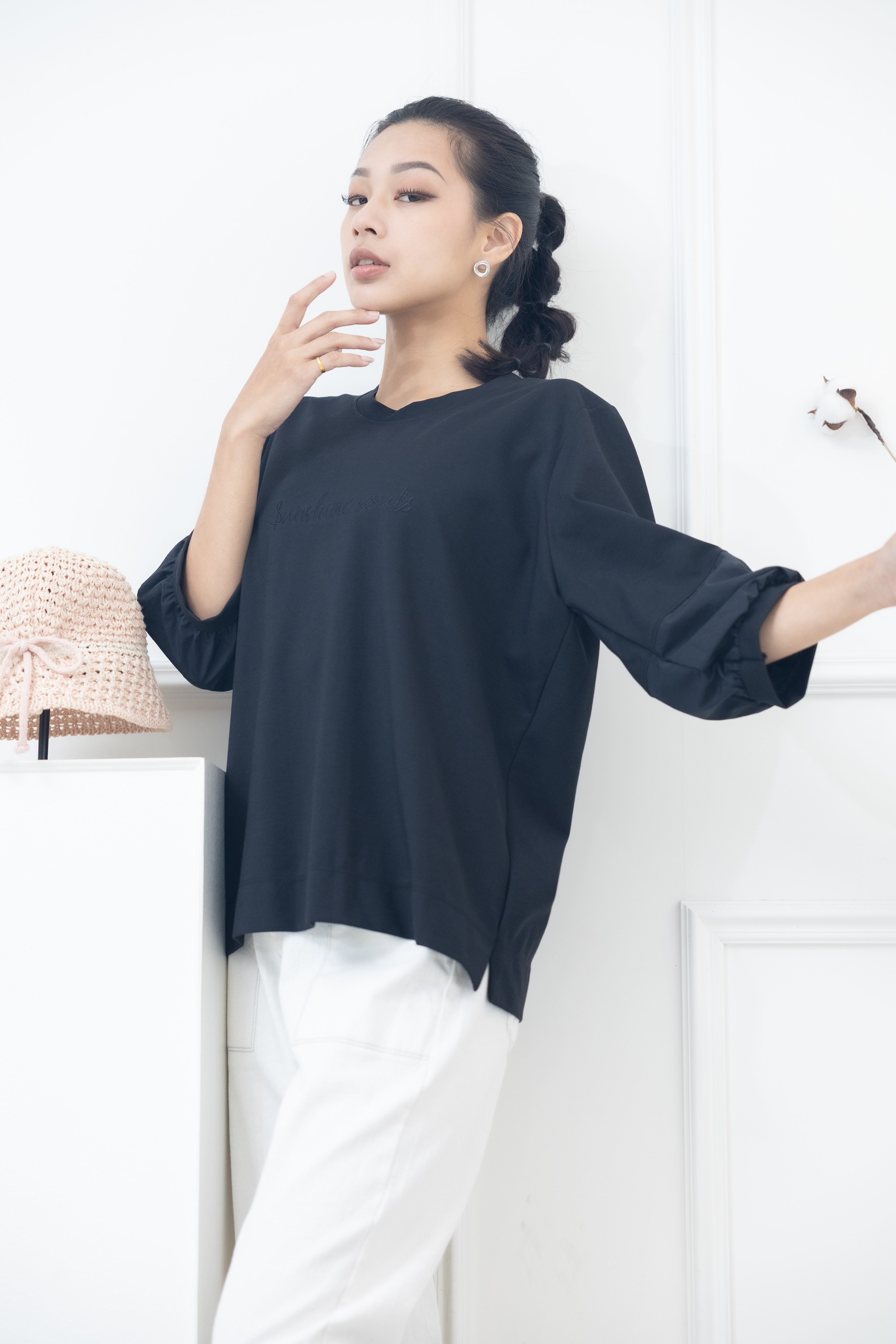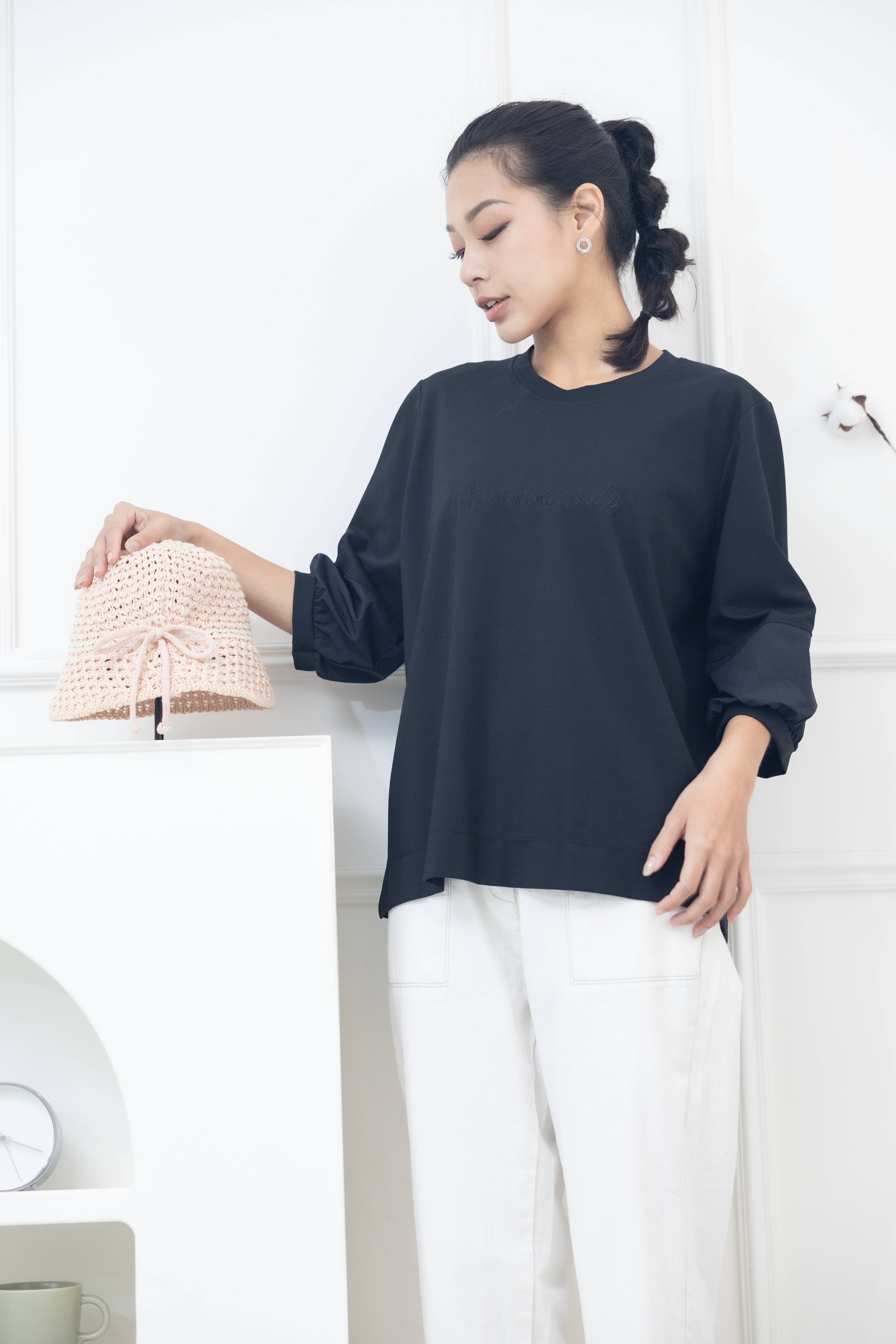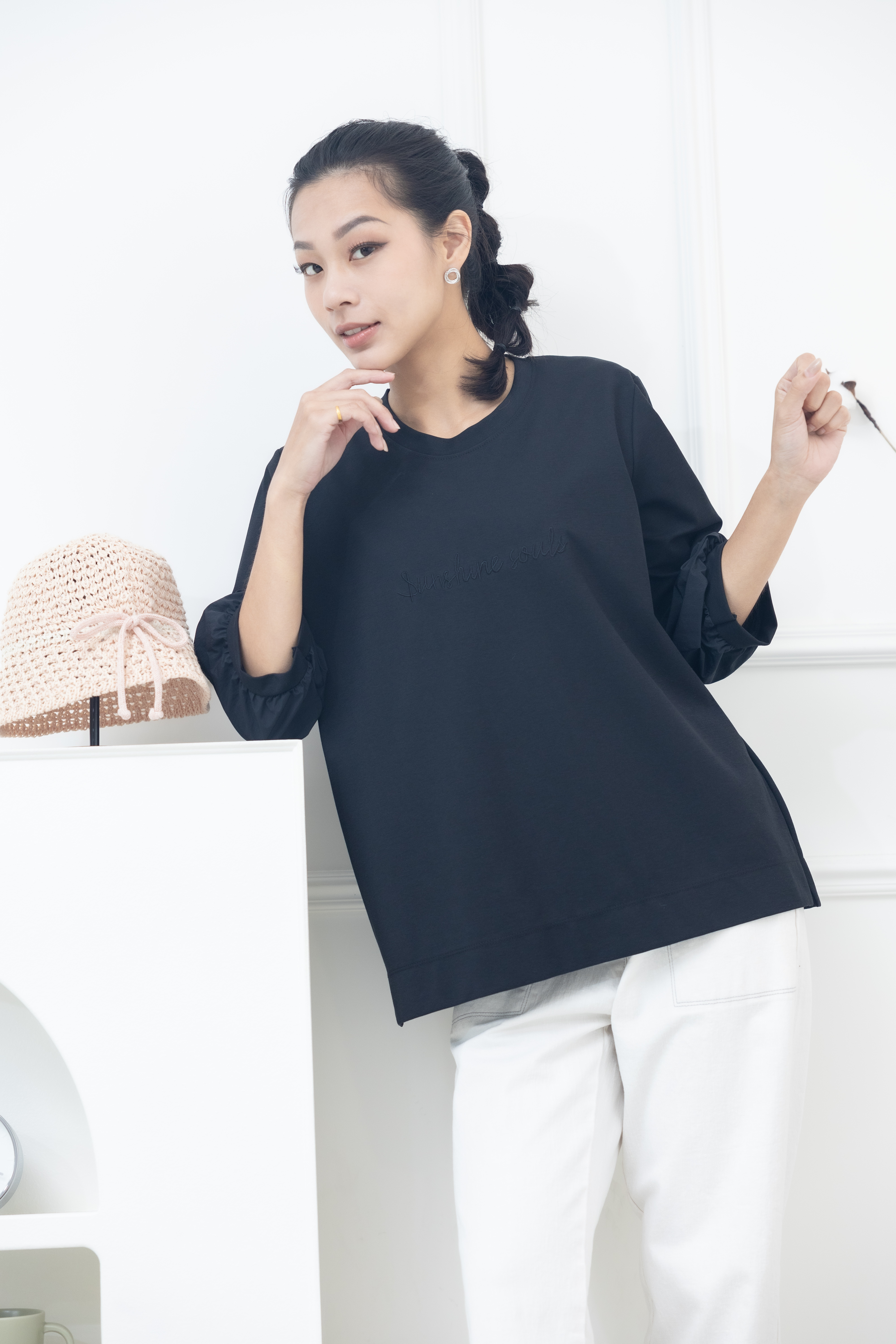 긴팔 胸前sunshine souls字七分袖上衣 / 黑色