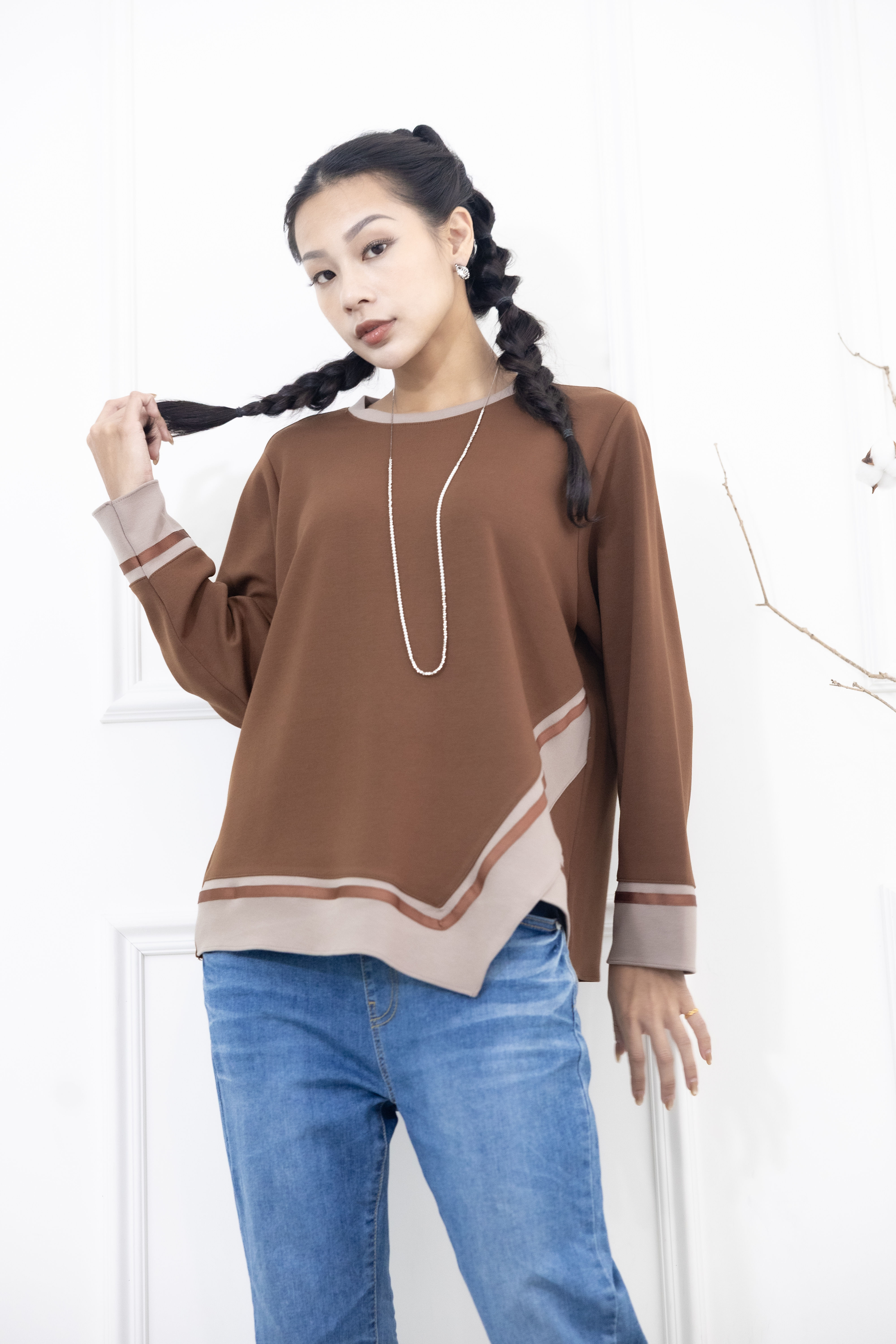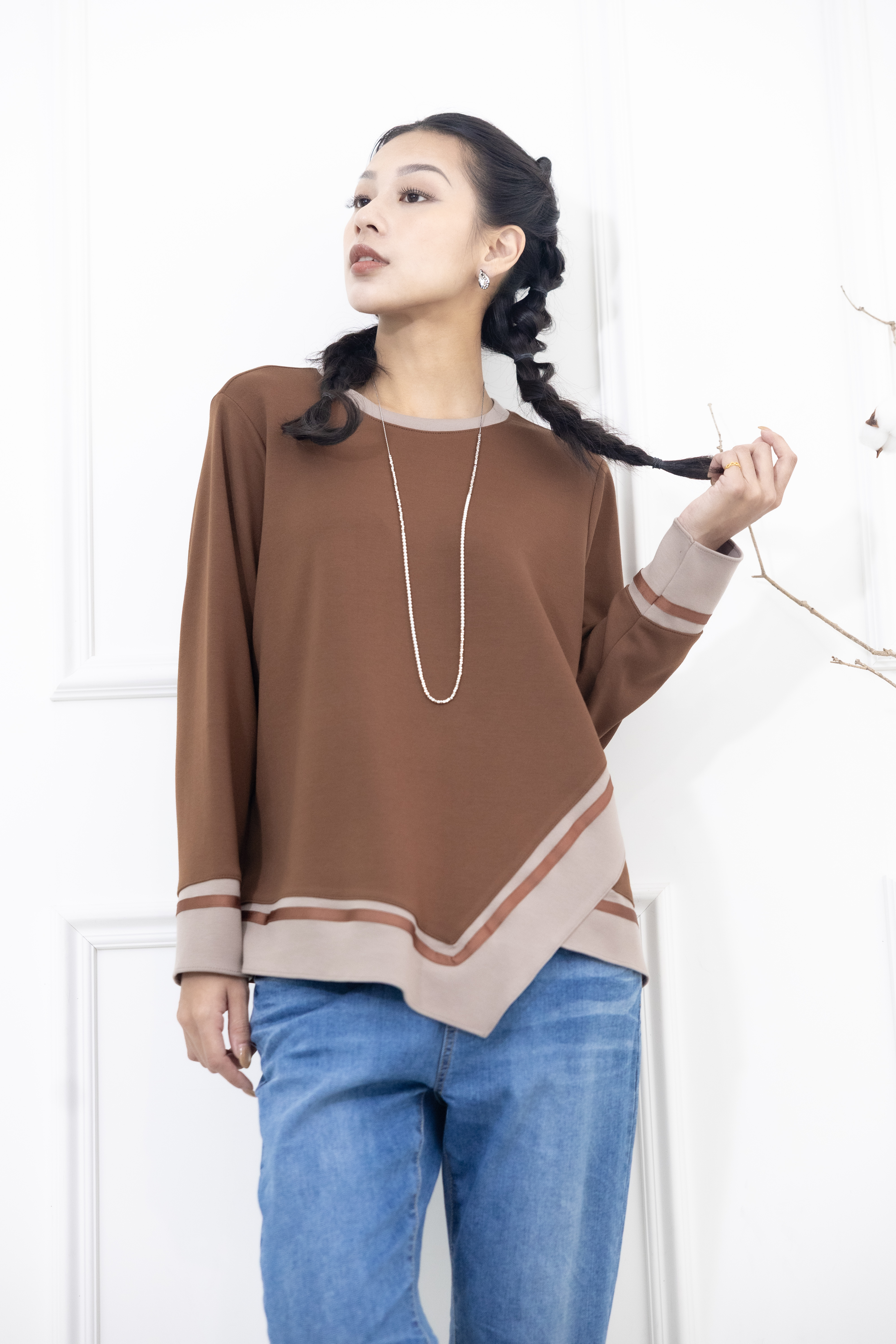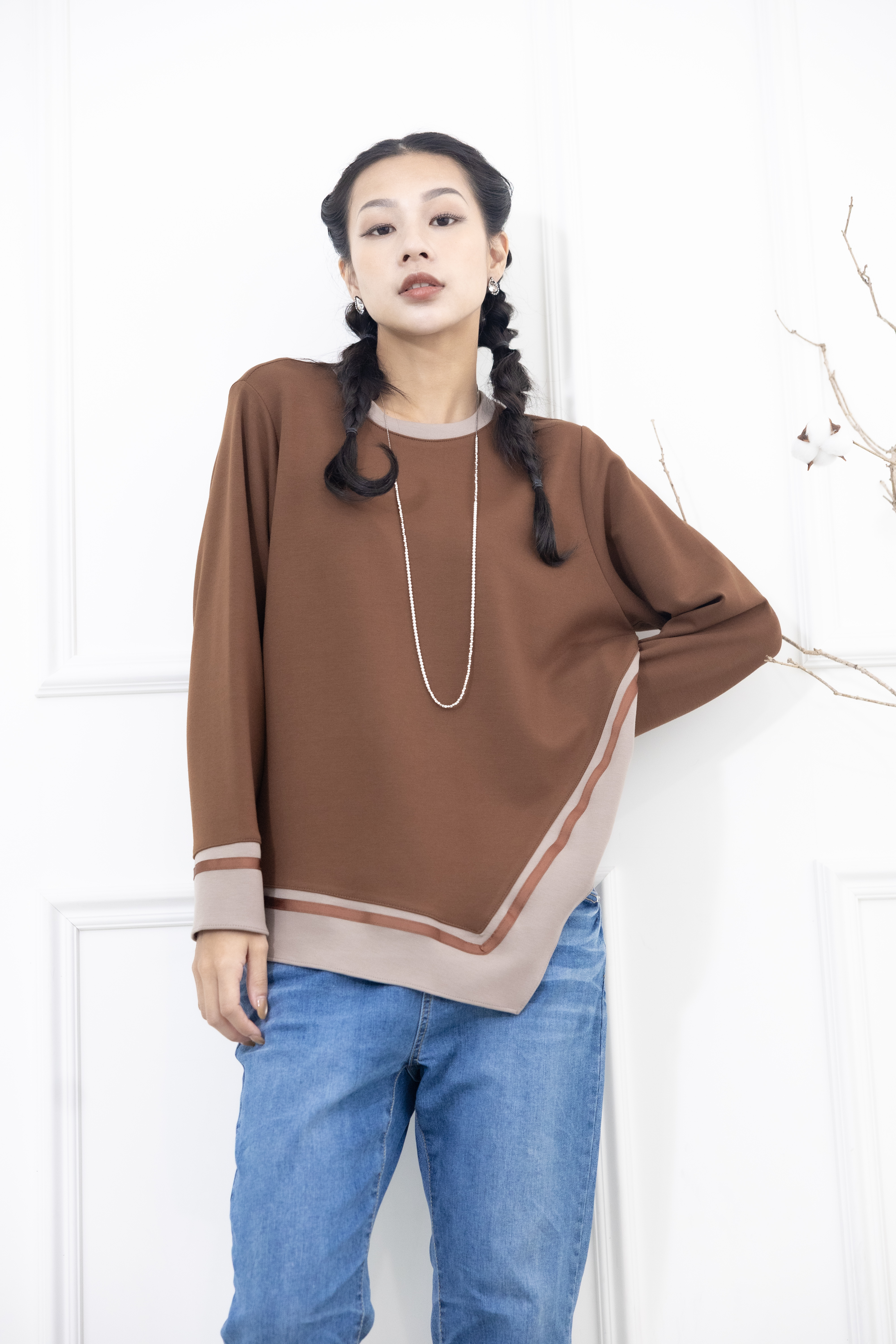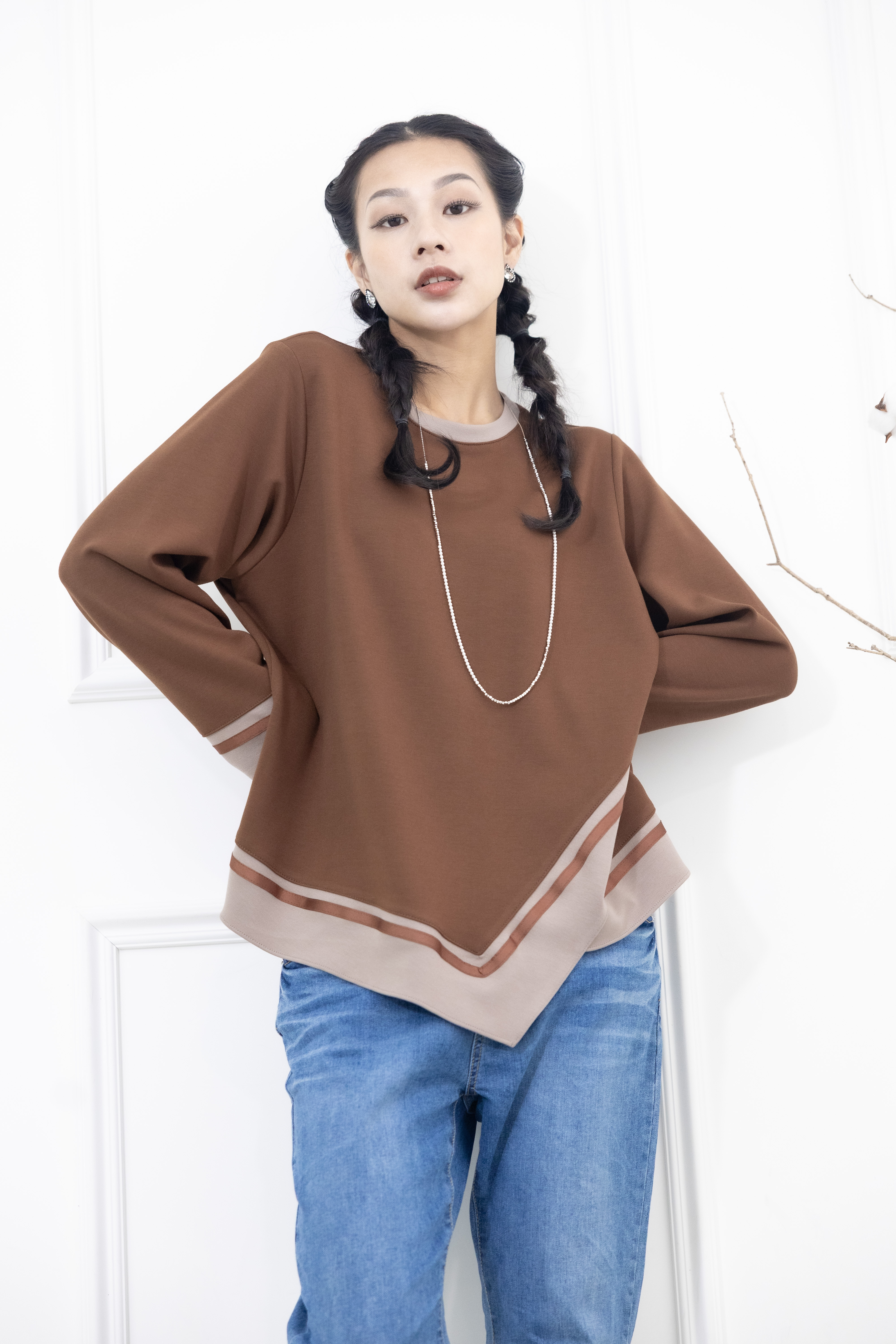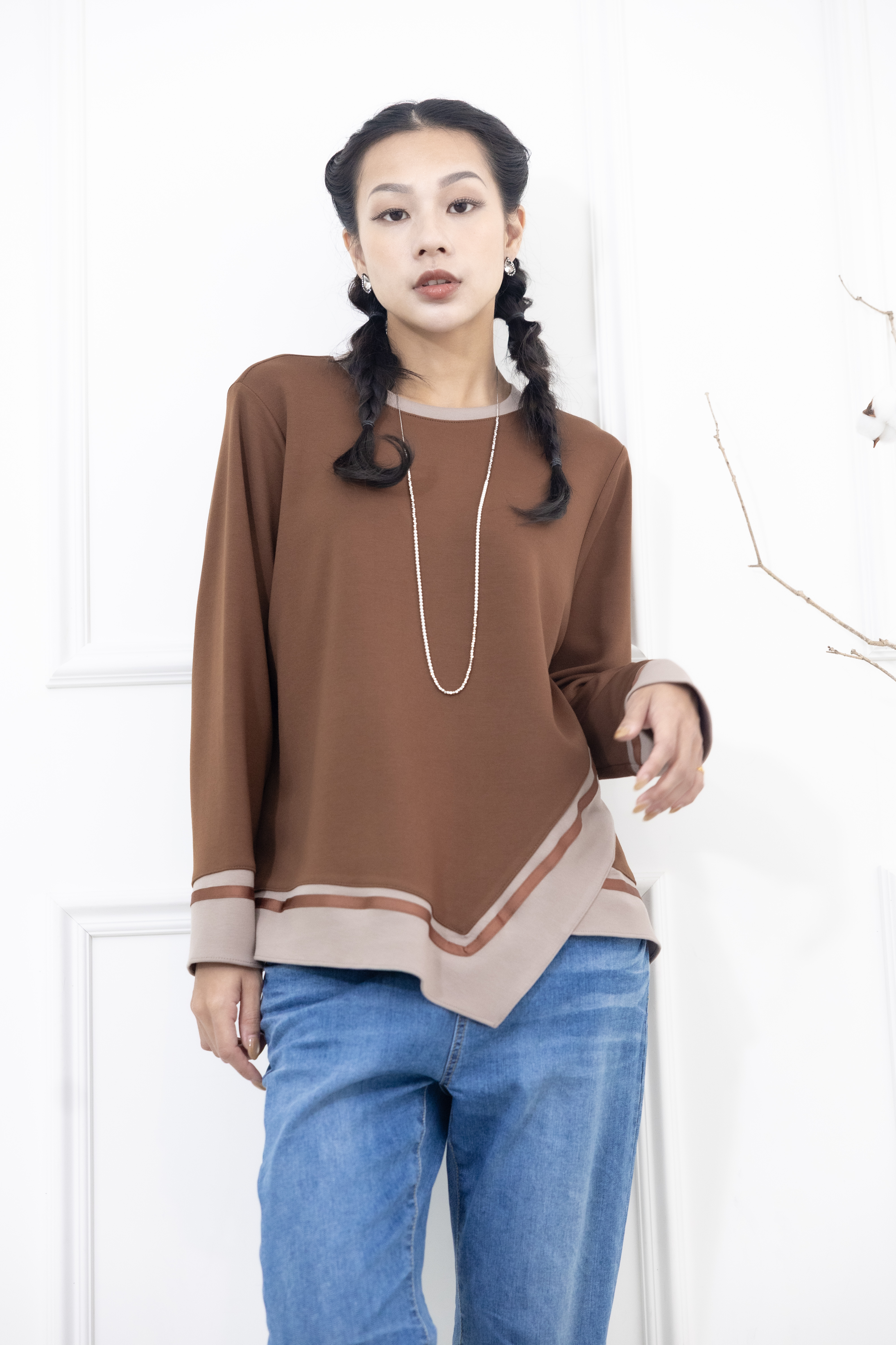 긴팔 胸針不對稱下擺綴緞帶長袖上衣 / 咖啡色拼接亞麻色