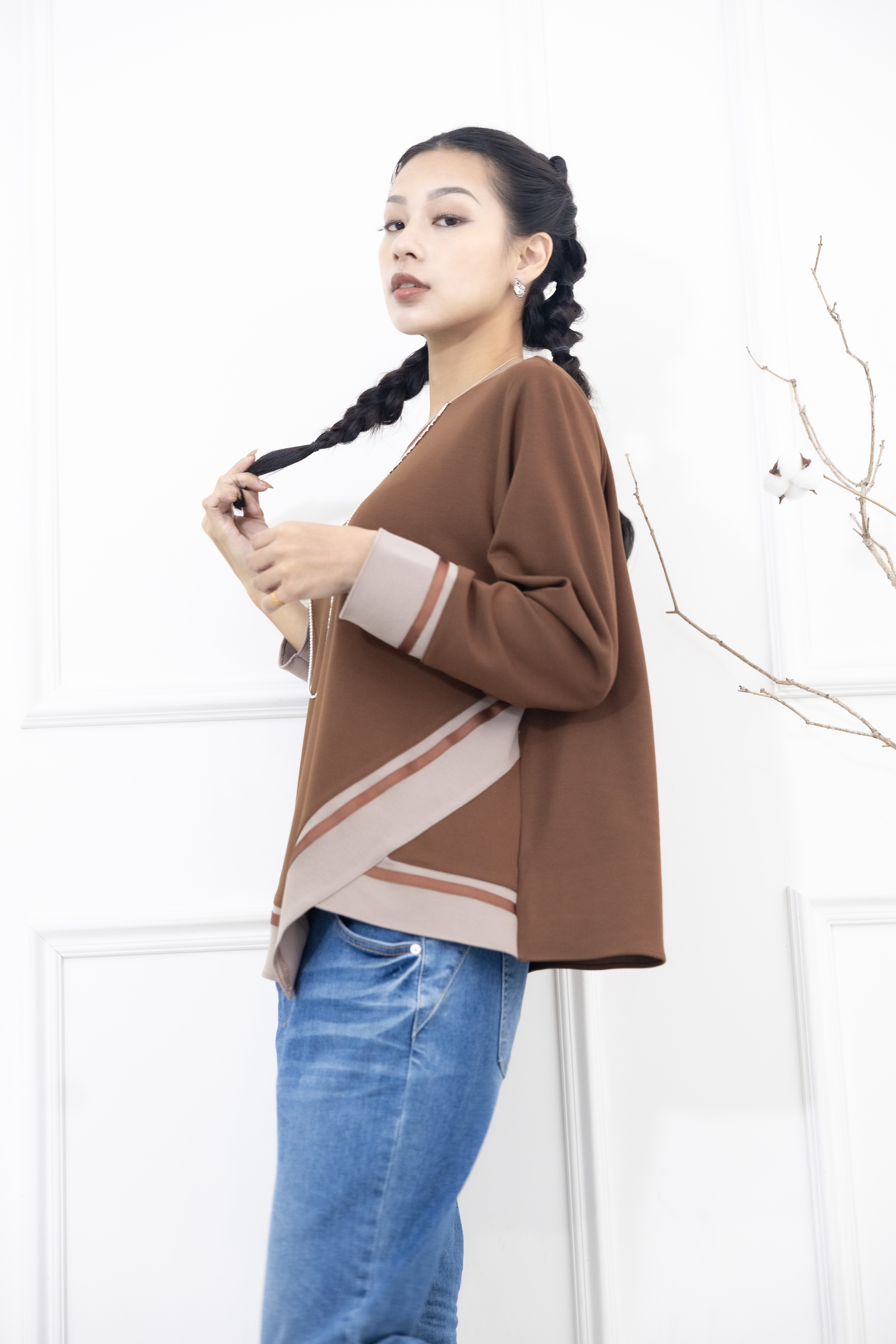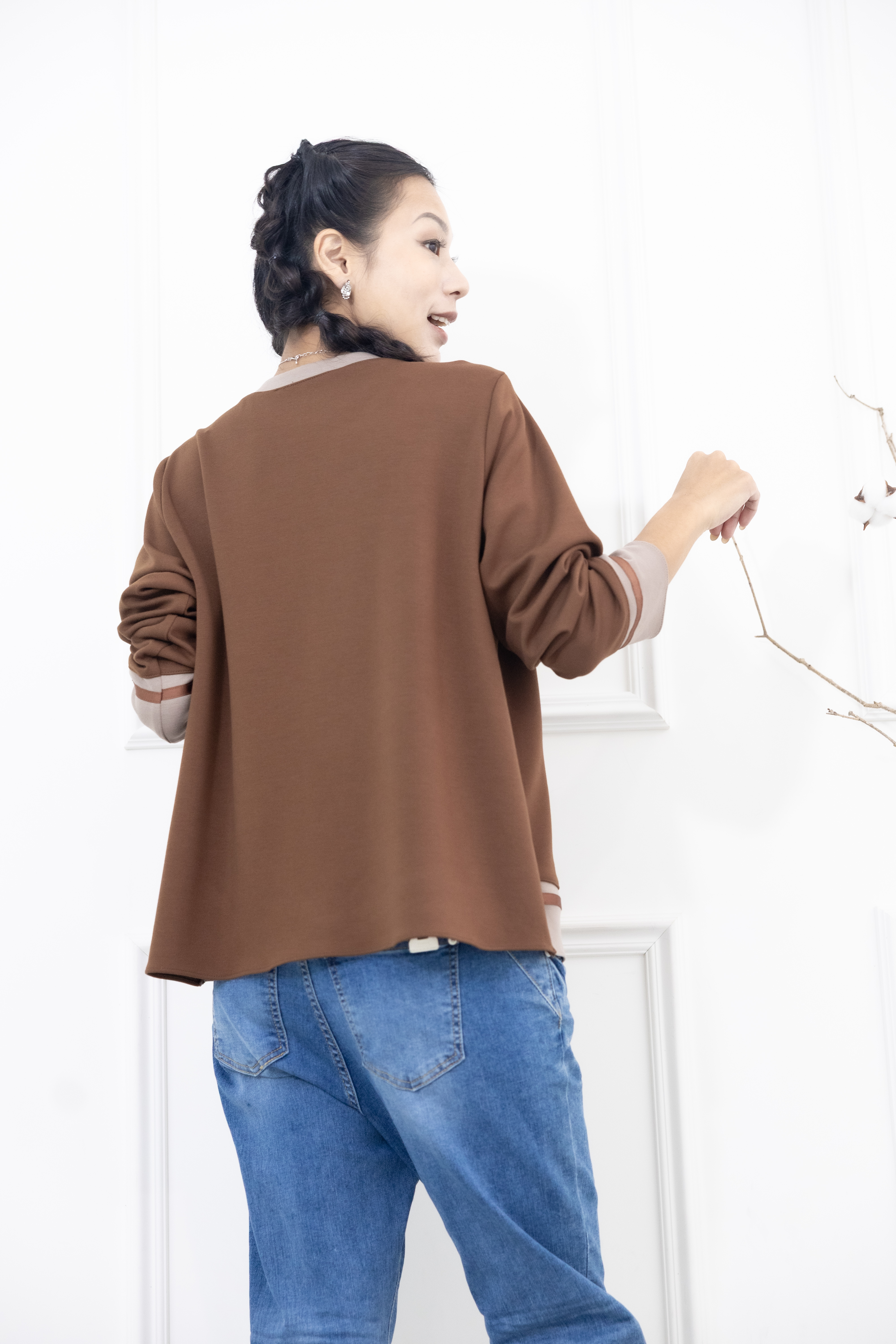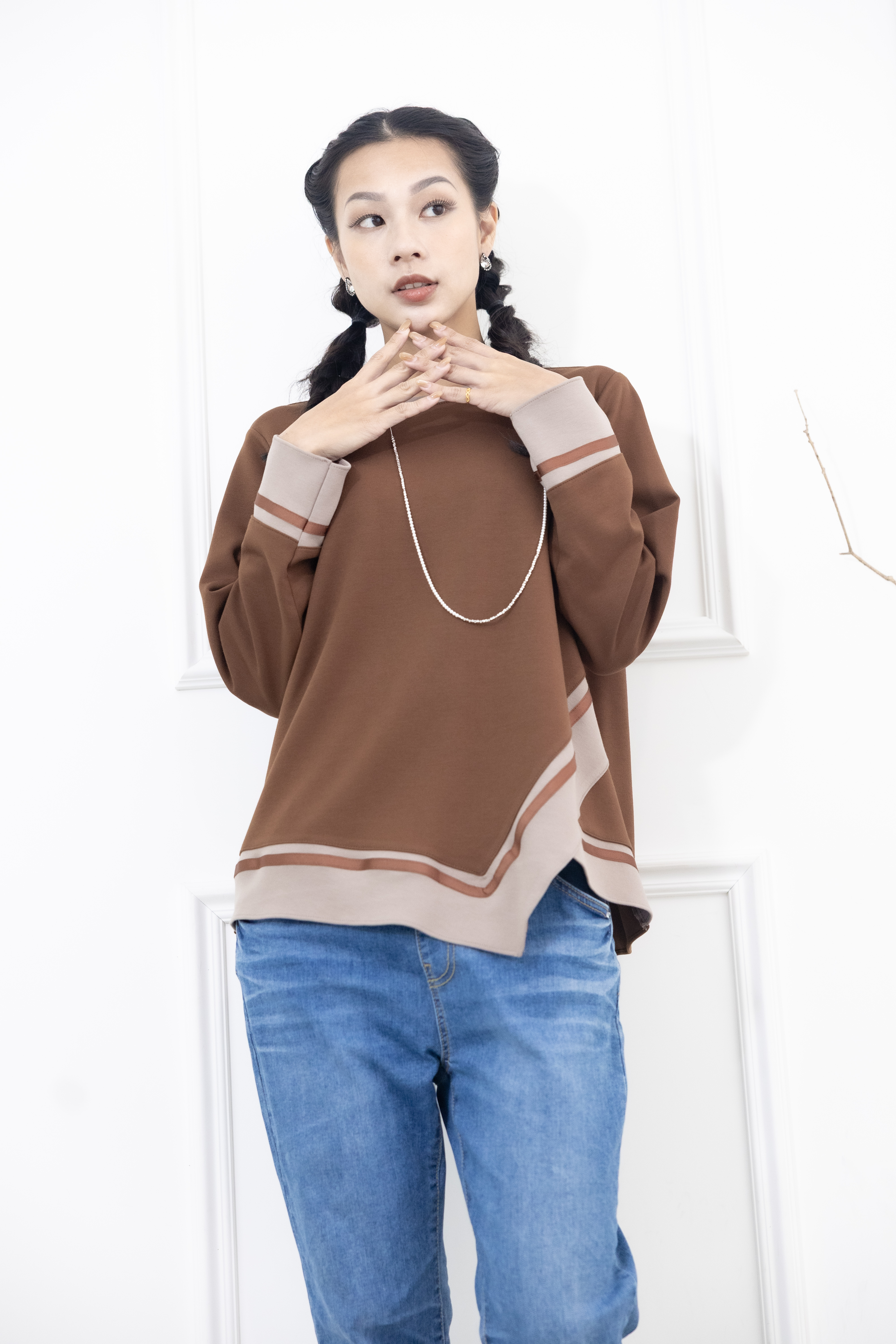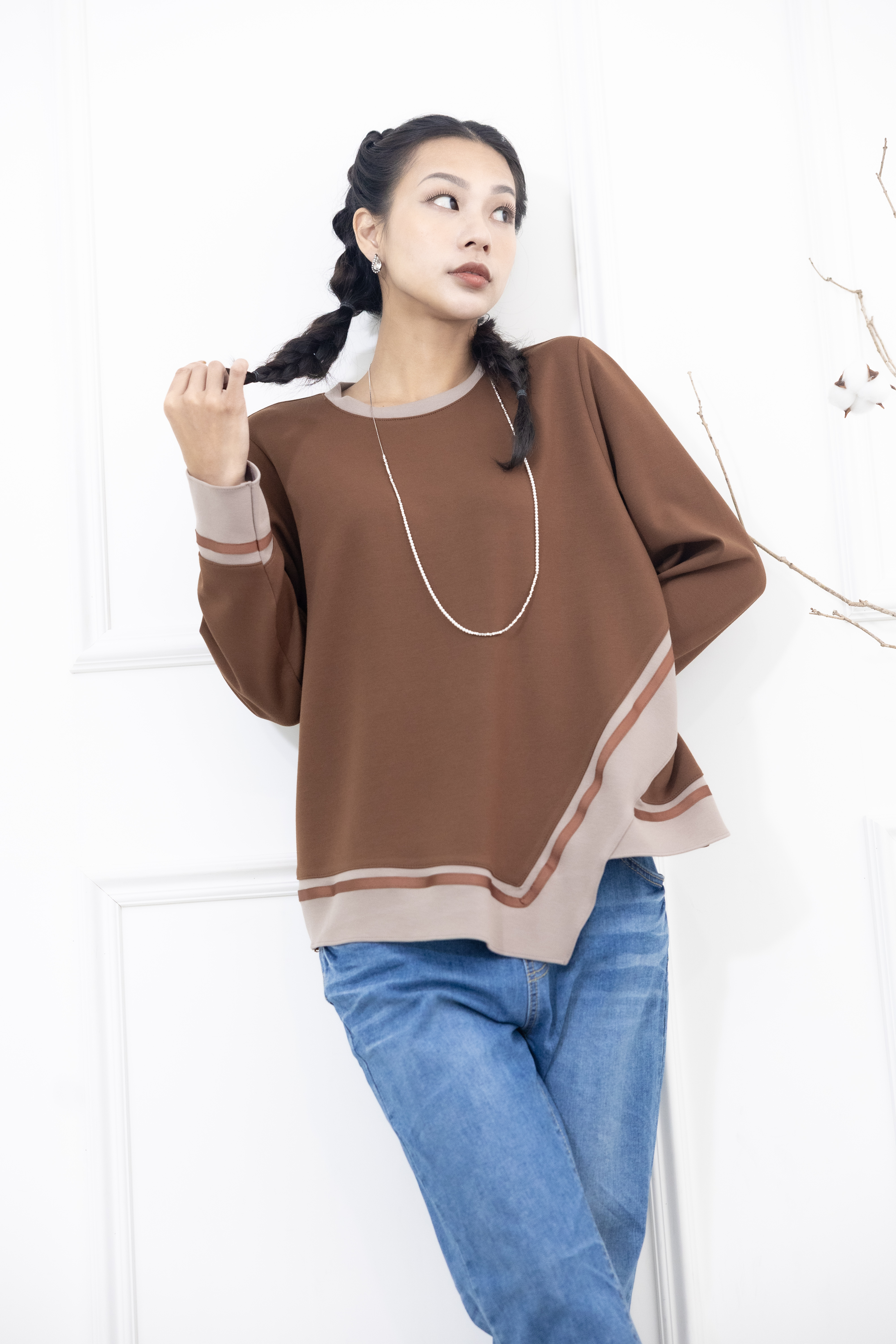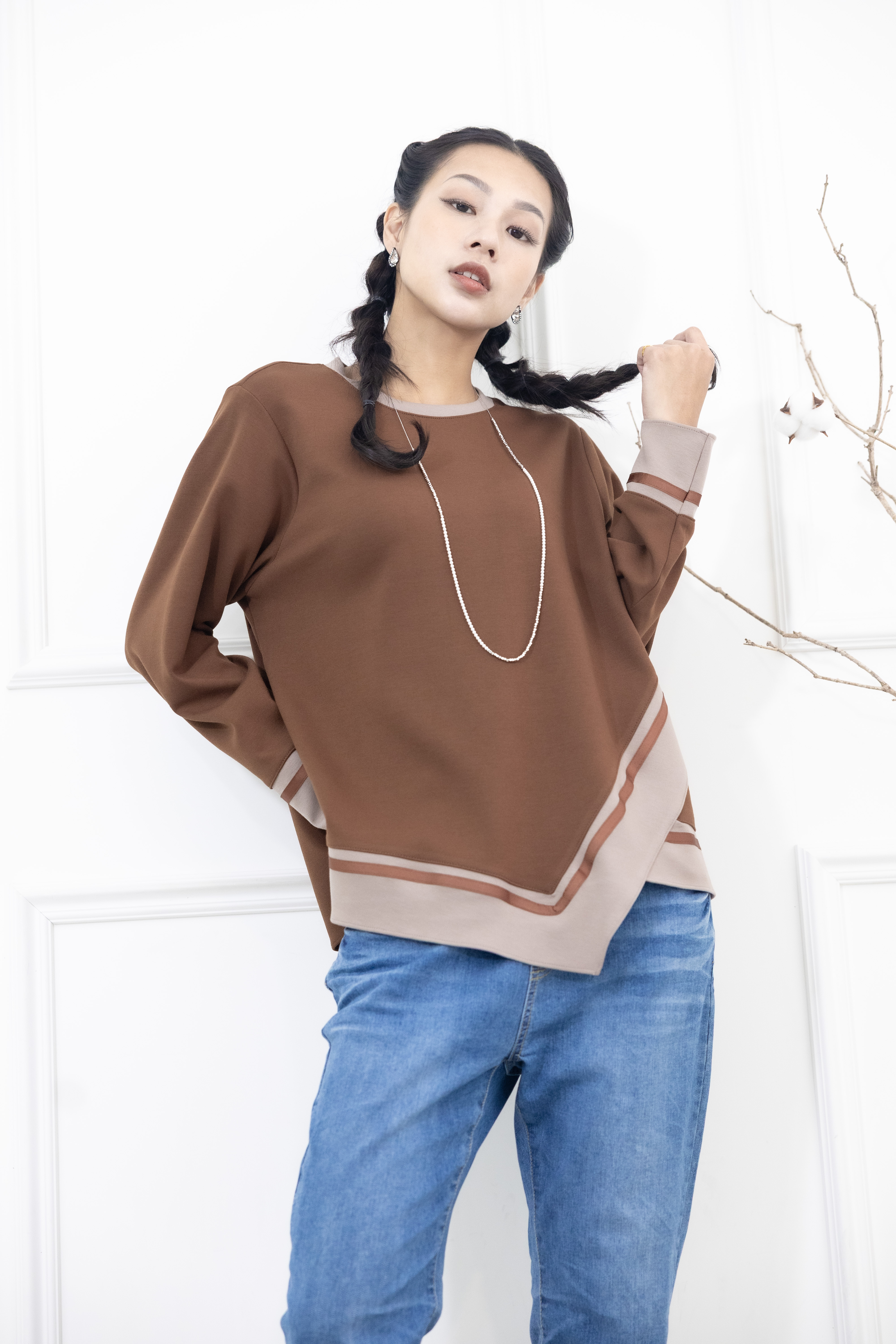 긴팔 胸針不對稱下擺綴緞帶長袖上衣 / 咖啡色拼接亞麻色