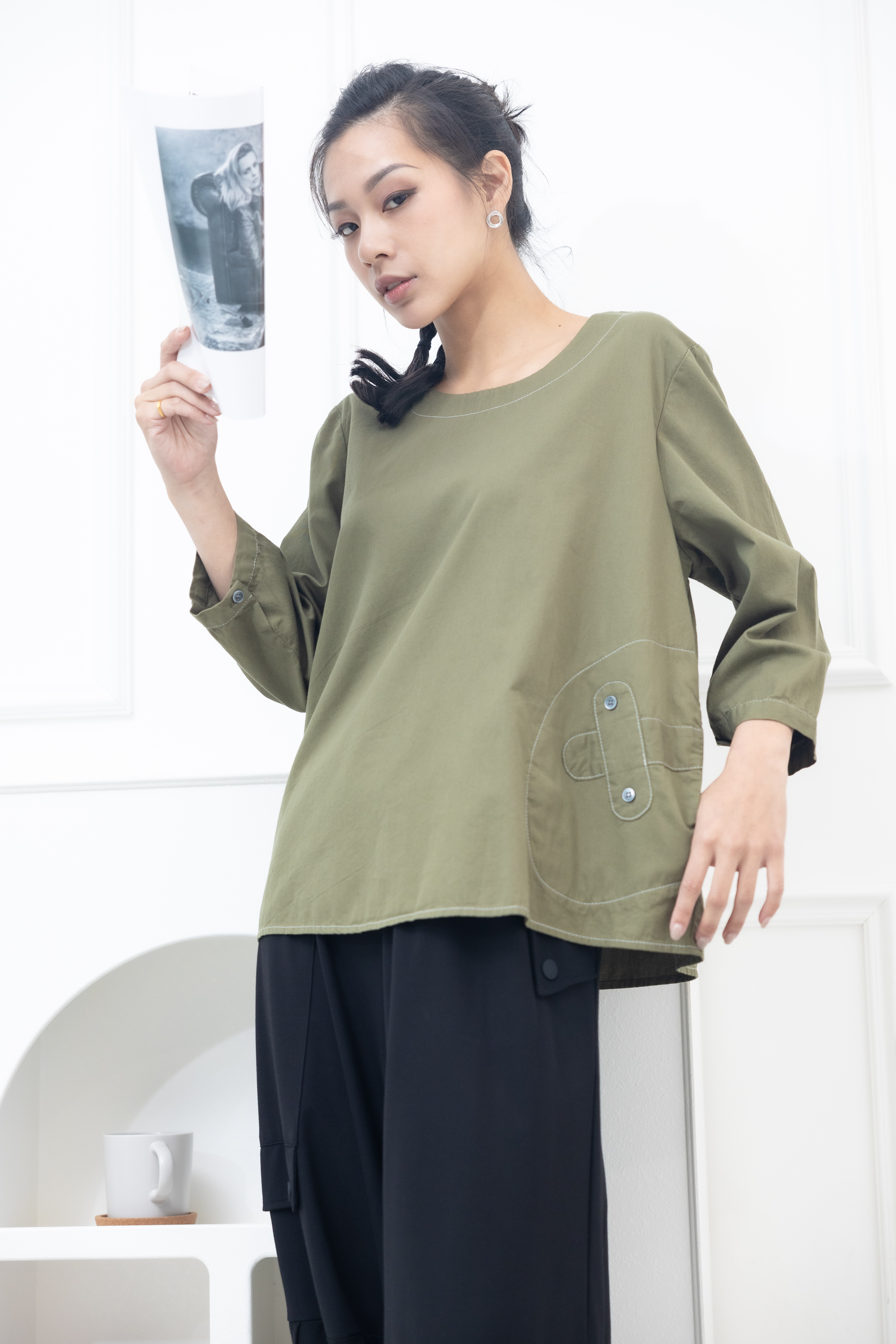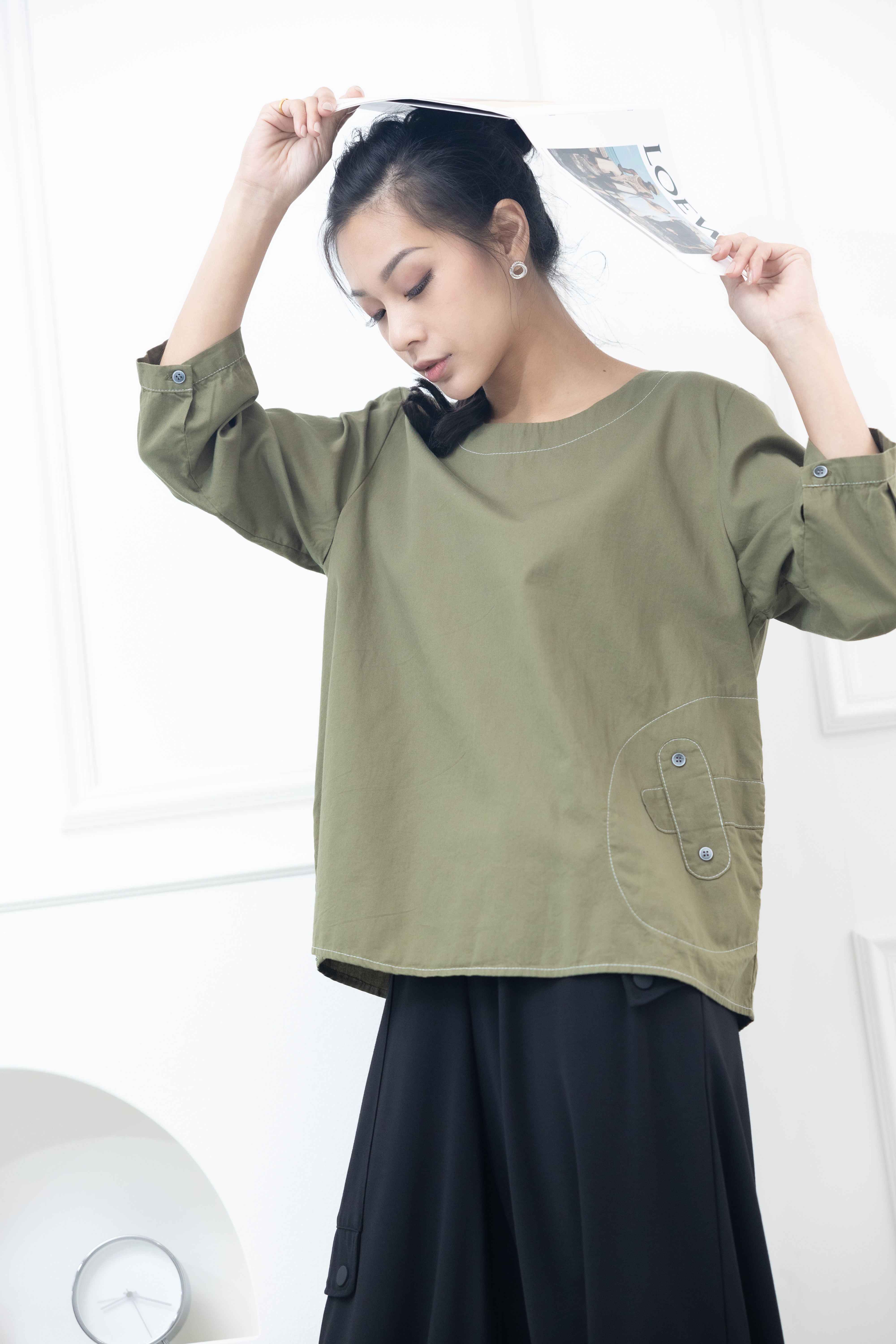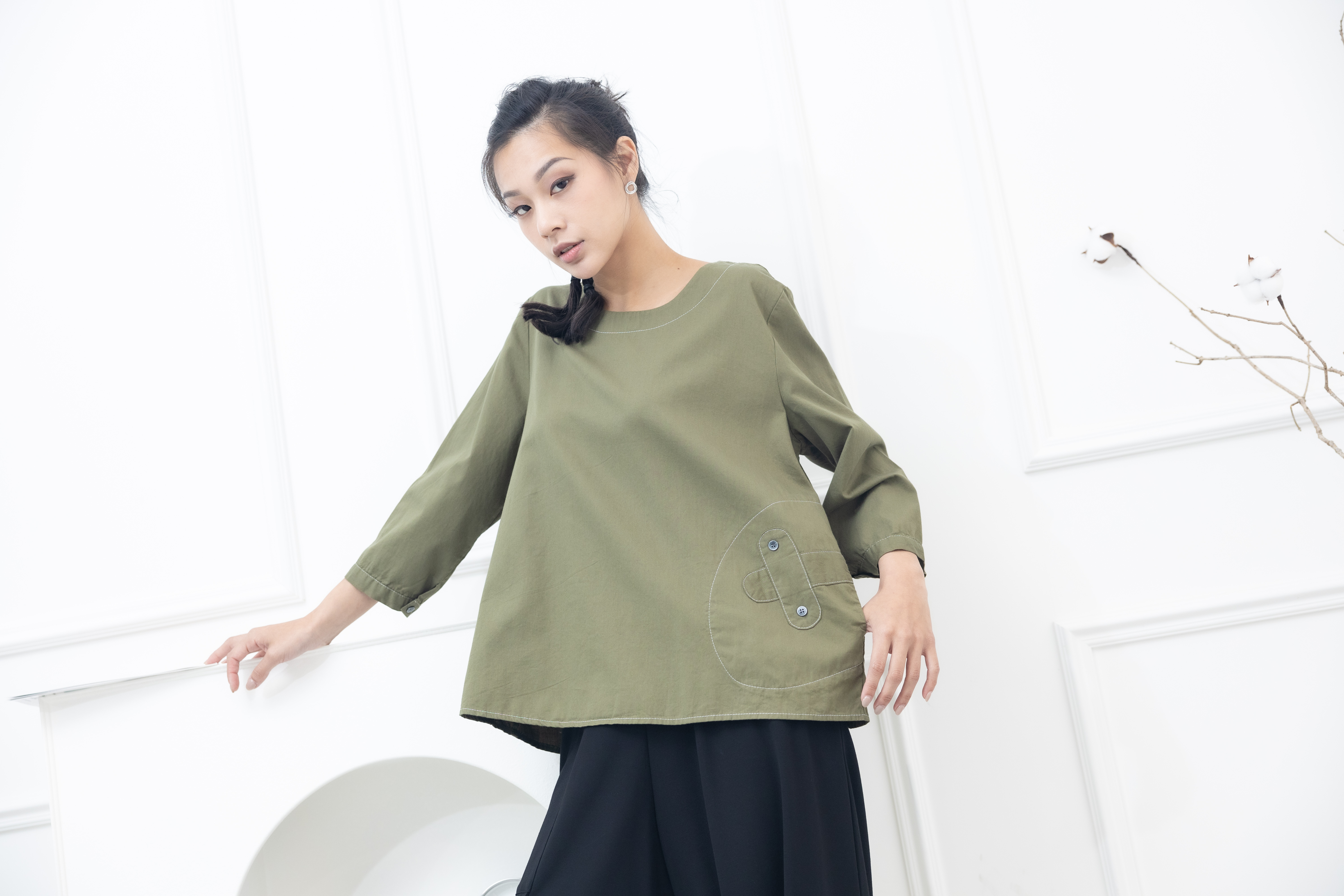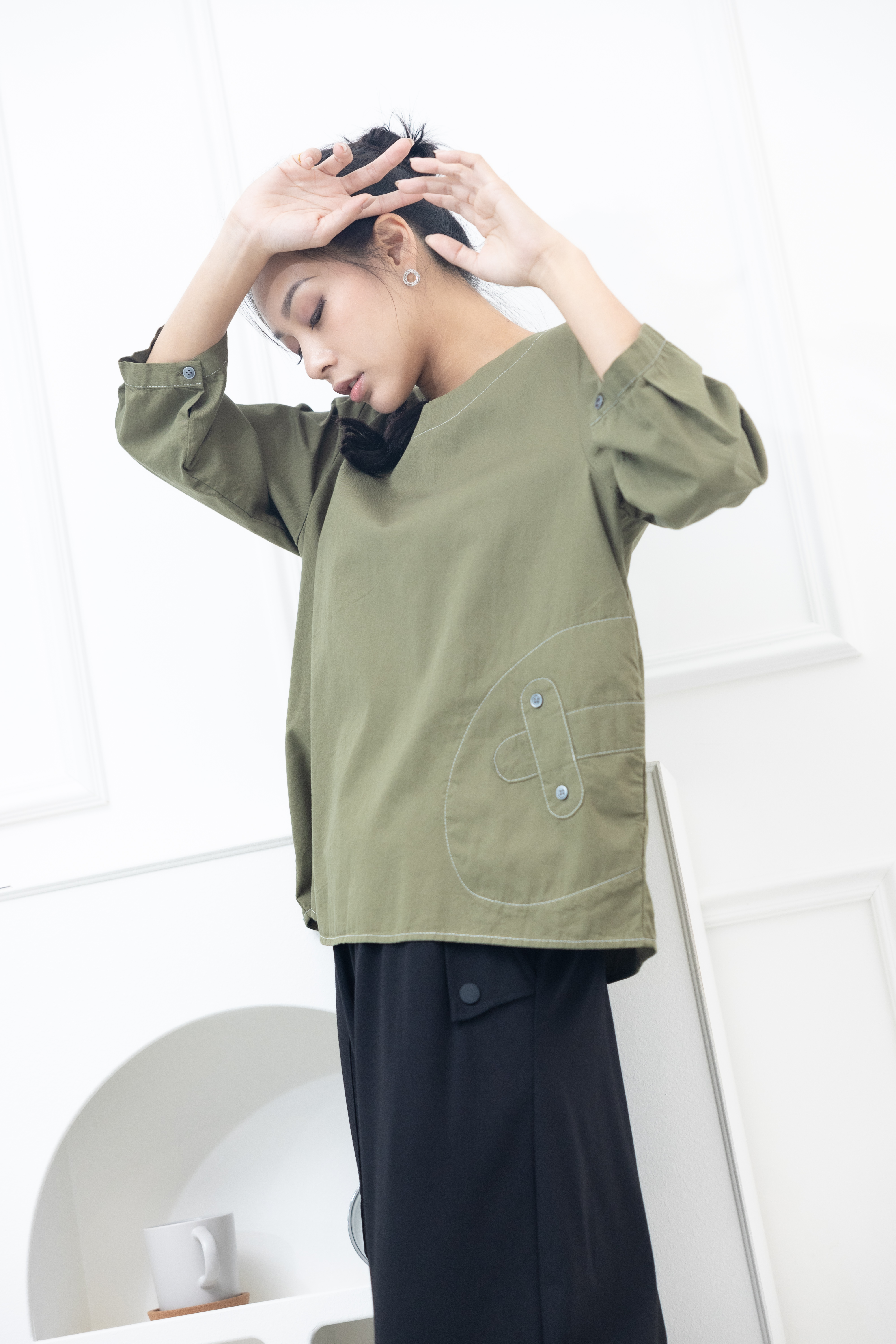 긴팔 腰間X裝飾上衣 / 墨綠色