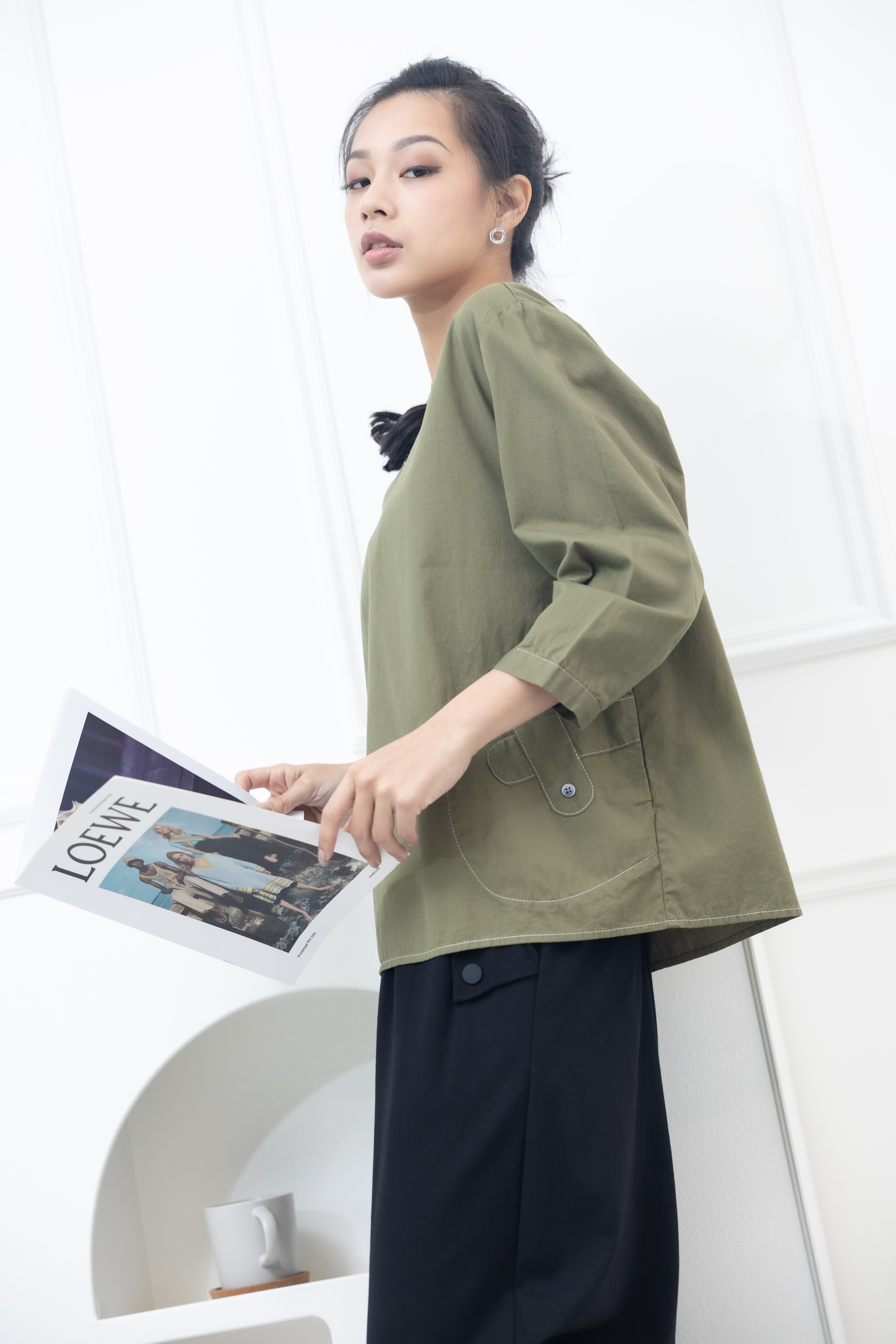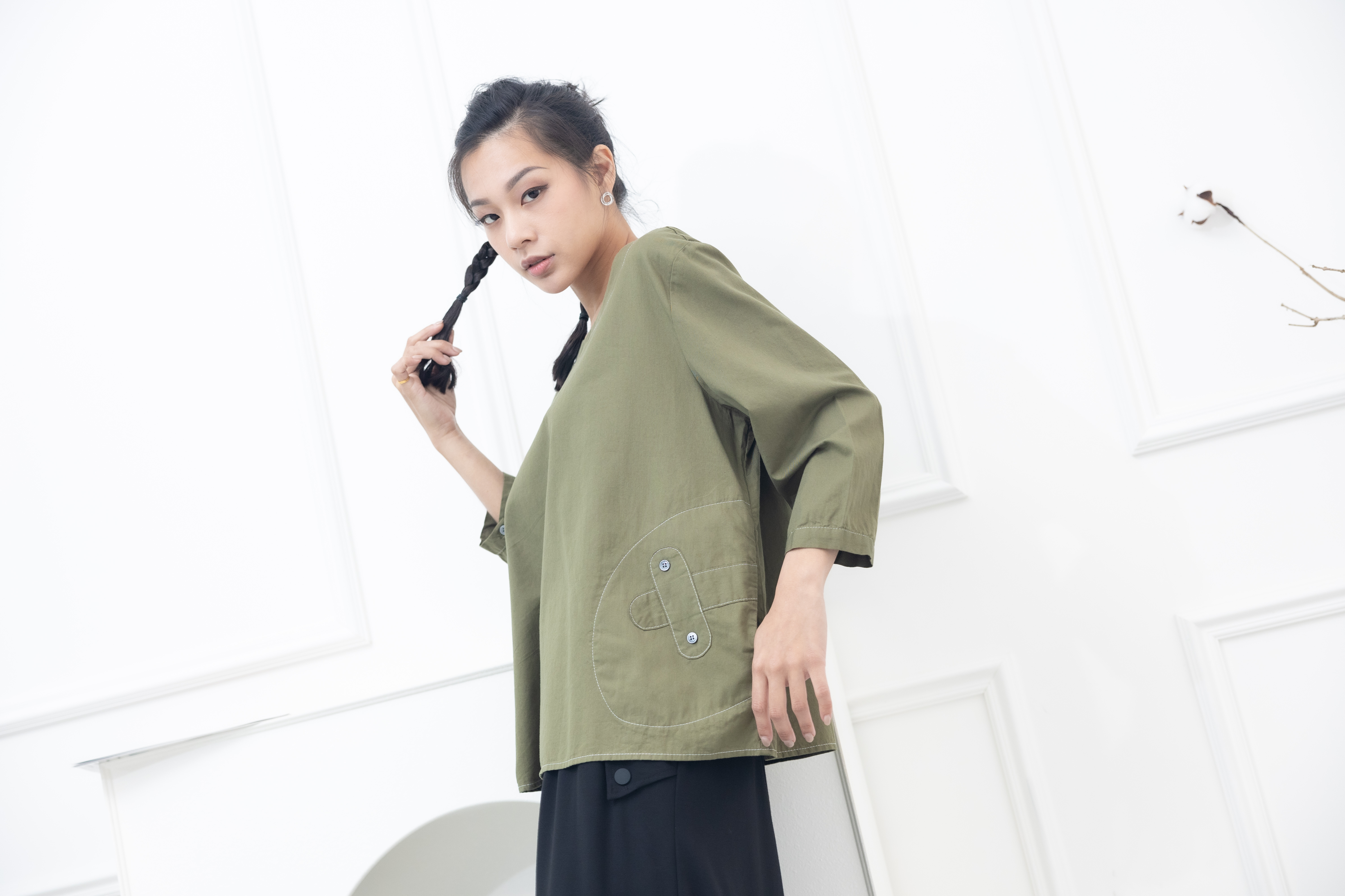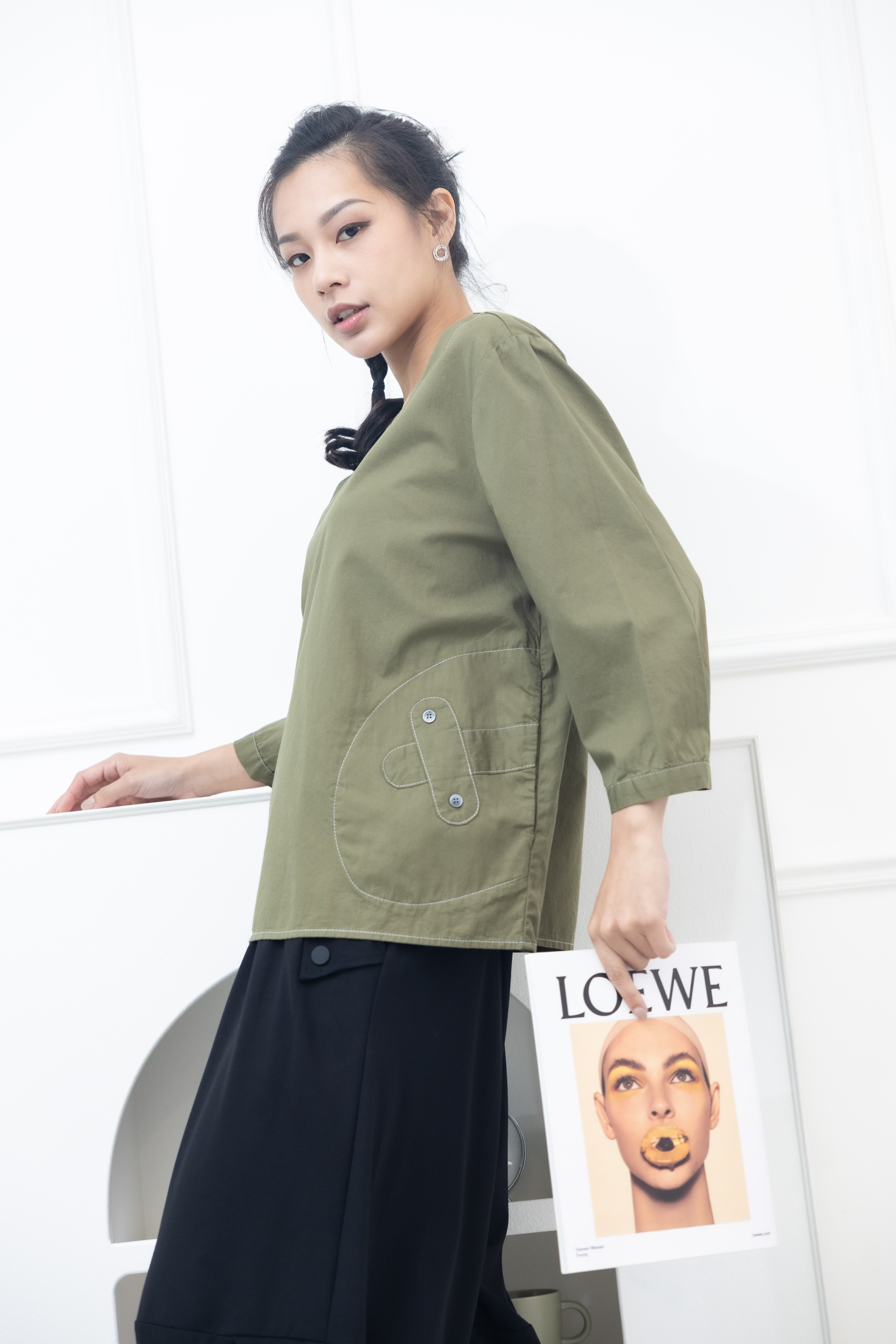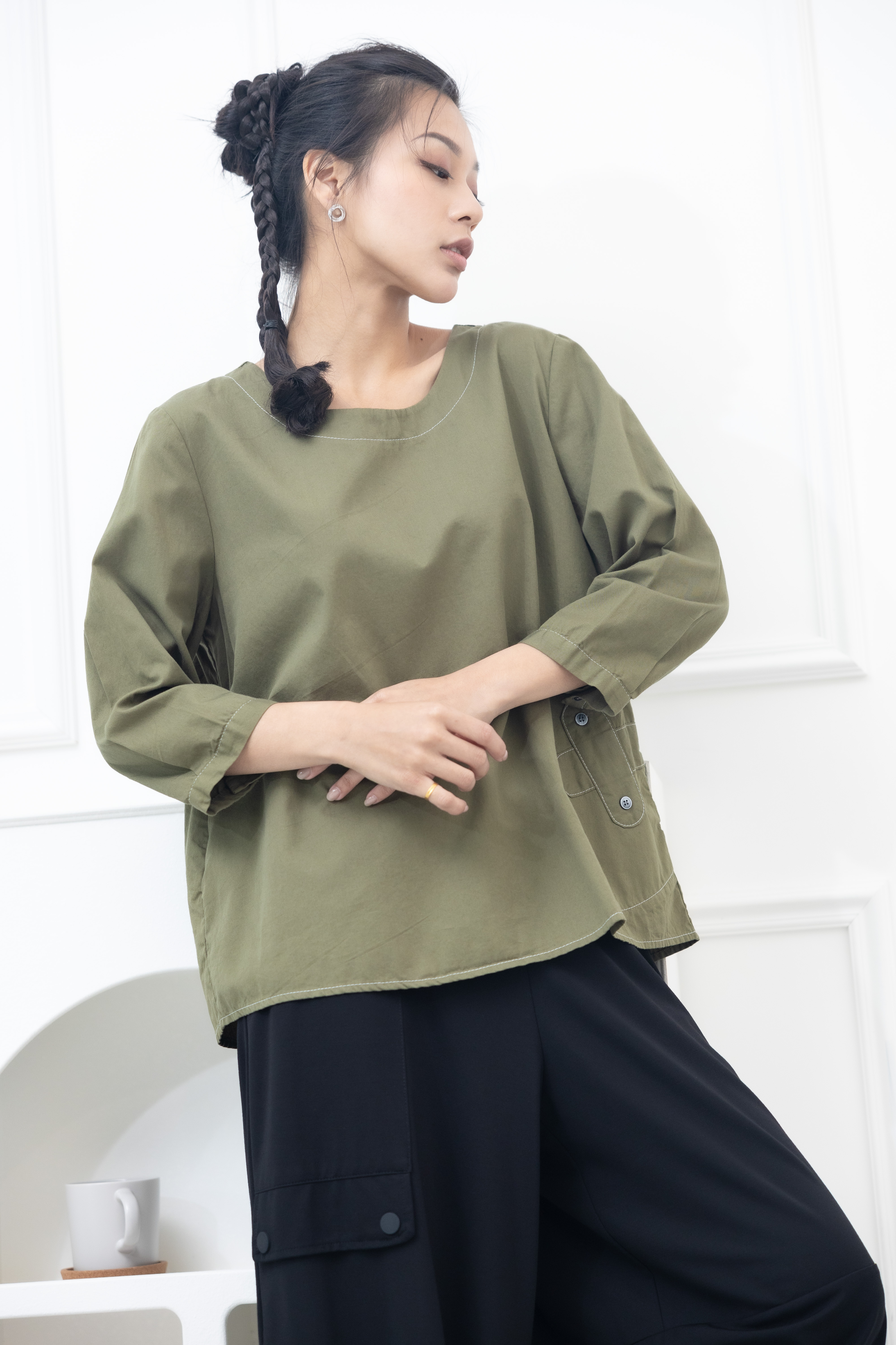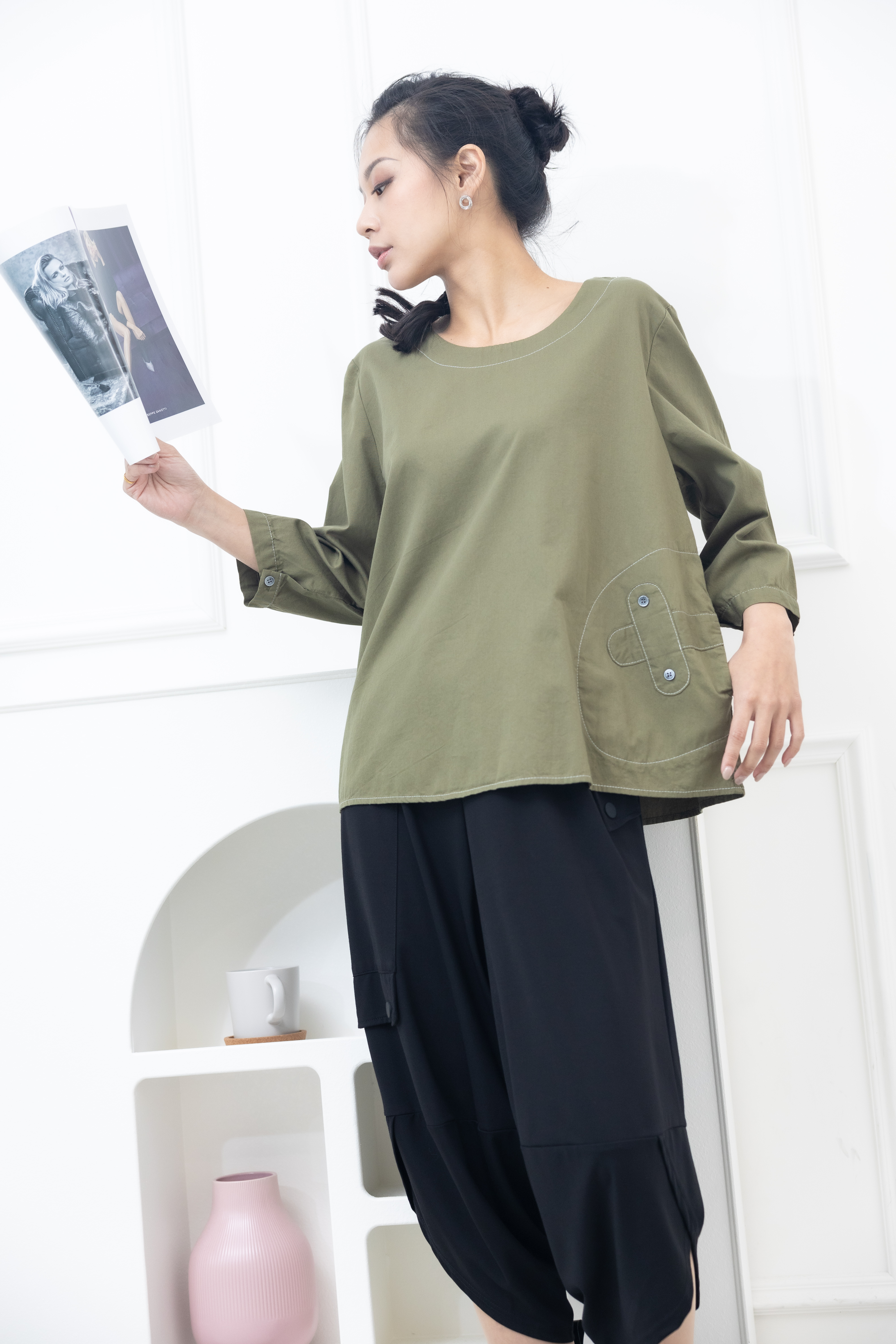 긴팔 腰間X裝飾上衣 / 墨綠色