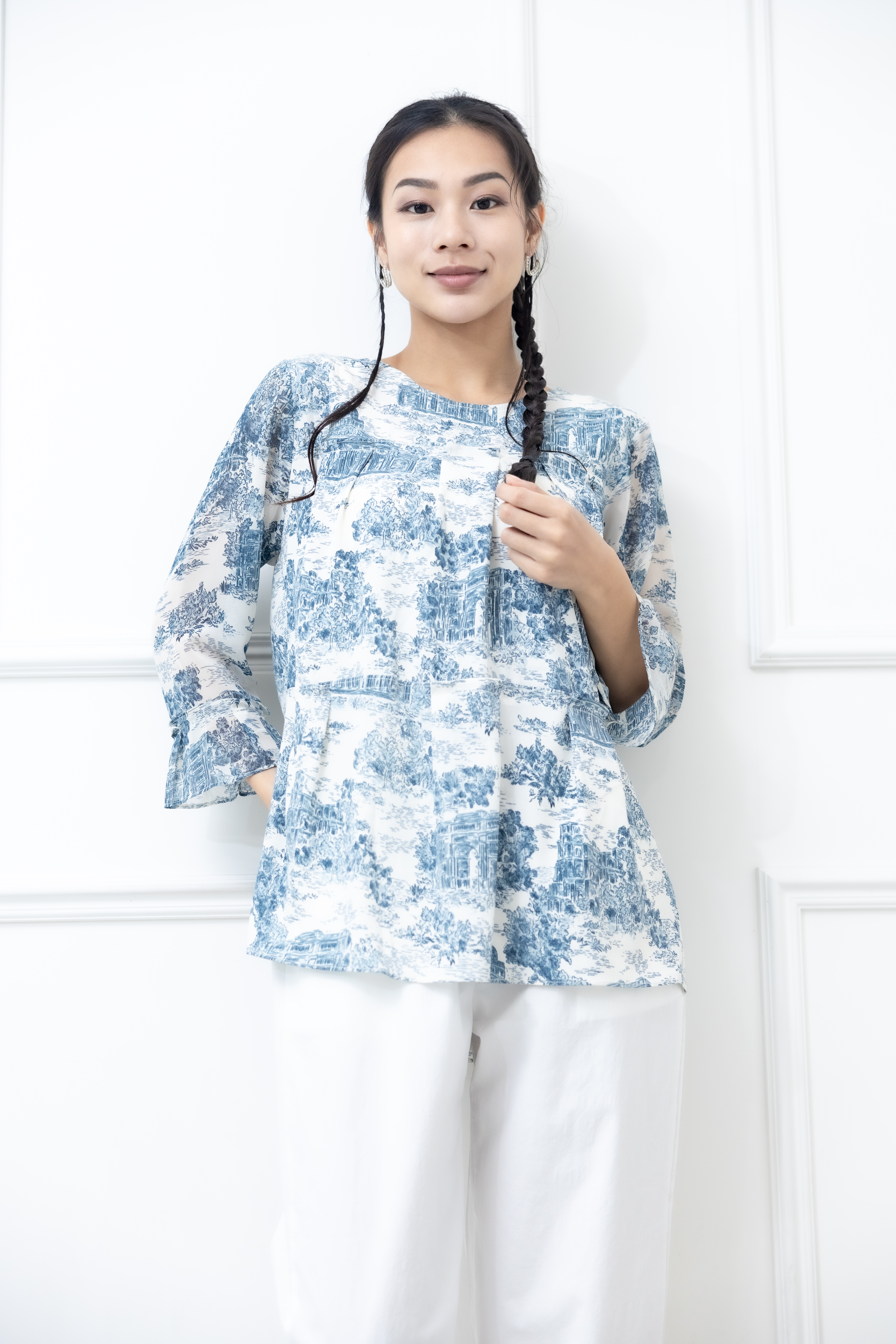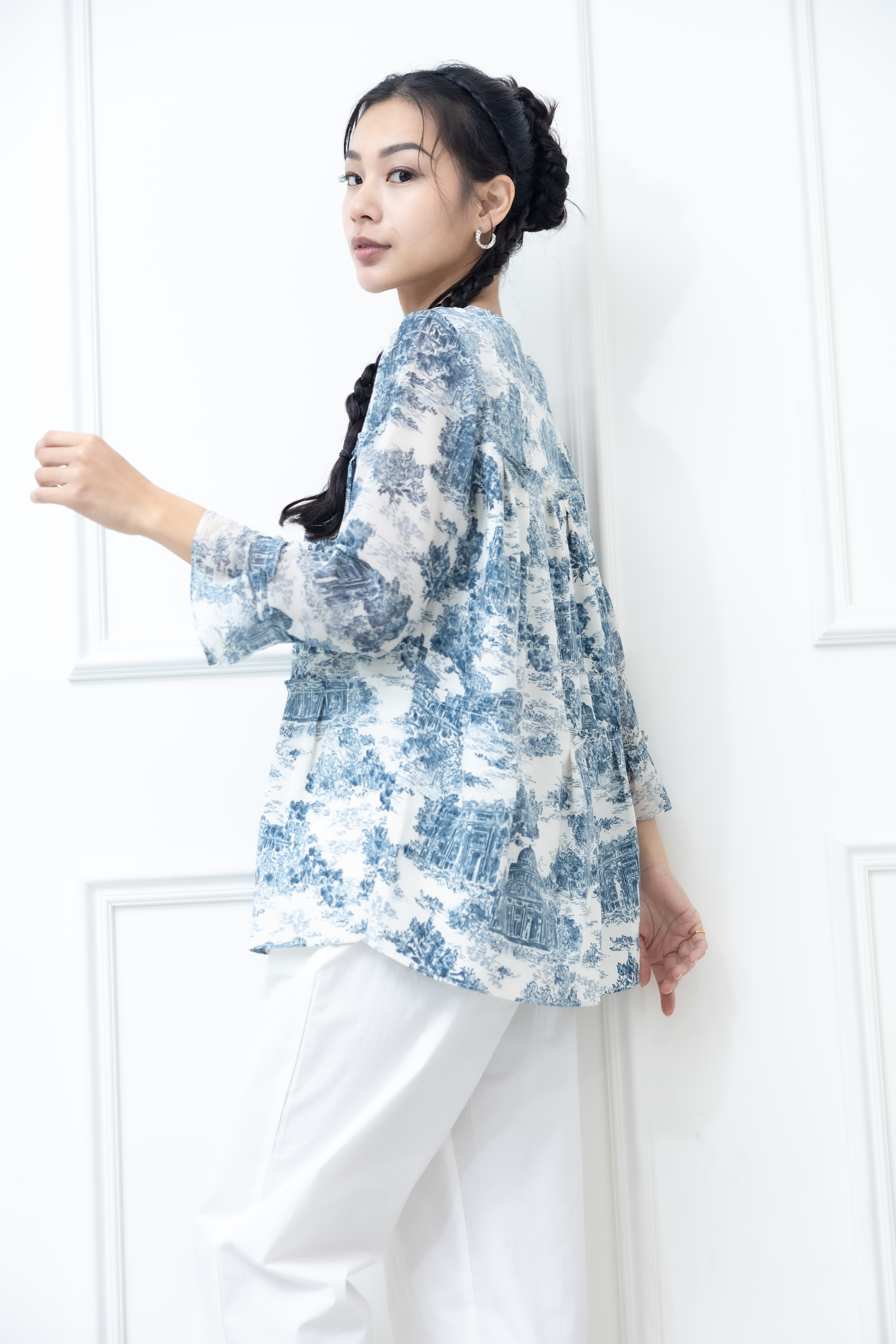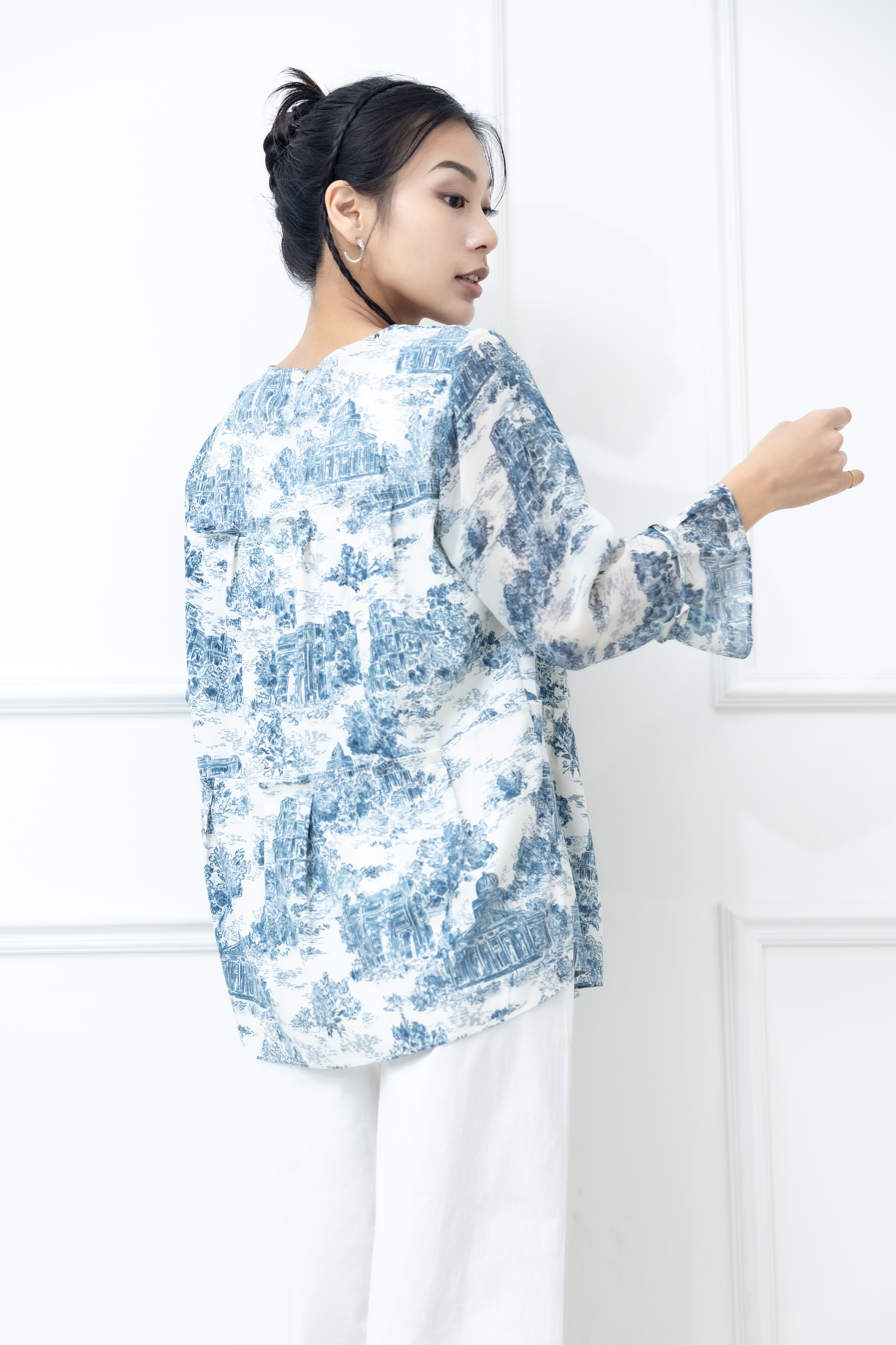 긴팔 藍色建築物喇叭袖長袖上衣 / 白色