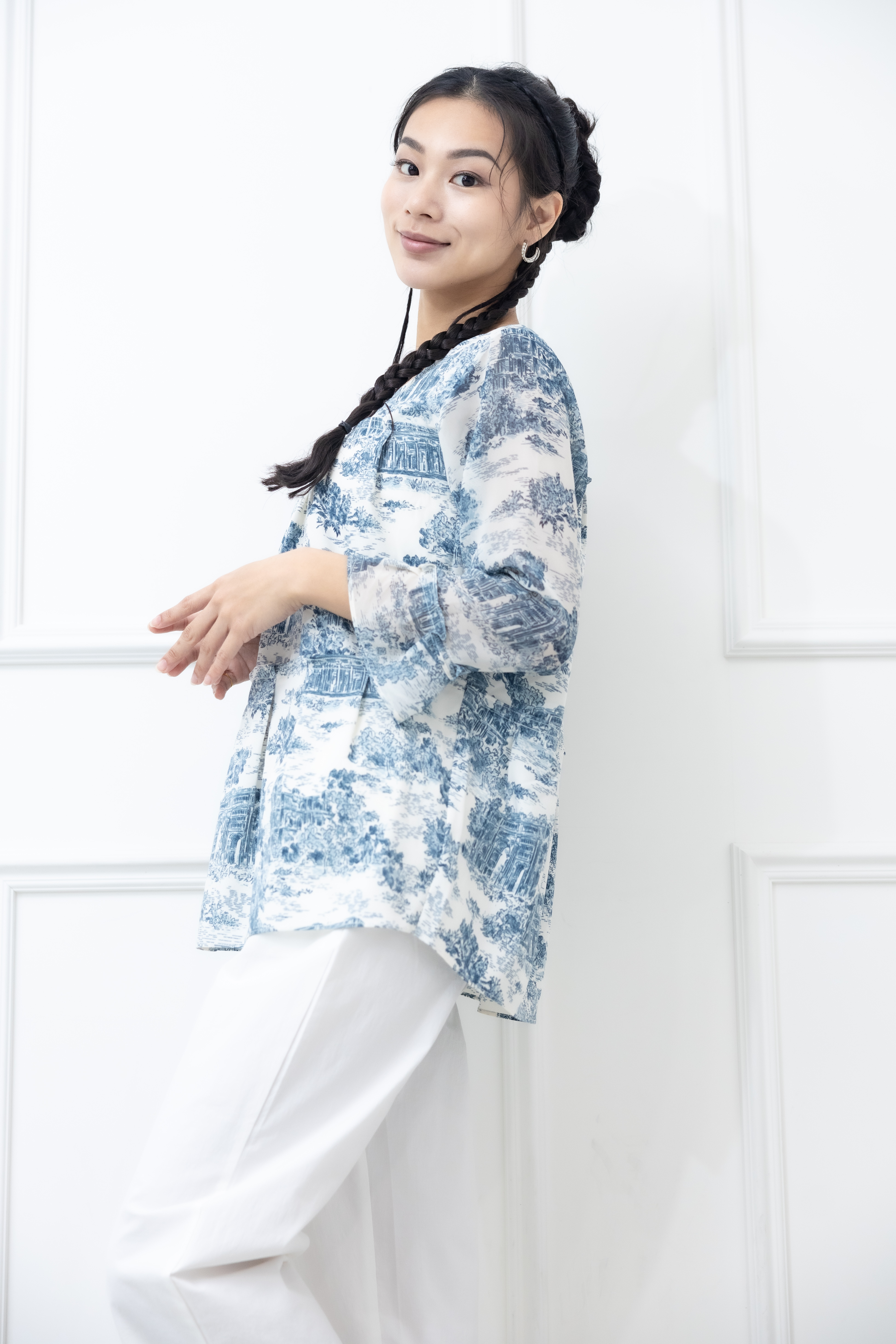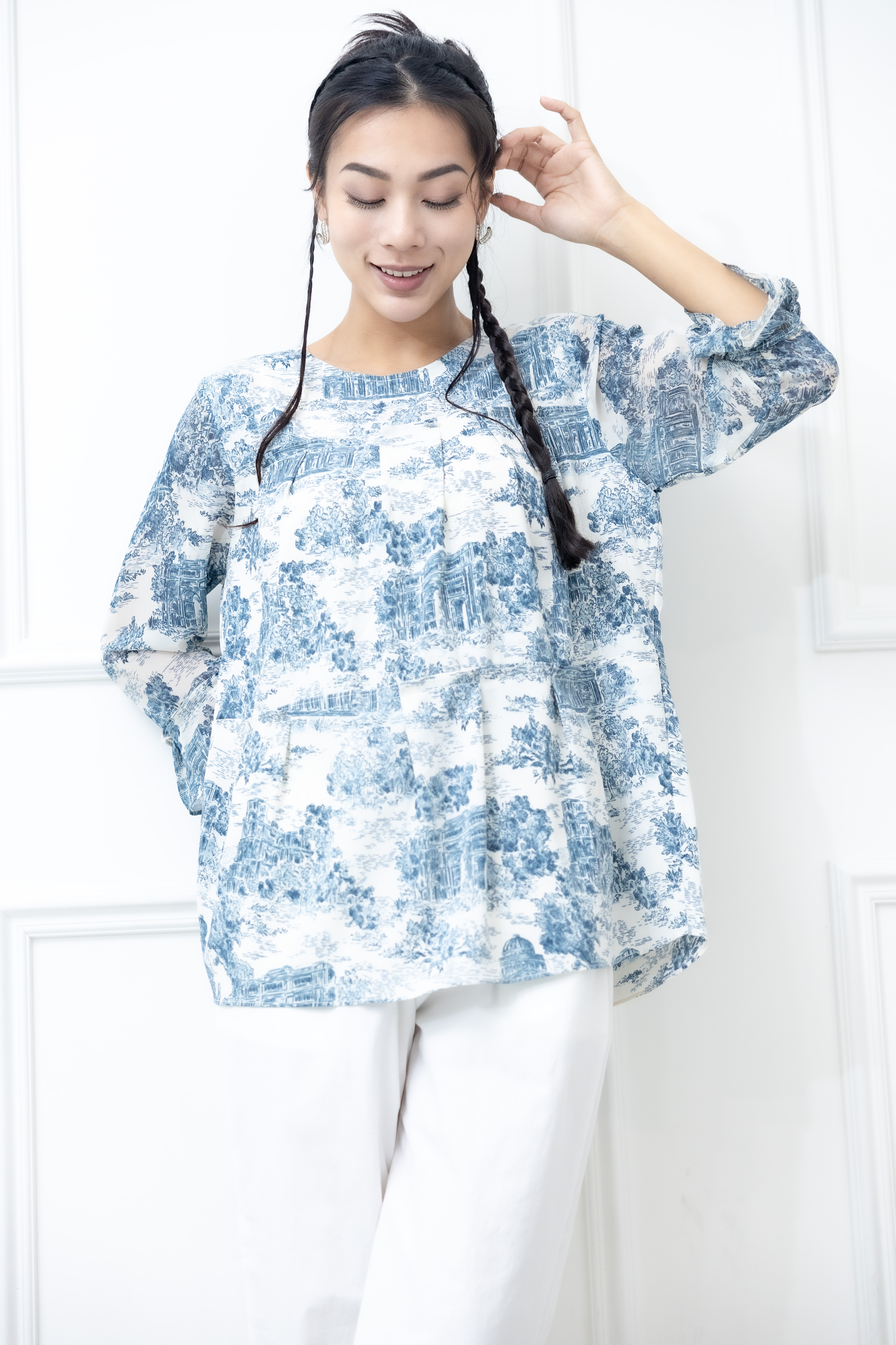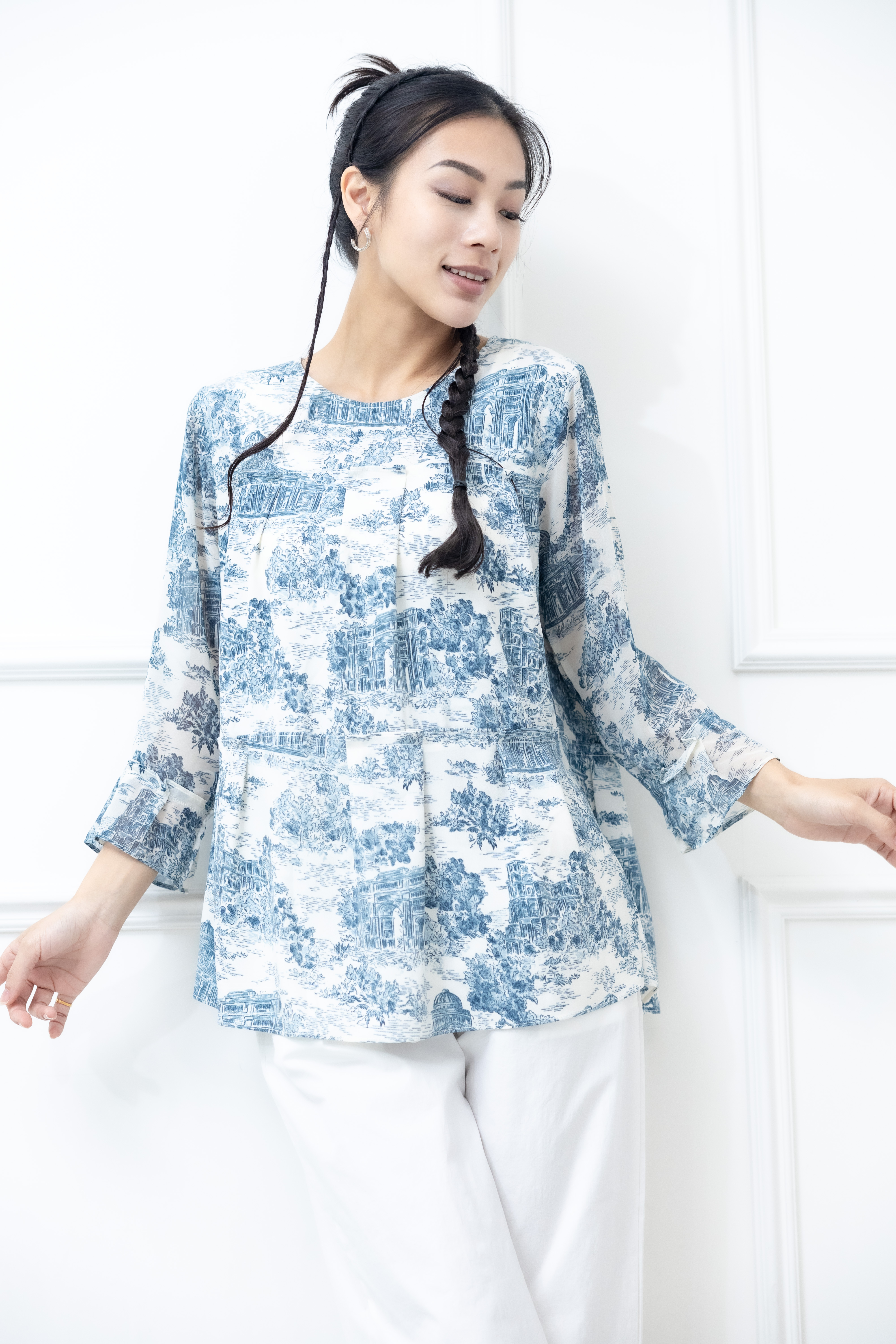 긴팔 藍色建築物喇叭袖長袖上衣 / 白色
