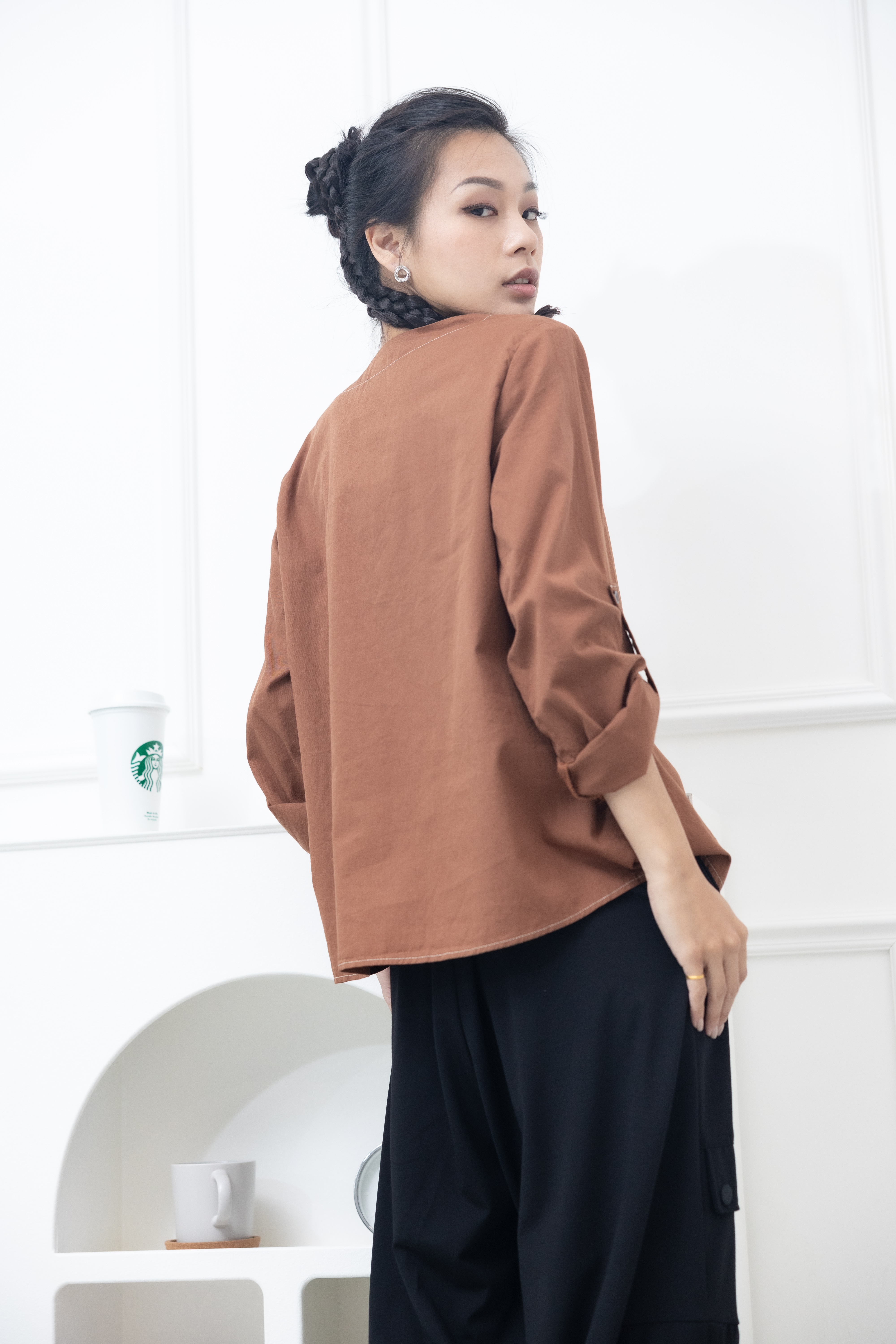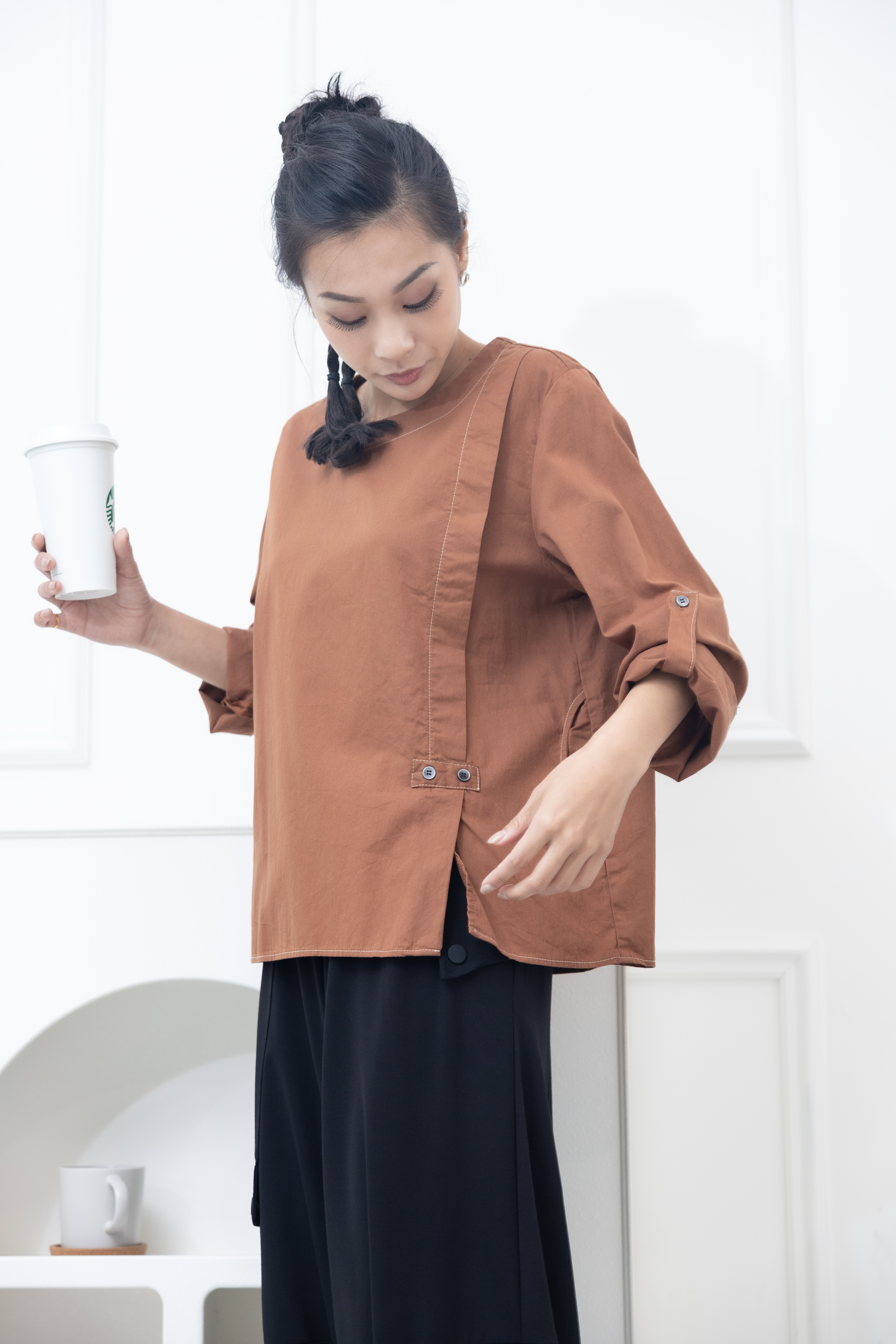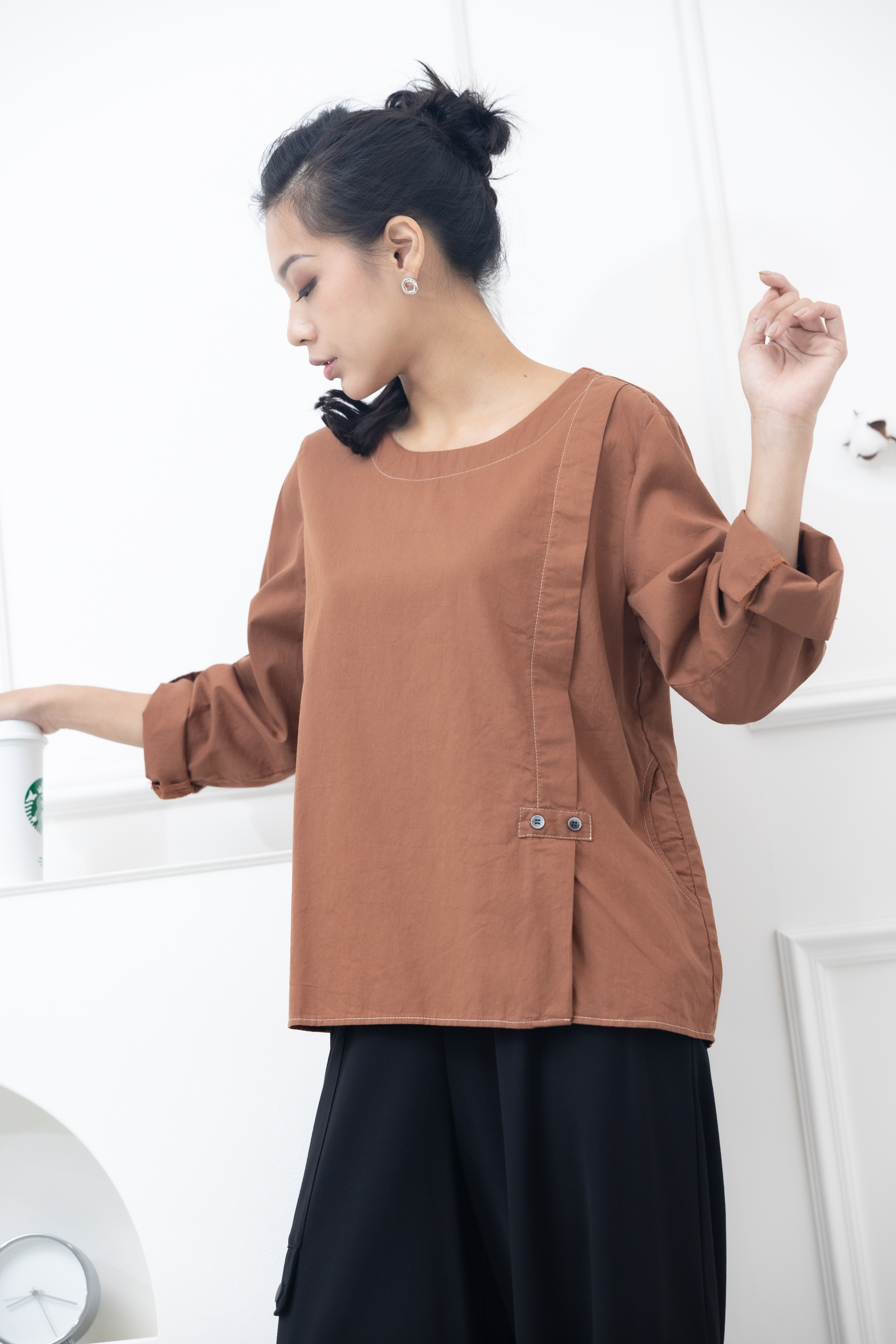긴팔 袖子鈕扣長袖上衣 / 紅棕色