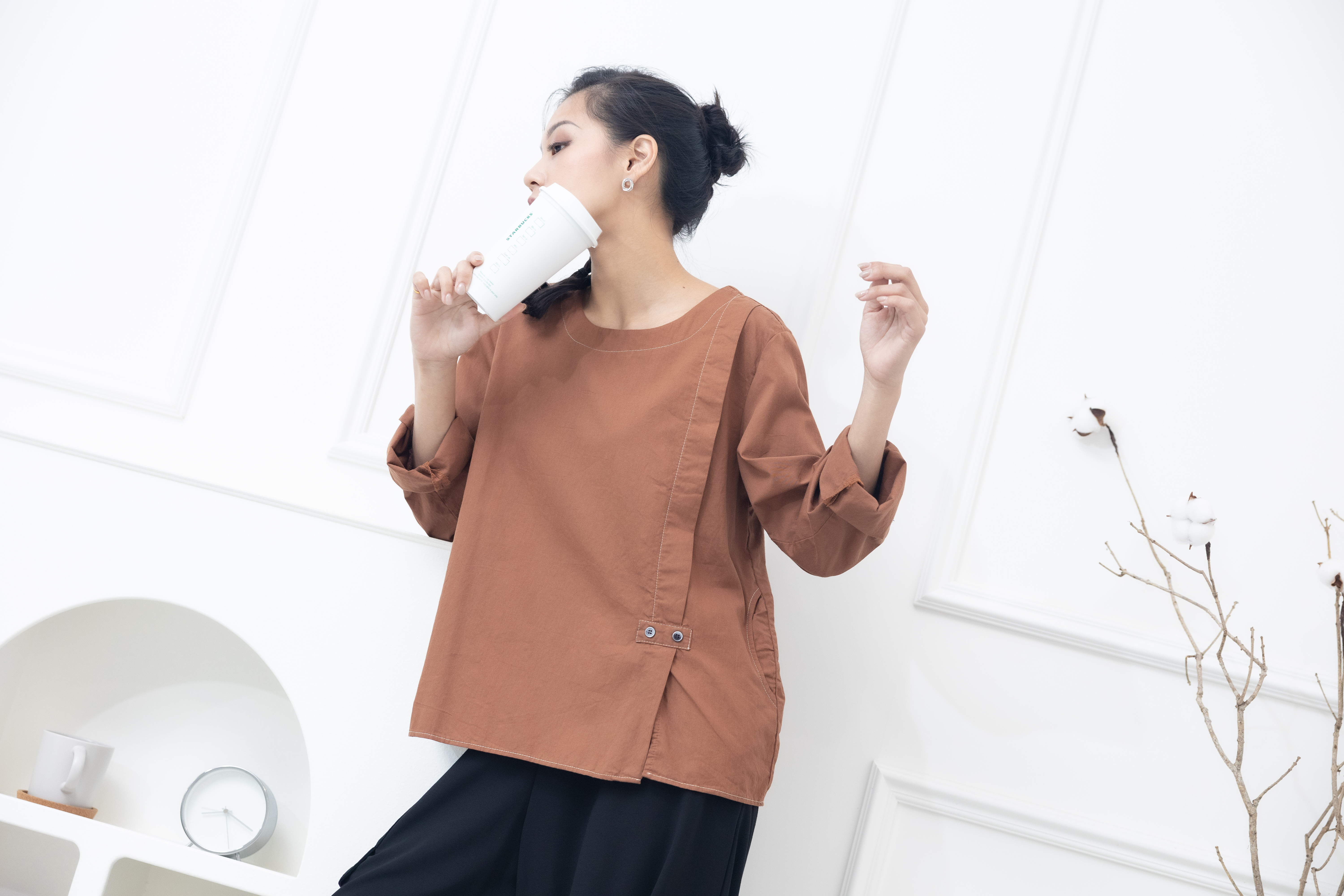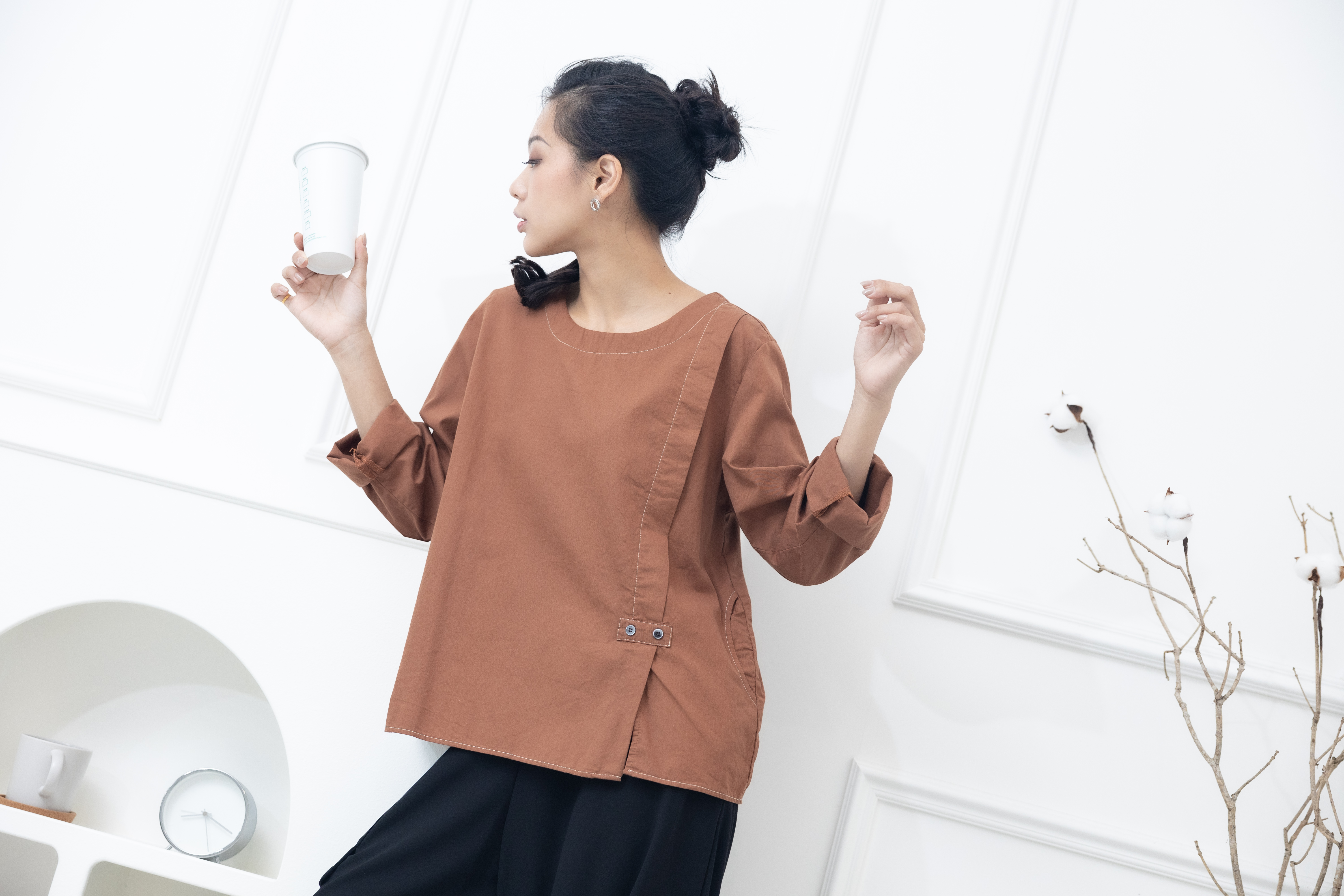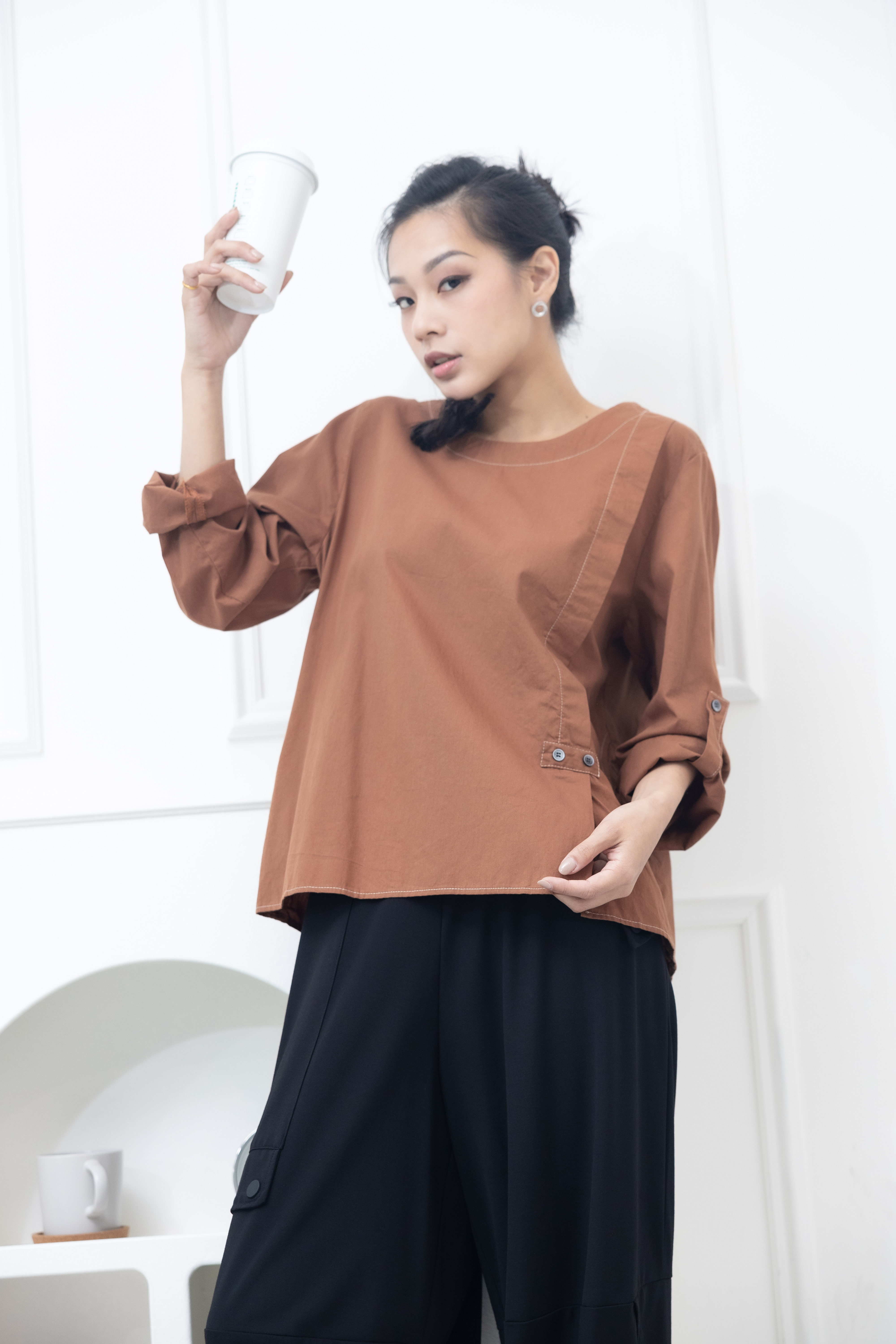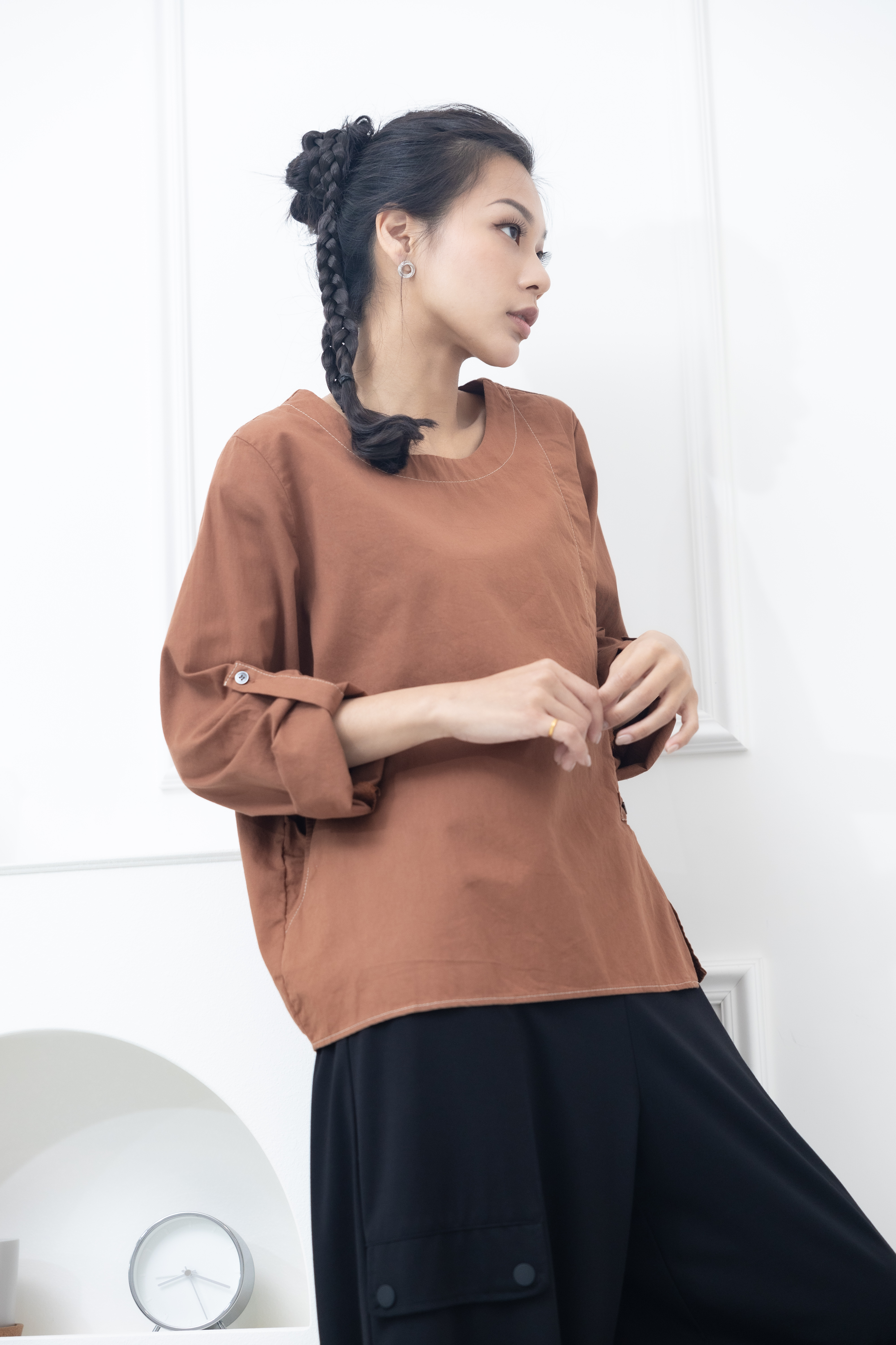 긴팔 袖子鈕扣長袖上衣 / 紅棕色