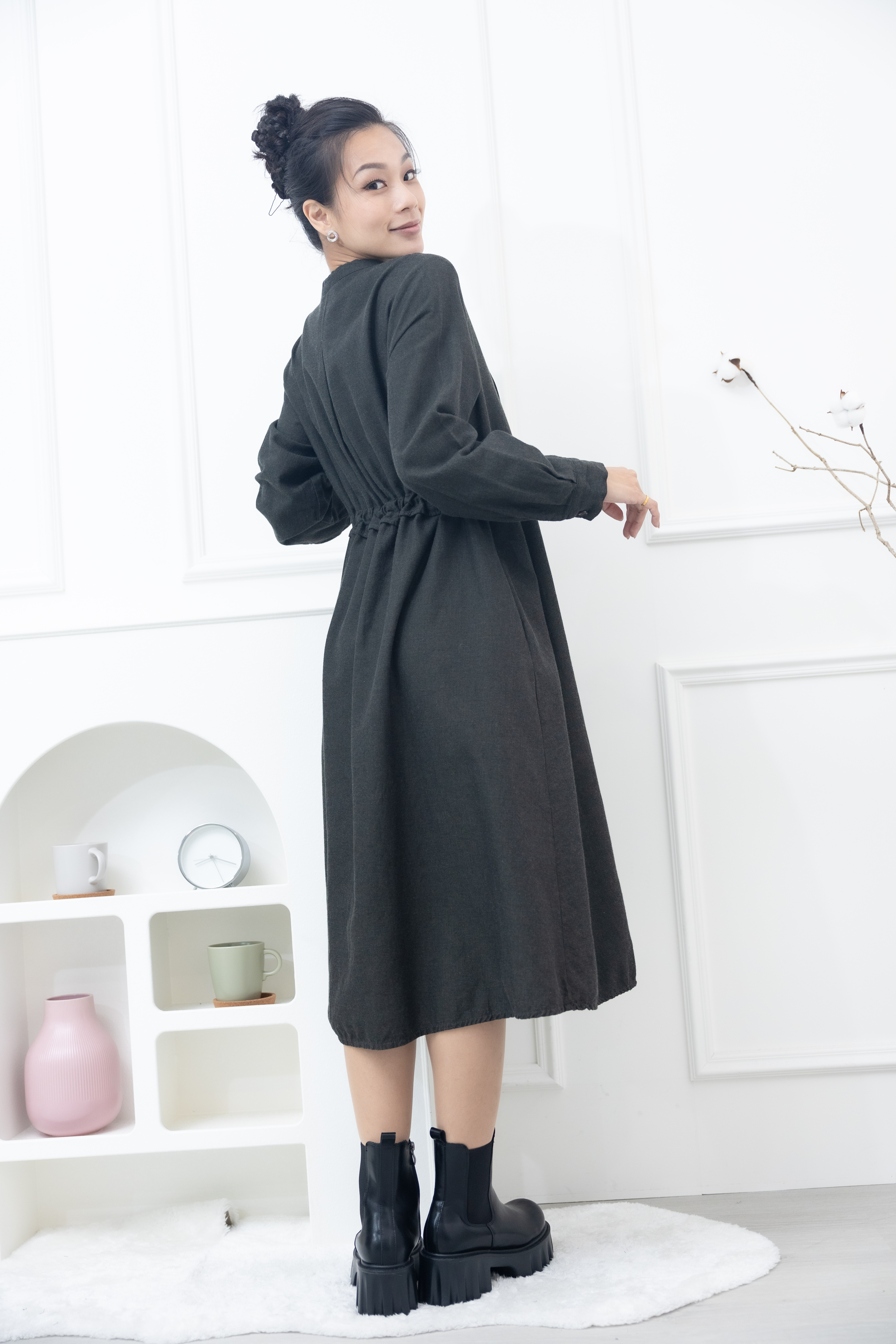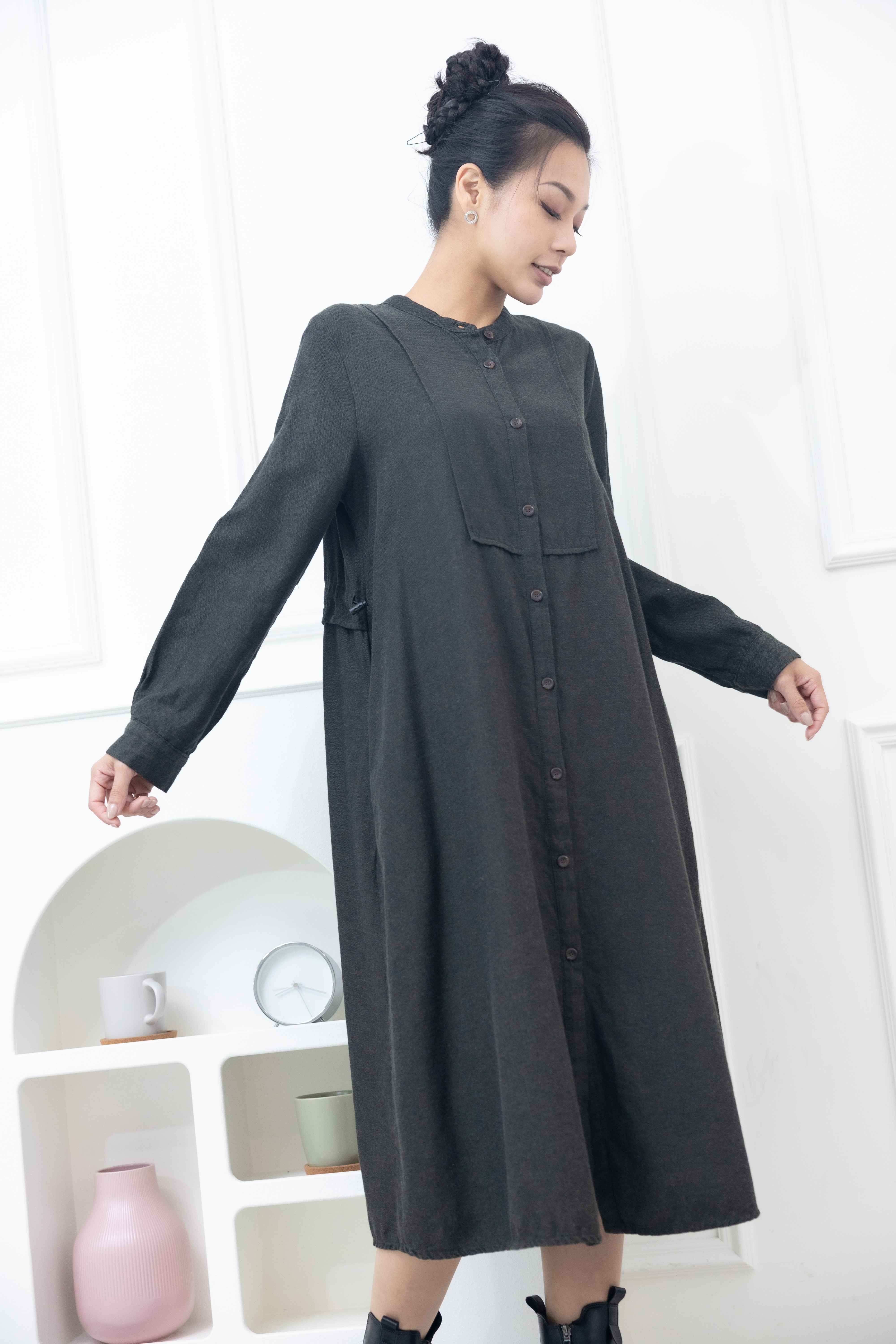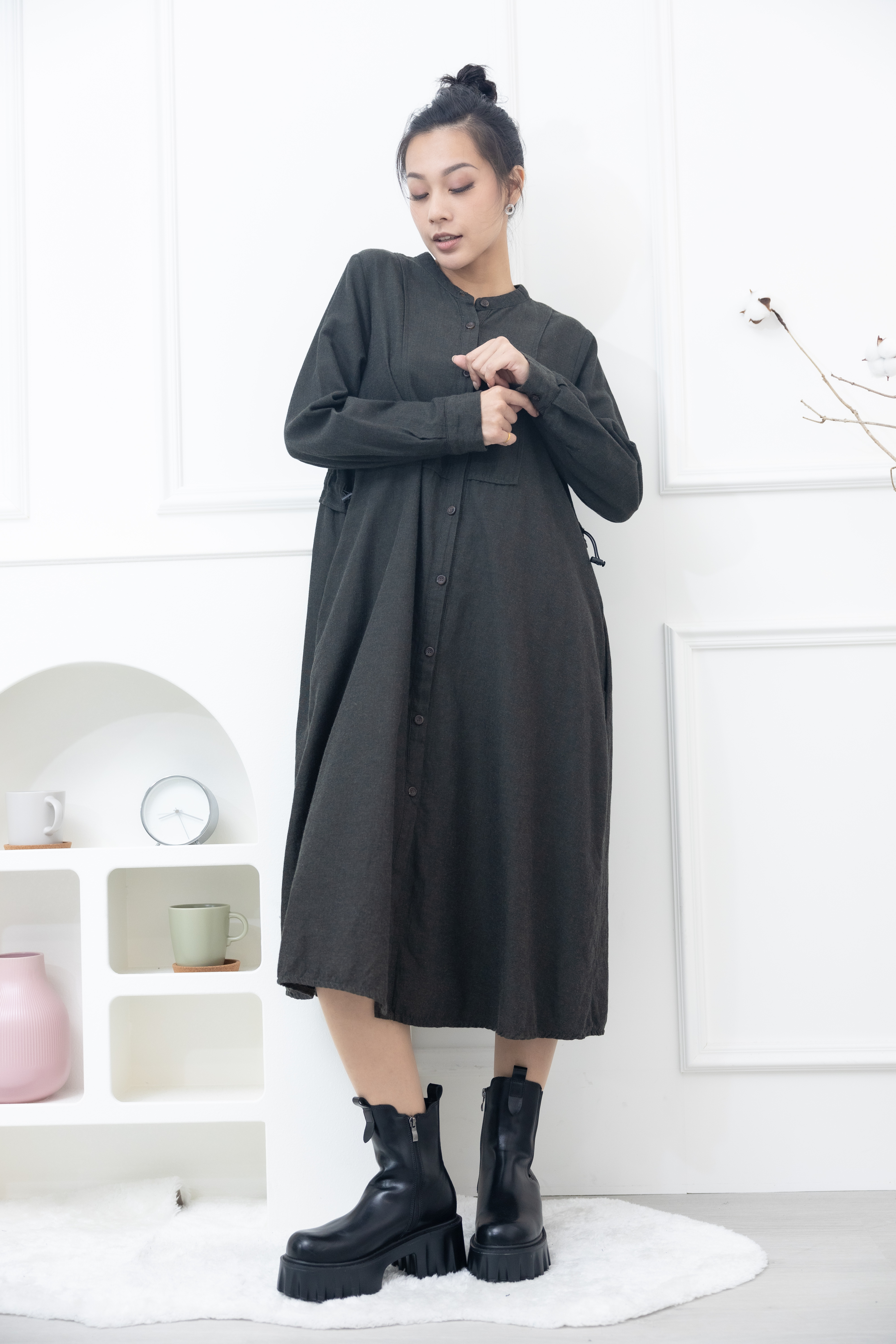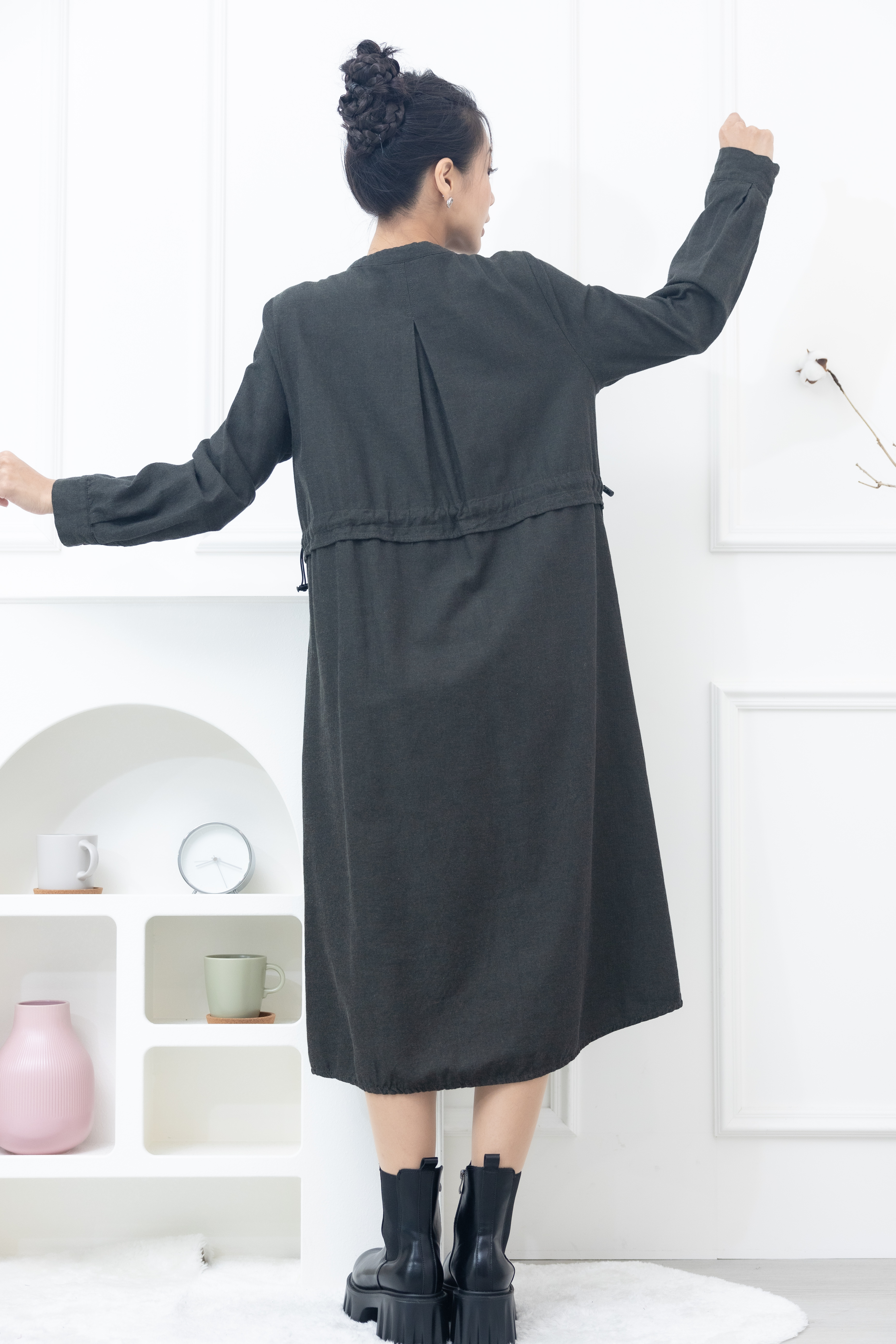 긴팔 開襟背後抽繩長版襯衫 / 綠色