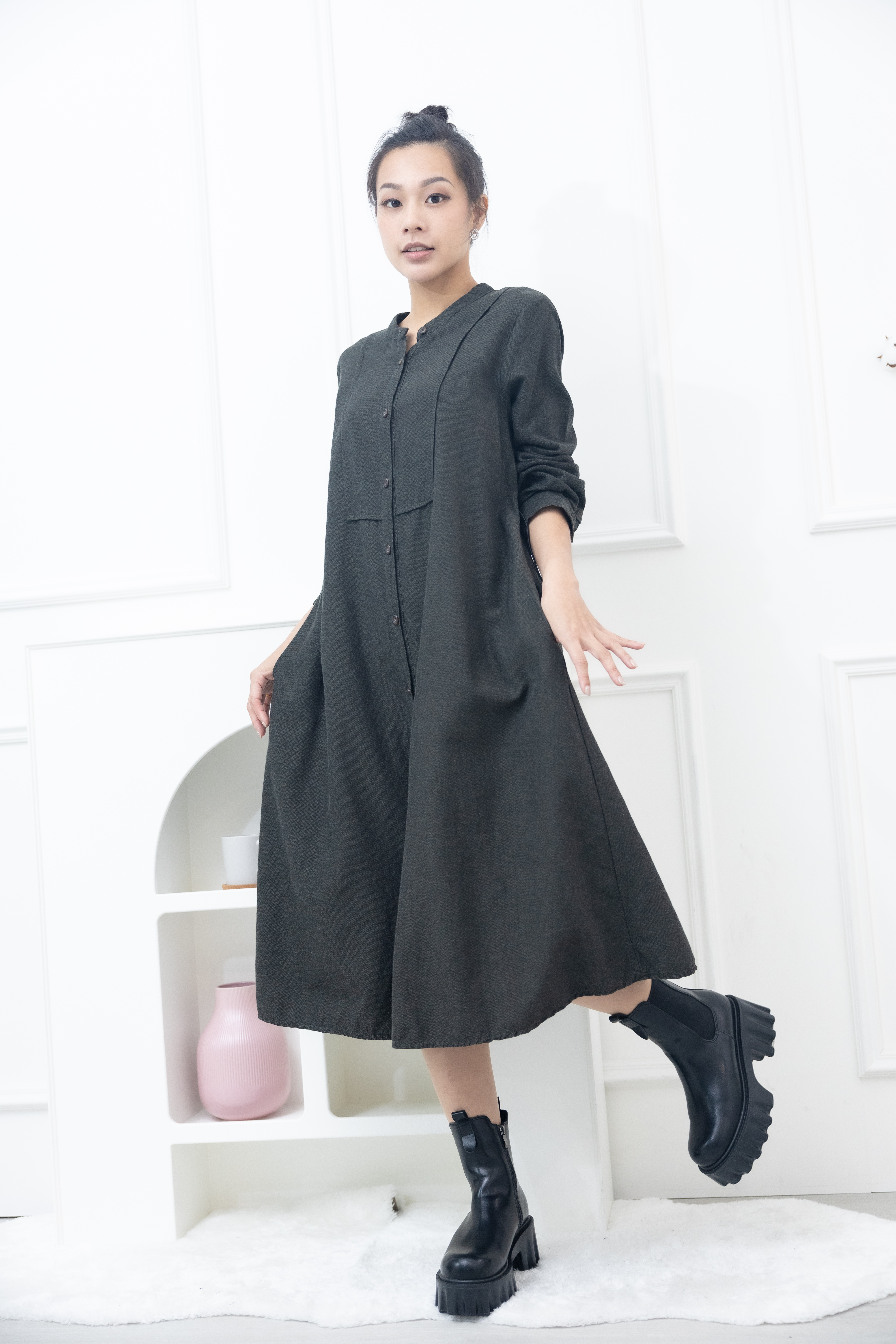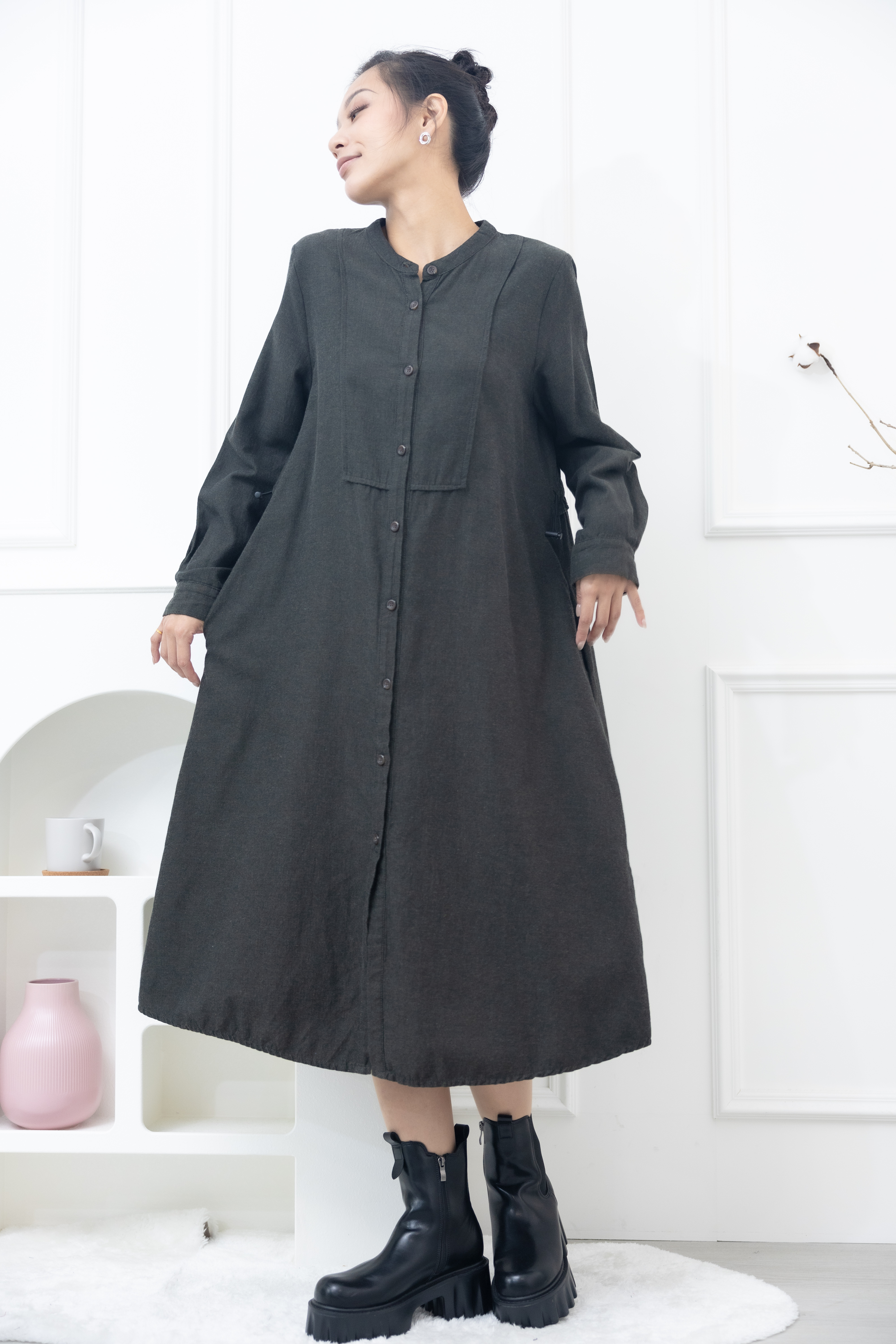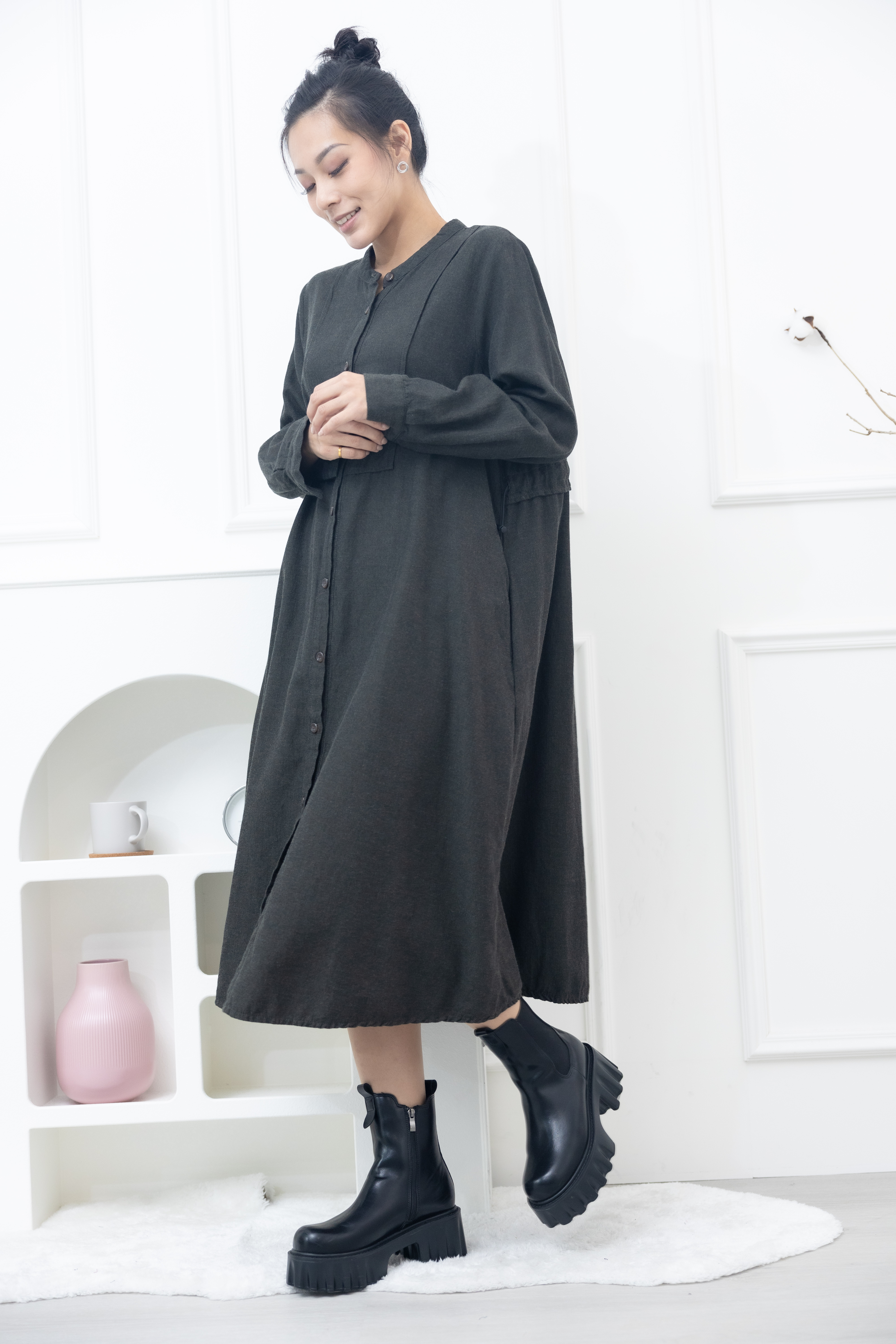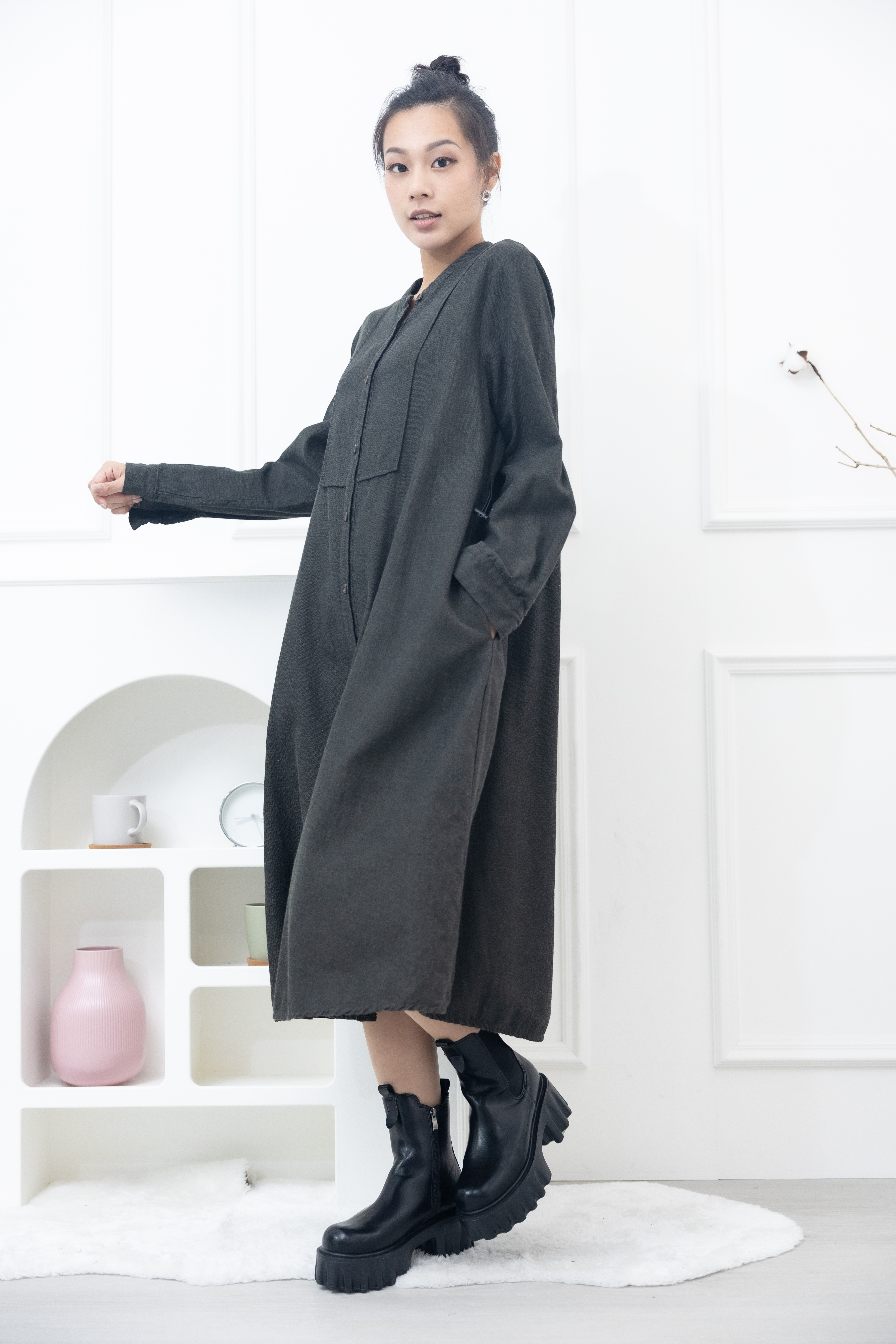 긴팔 開襟背後抽繩長版襯衫 / 綠色