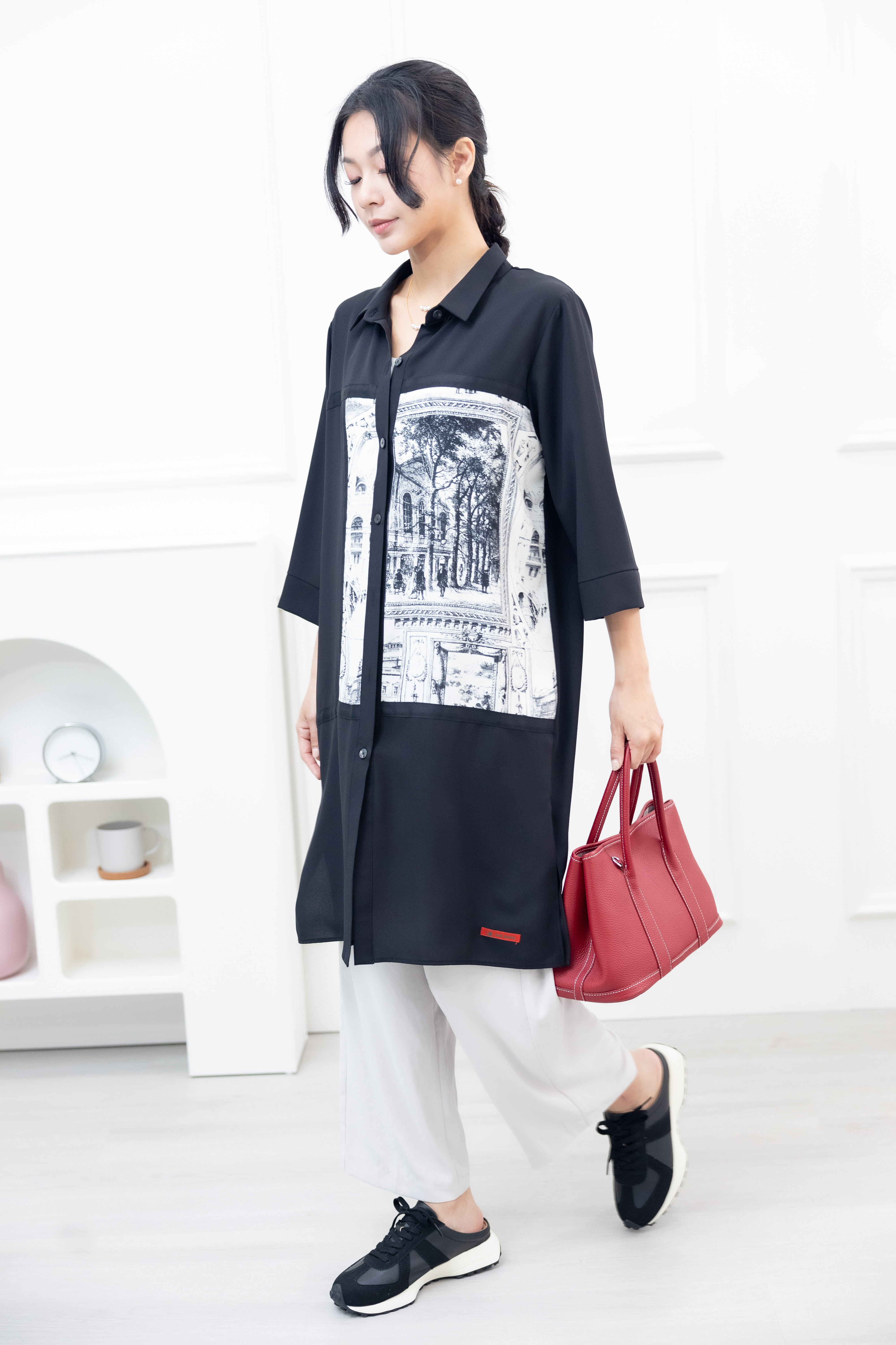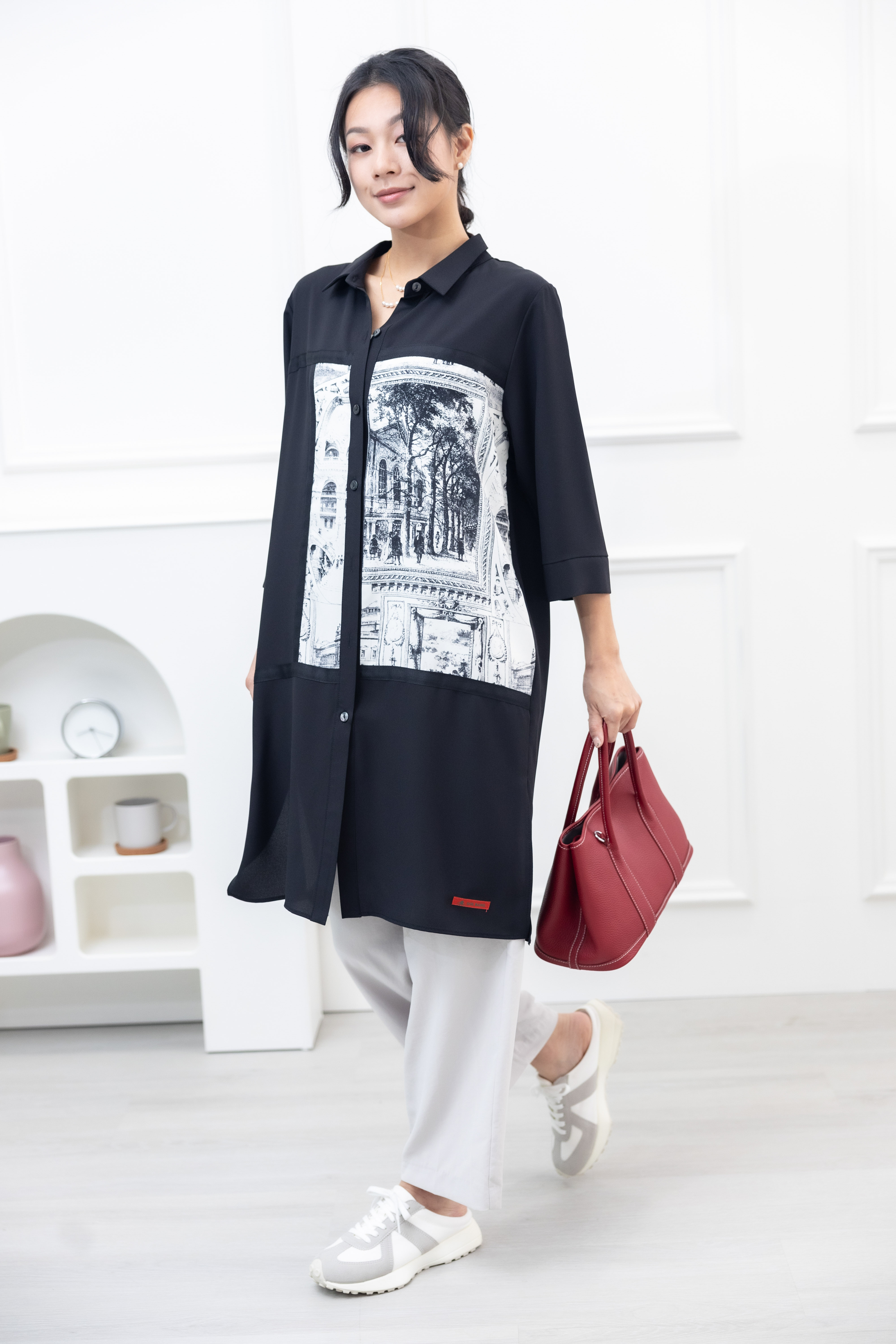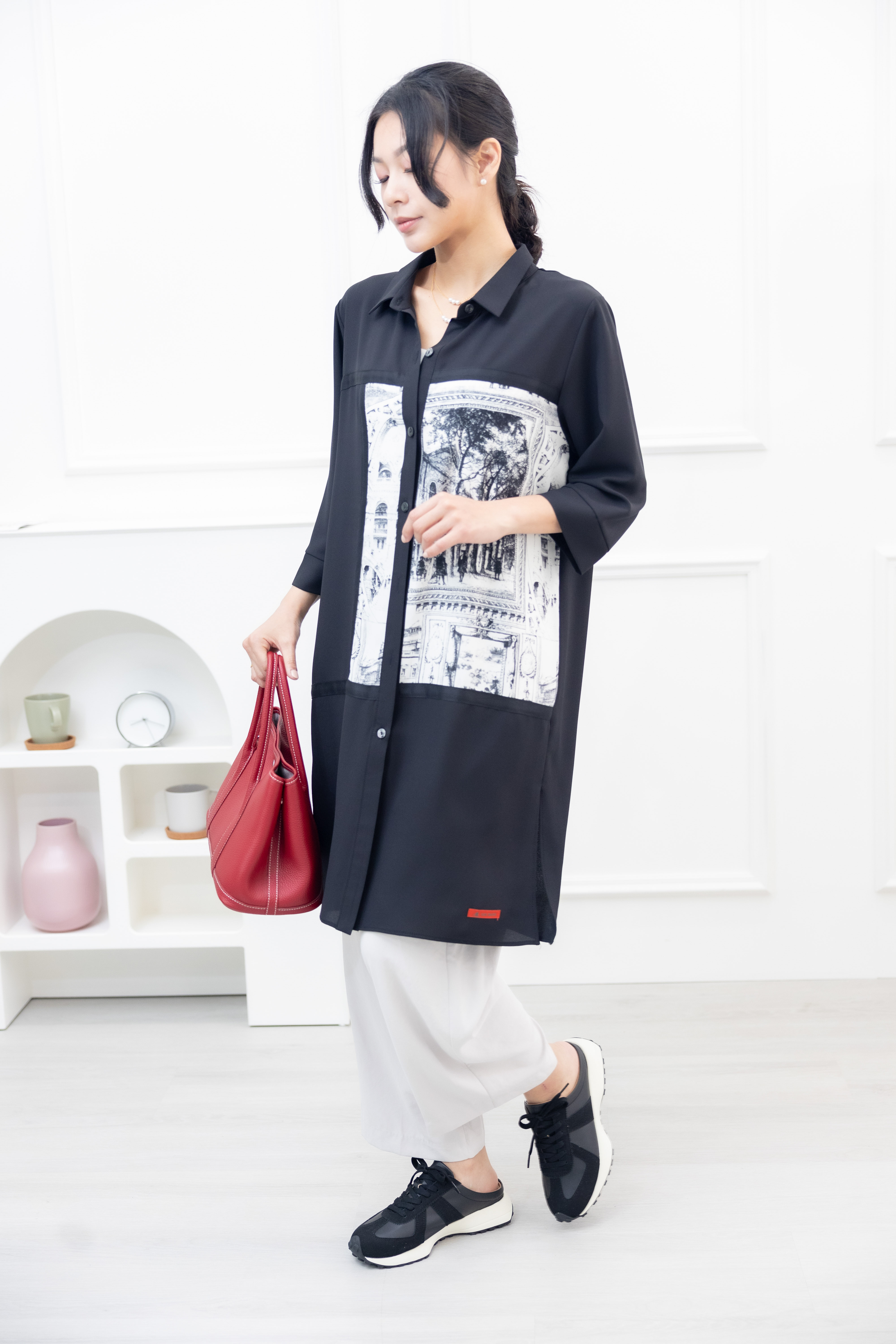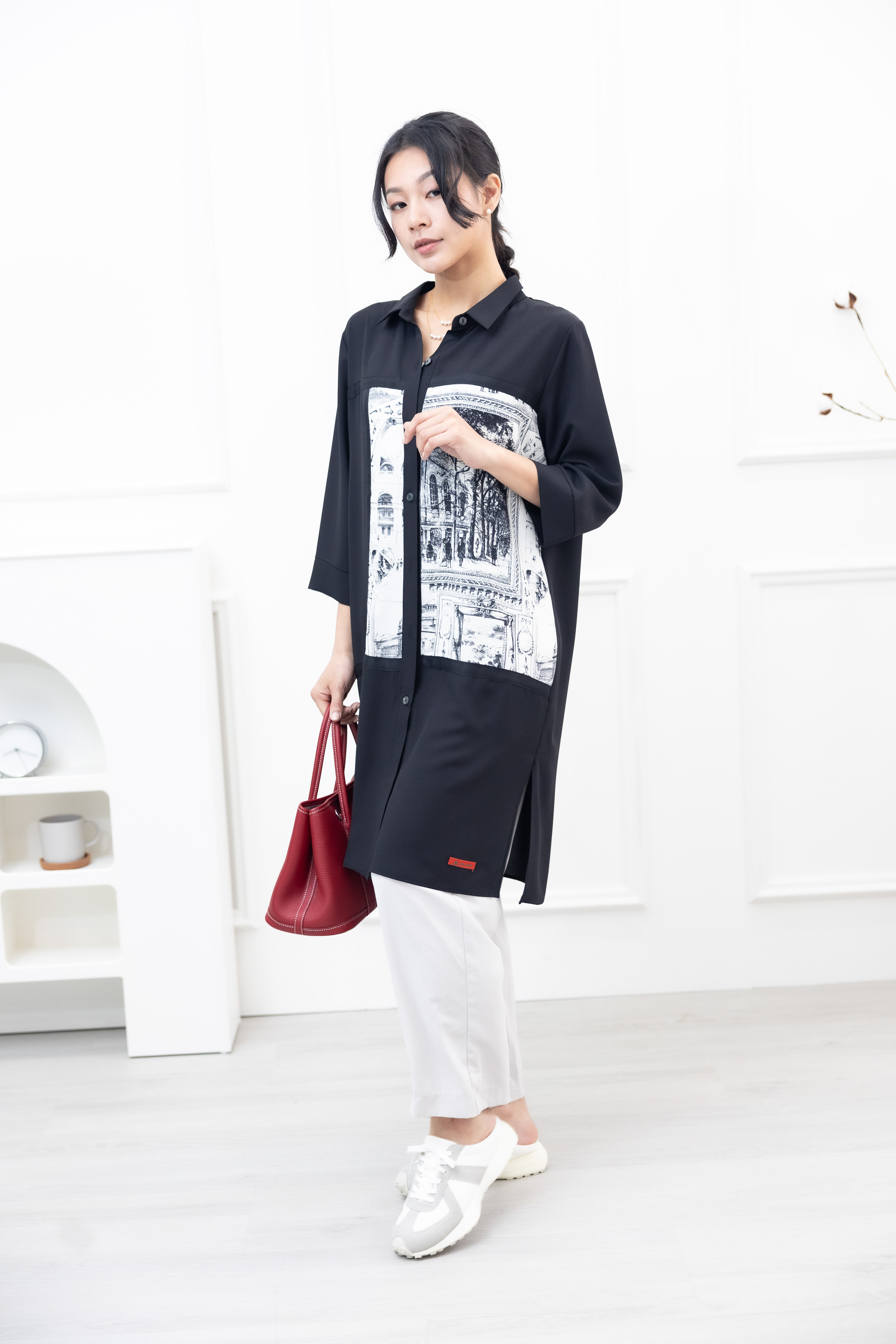 긴팔 風景照印花拼接黑緞帶長版上衣 / 黑色