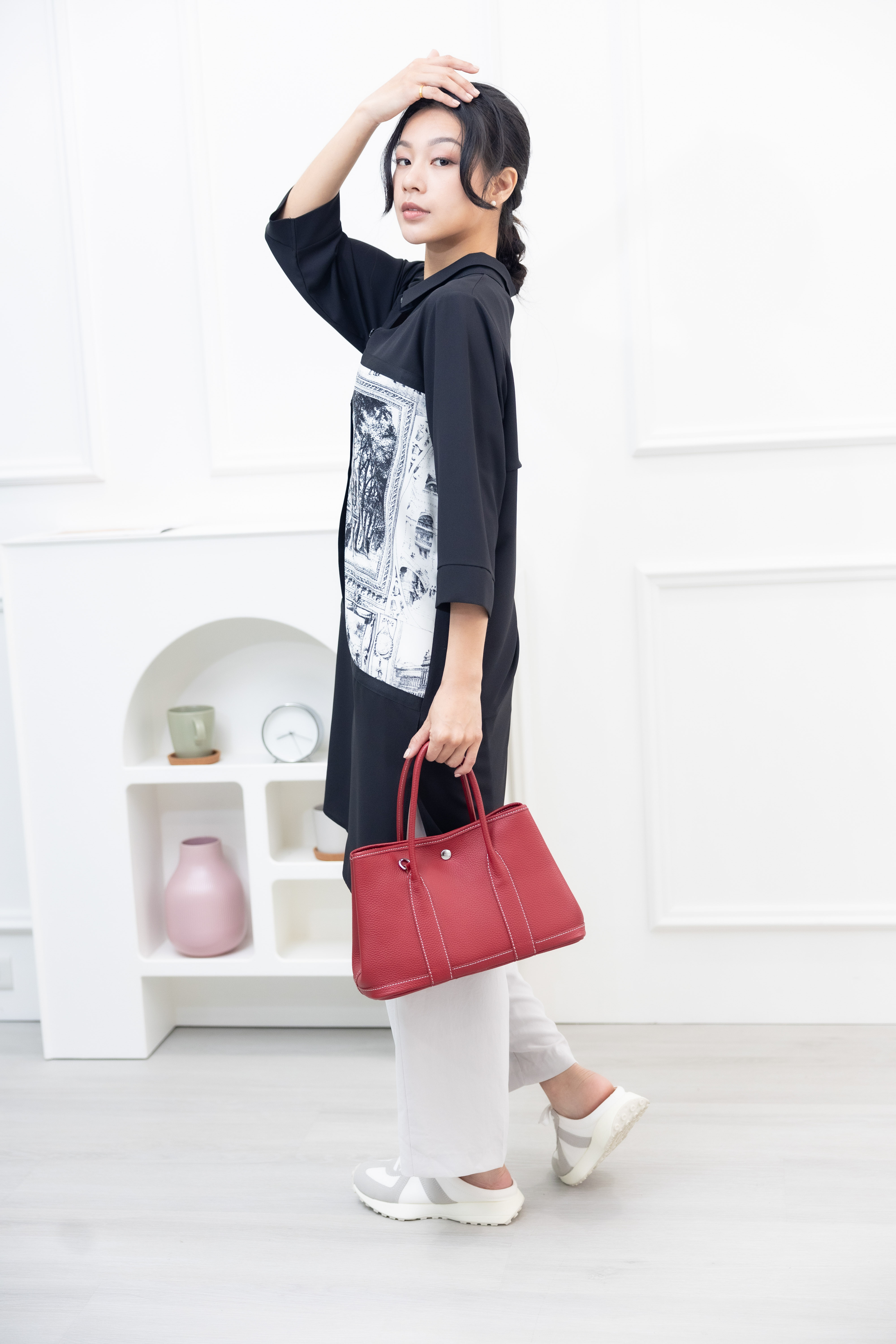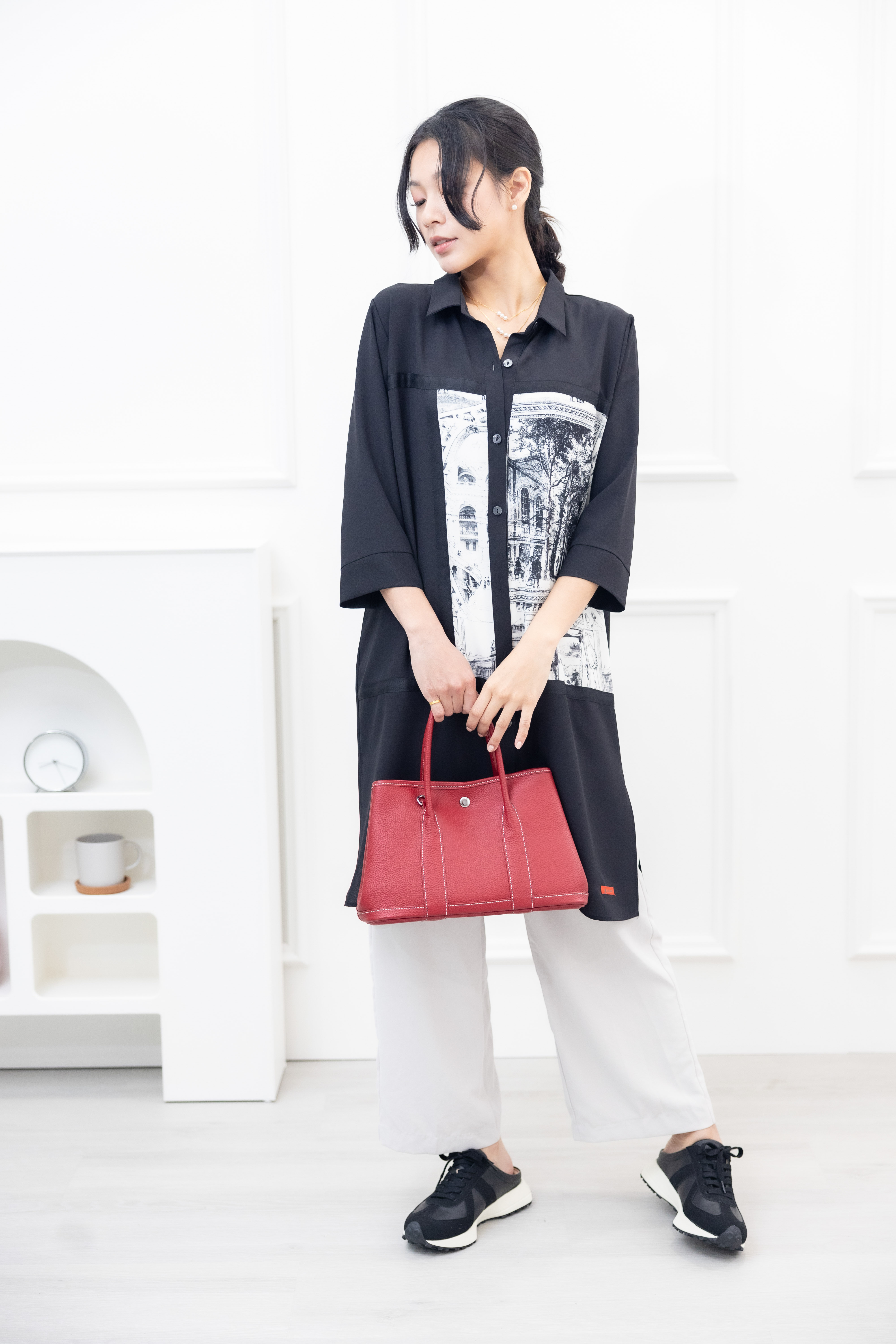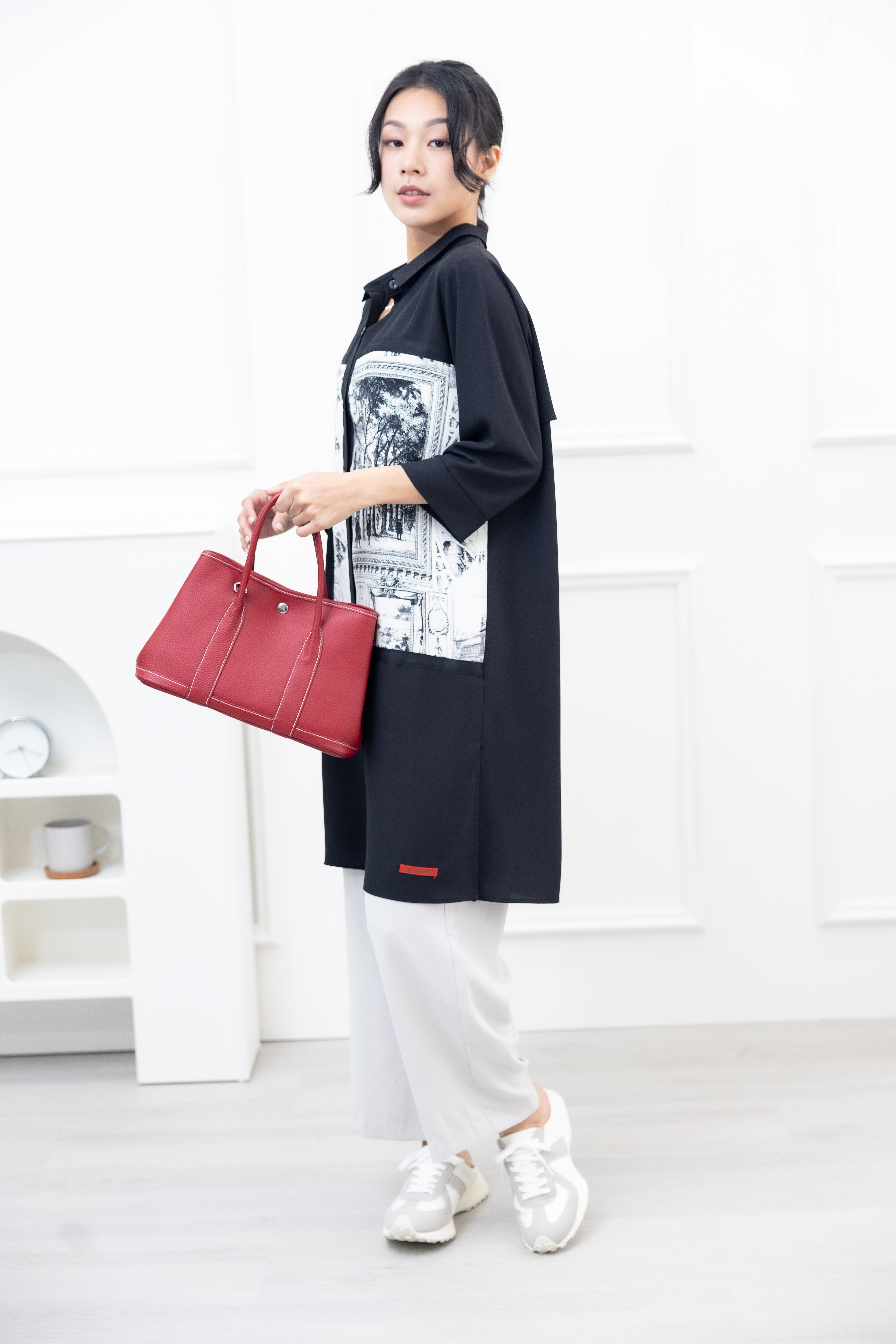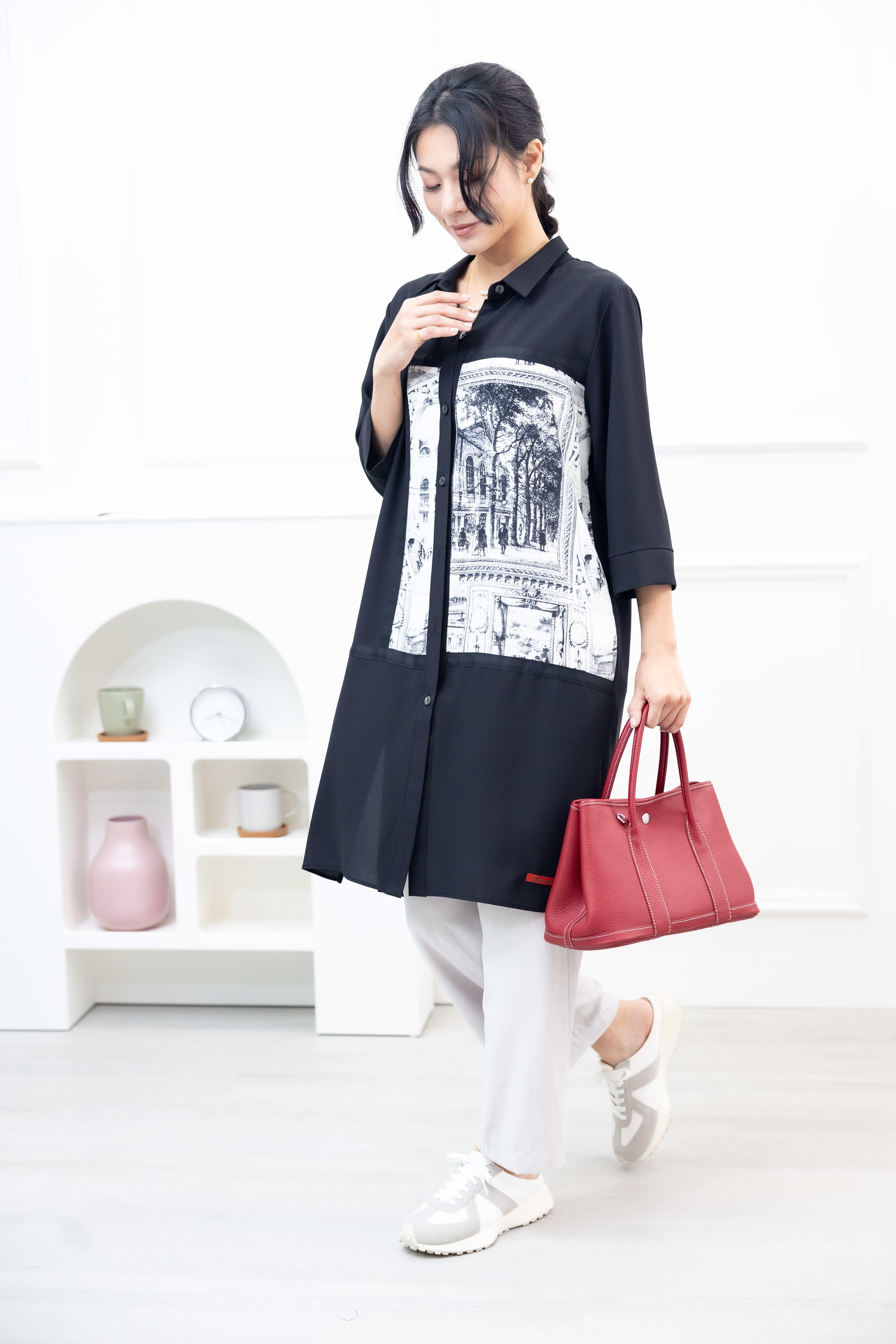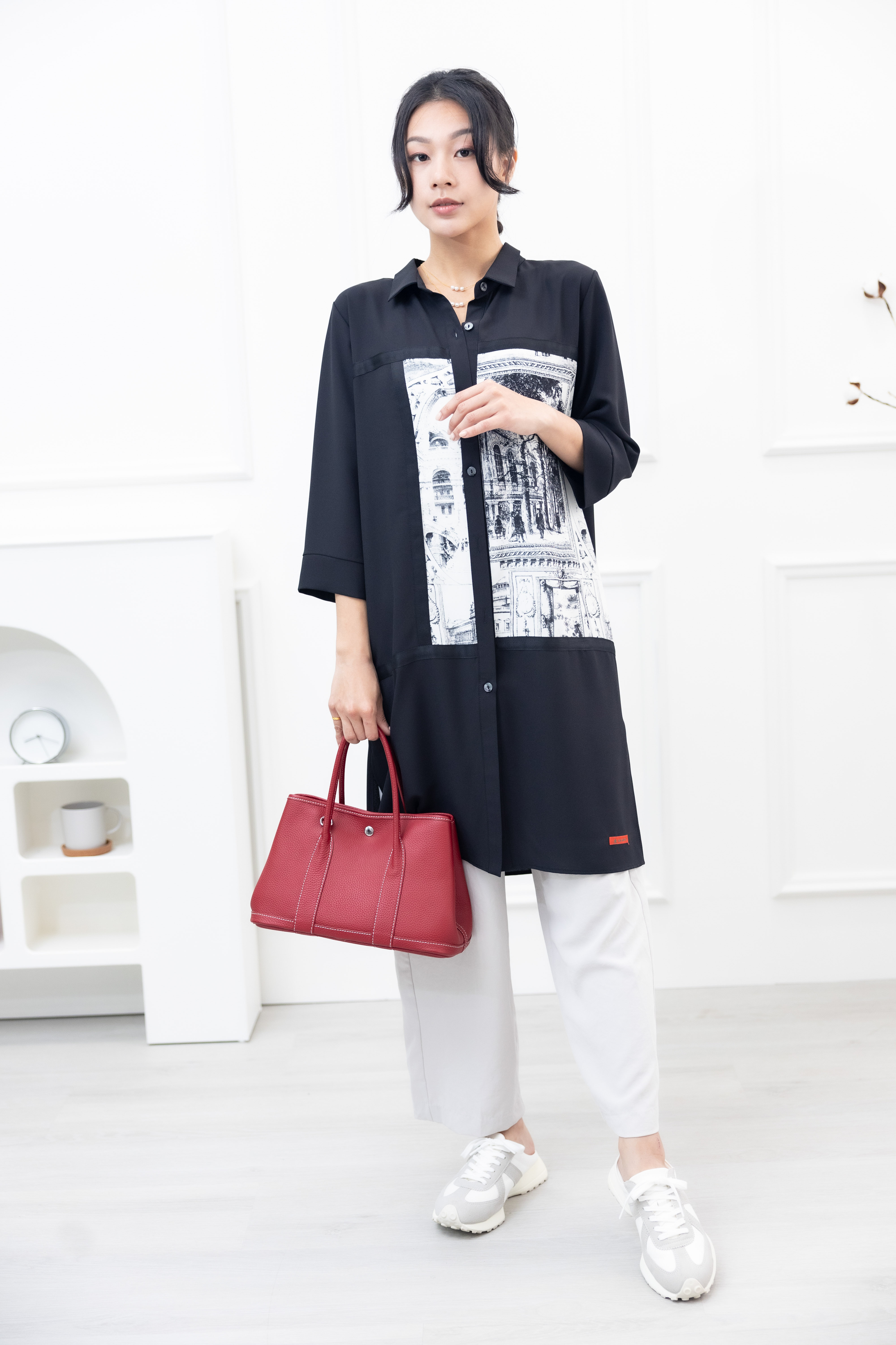 긴팔 風景照印花拼接黑緞帶長版上衣 / 黑色