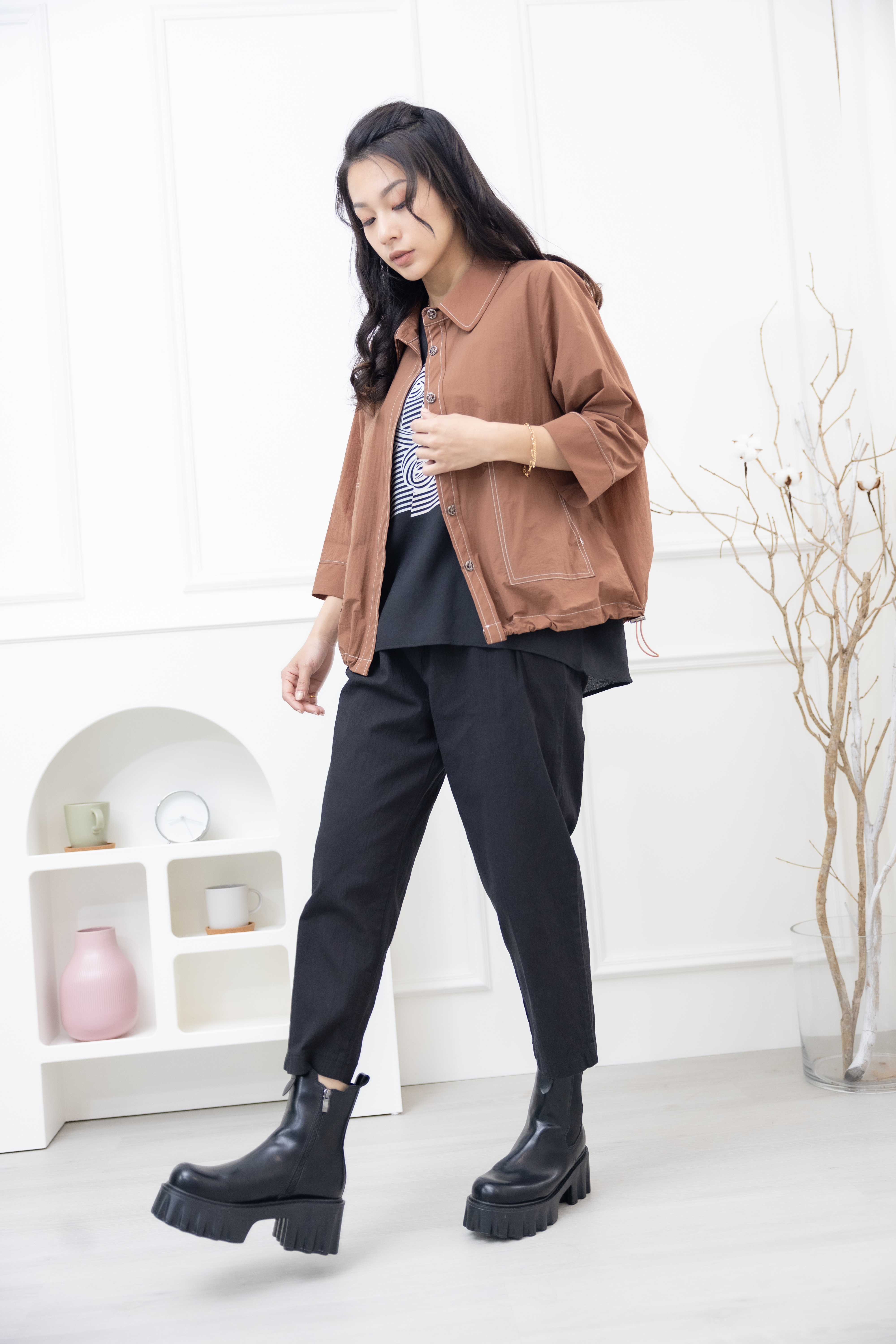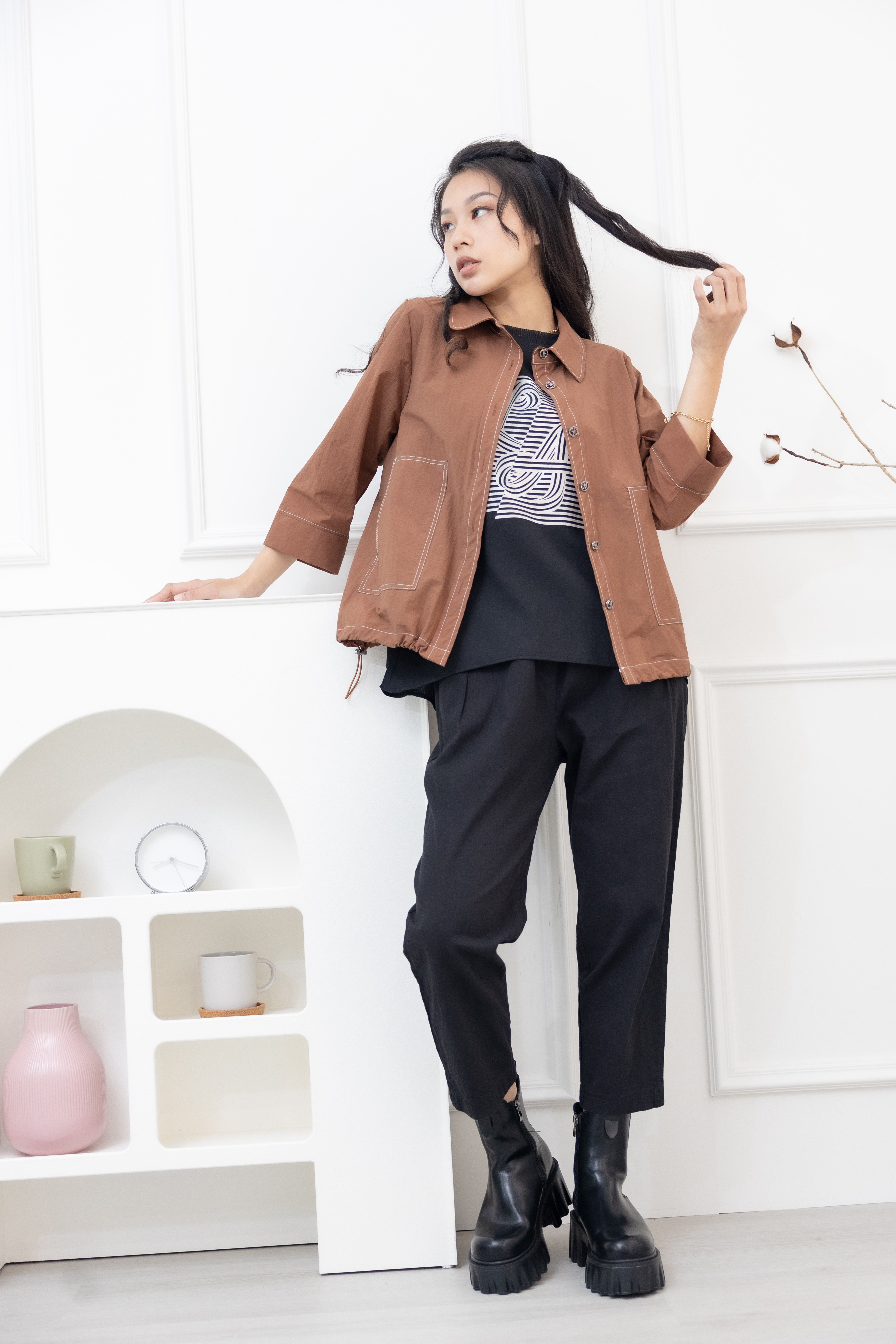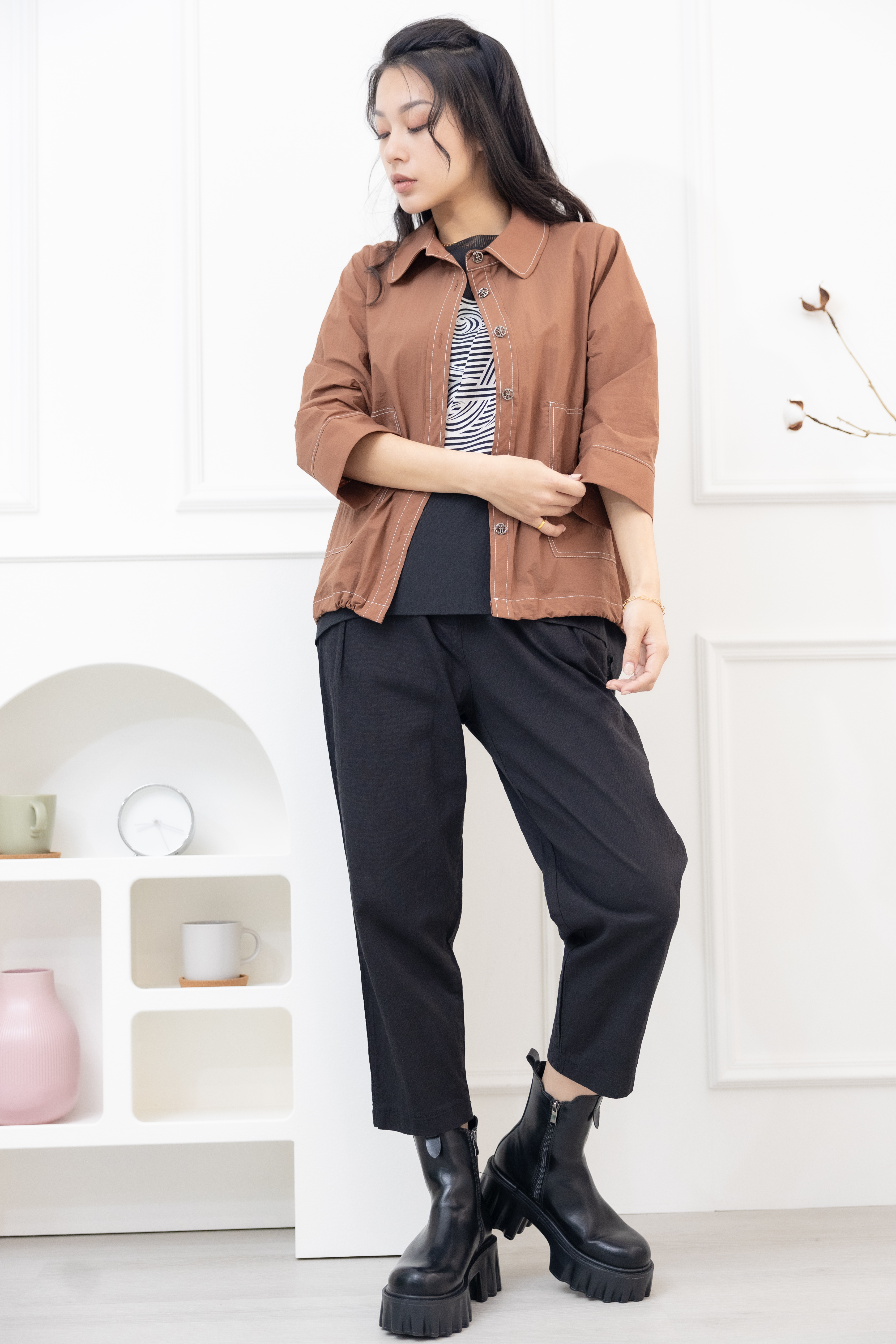 긴팔 코트 金屬感鈕扣7分袖襯衫領外套 / 土色