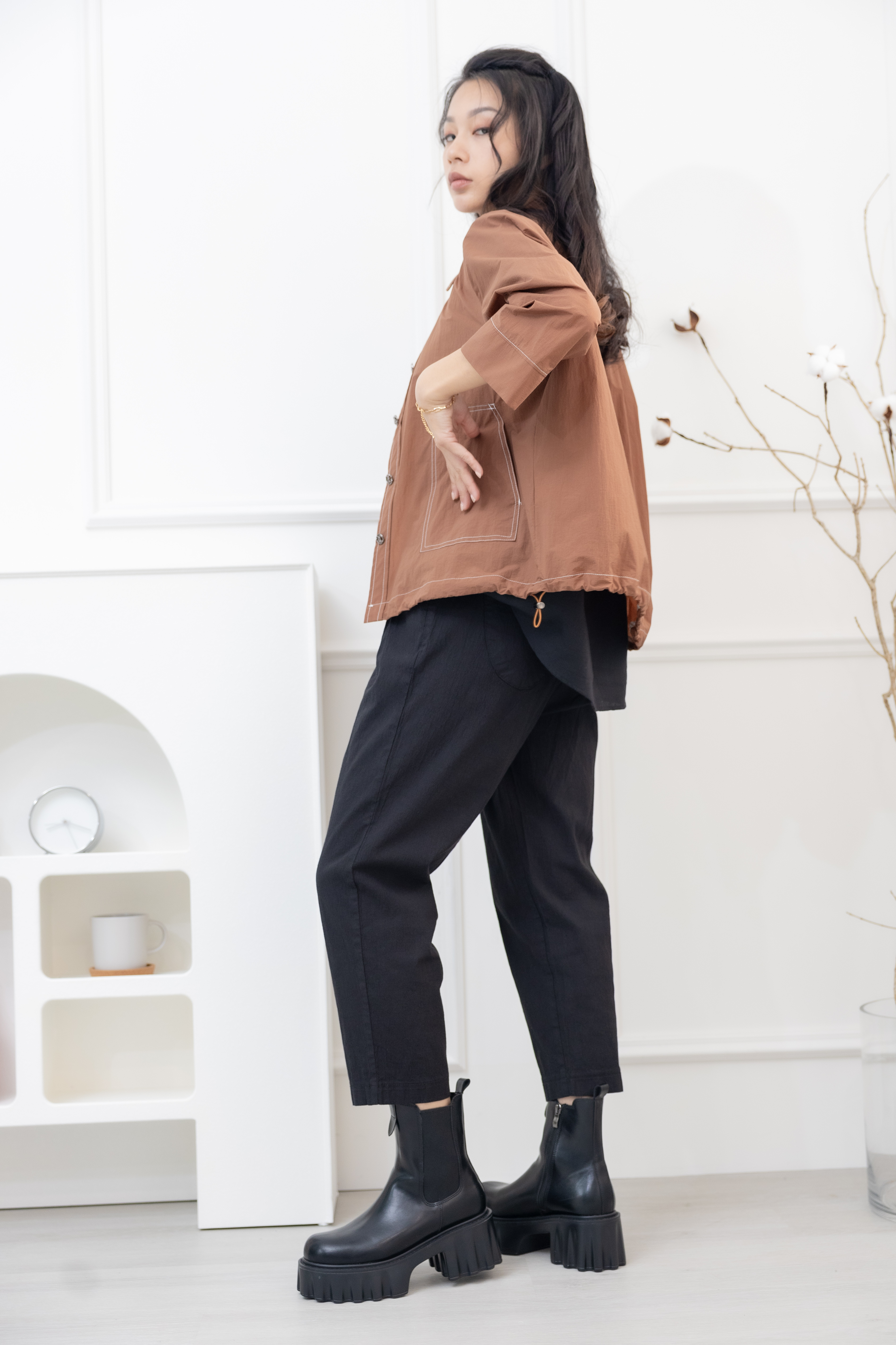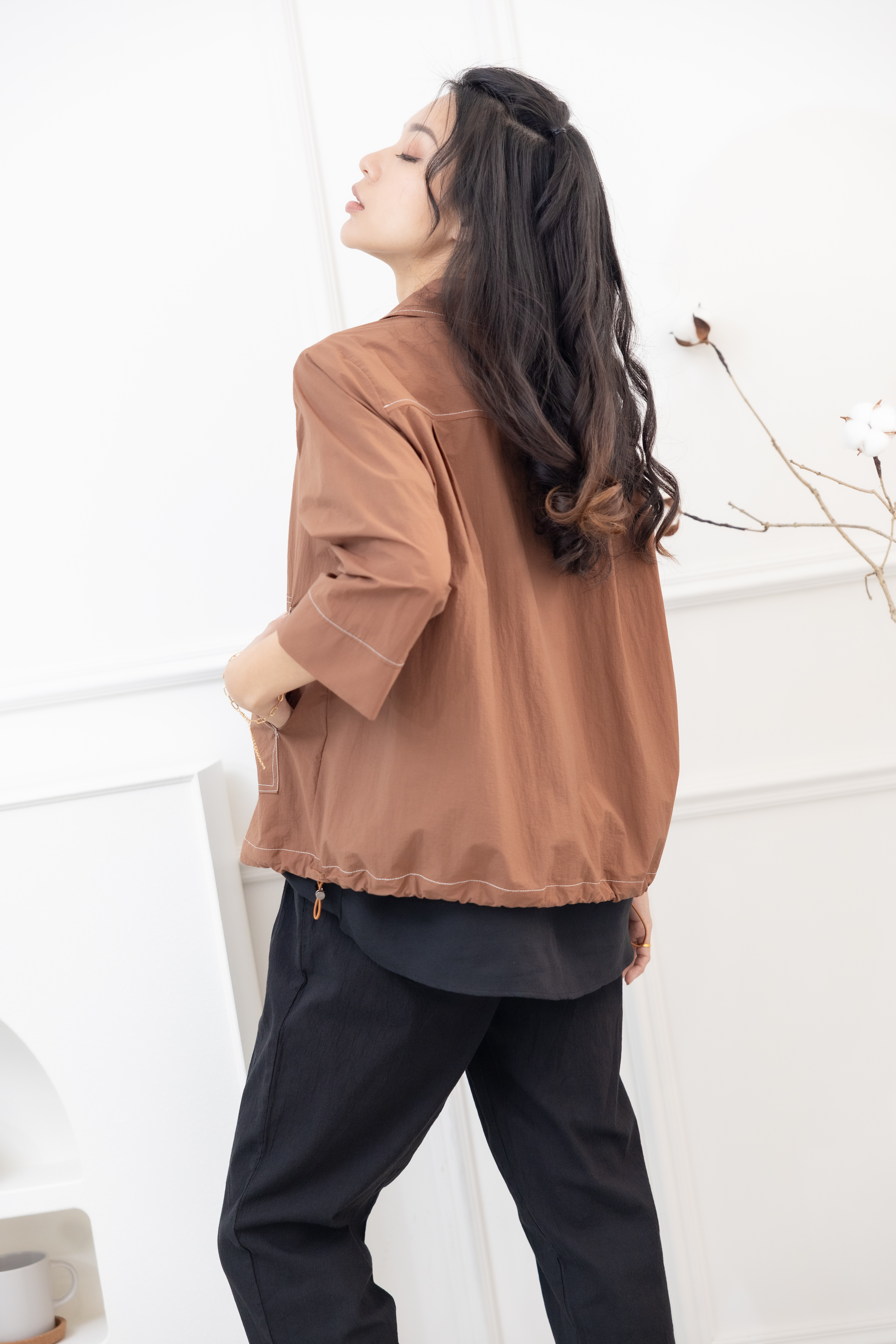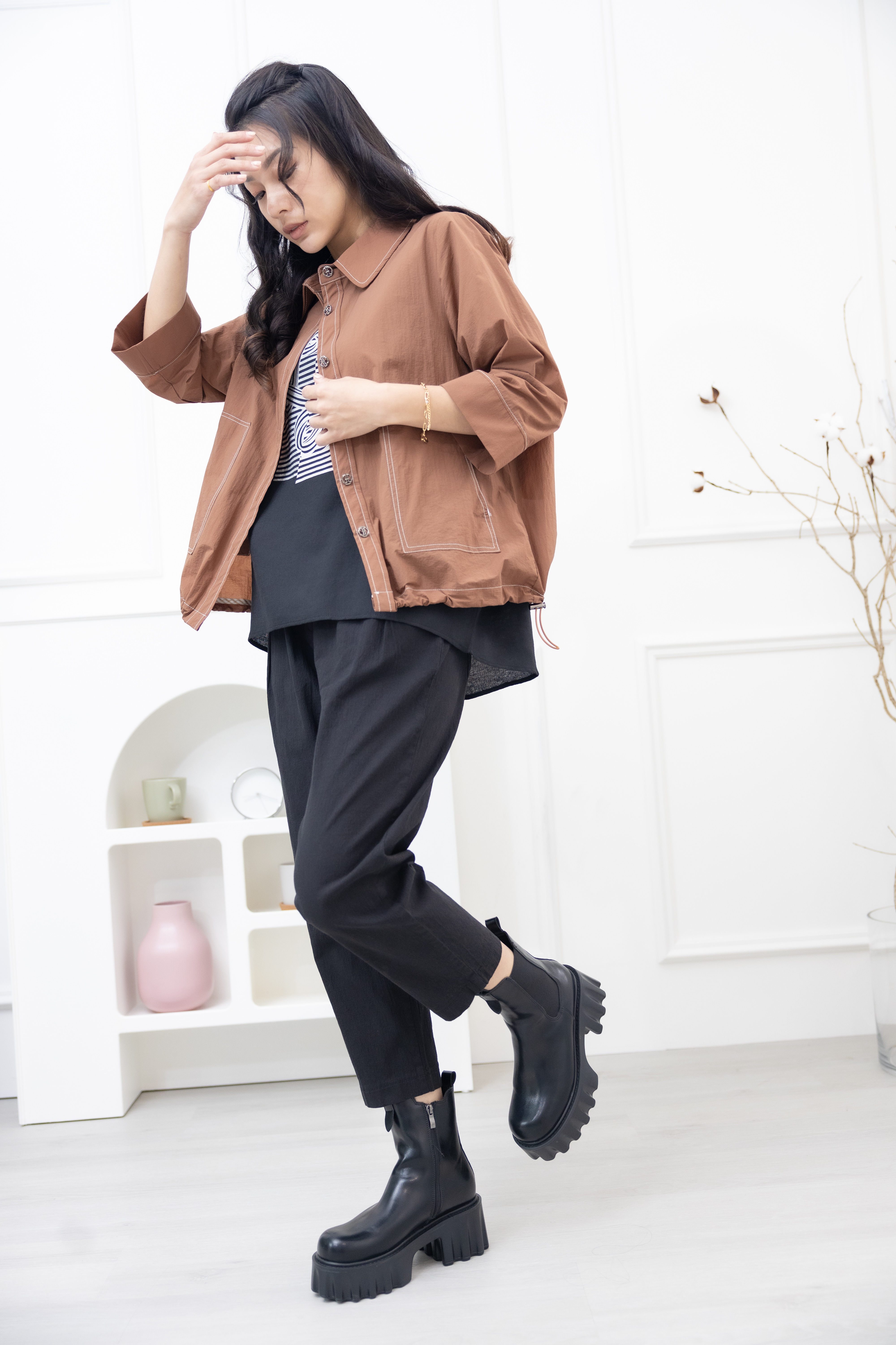긴팔 코트 金屬感鈕扣7分袖襯衫領外套 / 土色